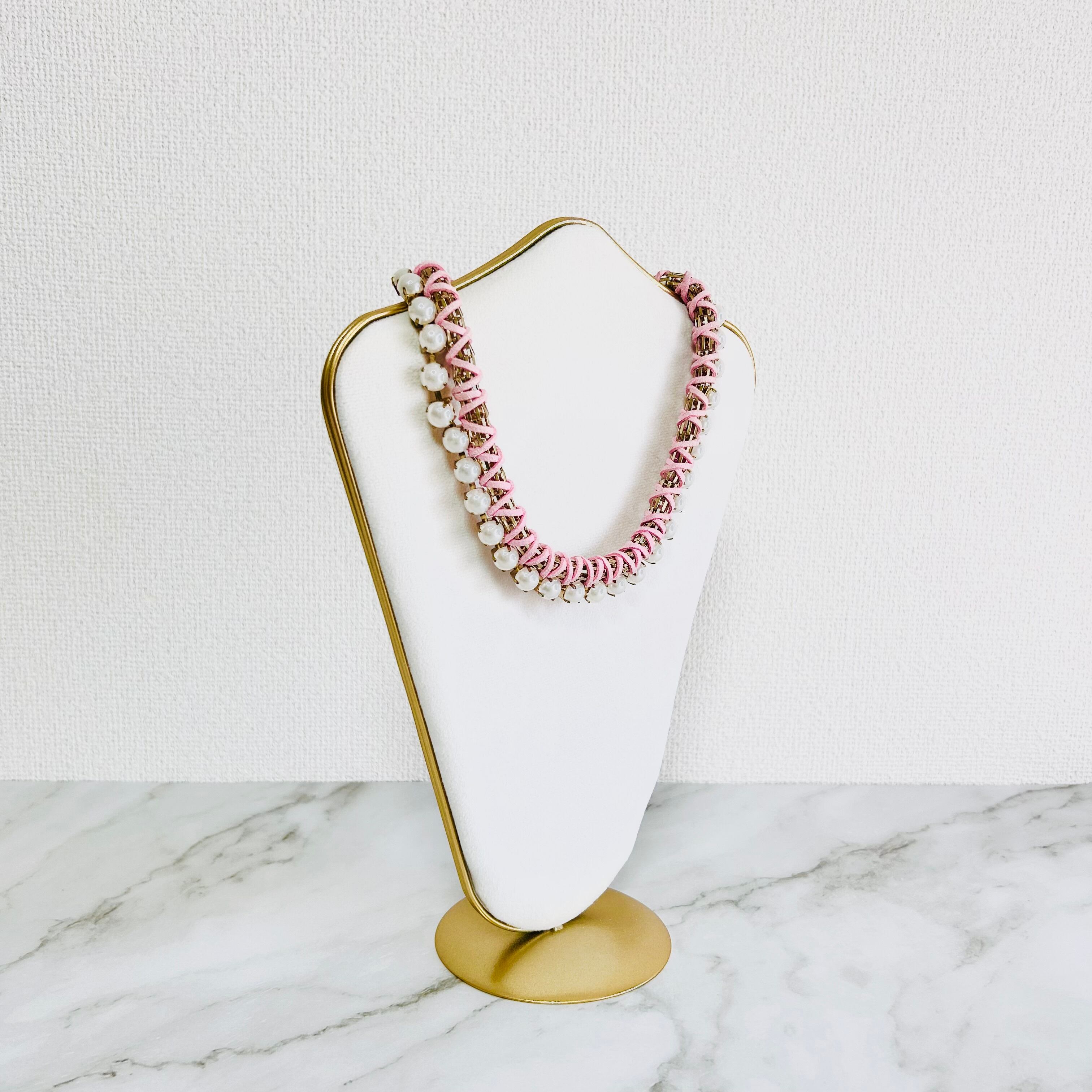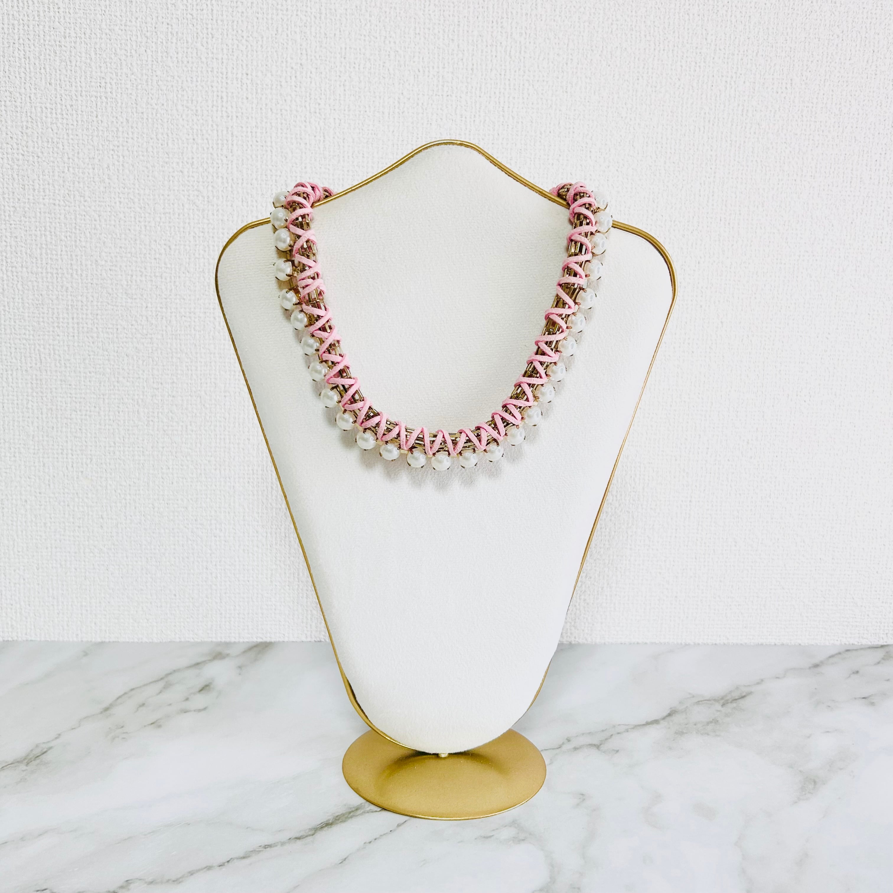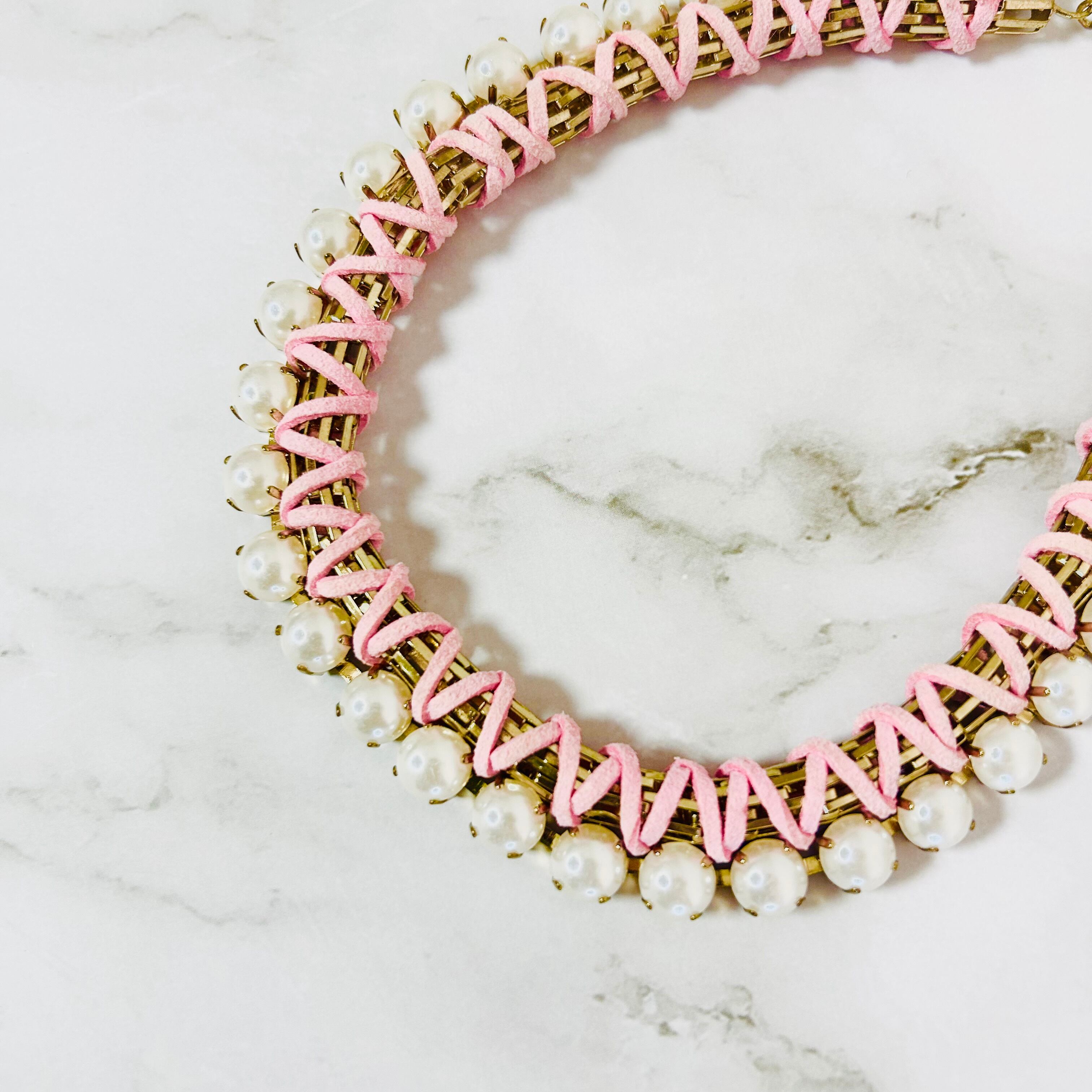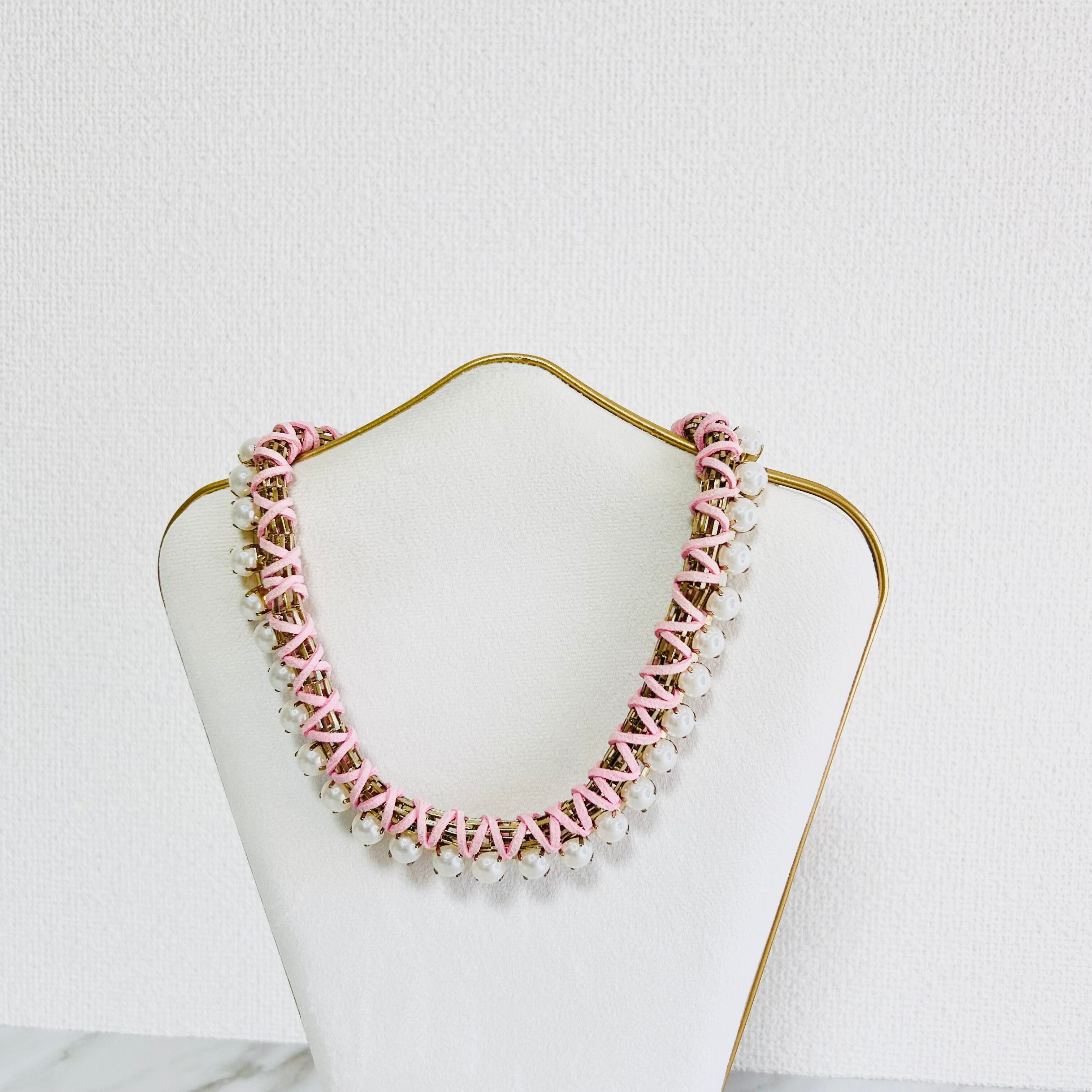 ツヤのあるファッションパールをぐるりとあしらい、淡いピンクのレザーコードを編み込んだユニークなデザインです。