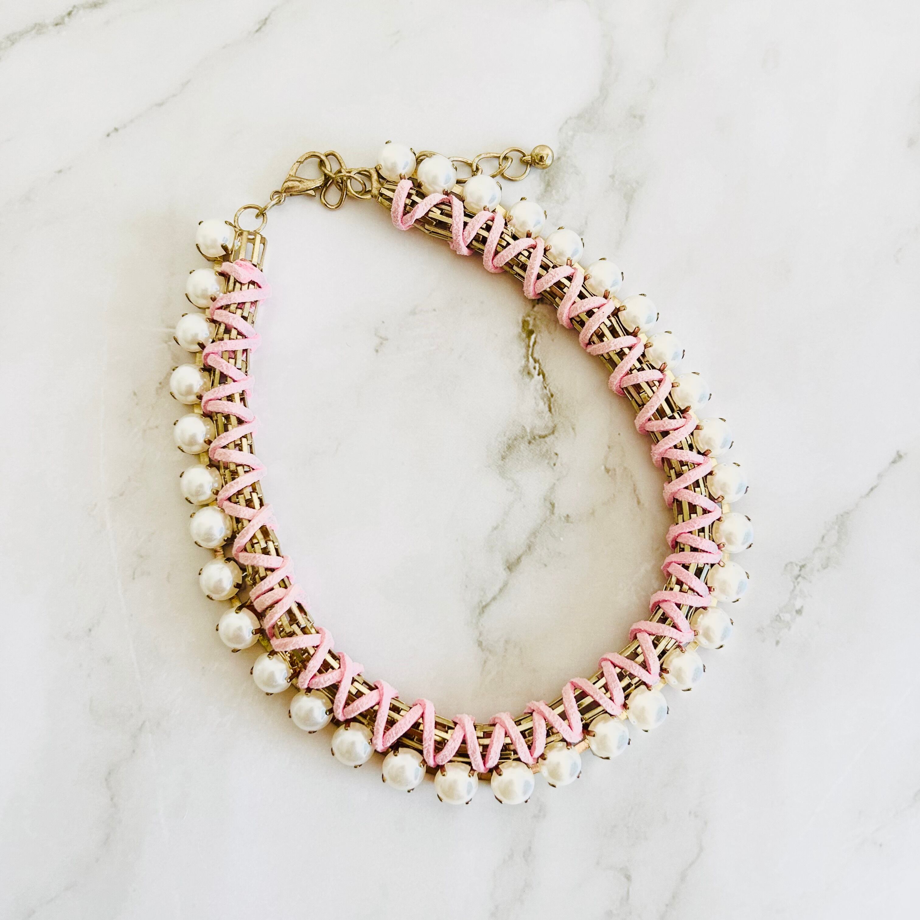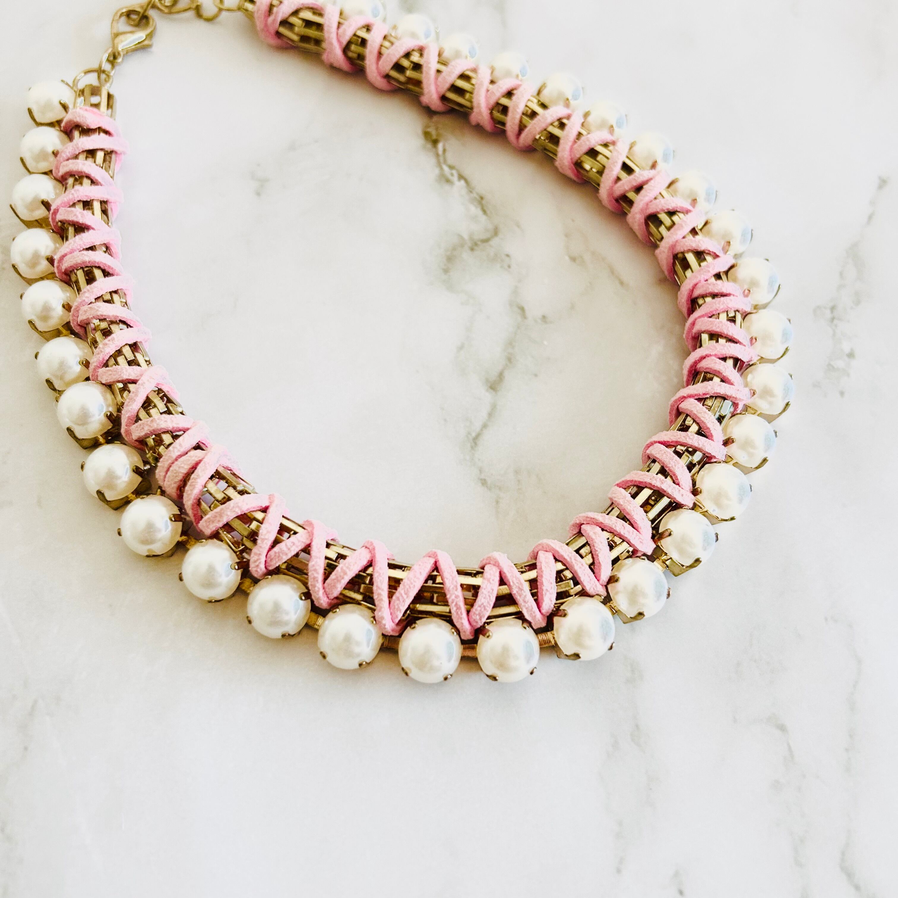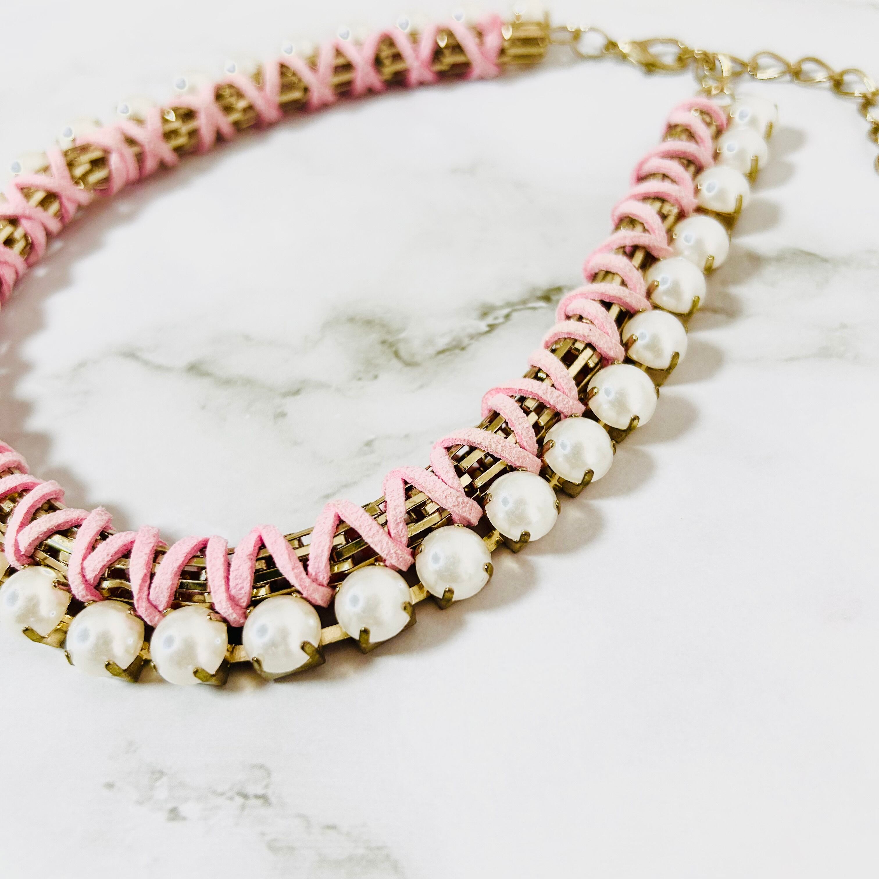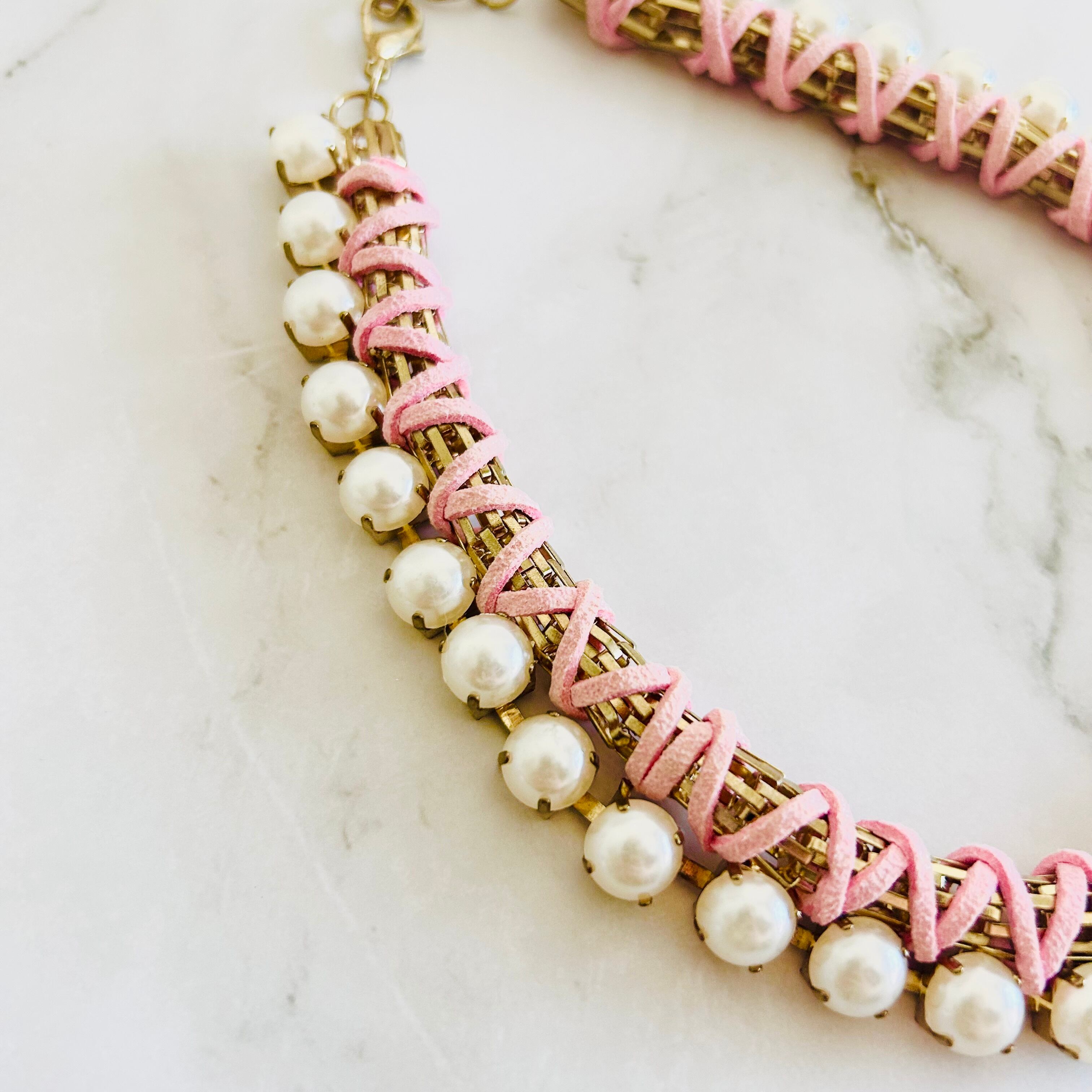 ツヤのあるファッションパールをぐるりとあしらい、淡いピンクのレザーコードを編み込んだユニークなデザインです。