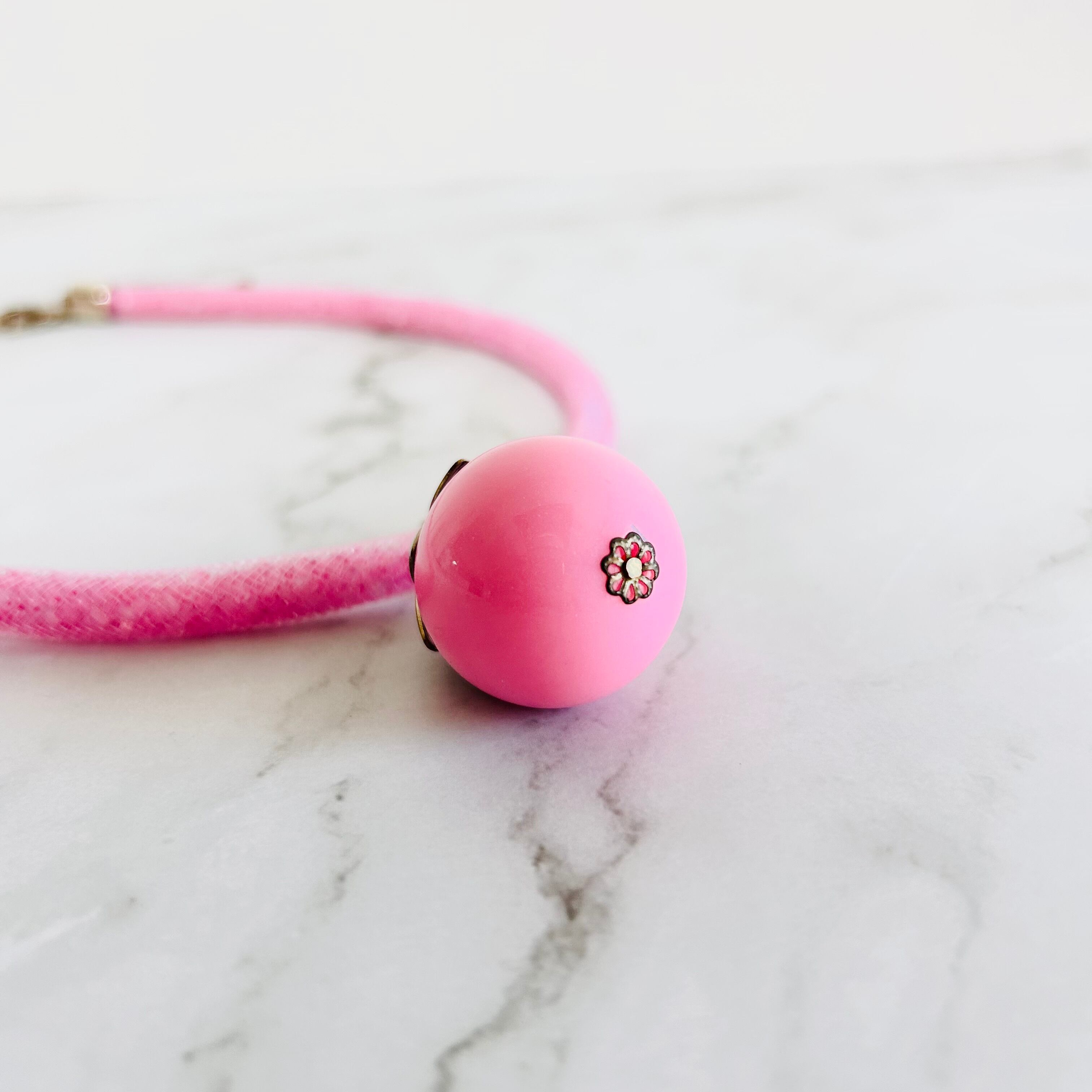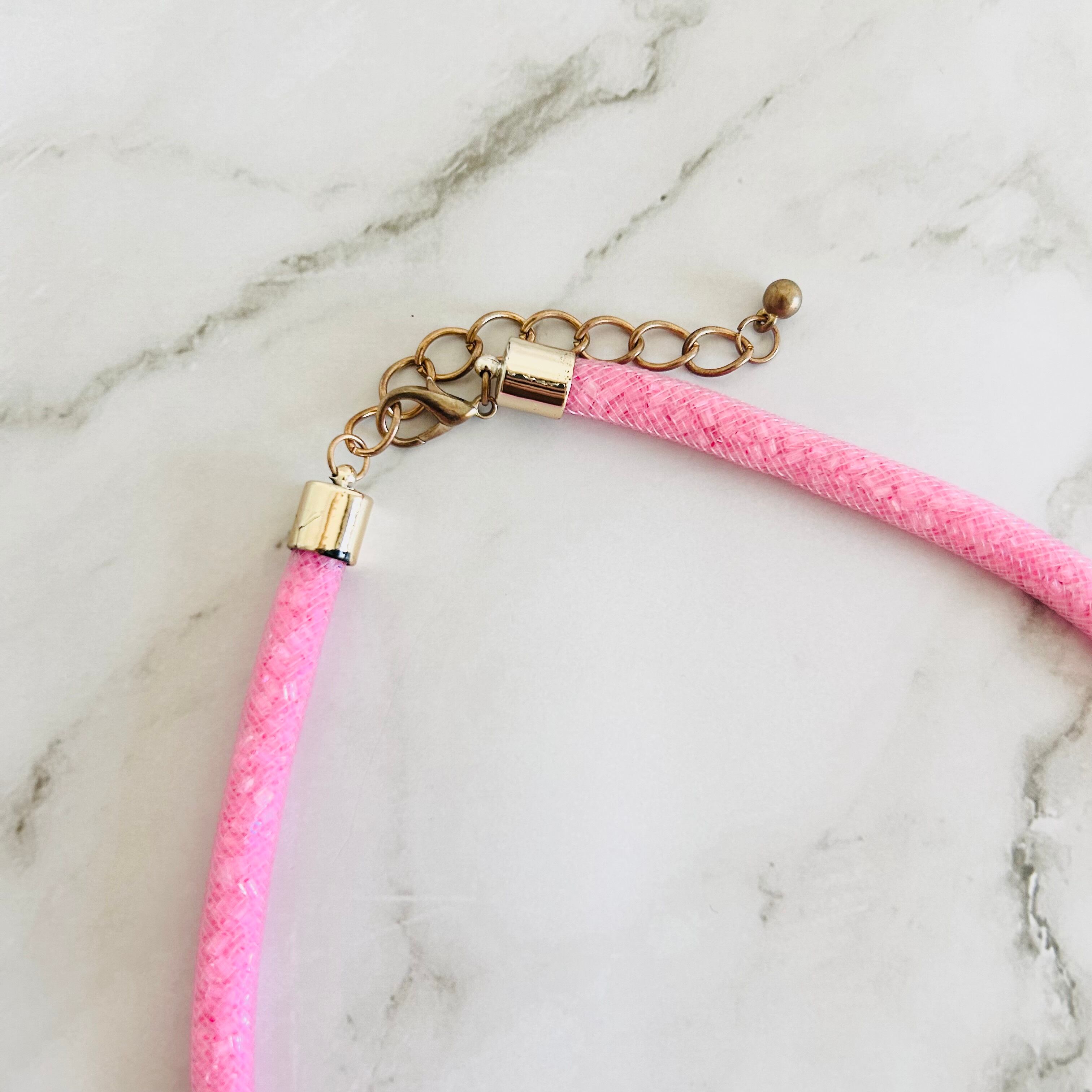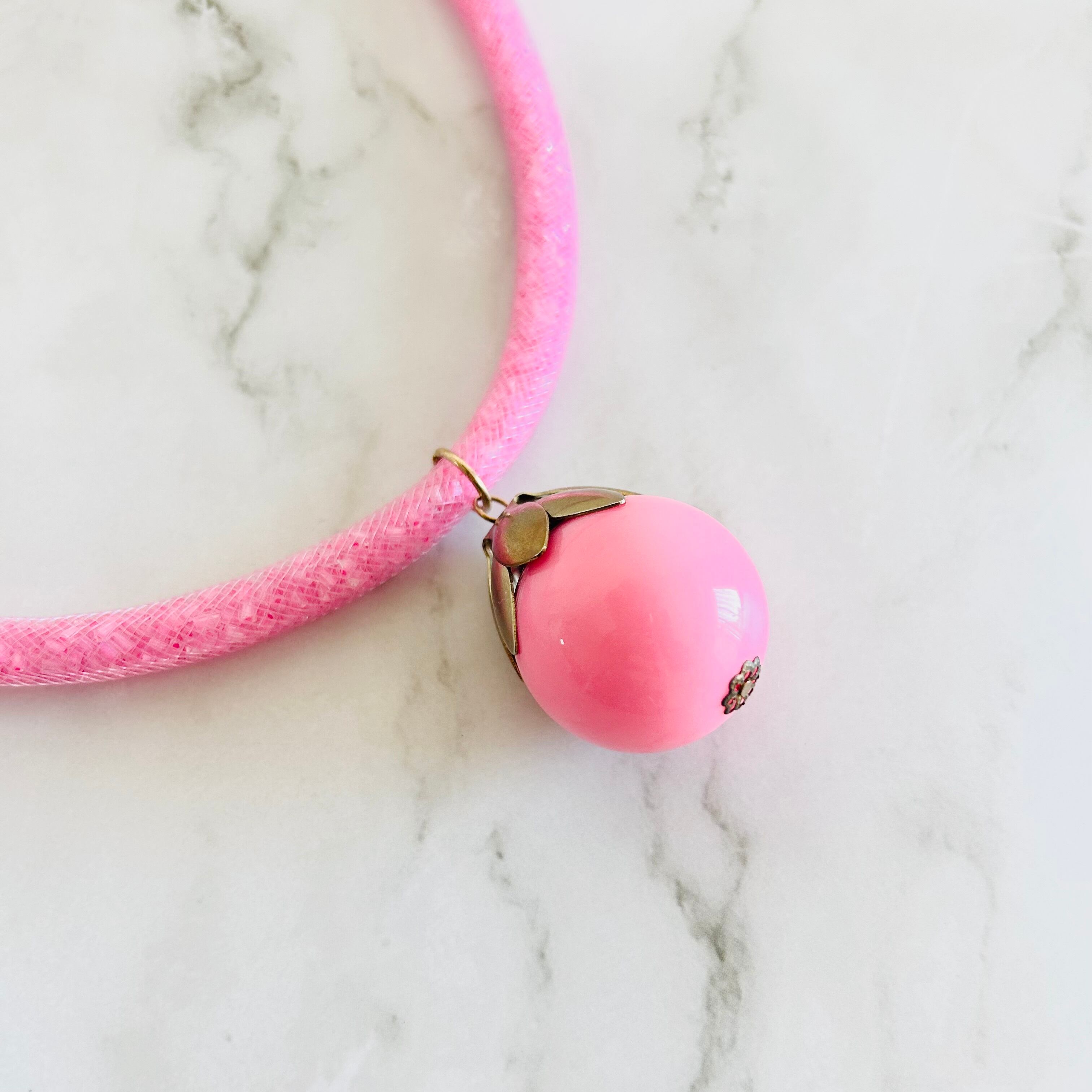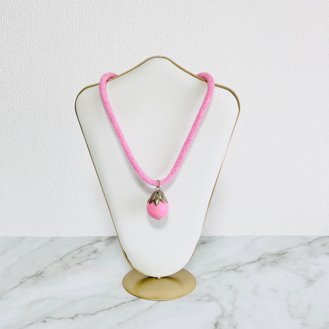 きらきらと細やかに輝くピンクのチューブコードに、ころんと可愛いピンクのドロップ型トップをあしらったキュートなデザインです。