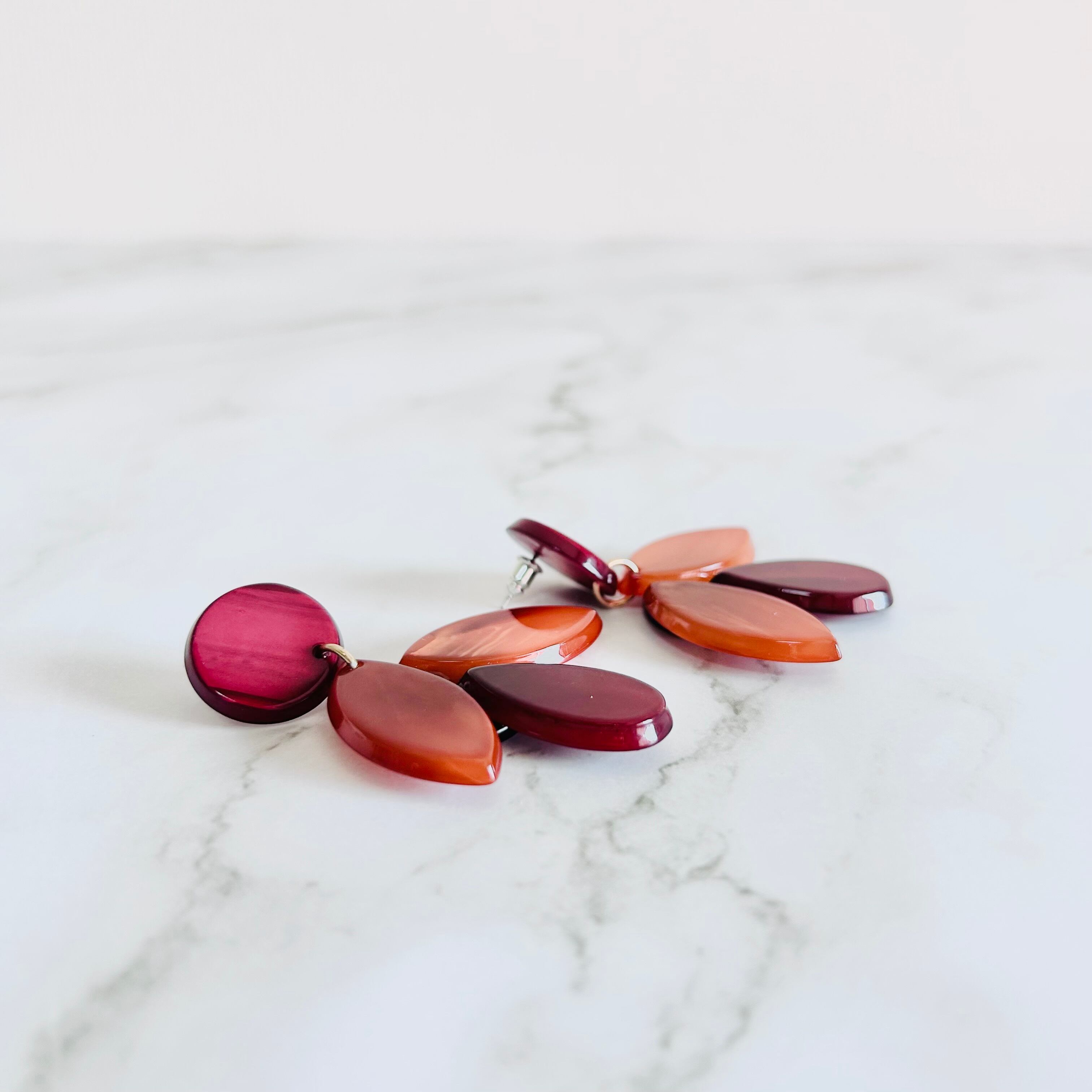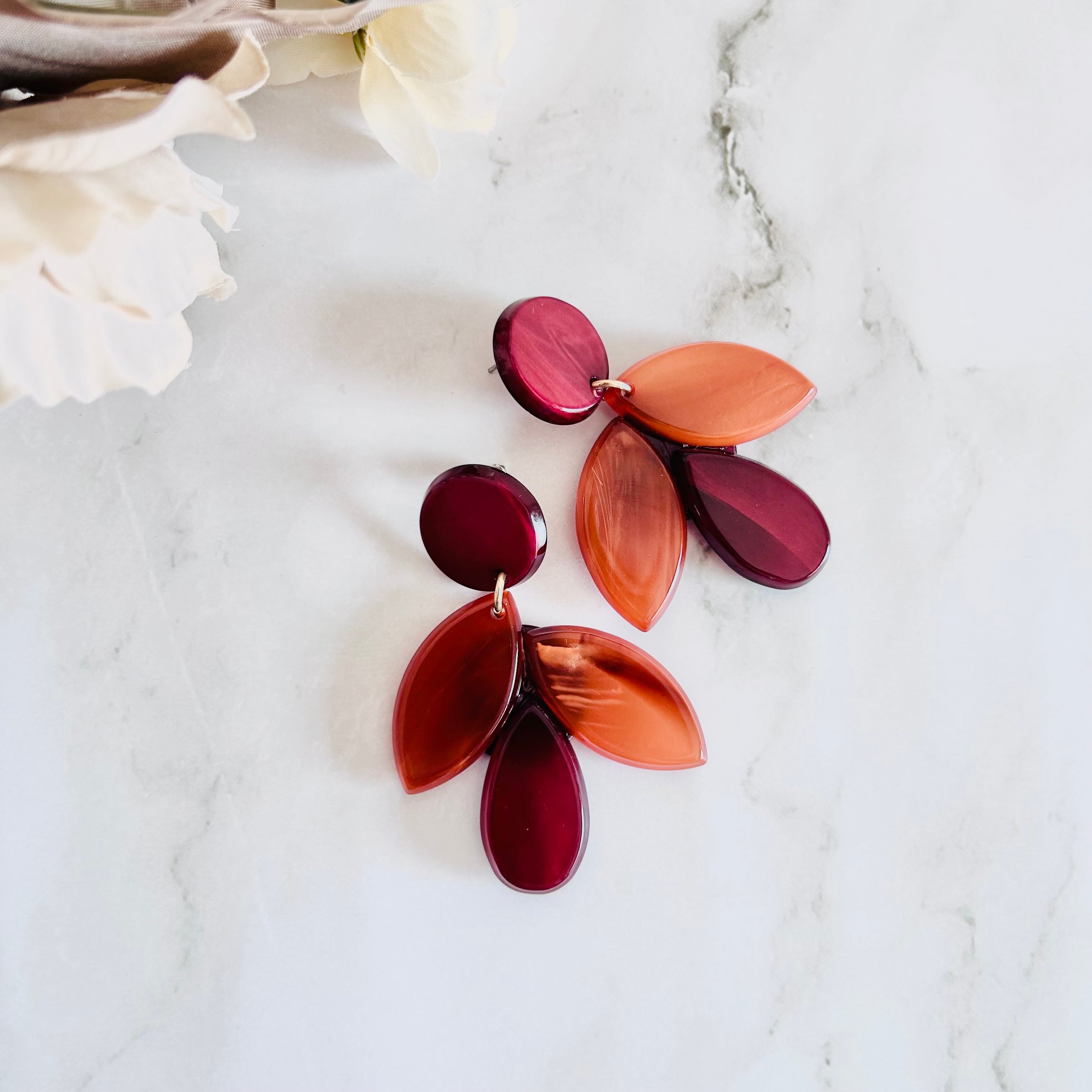 深みのあるボルドーと温かみのあるオレンジが美しく重なり合う、アクリルパーツのドロップピアスです。