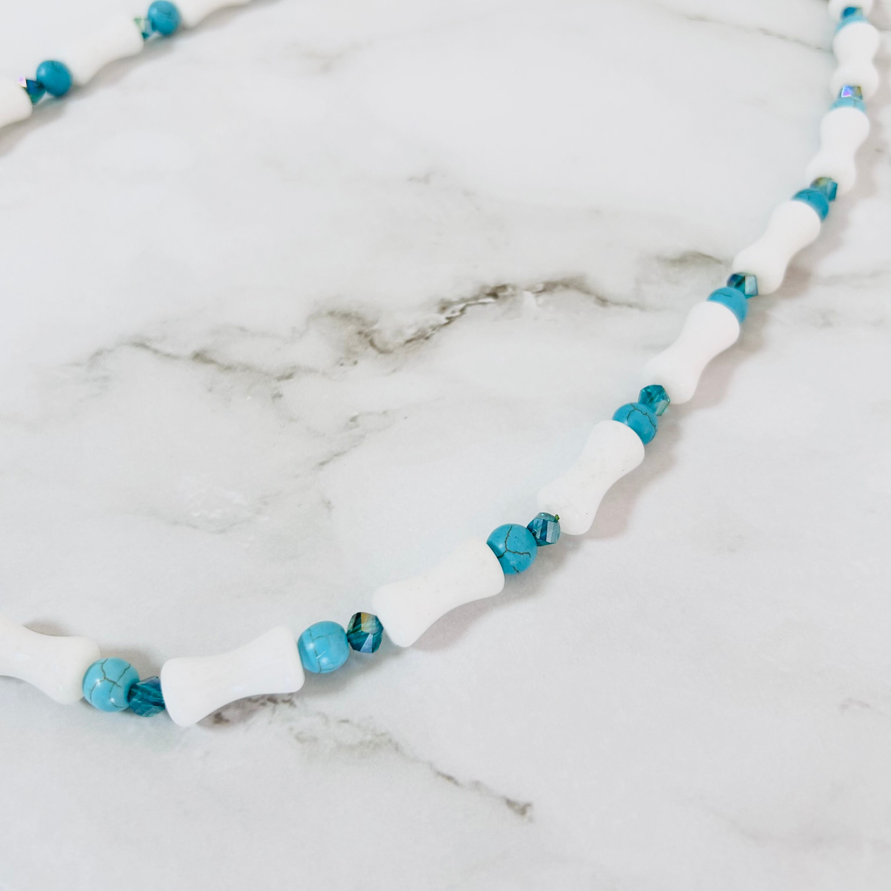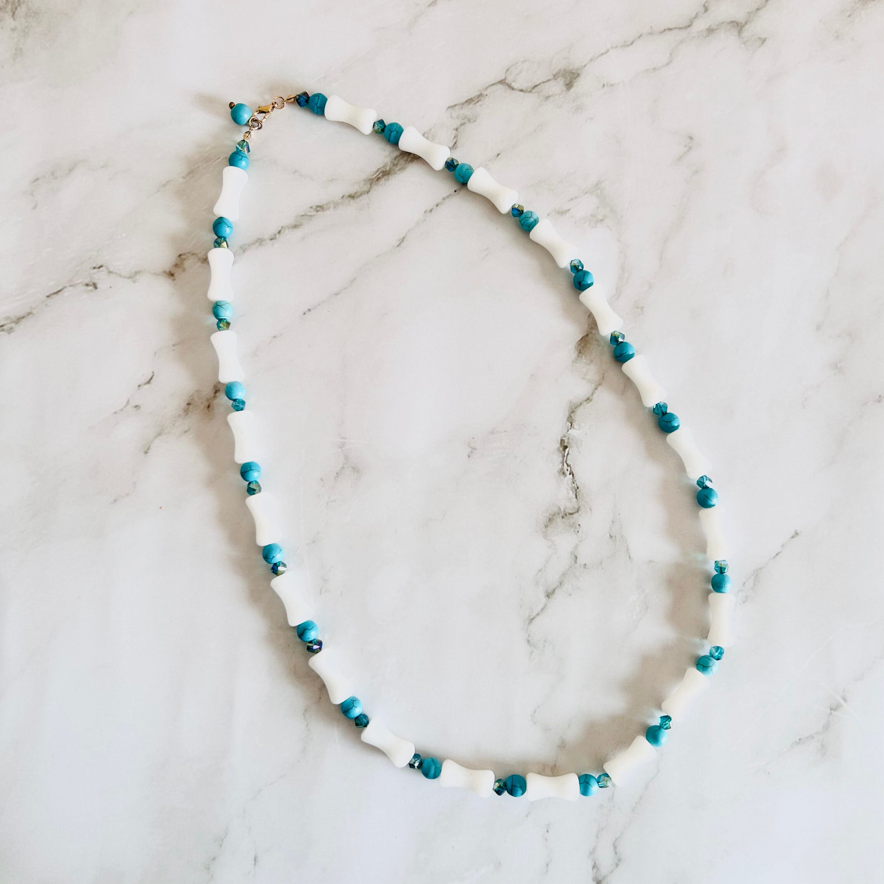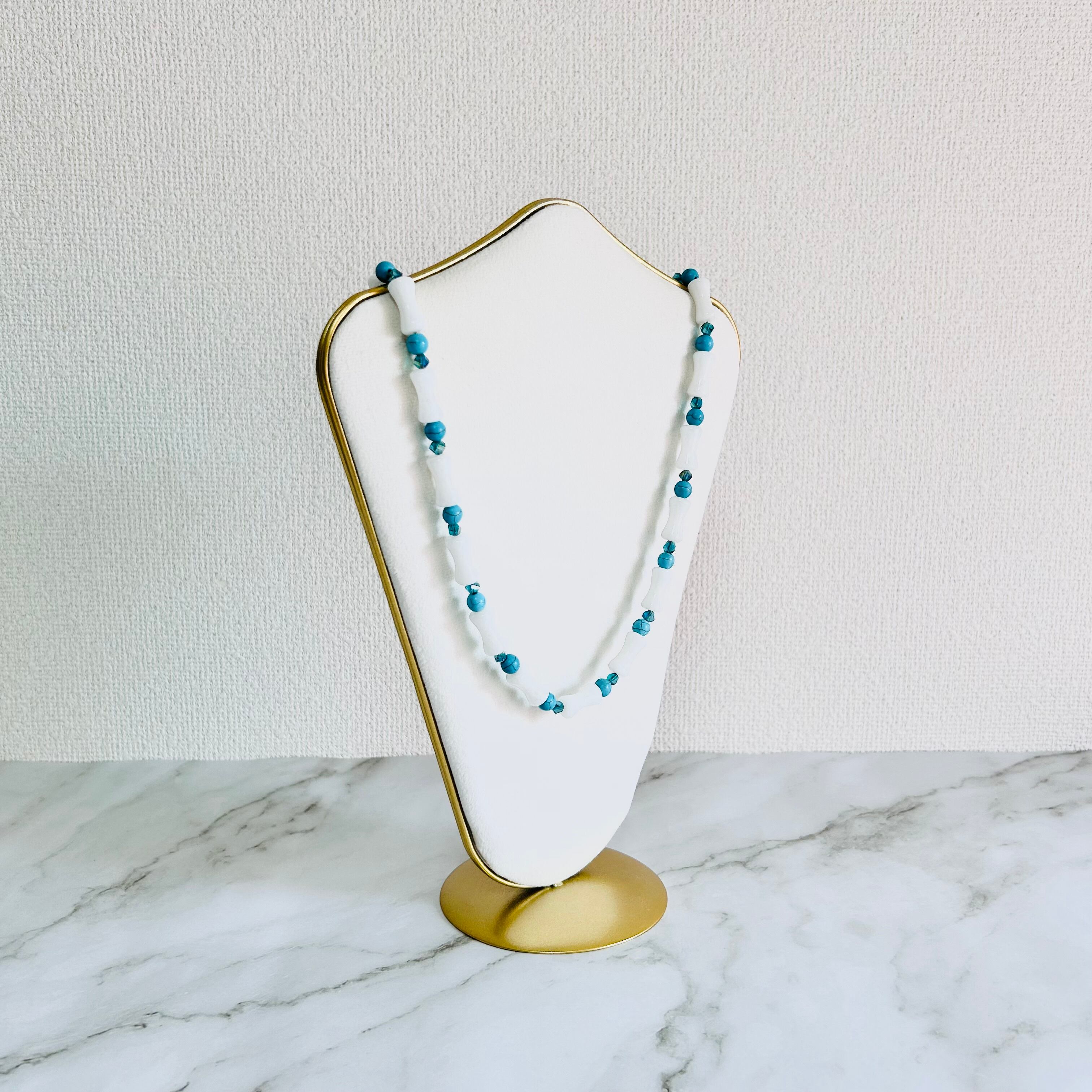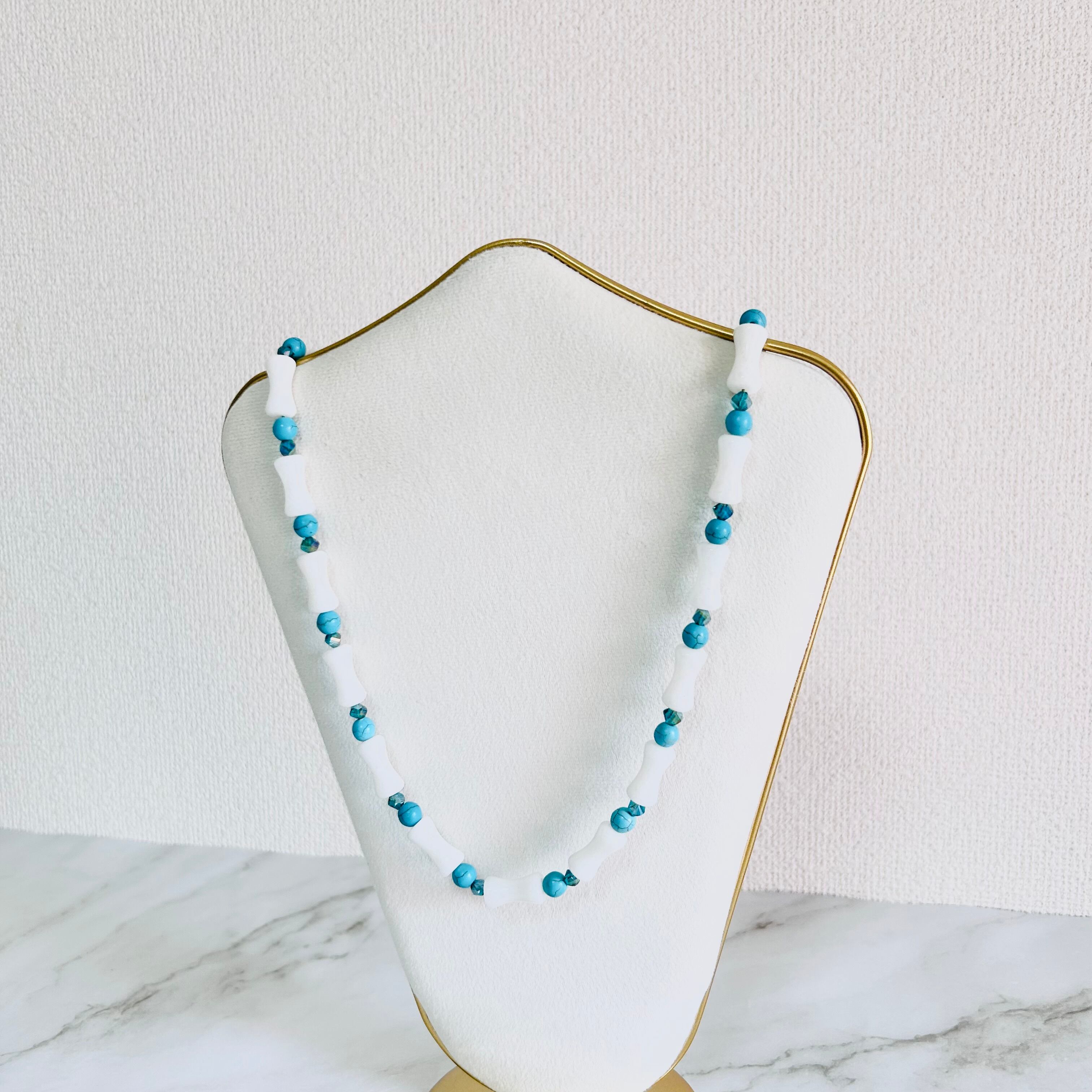 ホワイトストーンパーツとターコイズブルーのストーンを交互にあしらった、爽やかなネックレスです。