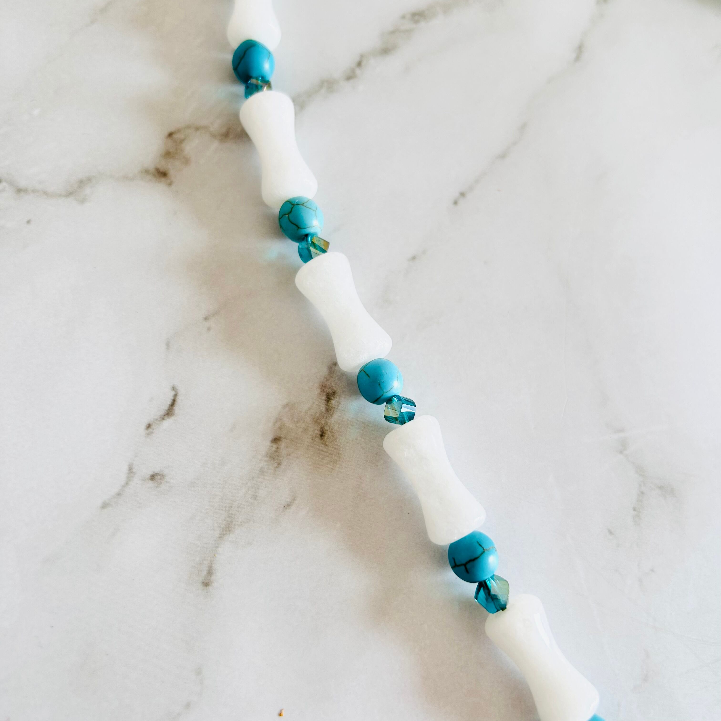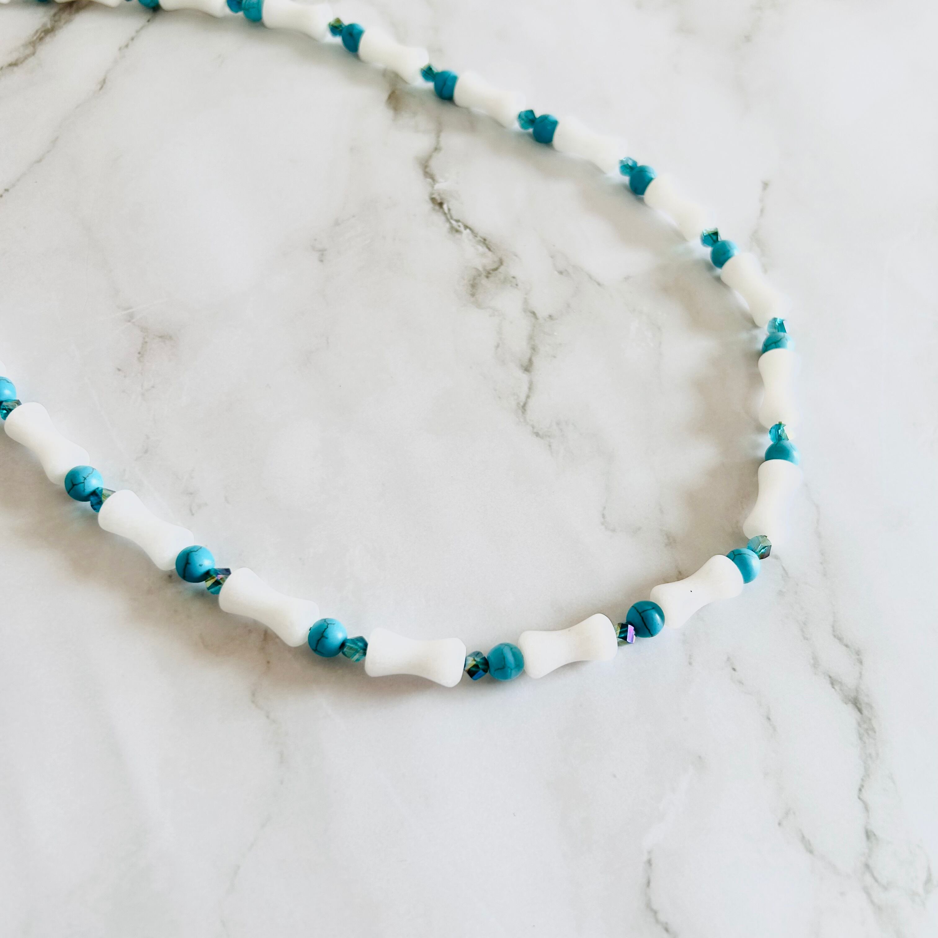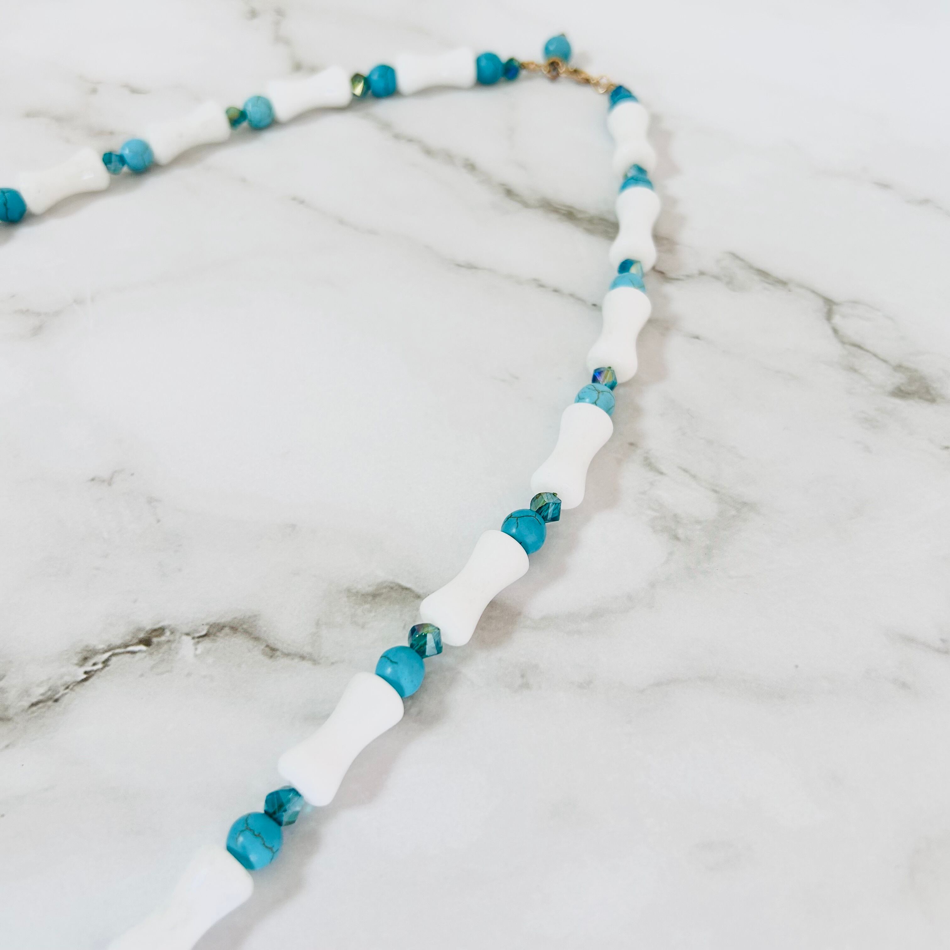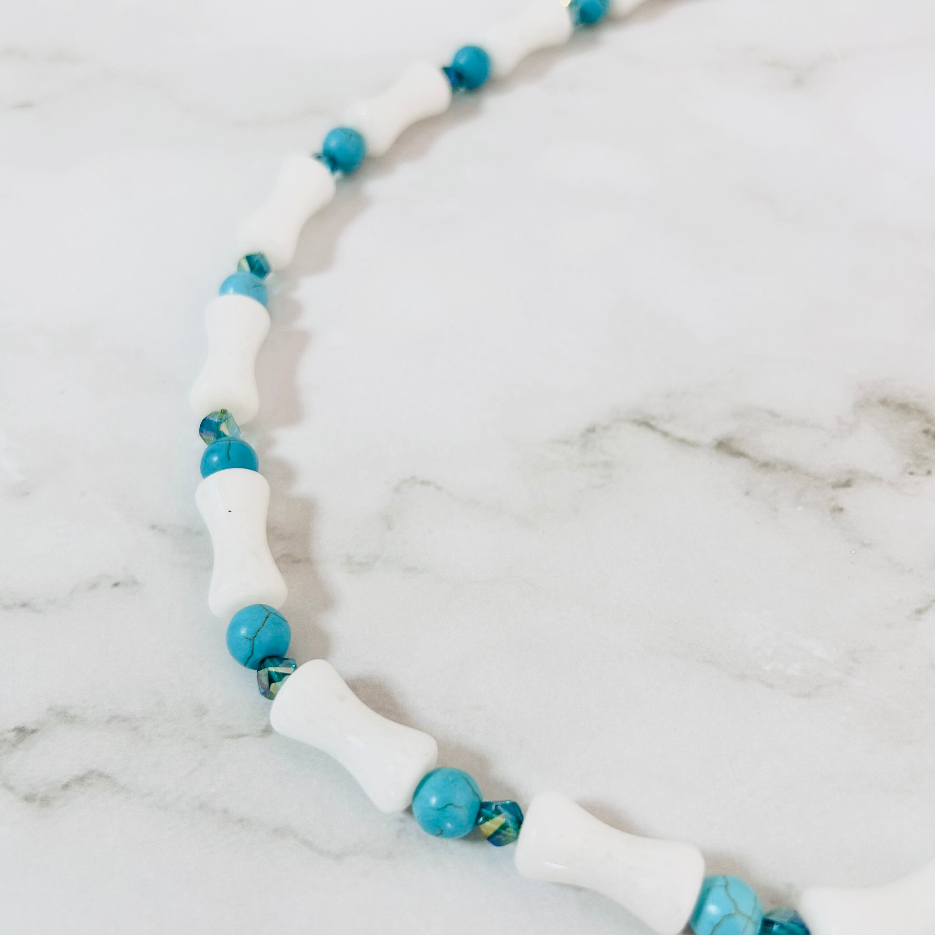 ホワイトストーンパーツとターコイズブルーのストーンを交互にあしらった、爽やかなネックレスです。