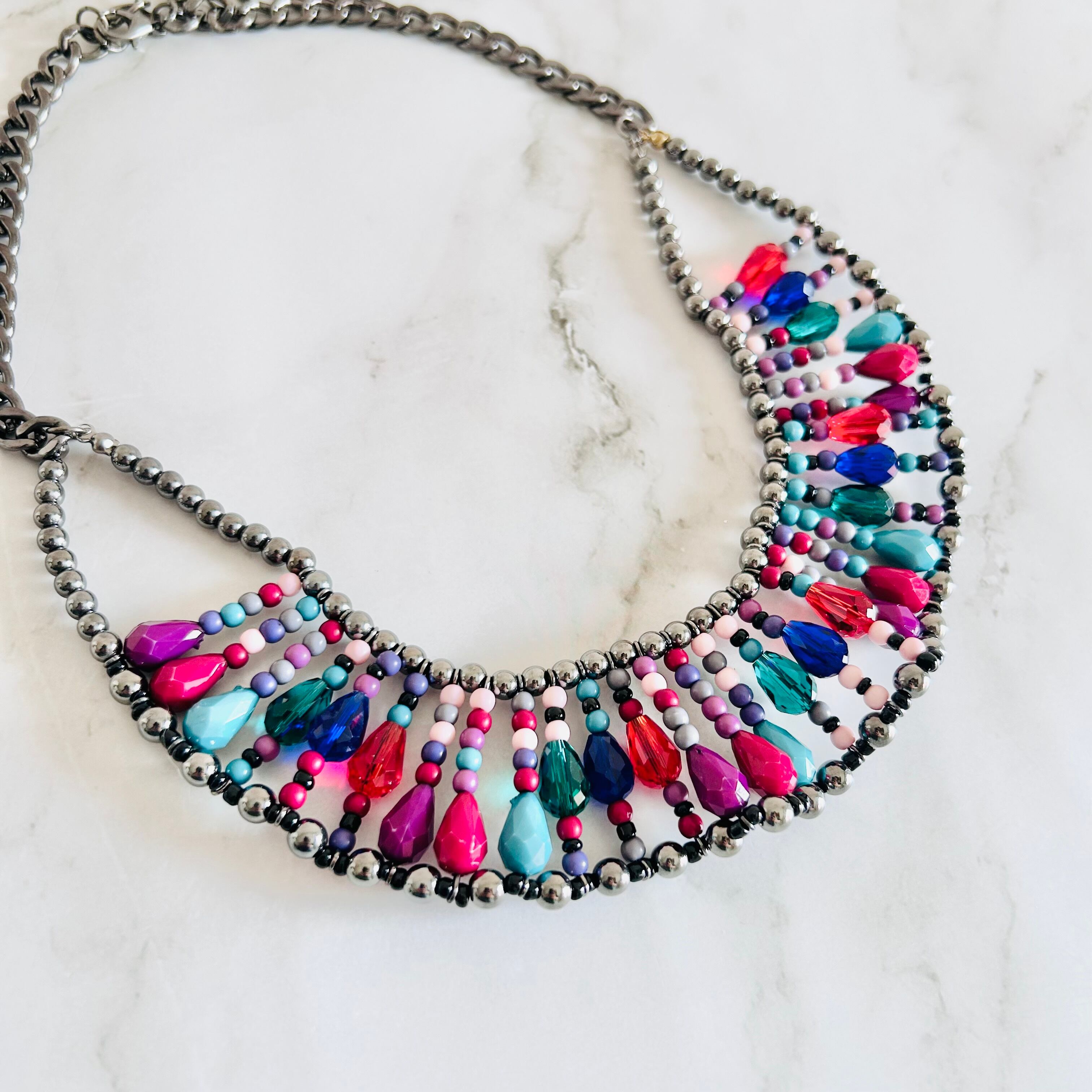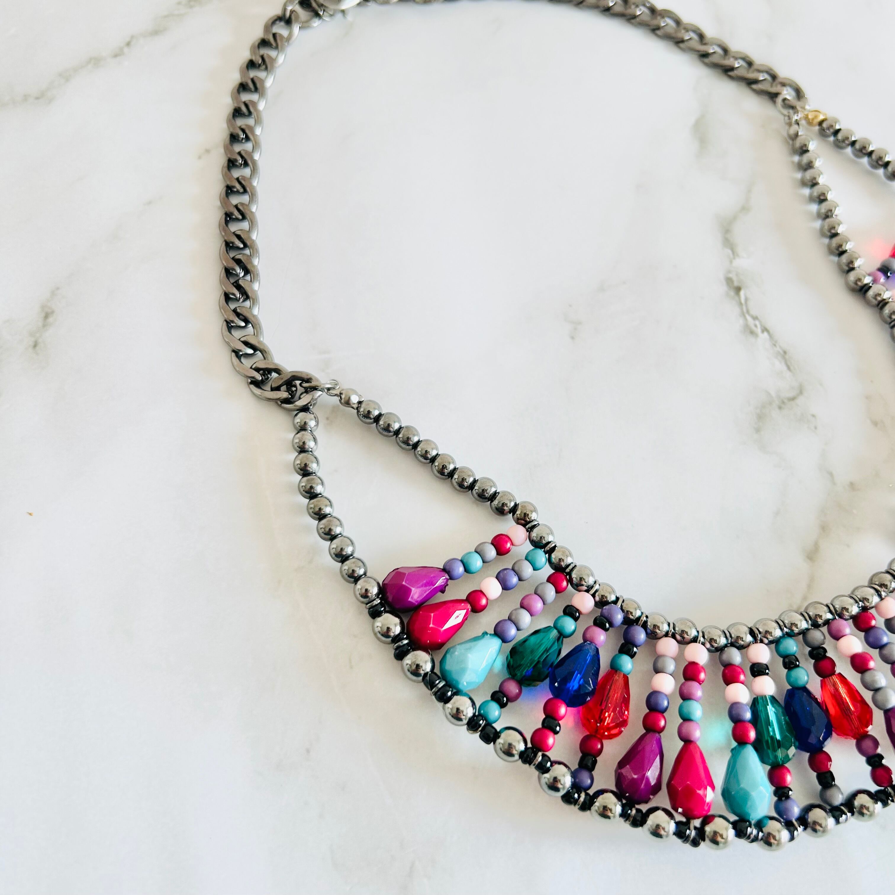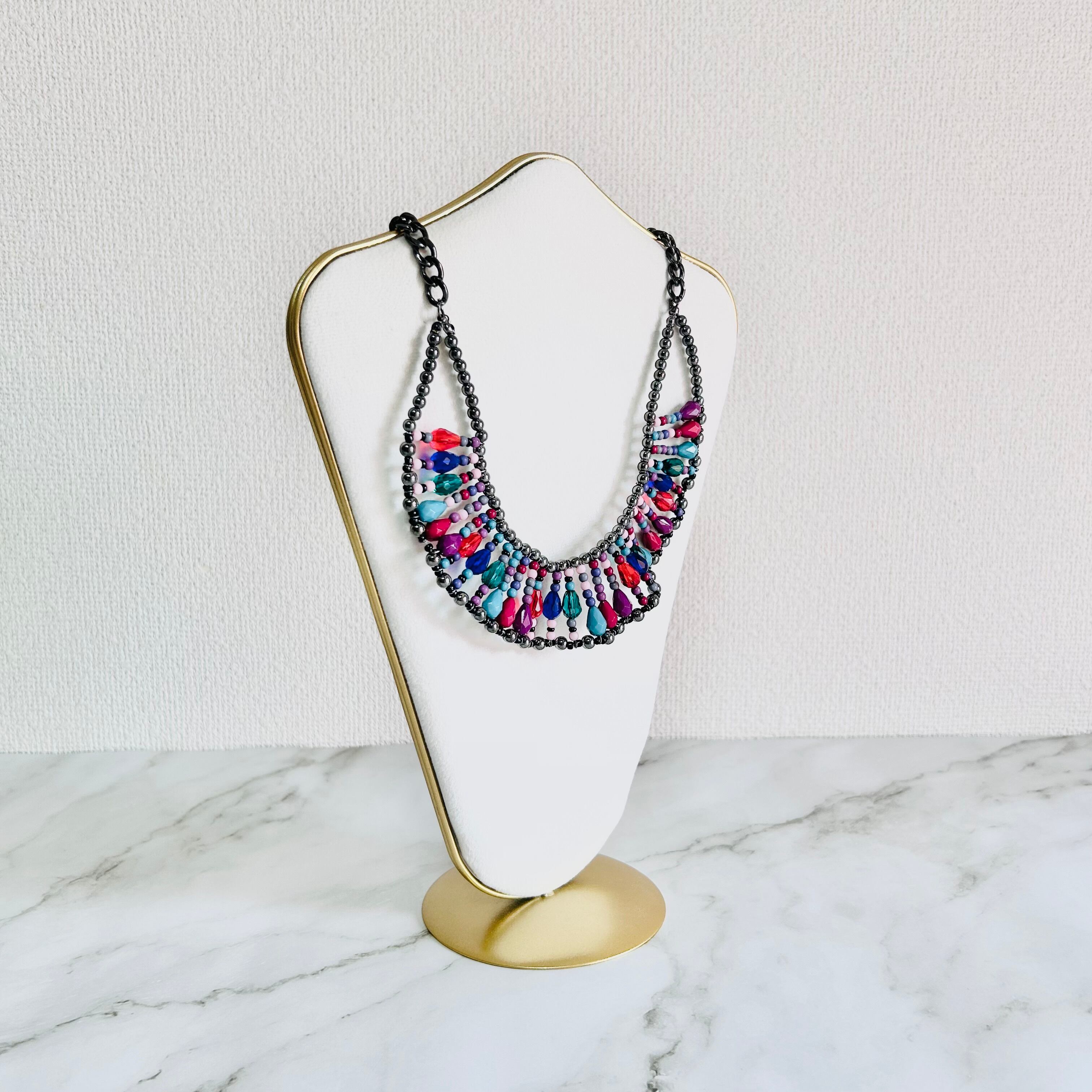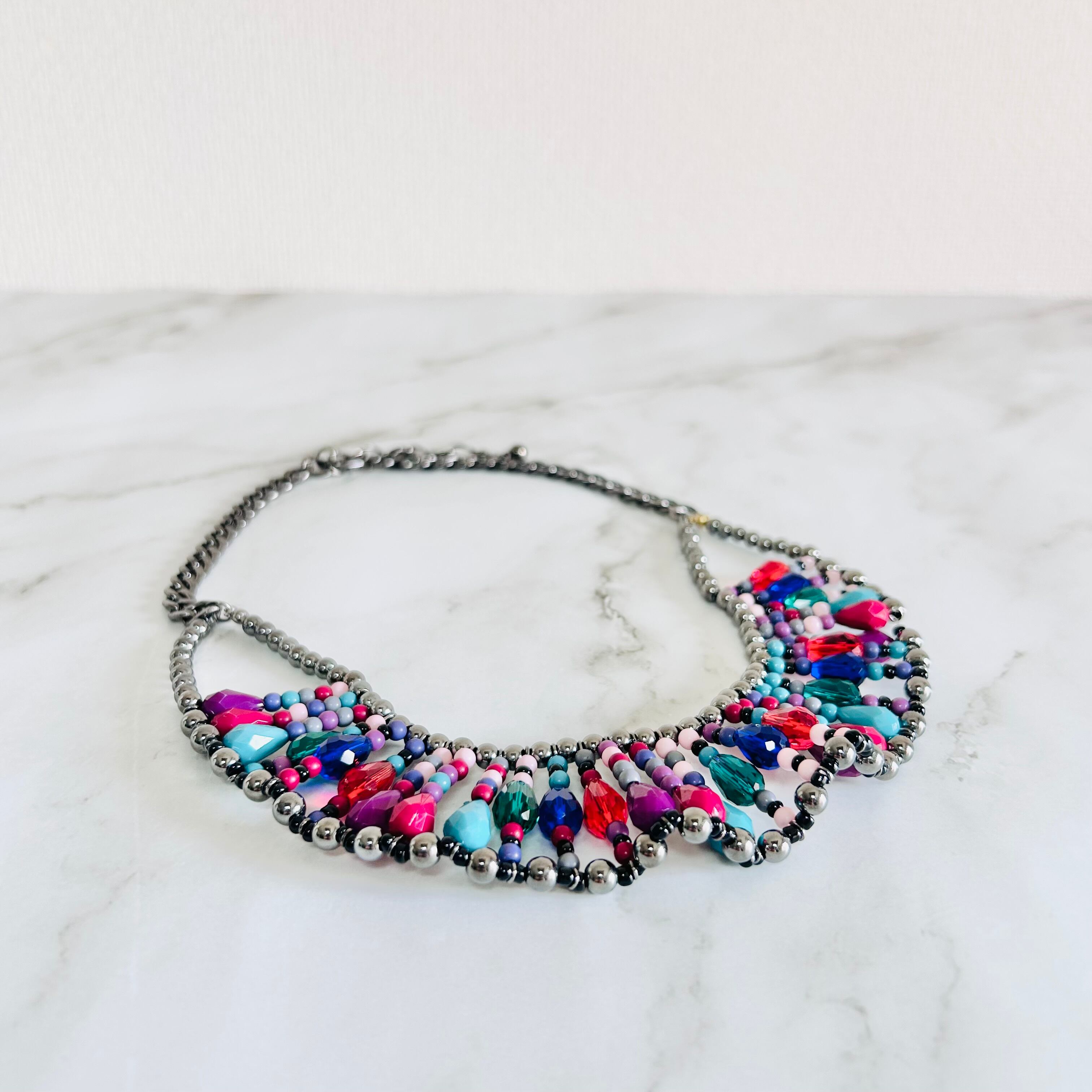 メタリックなガンメタルカラーのチェーンに、ピンク・ターコイズ・レッド・パープルなど多彩なアクリルビーズを丁寧に並べた、扇状のデザインが印象的なネックレスです。