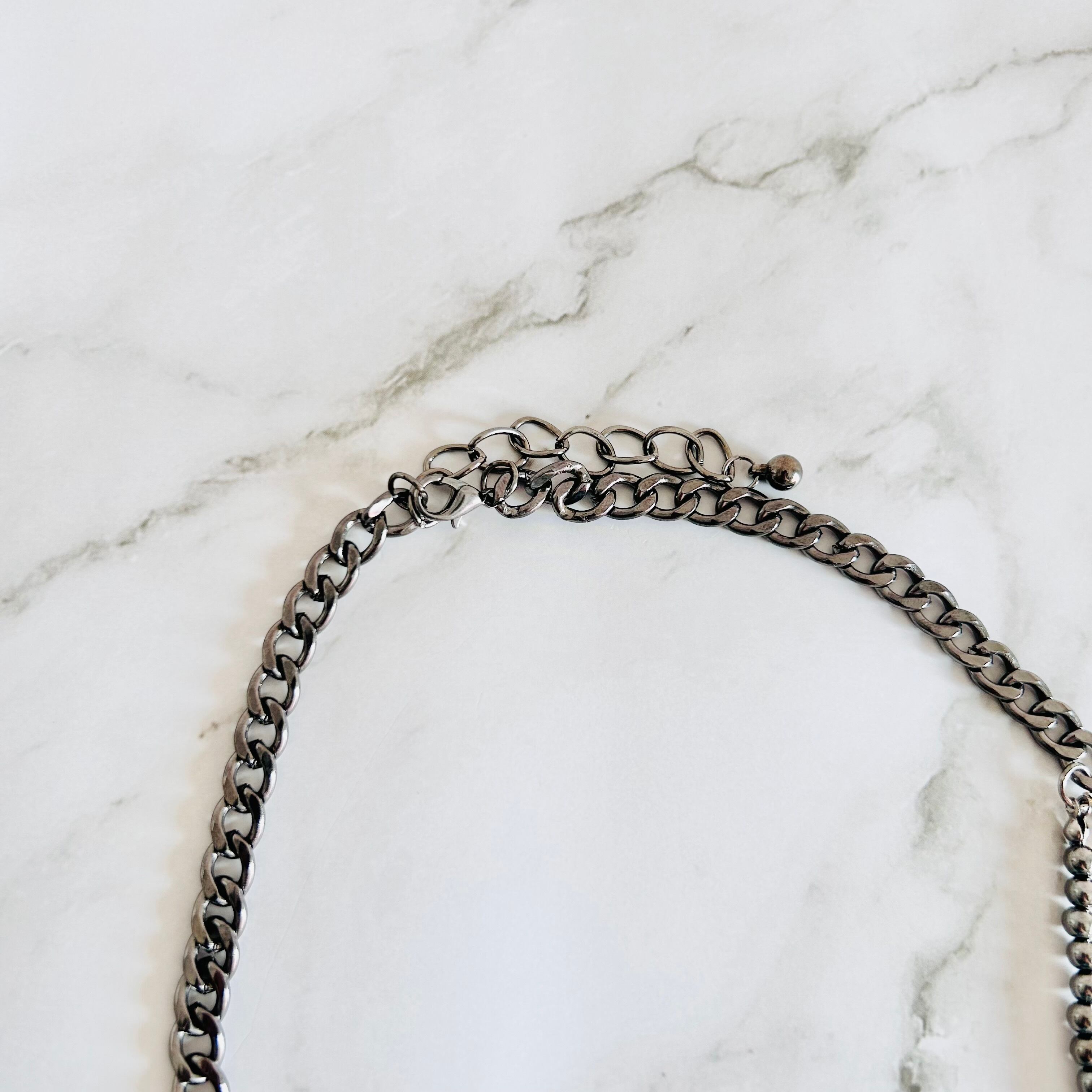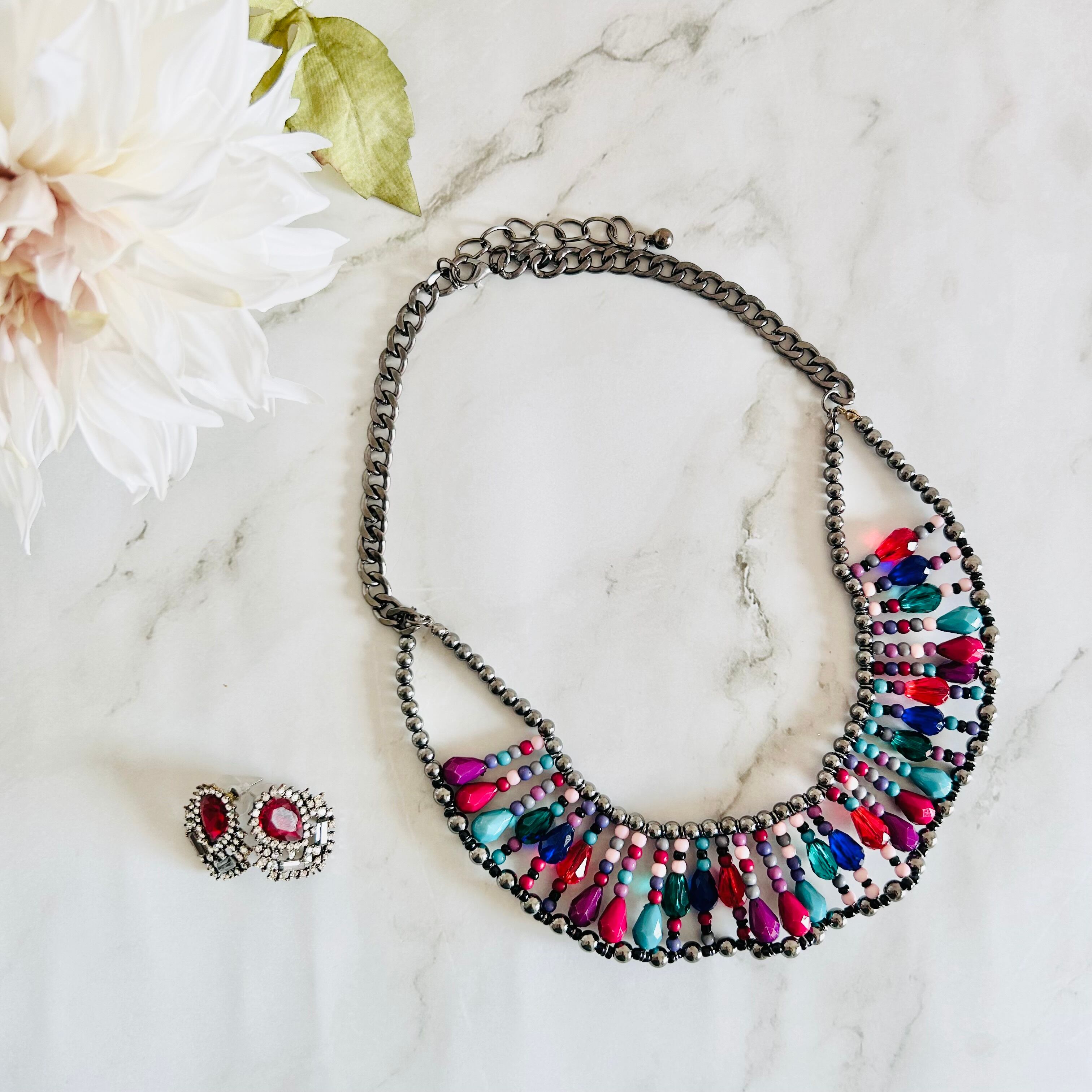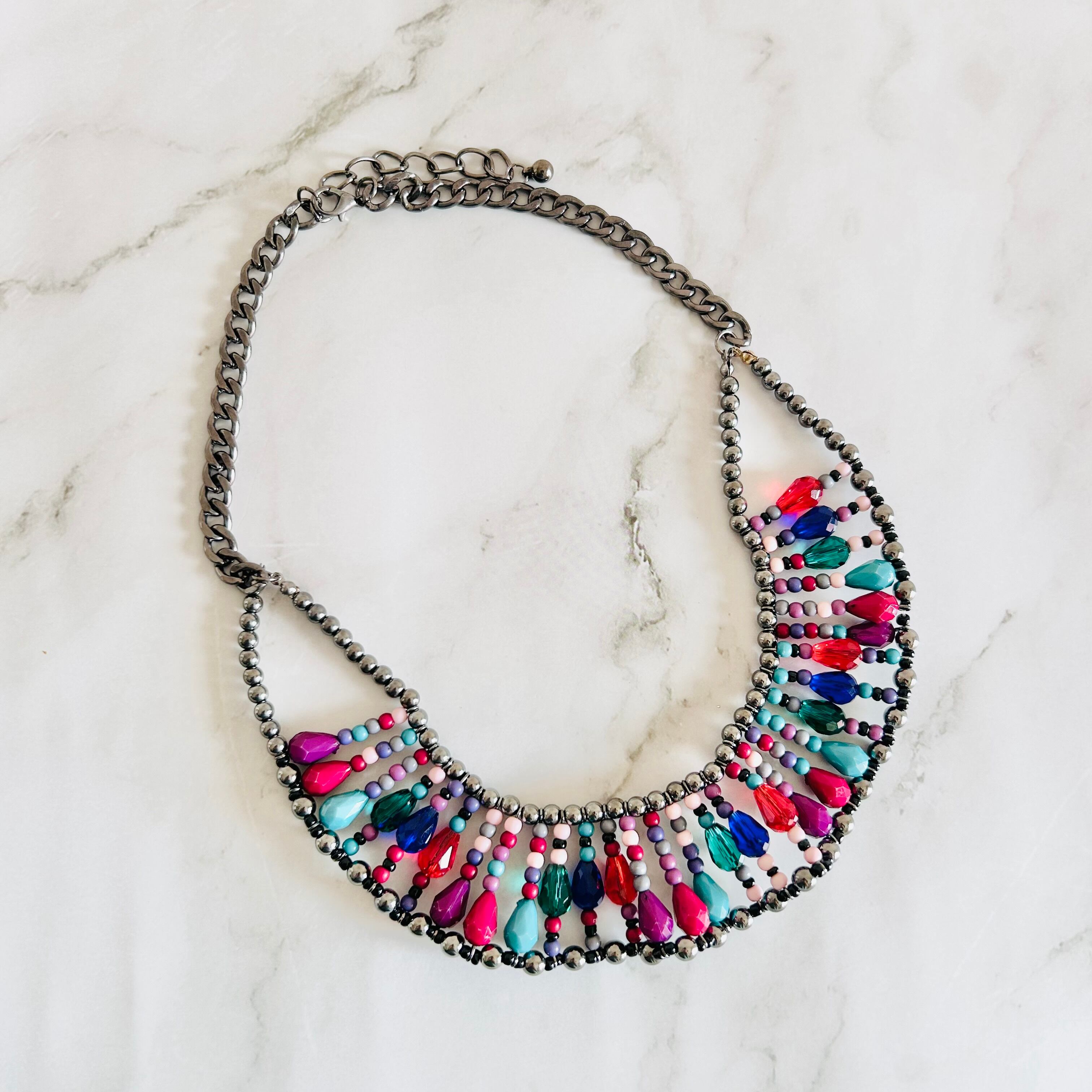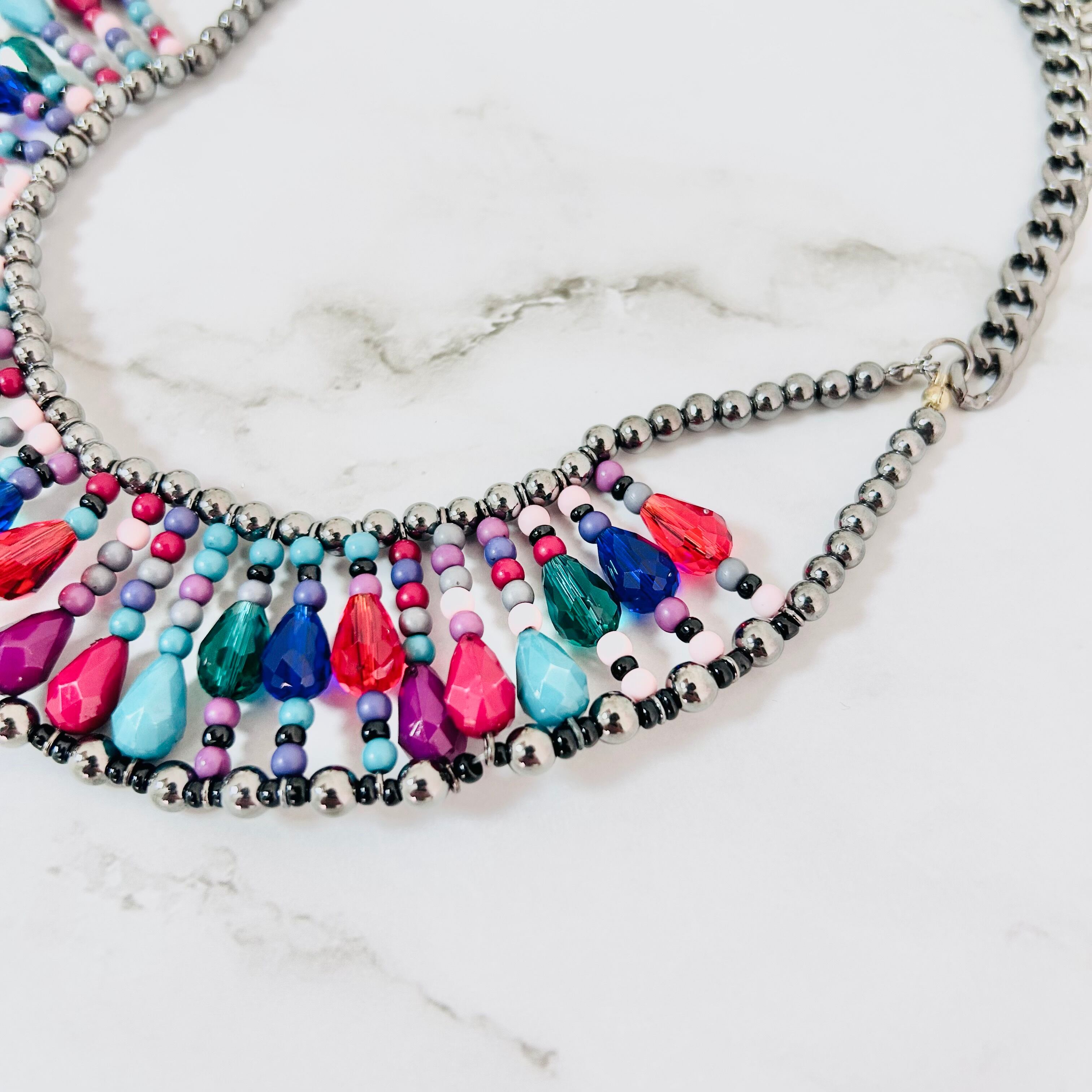 メタリックなガンメタルカラーのチェーンに、ピンク・ターコイズ・レッド・パープルなど多彩なアクリルビーズを丁寧に並べた、扇状のデザインが印象的なネックレスです。