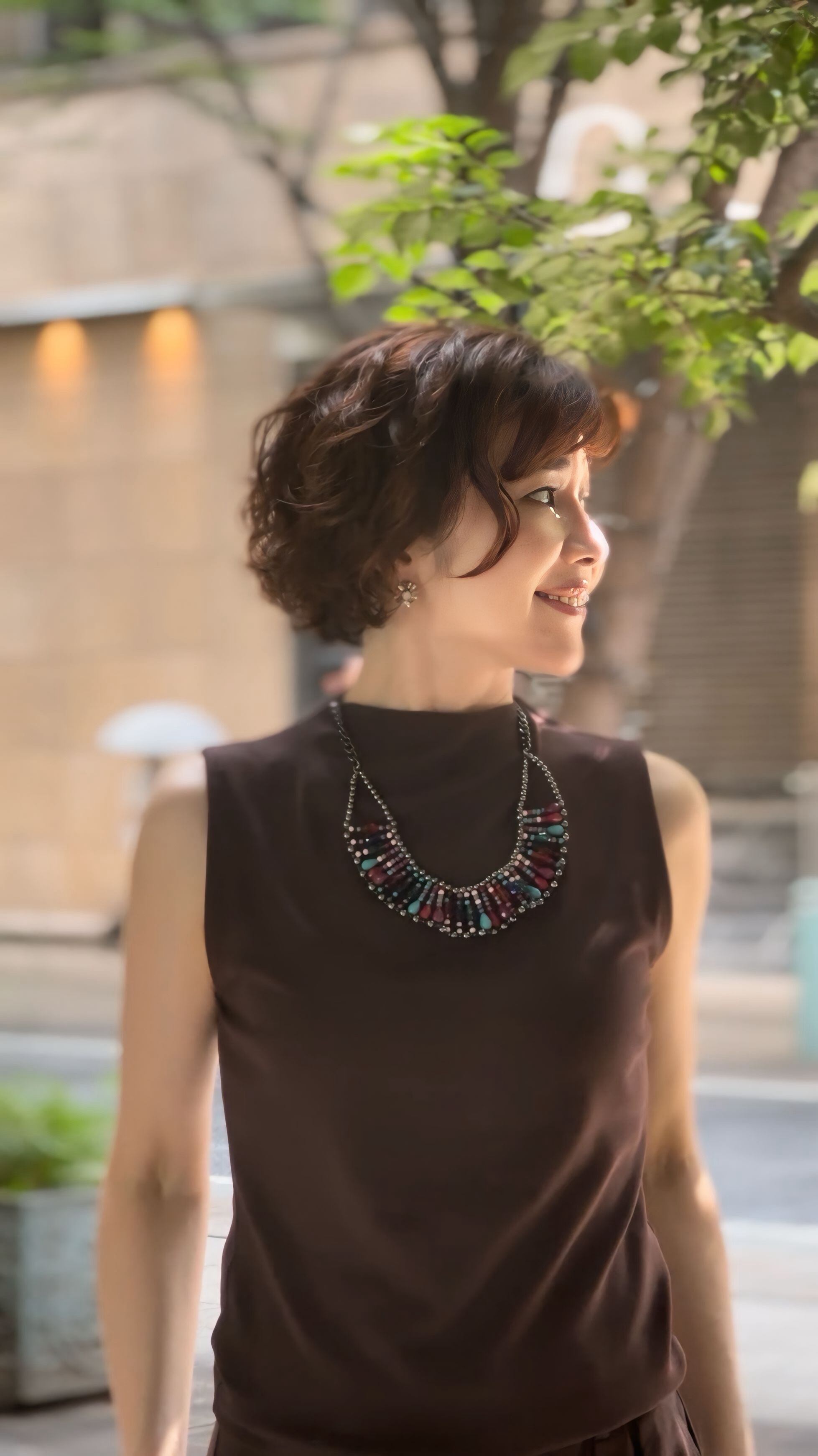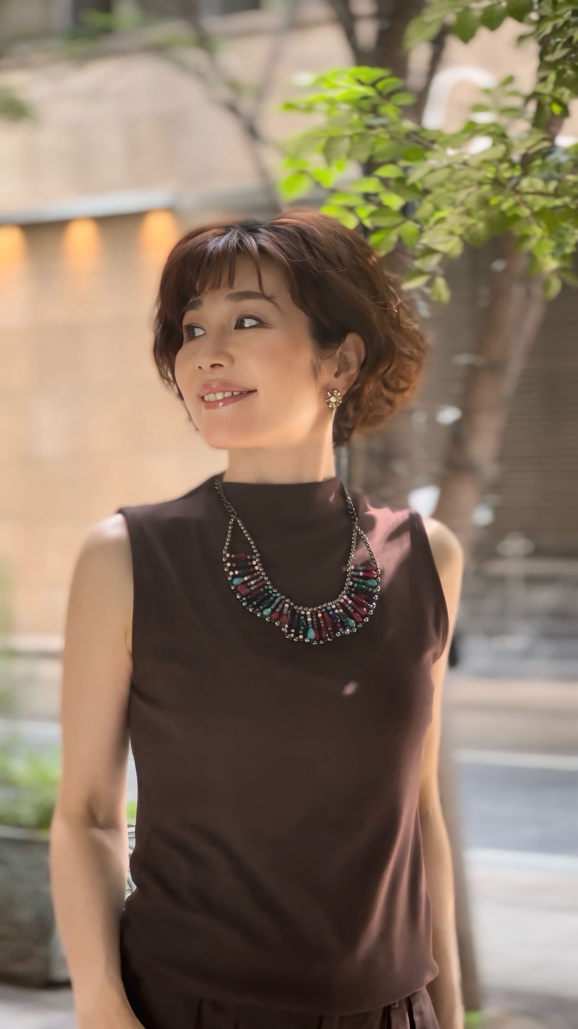 シンプルなブラックワンピースや白のトップスに合わせれば、ネックレスの美しい色彩が一層際立ちます。