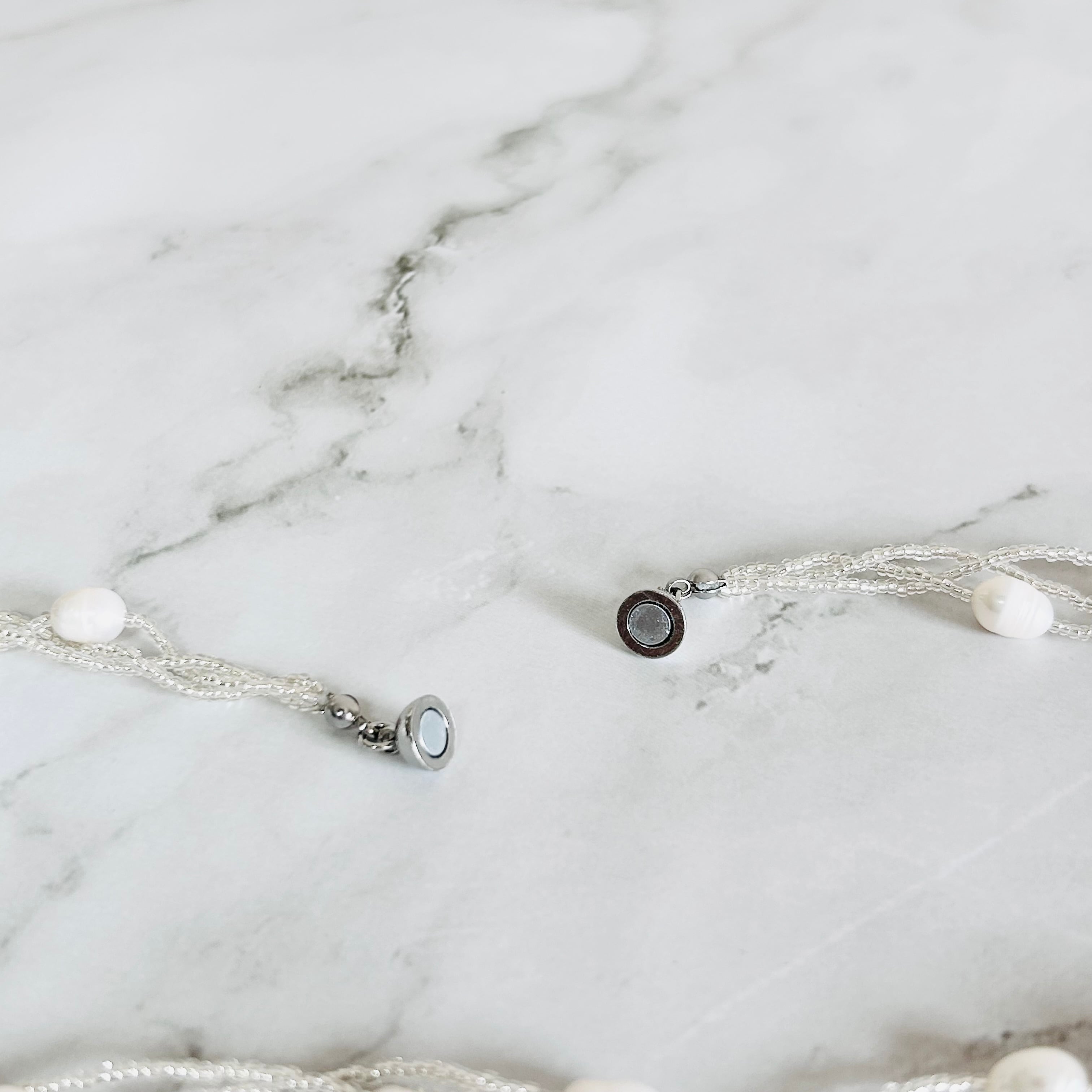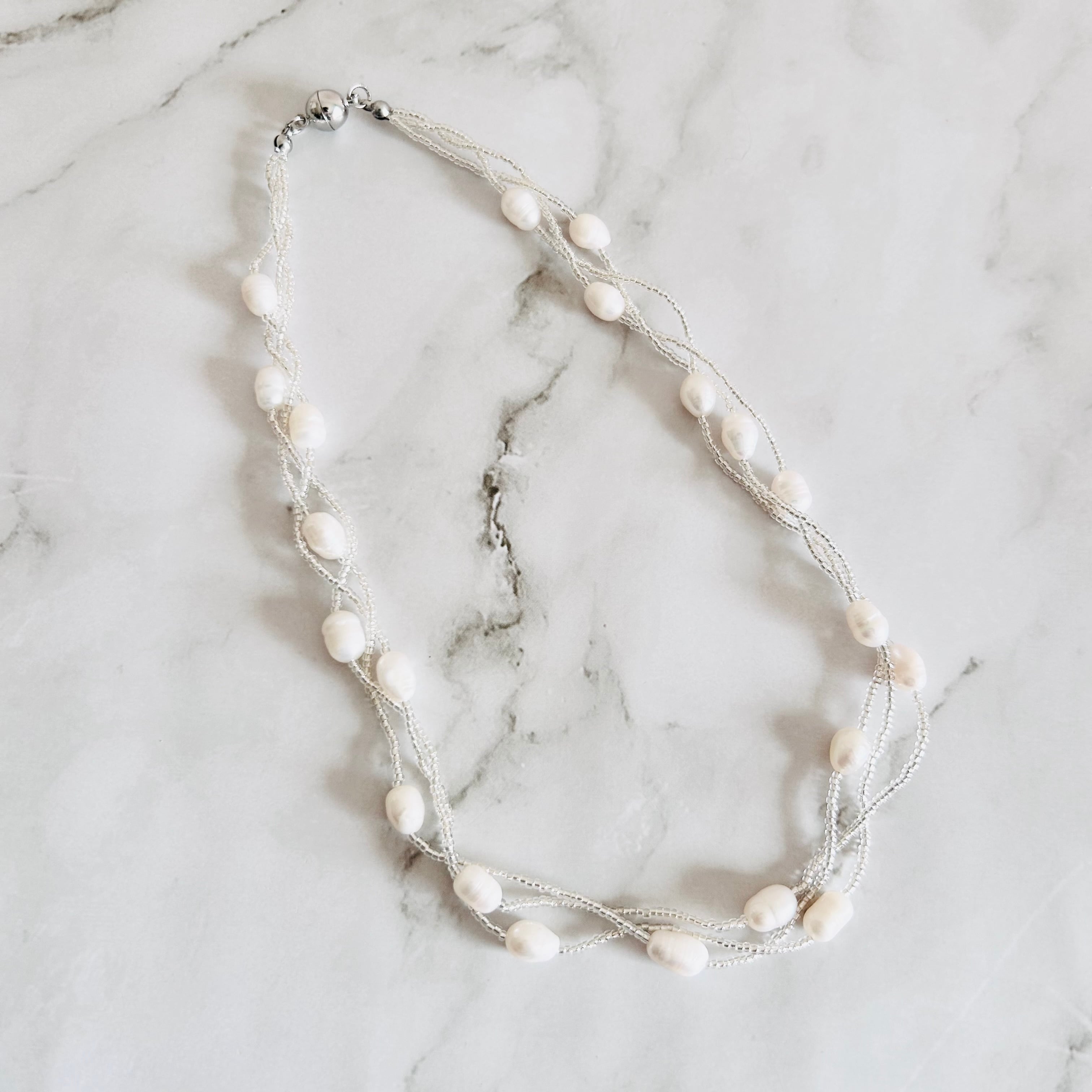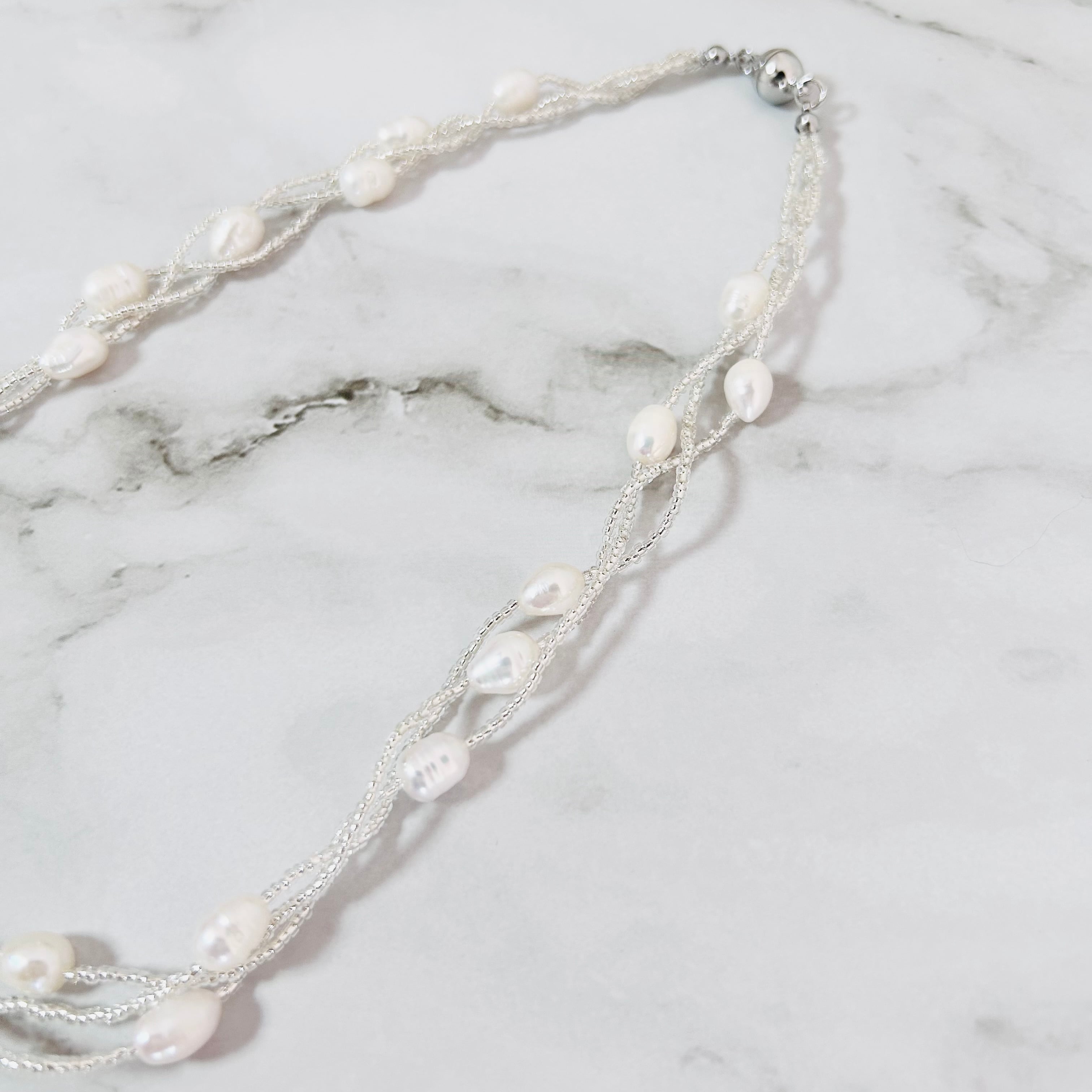 天然の淡水パールと、繊細な輝きを放つシルバービーズを組み合わせたネックレスです。