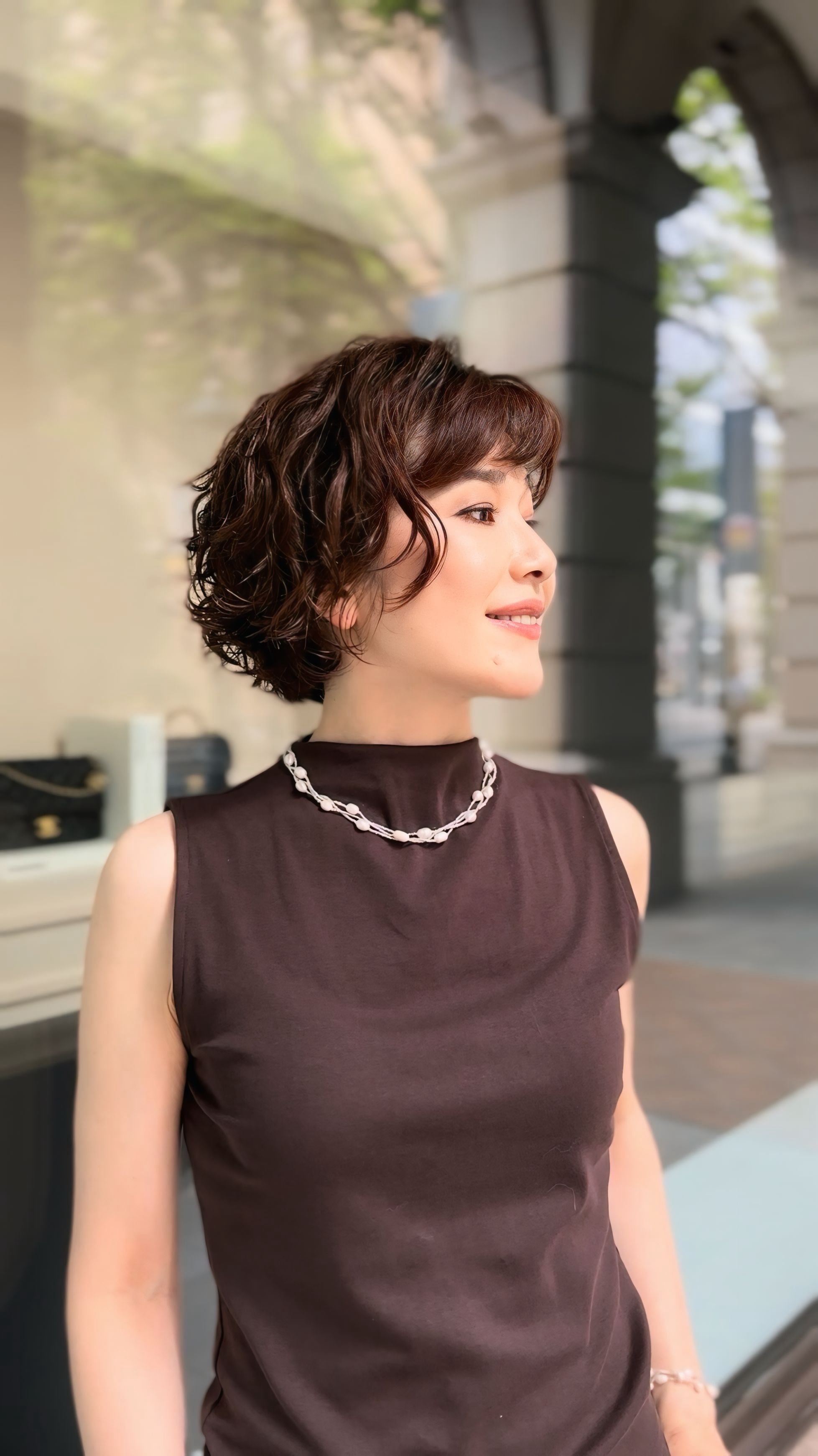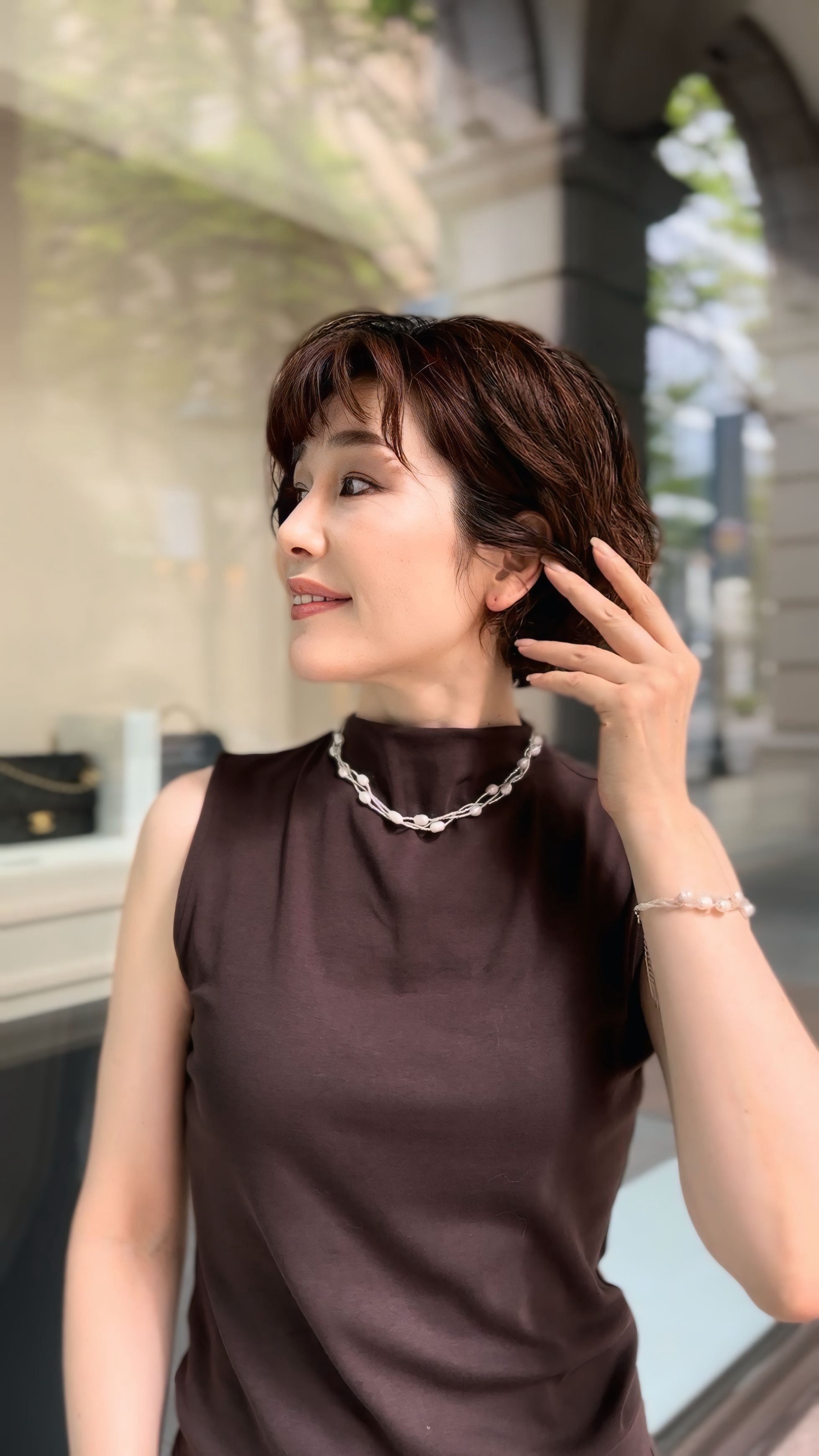 夏は涼しげなワンピースやカットソーと合わせて爽やかに、冬はタートルネックの上から重ねてクラシカルな印象に。