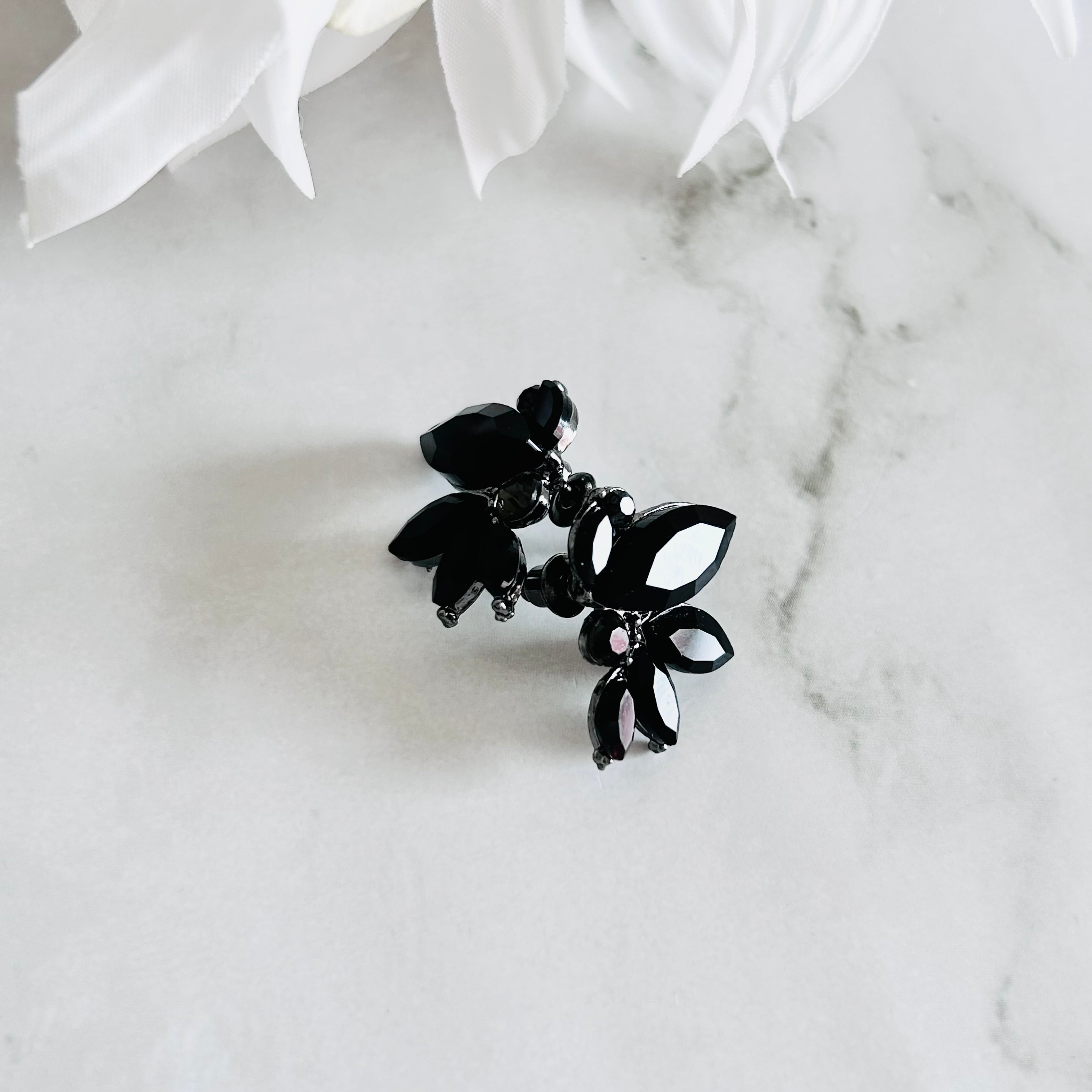 漆黒のガラスビジューをフラワーモチーフにあしらった、エレガントなピアスです。