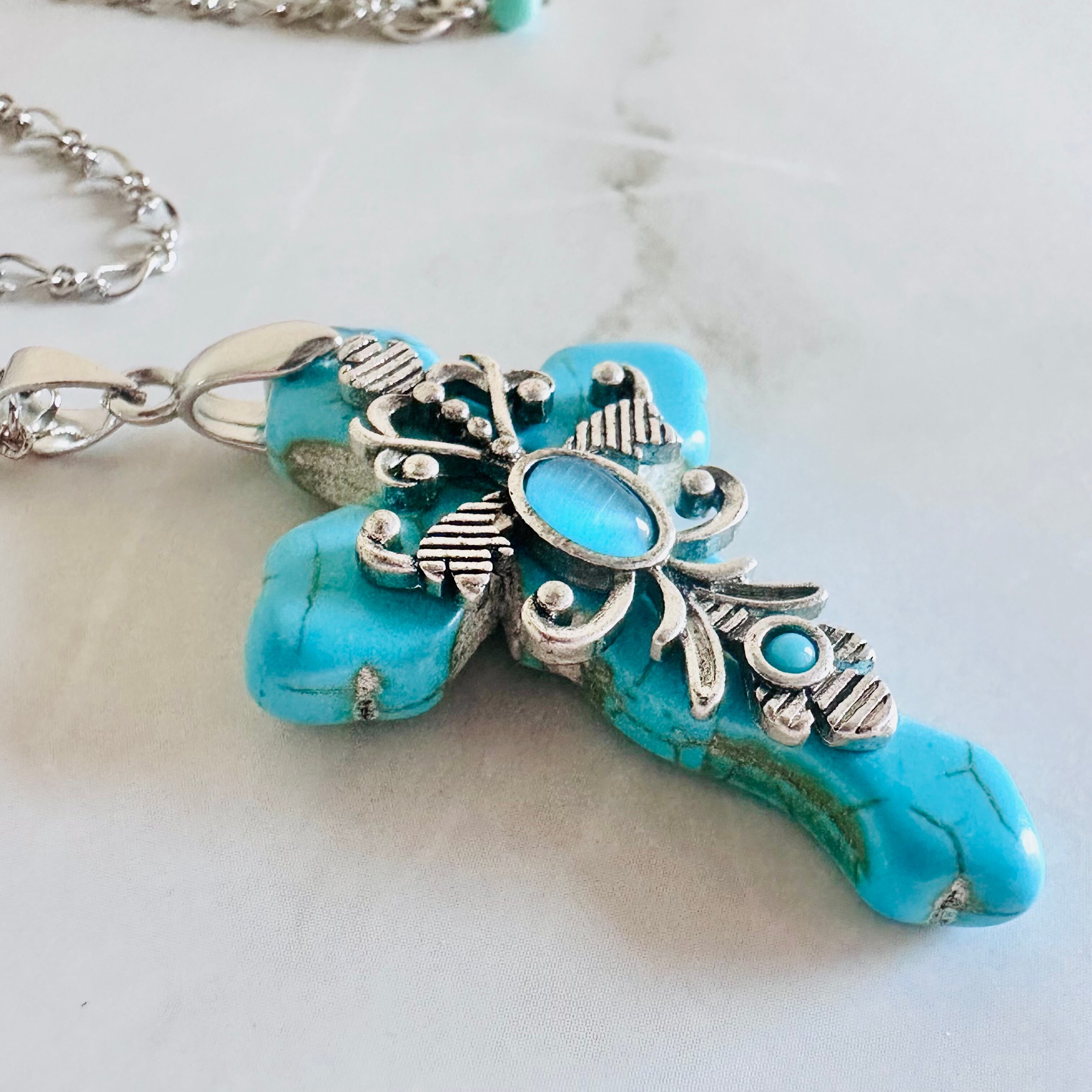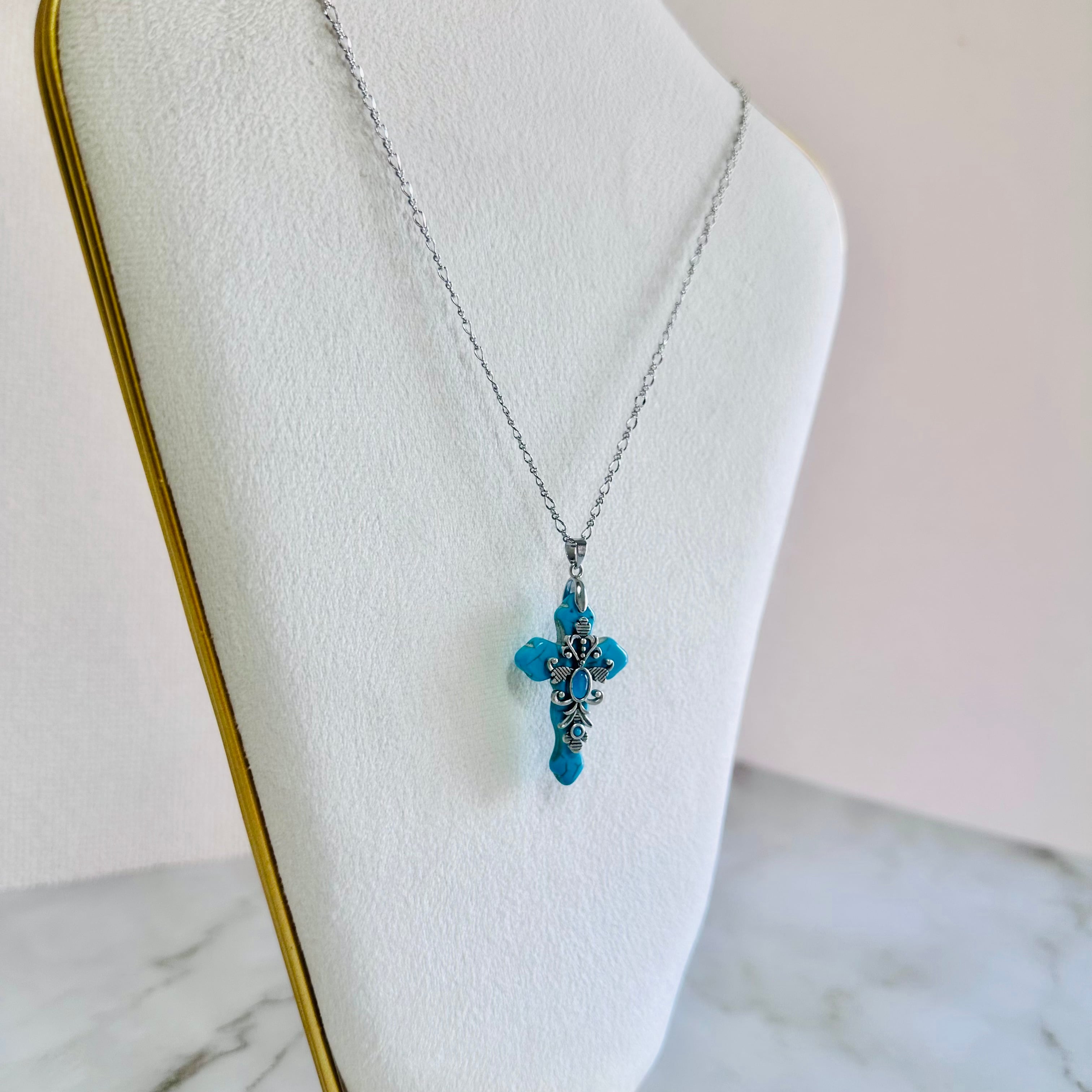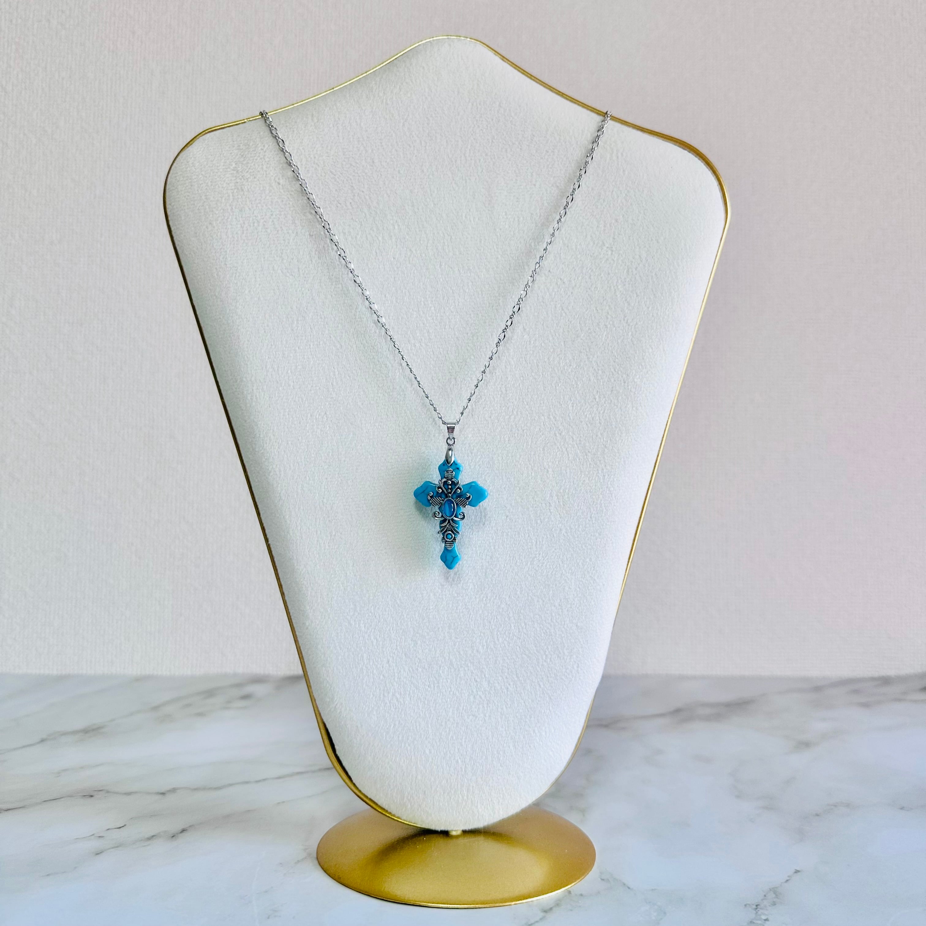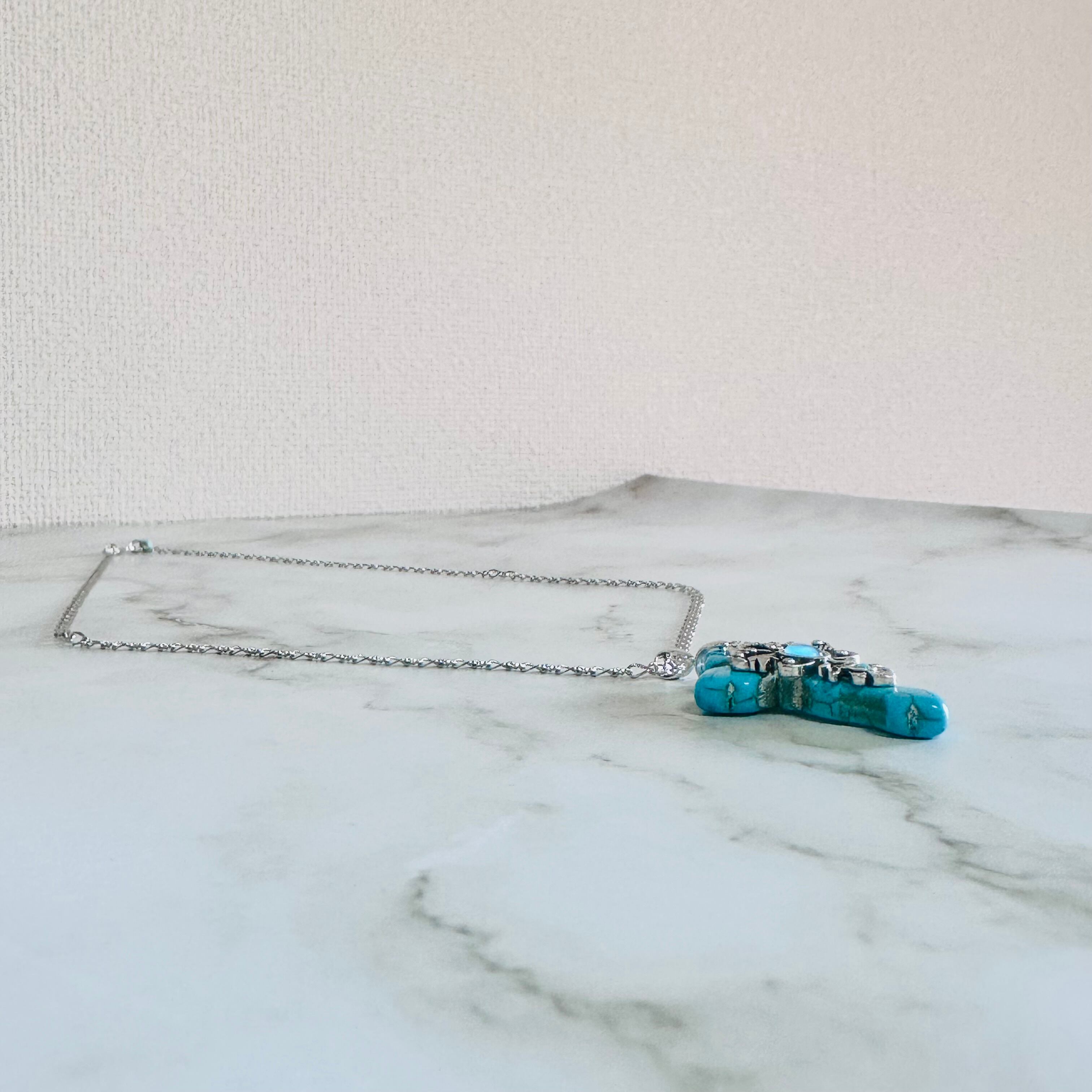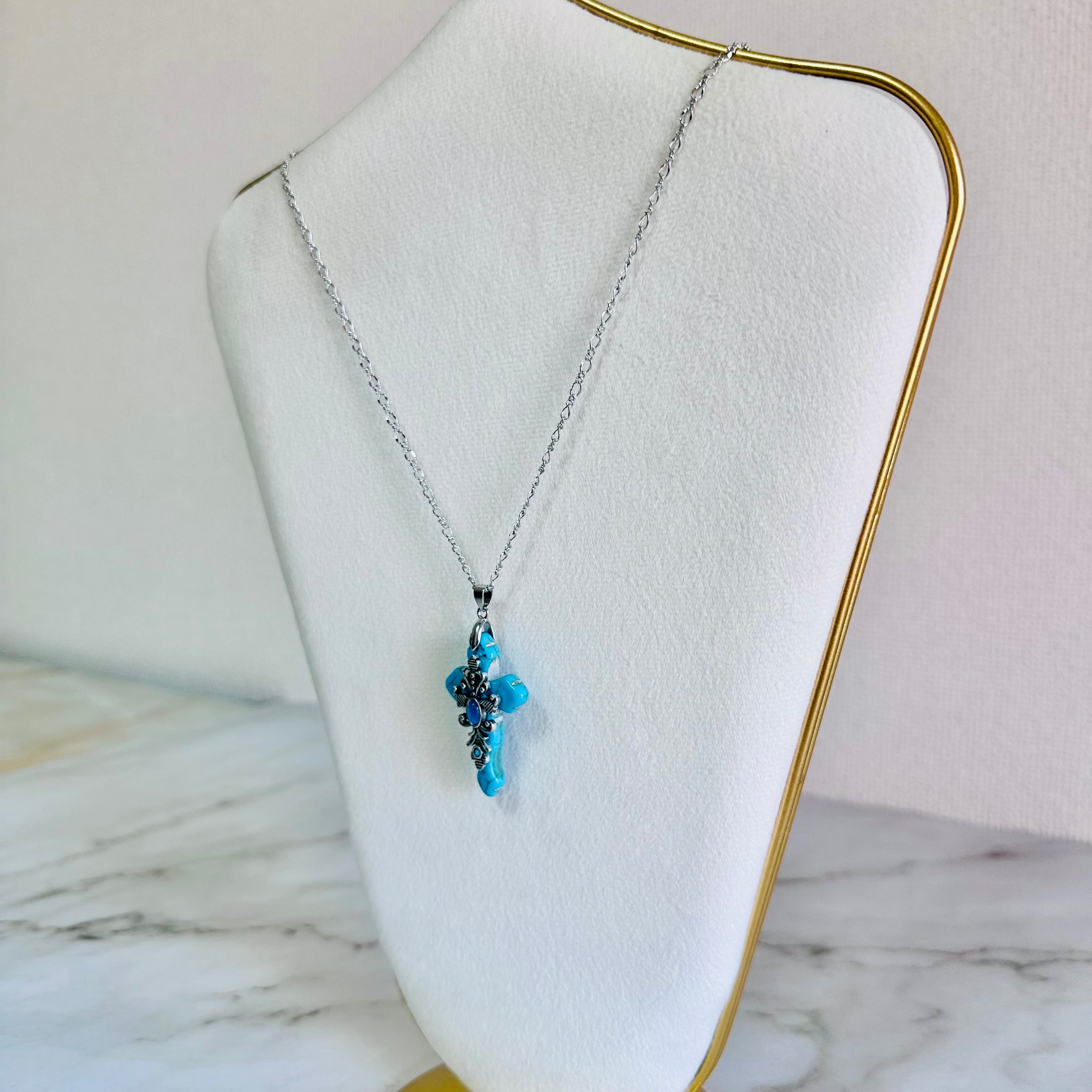 ターコイズブルーの天然石をクロス型にあしらい、中央と上下には精緻なシルバーモチーフを施したネックレスです。