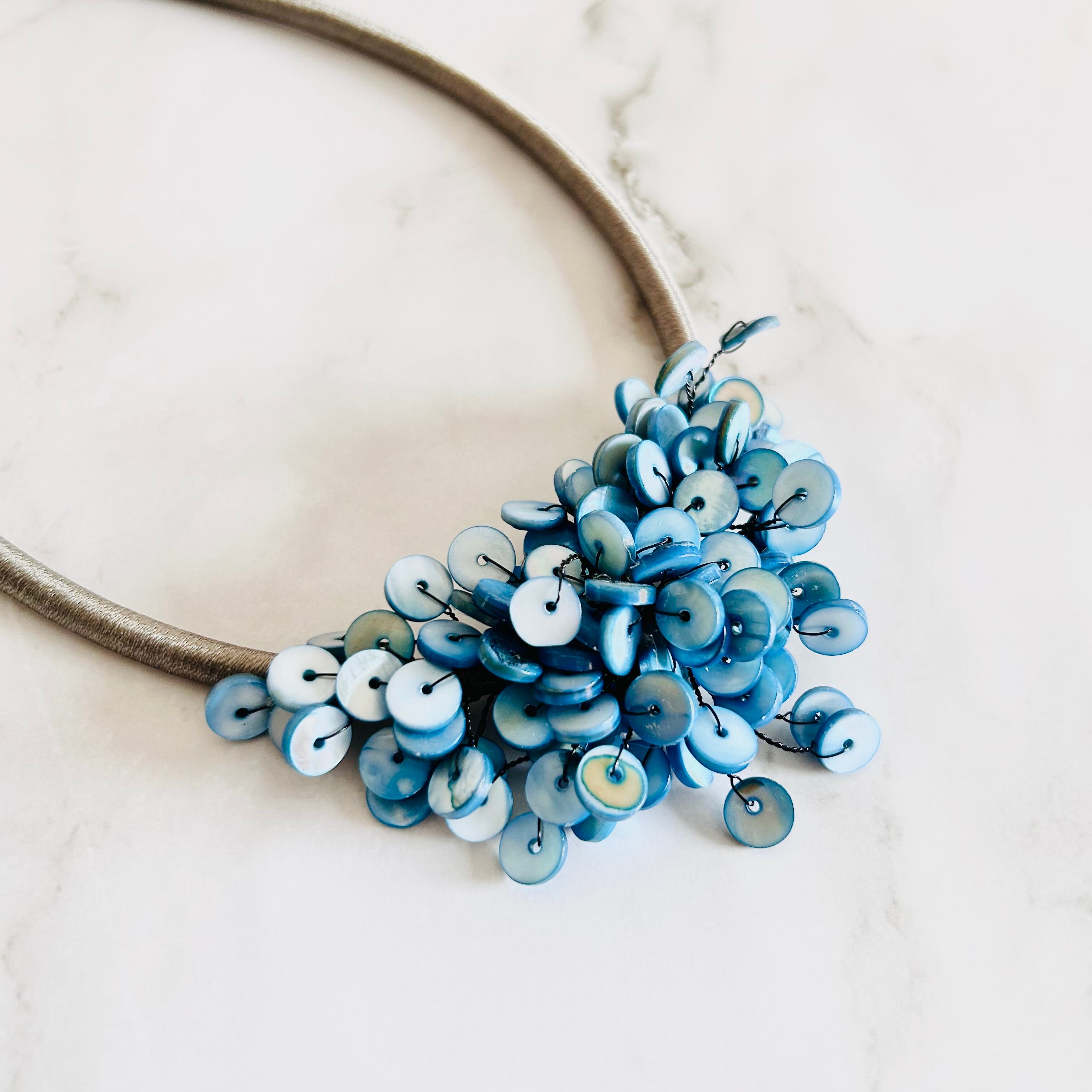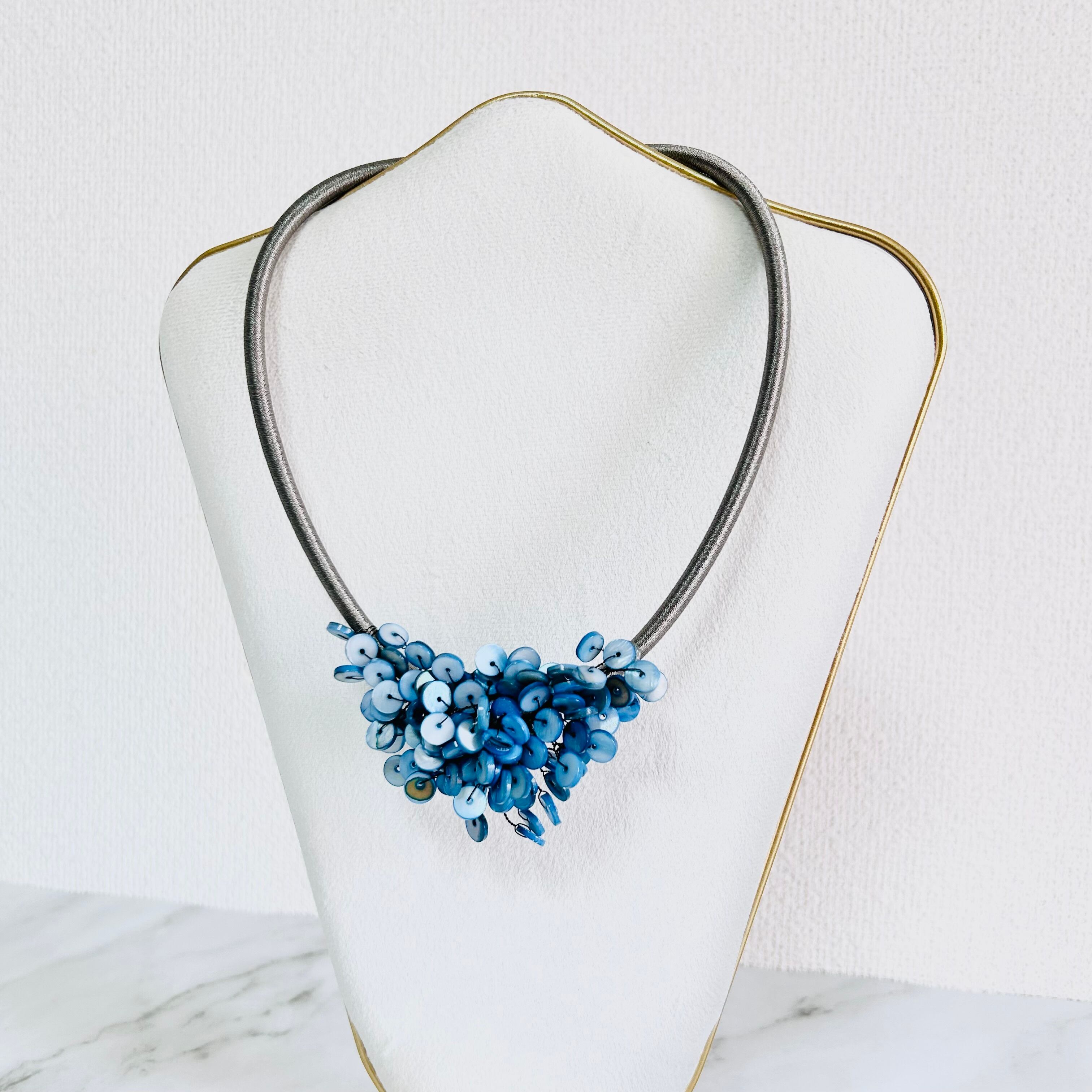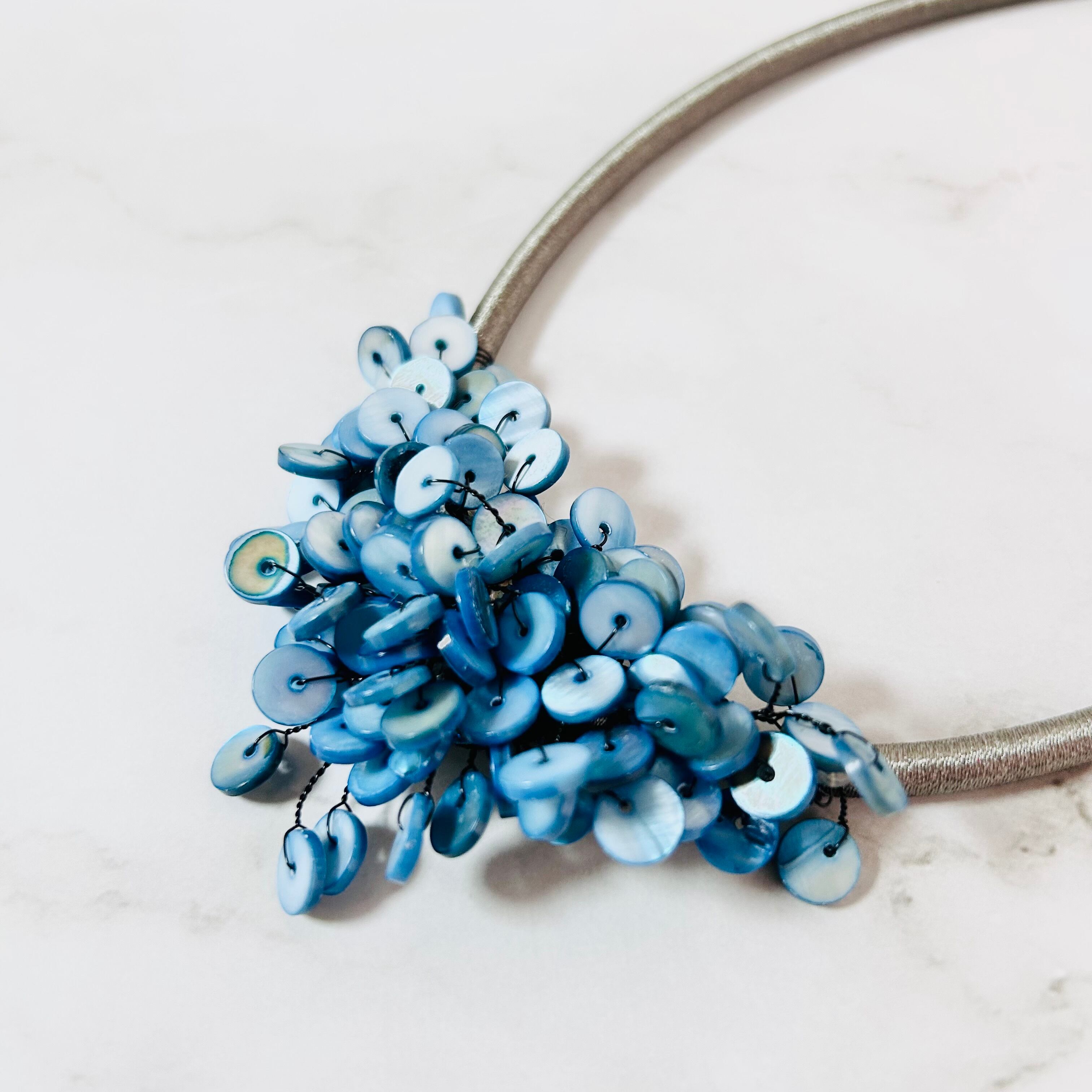 涼やかなブルーのシェルパーツを贅沢に重ね、まるで海面にきらめく波のような表情を持たせたネックレスです。