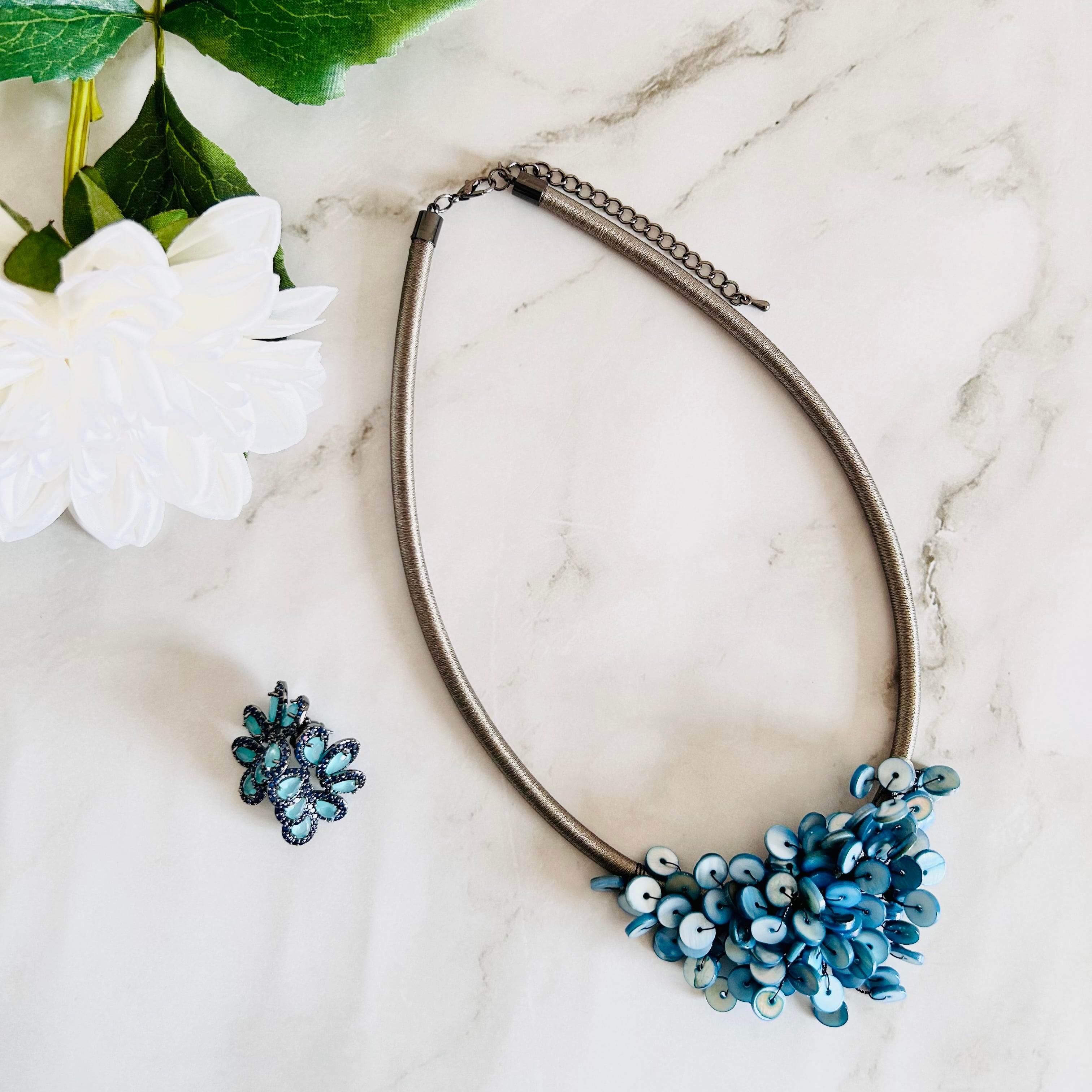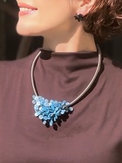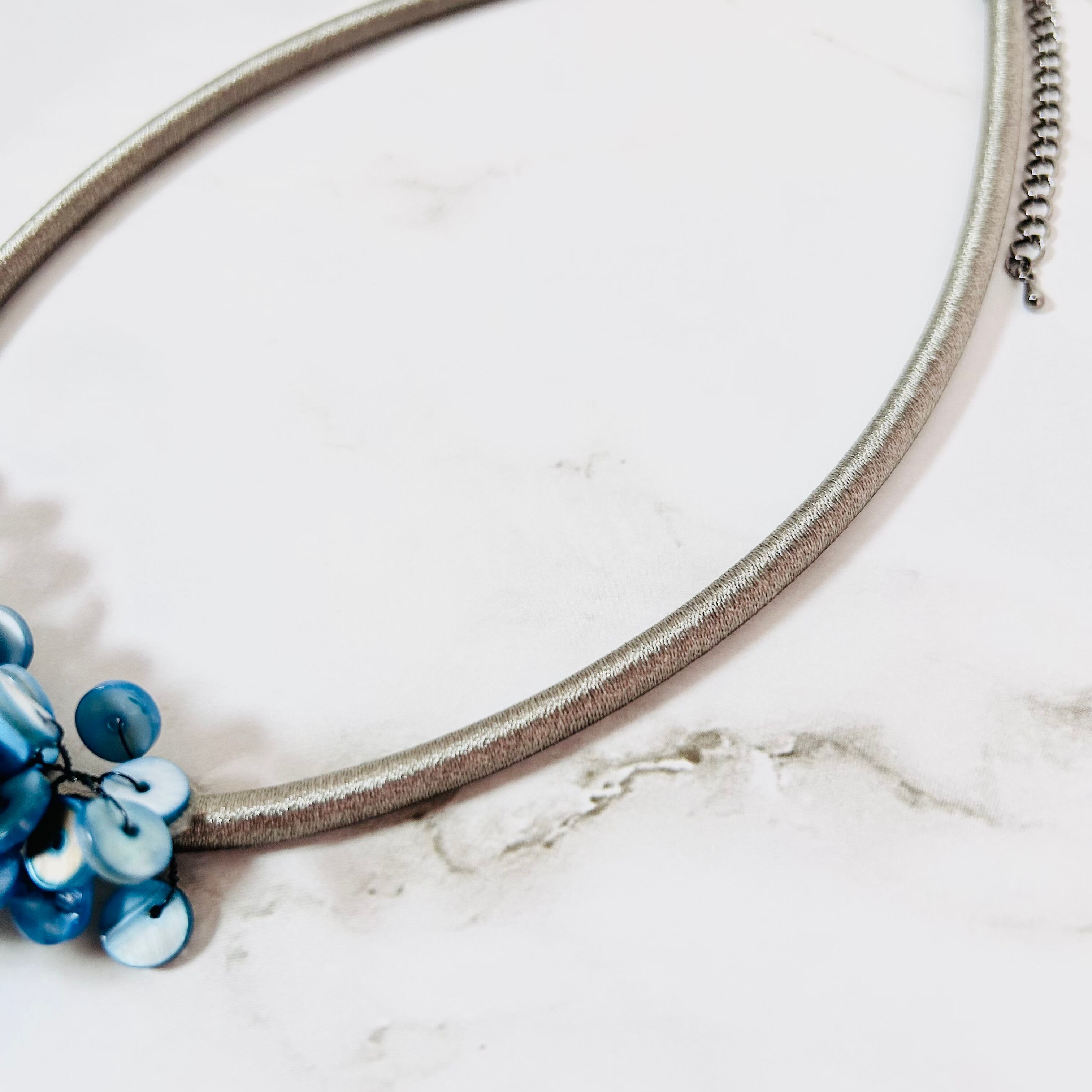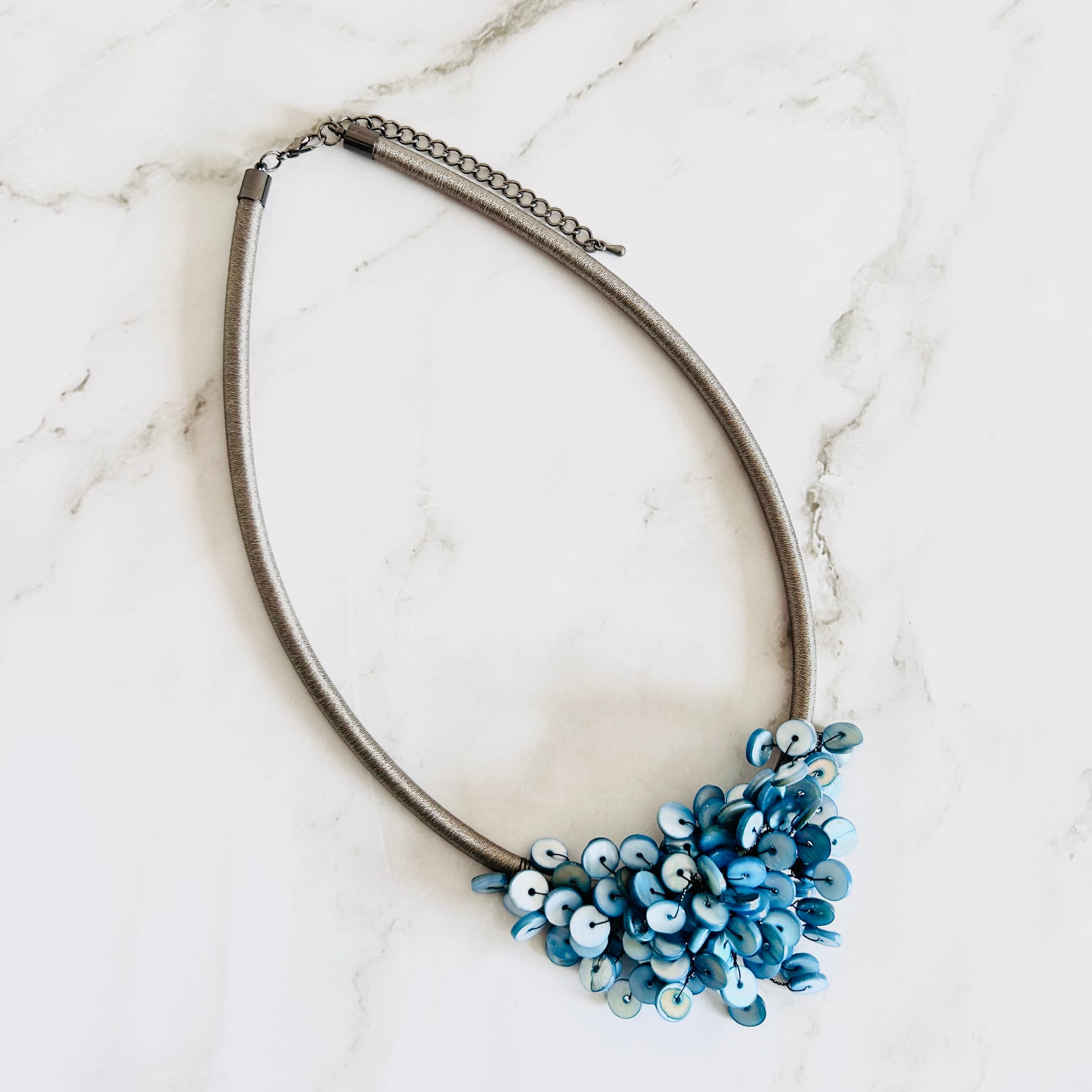 涼やかなブルーのシェルパーツを贅沢に重ね、まるで海面にきらめく波のような表情を持たせたネックレスです。
