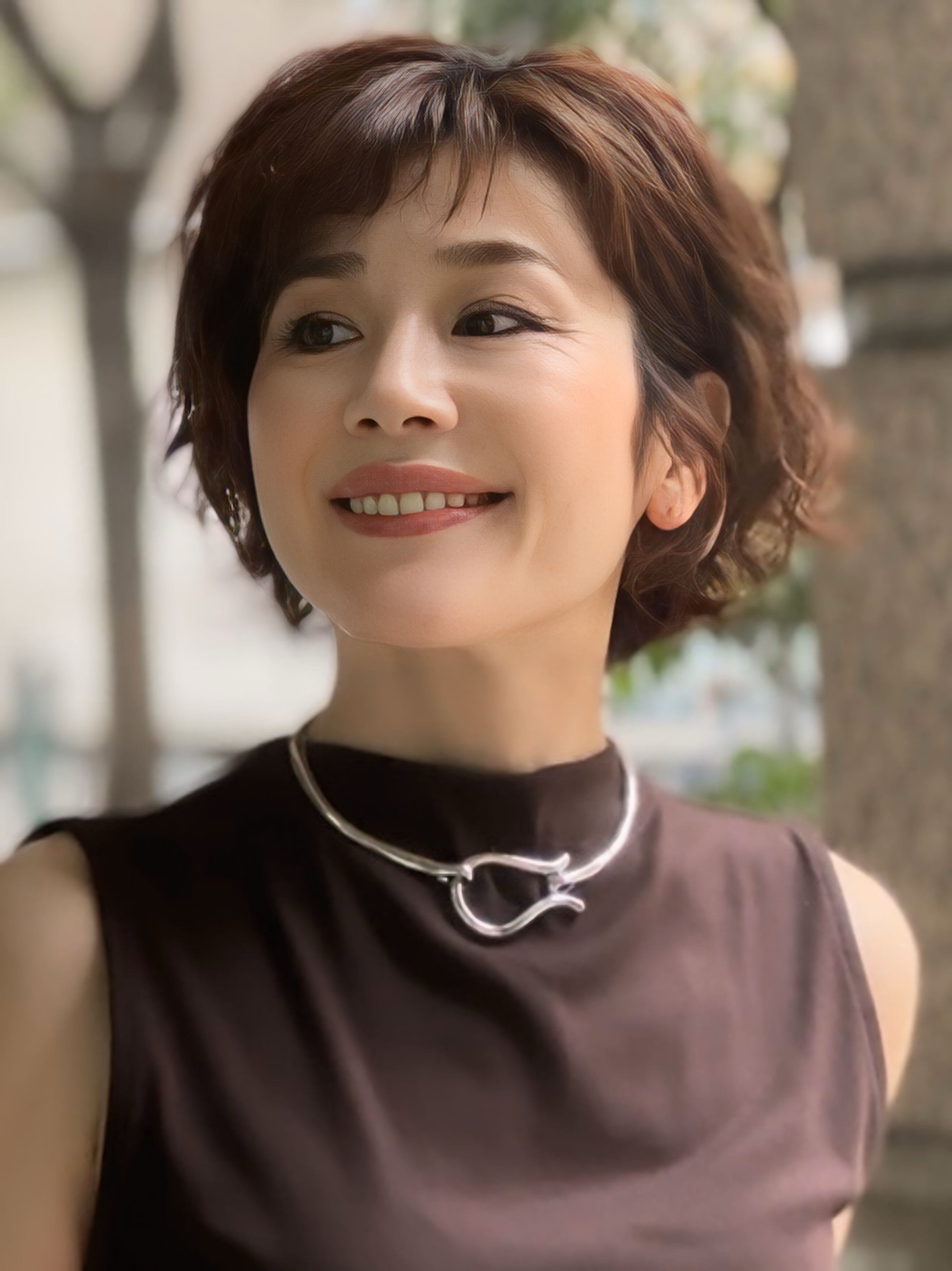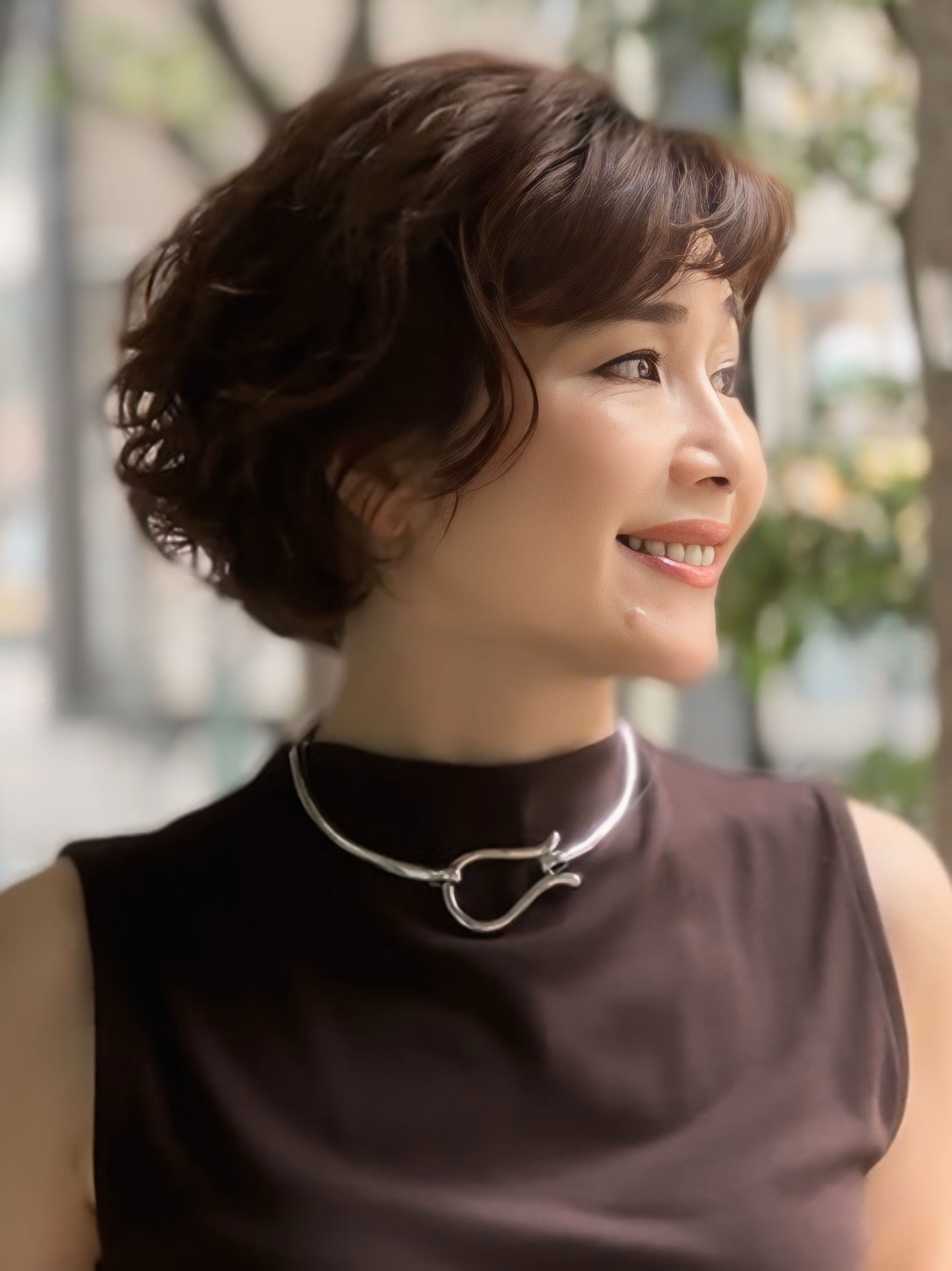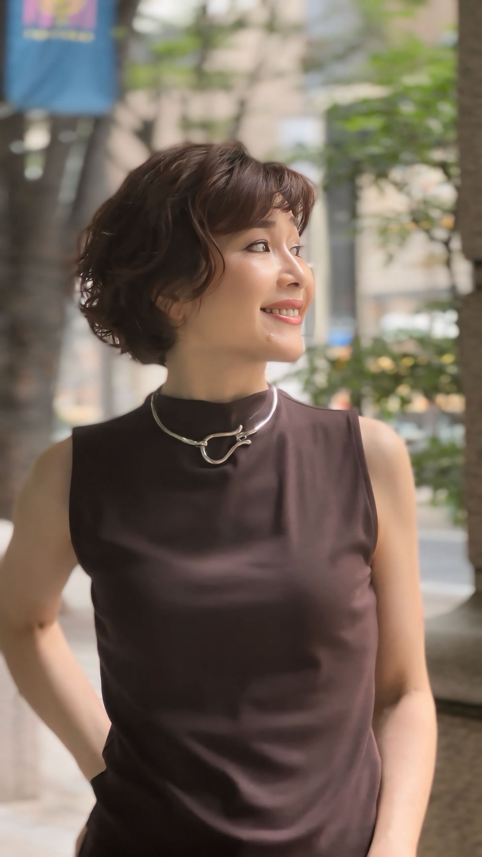 艶やかなメタルの光沢が首元をすっきりと引き立て、洗練された印象を演出します。