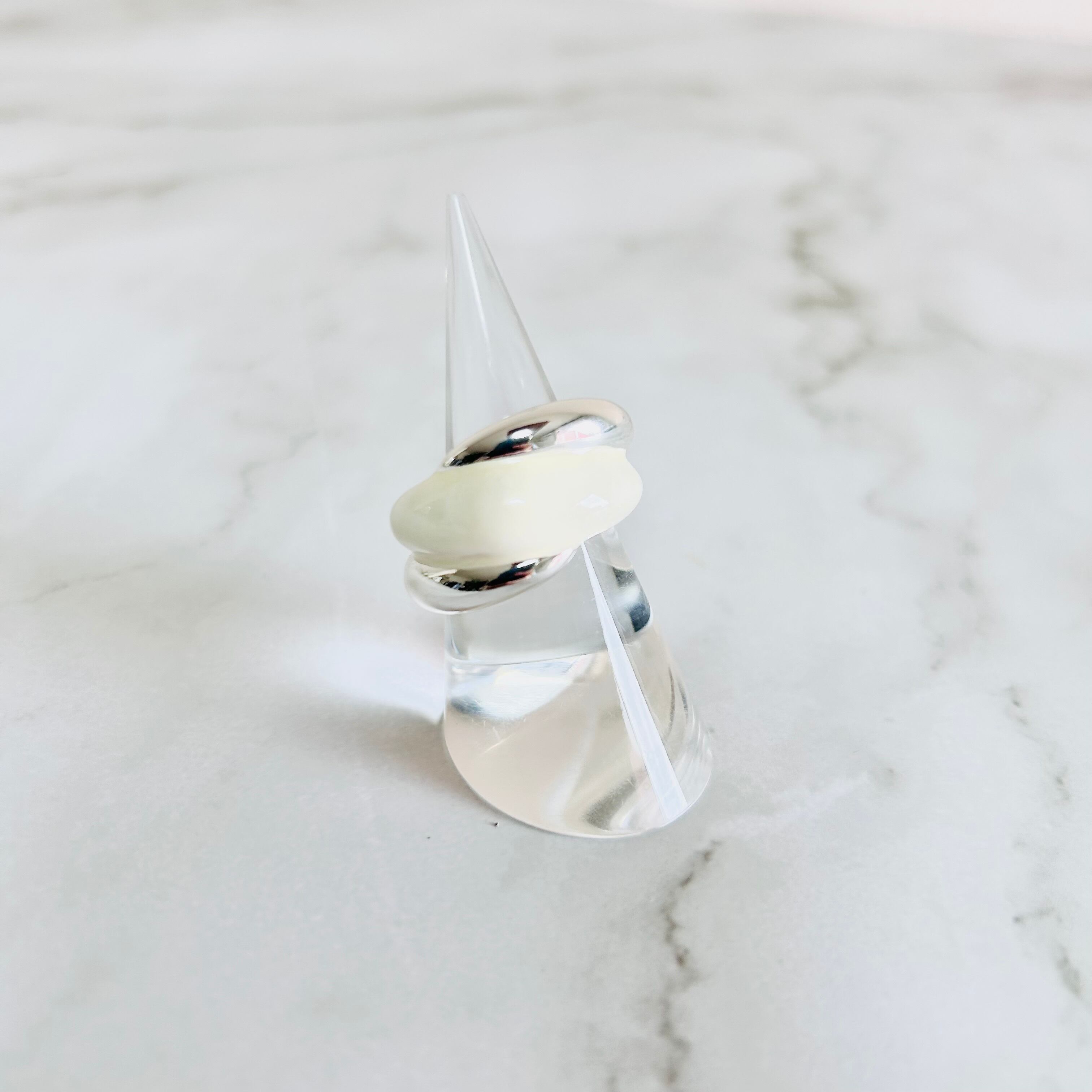 しっとりとしたホワイトと艶やかなシルバーが流れるように溶け合った、モダンなデザインのリングです。