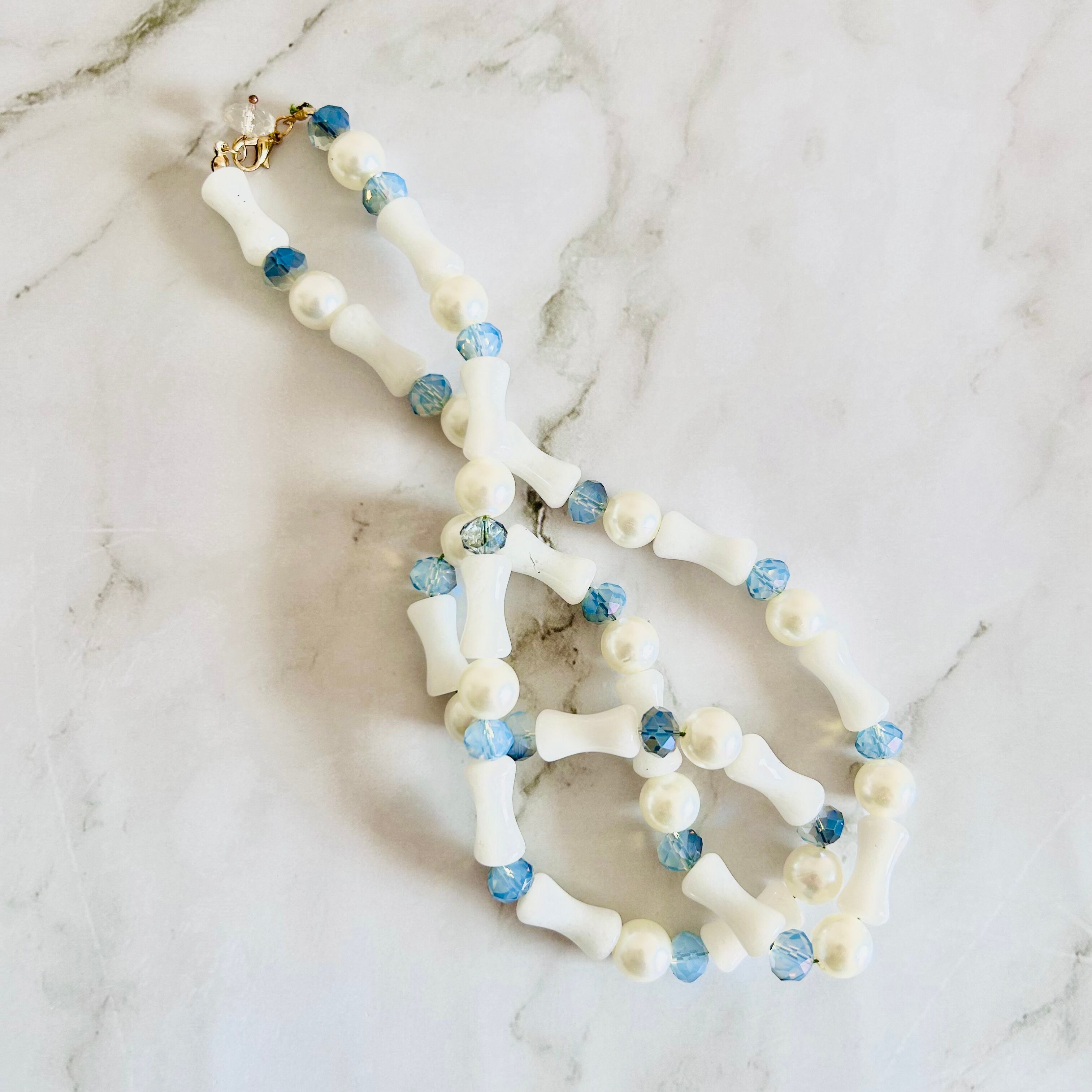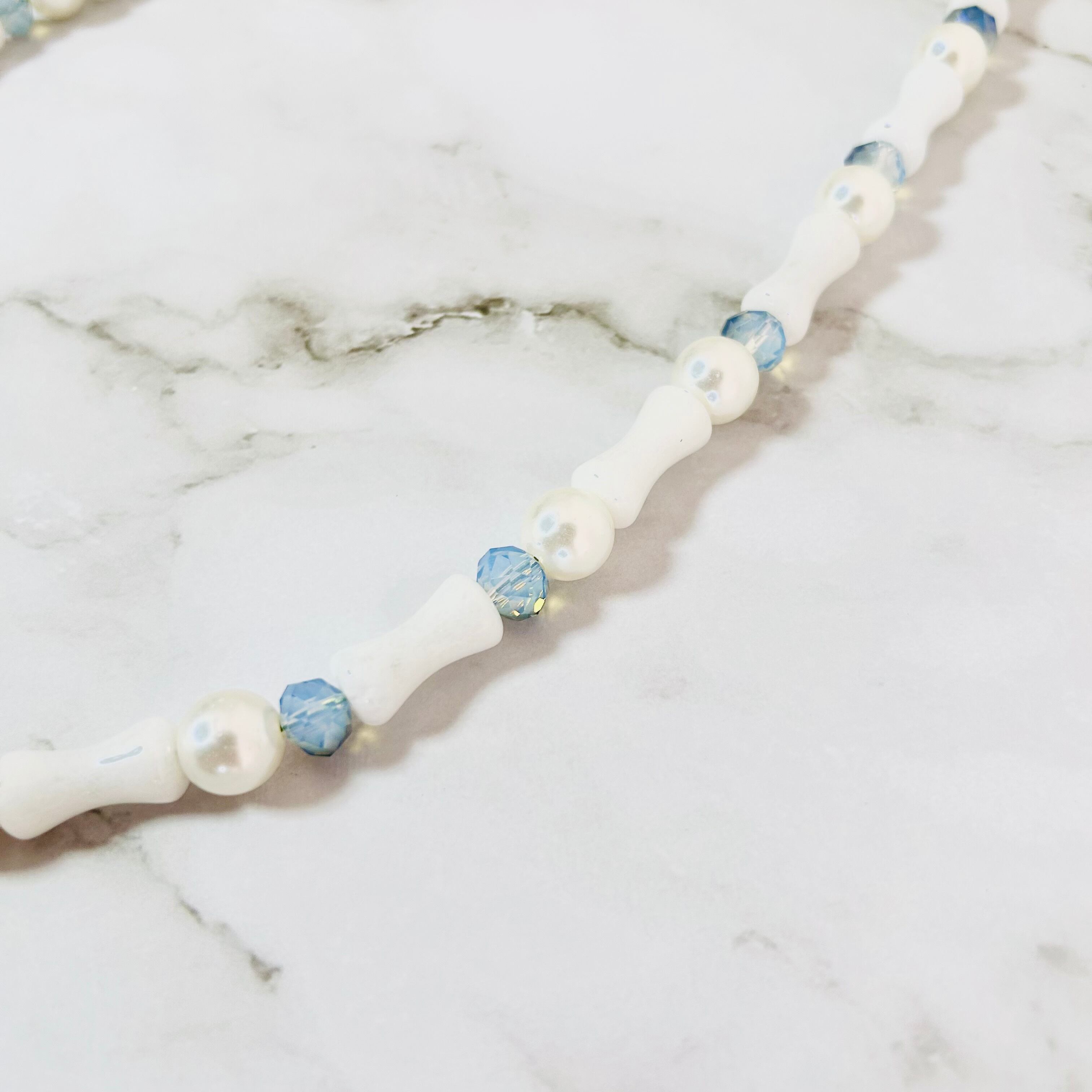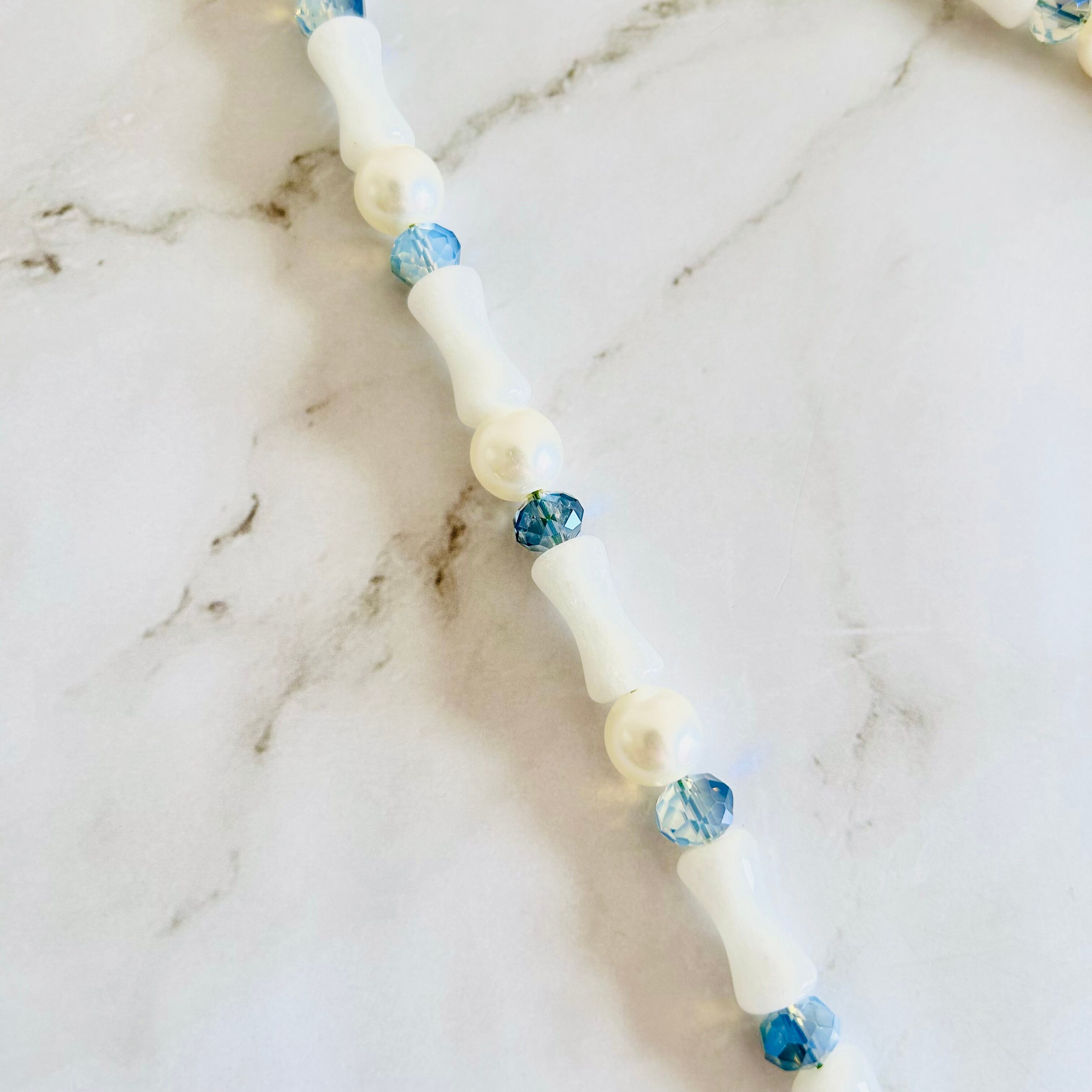 白いバンブー調ストーンに、涼やかなブルーのカットビーズと上品なパールを組み合わせたロングネックレスです。