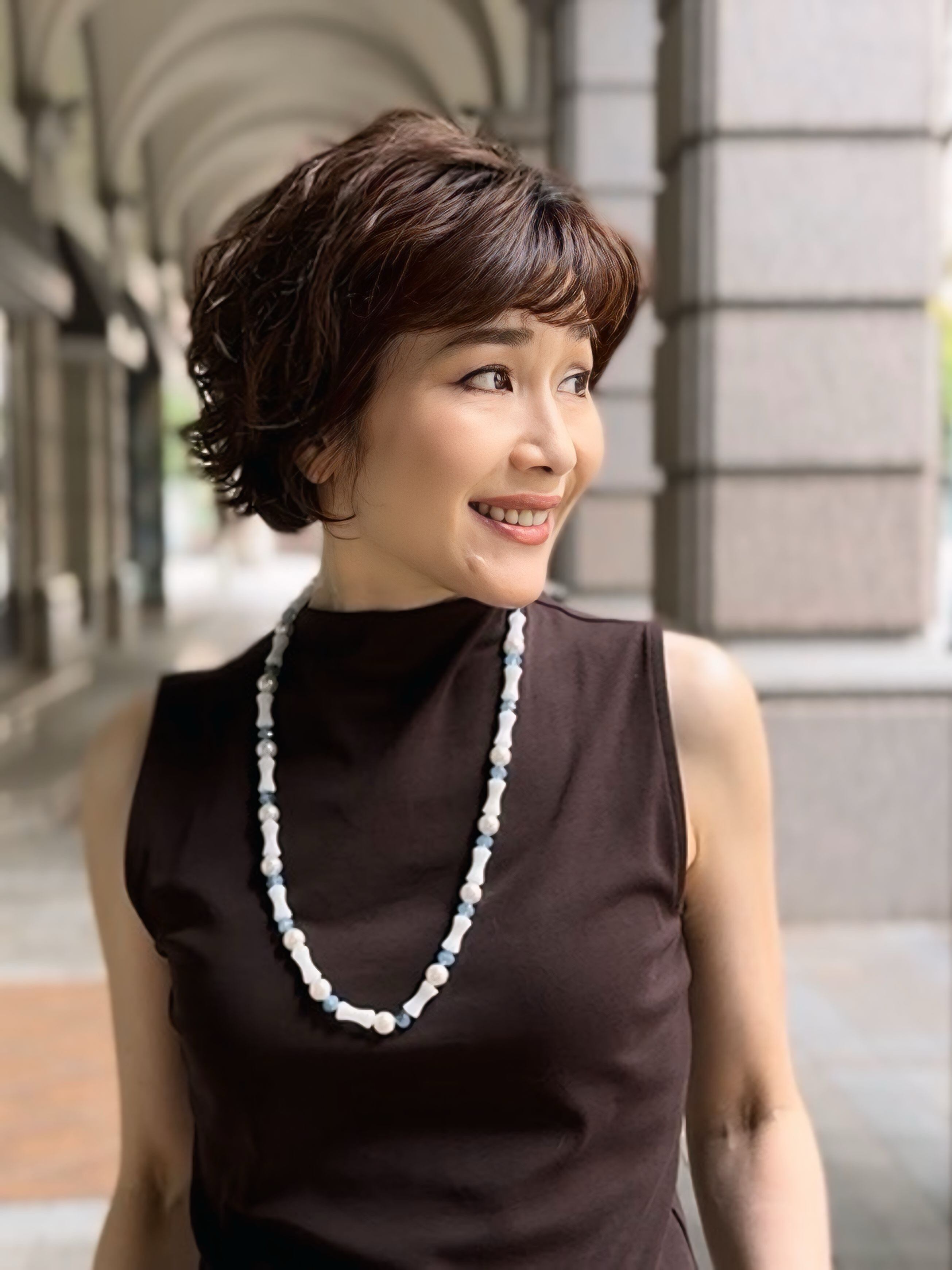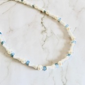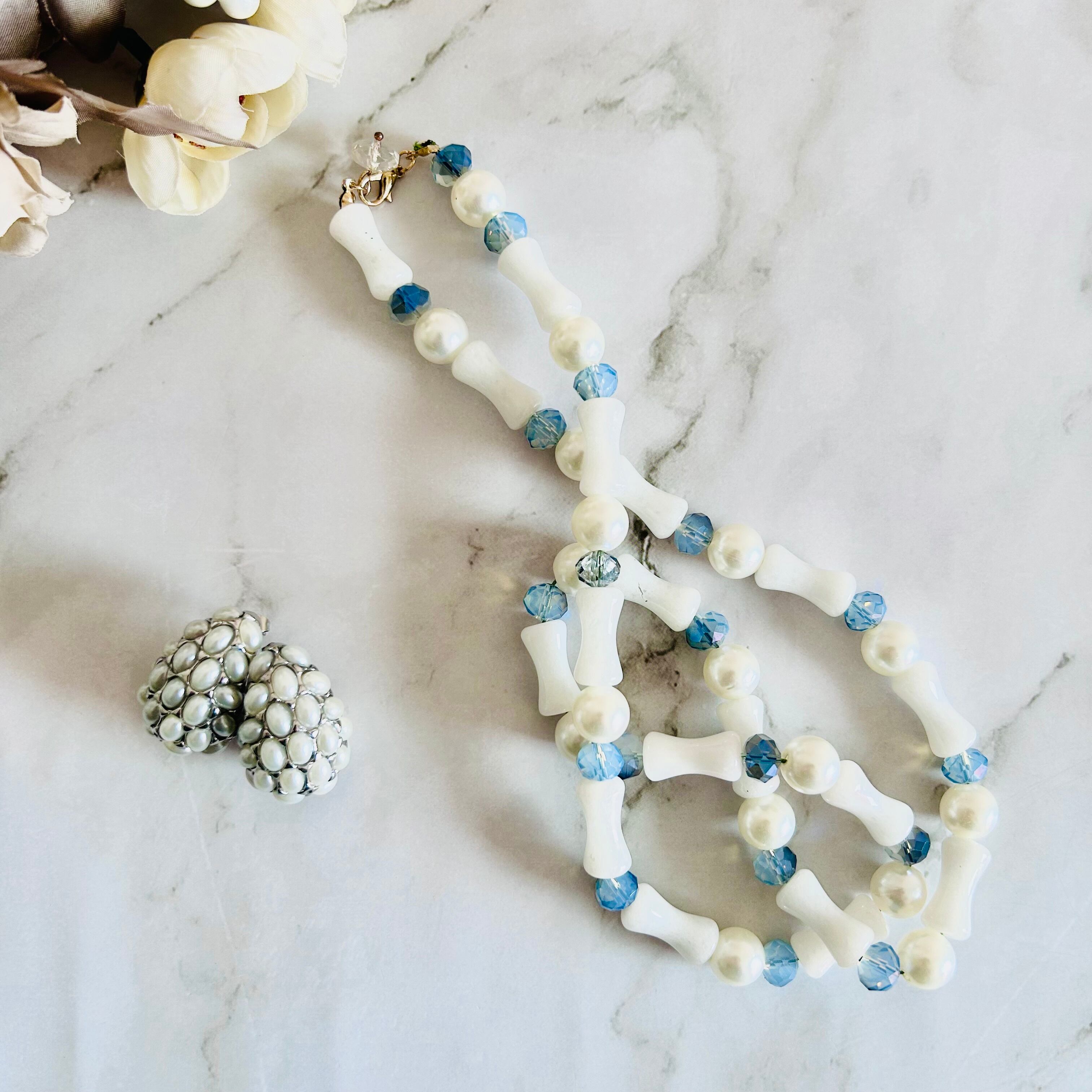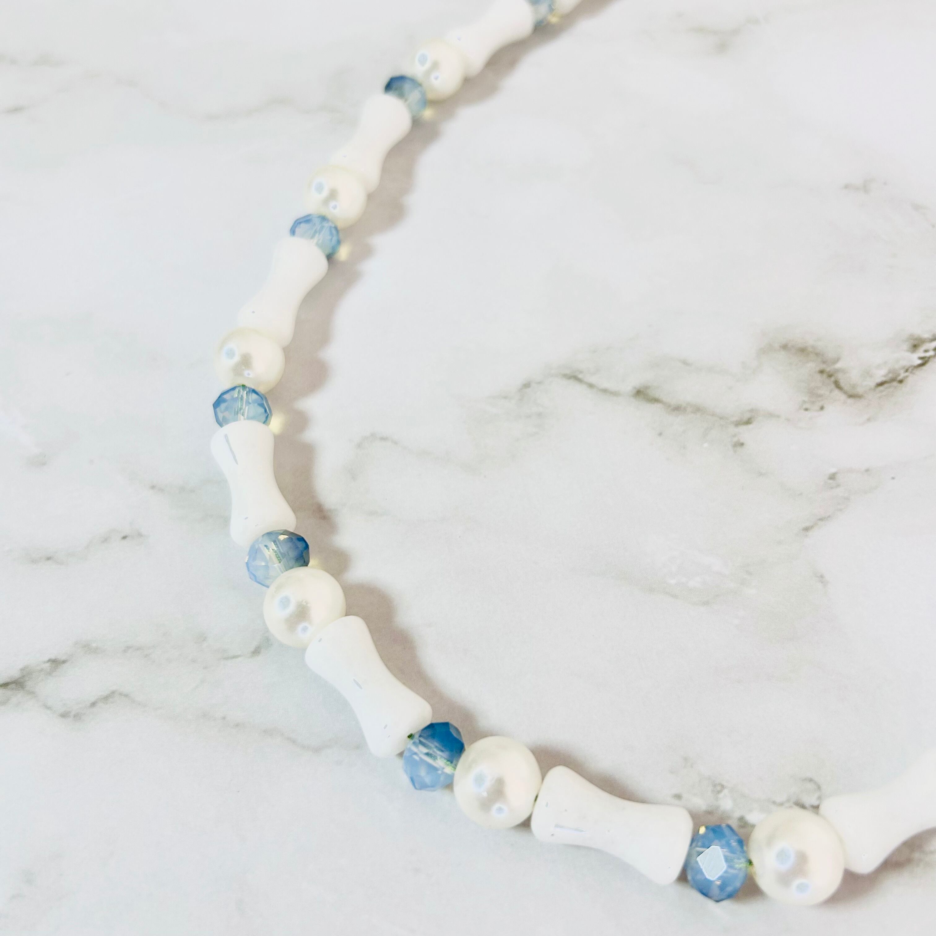 白いバンブー調ストーンに、涼やかなブルーのカットビーズと上品なパールを組み合わせたロングネックレスです。