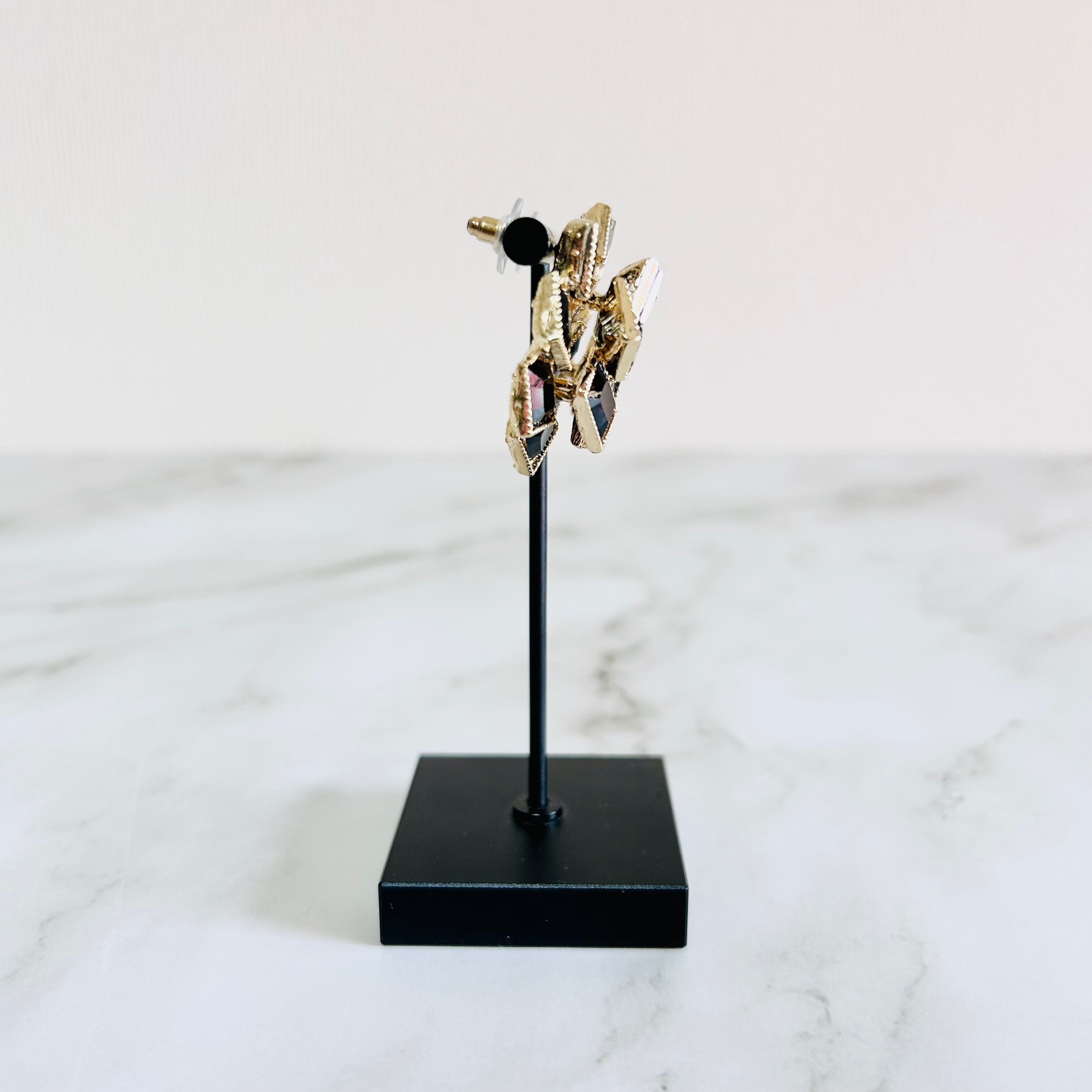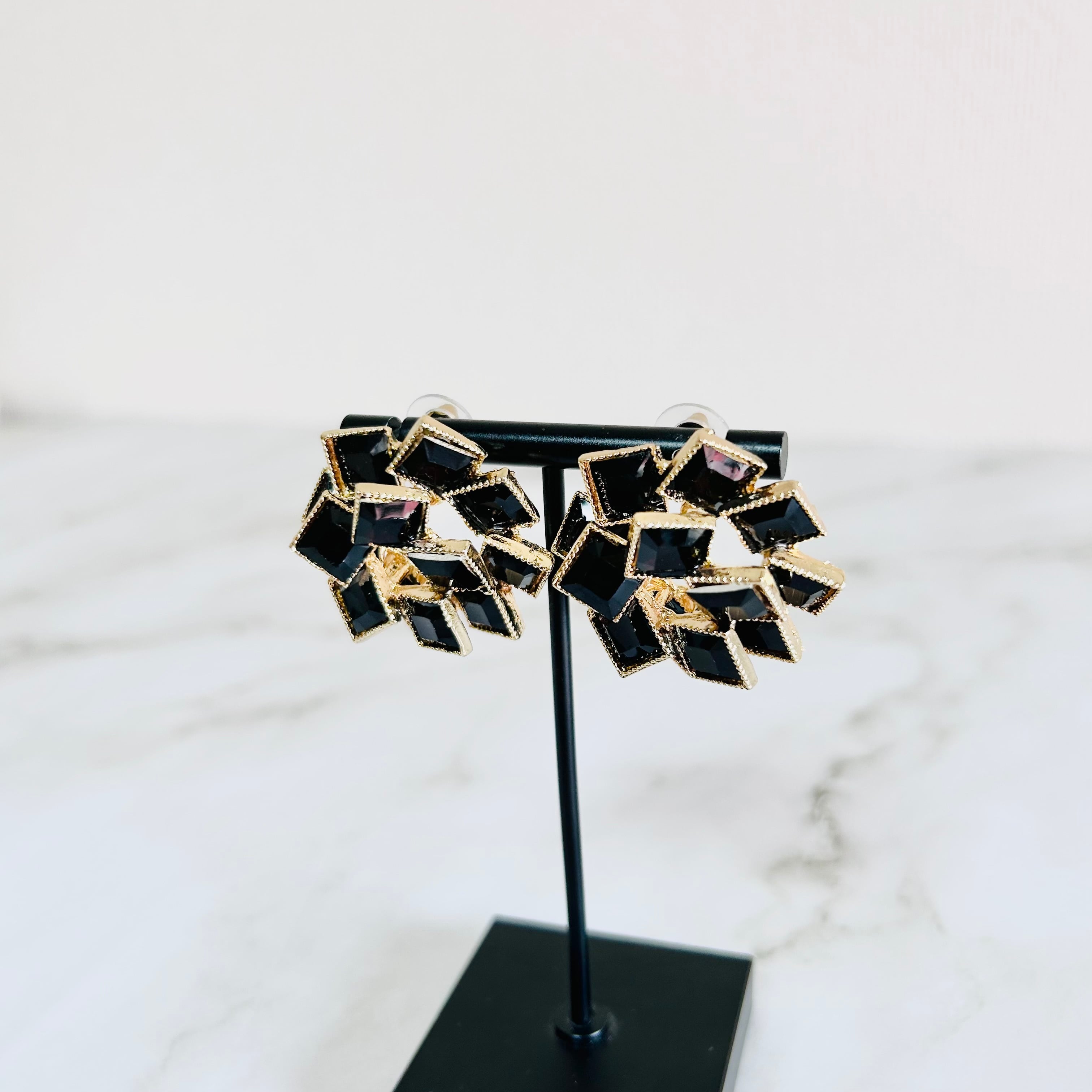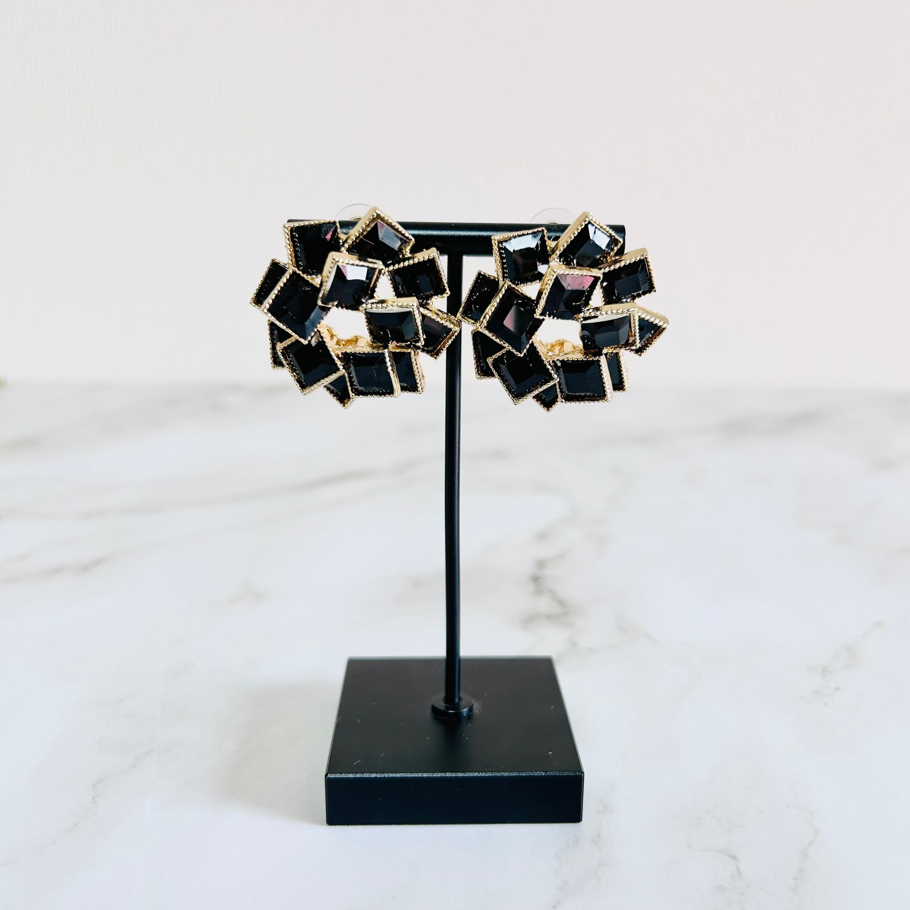 艶やかなブラックスクエアのパーツを、ゴールドの縁取りで立体的に組み合わせた存在感あるピアスです。