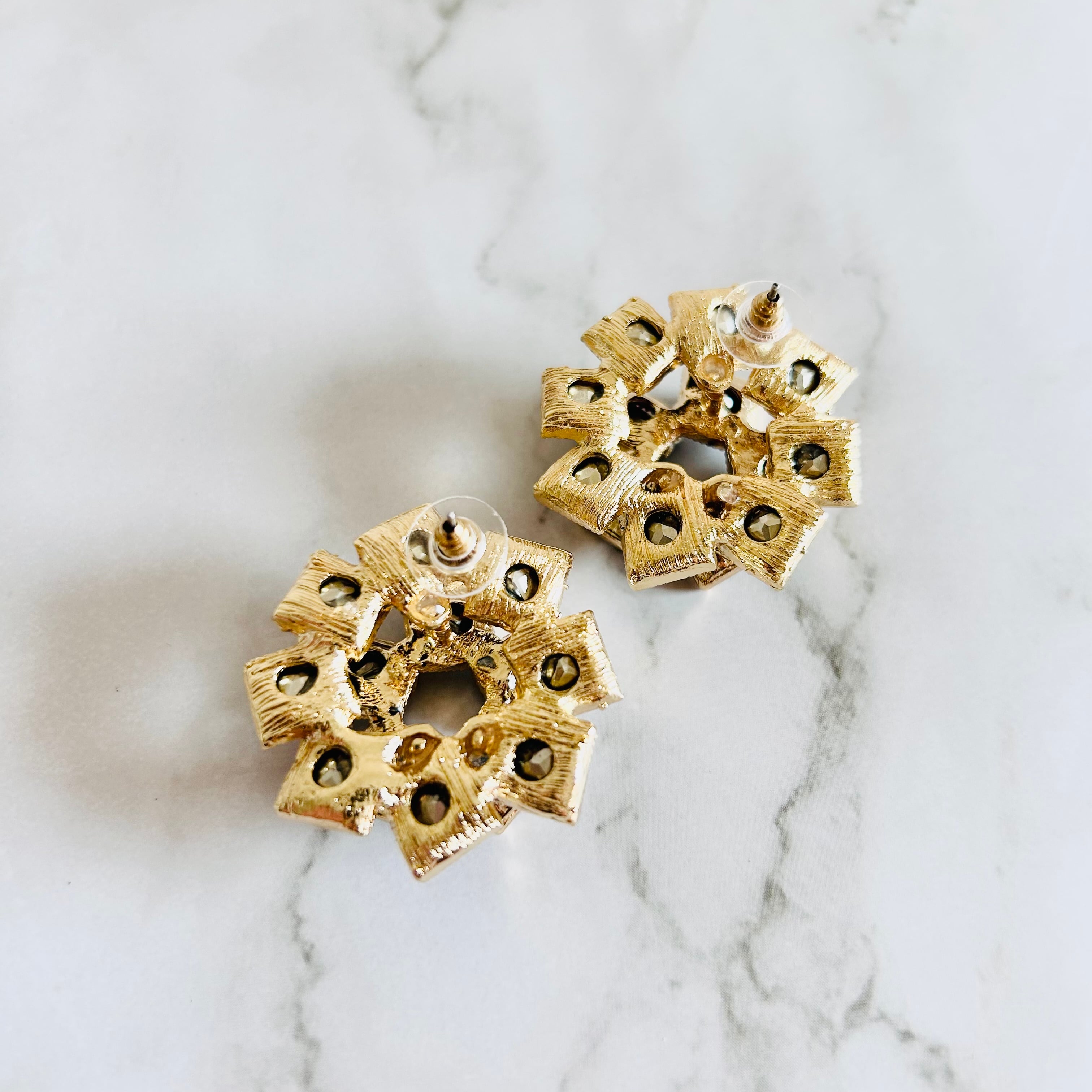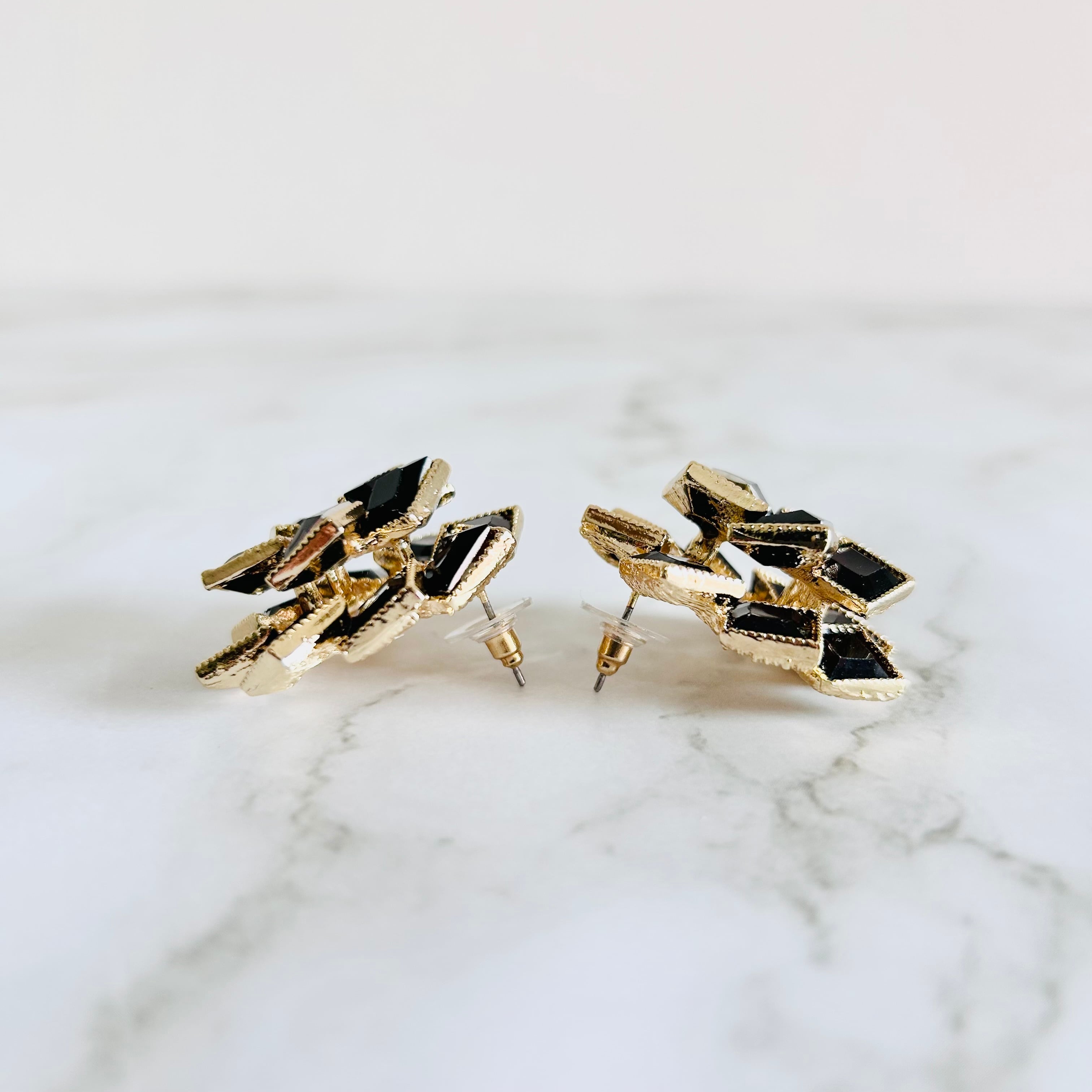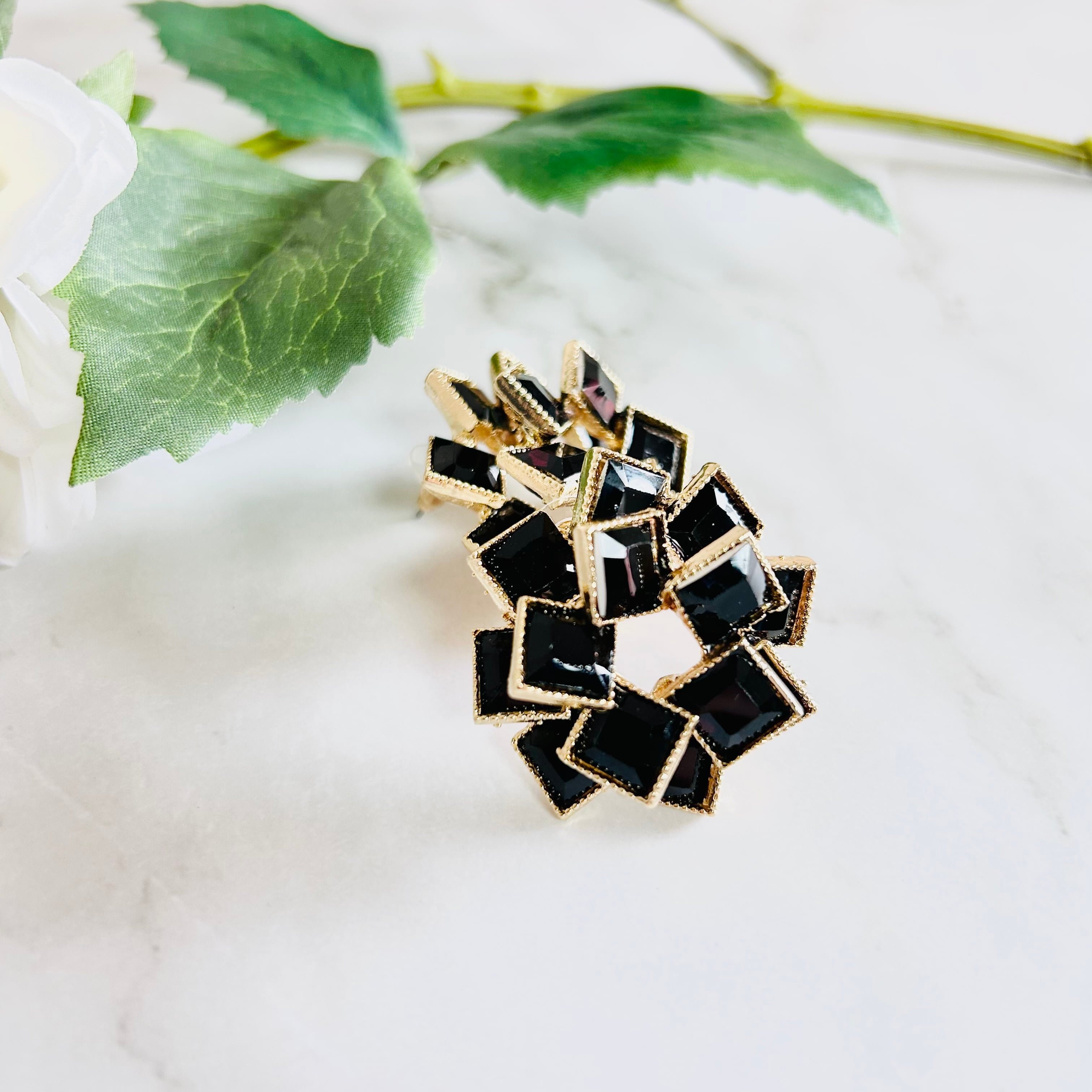 艶やかなブラックスクエアのパーツを、ゴールドの縁取りで立体的に組み合わせた存在感あるピアスです。