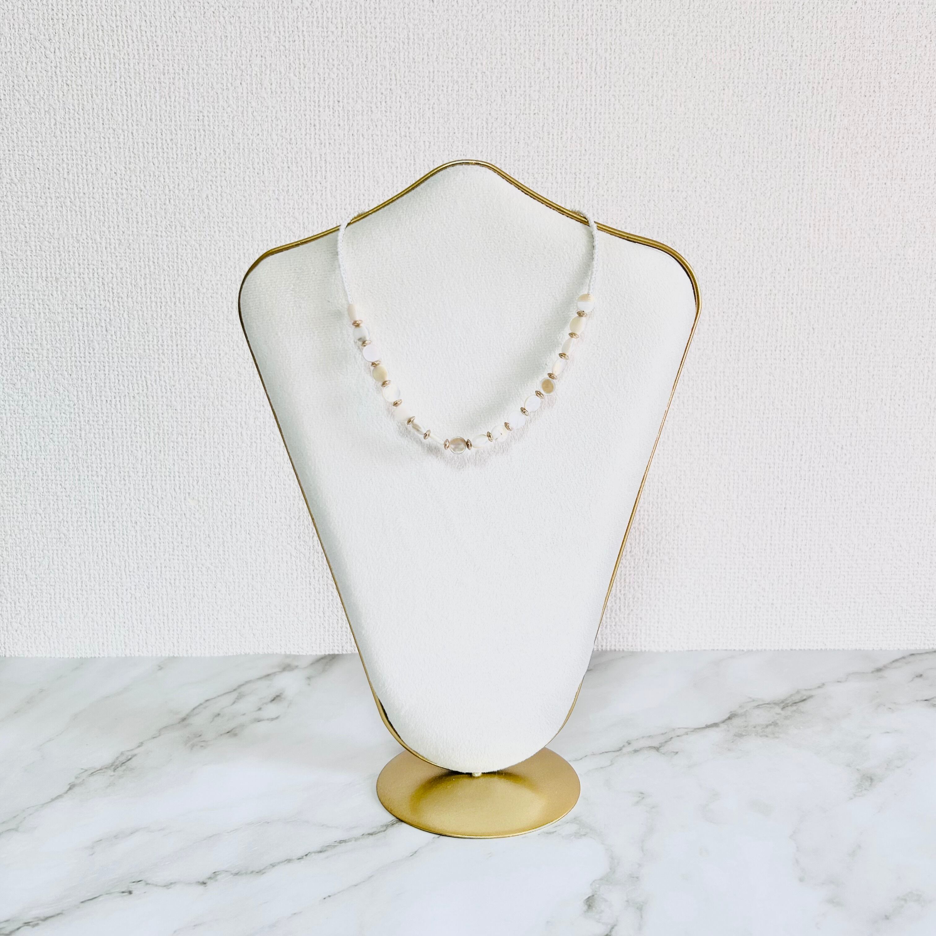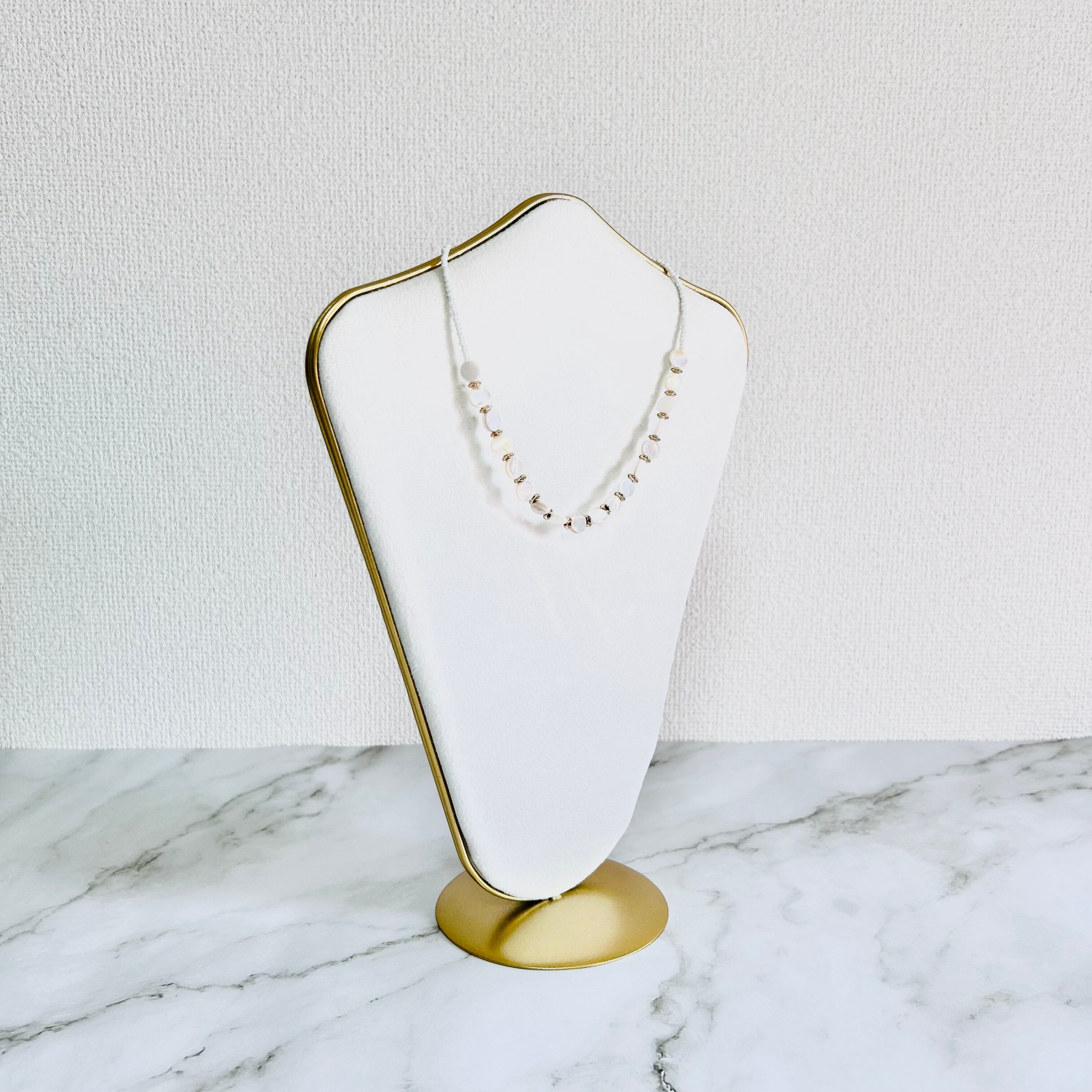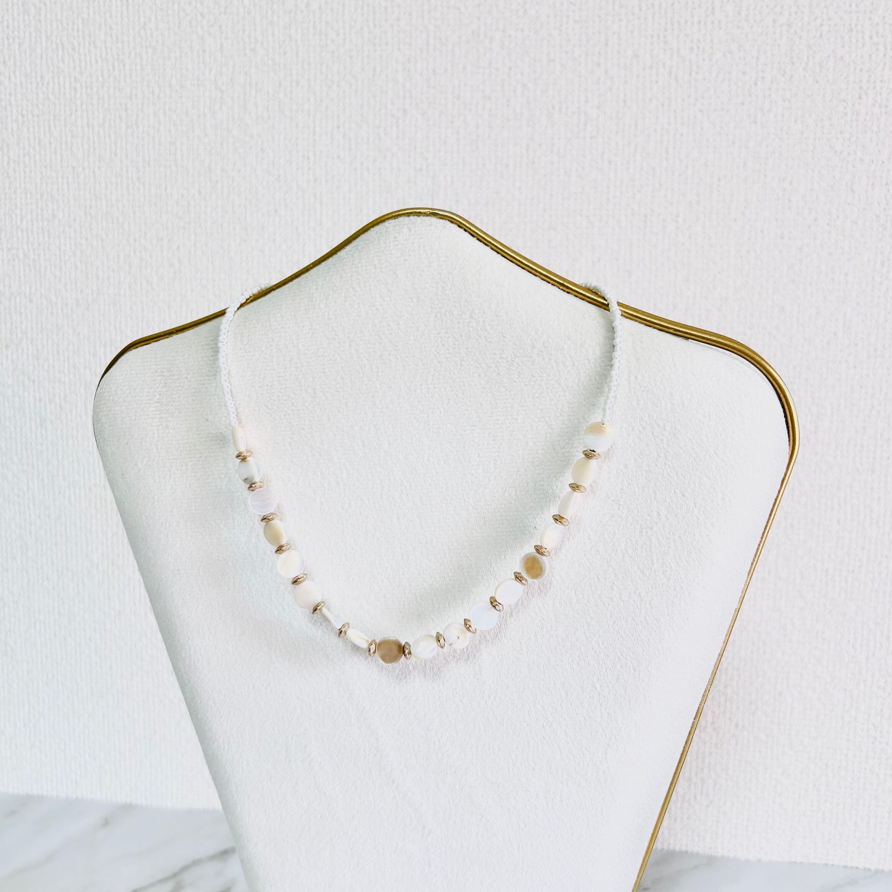 やわらかな光沢を放つホワイトシェルと、繊細なゴールドパーツを組み合わせた上品なネックレスです。