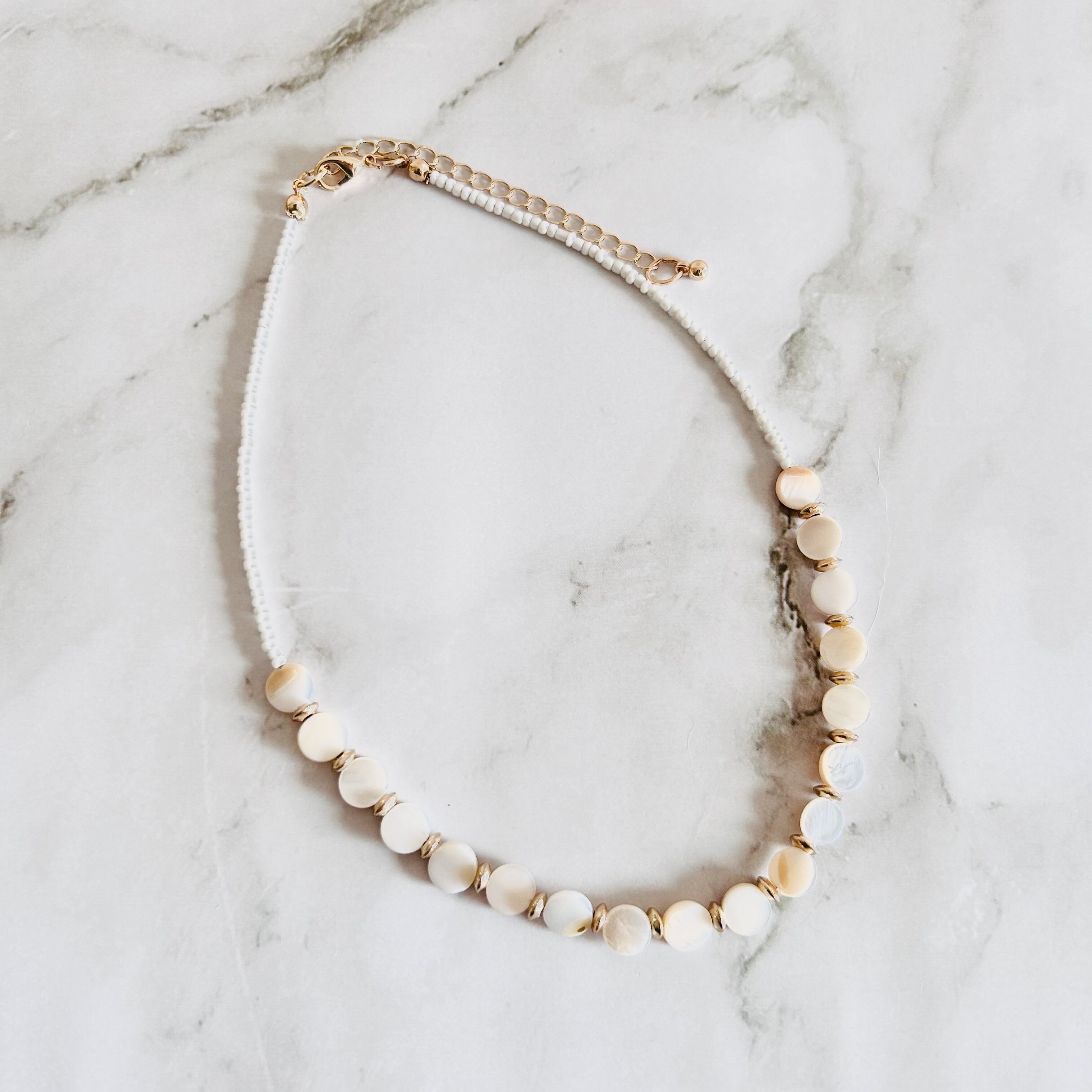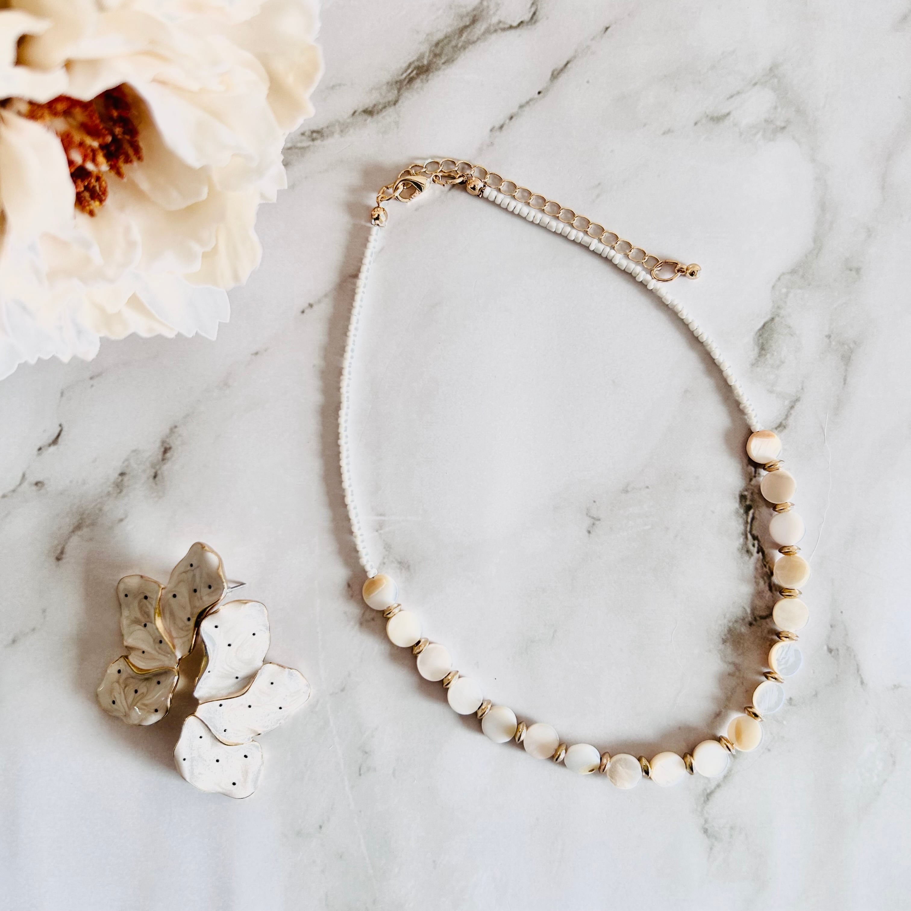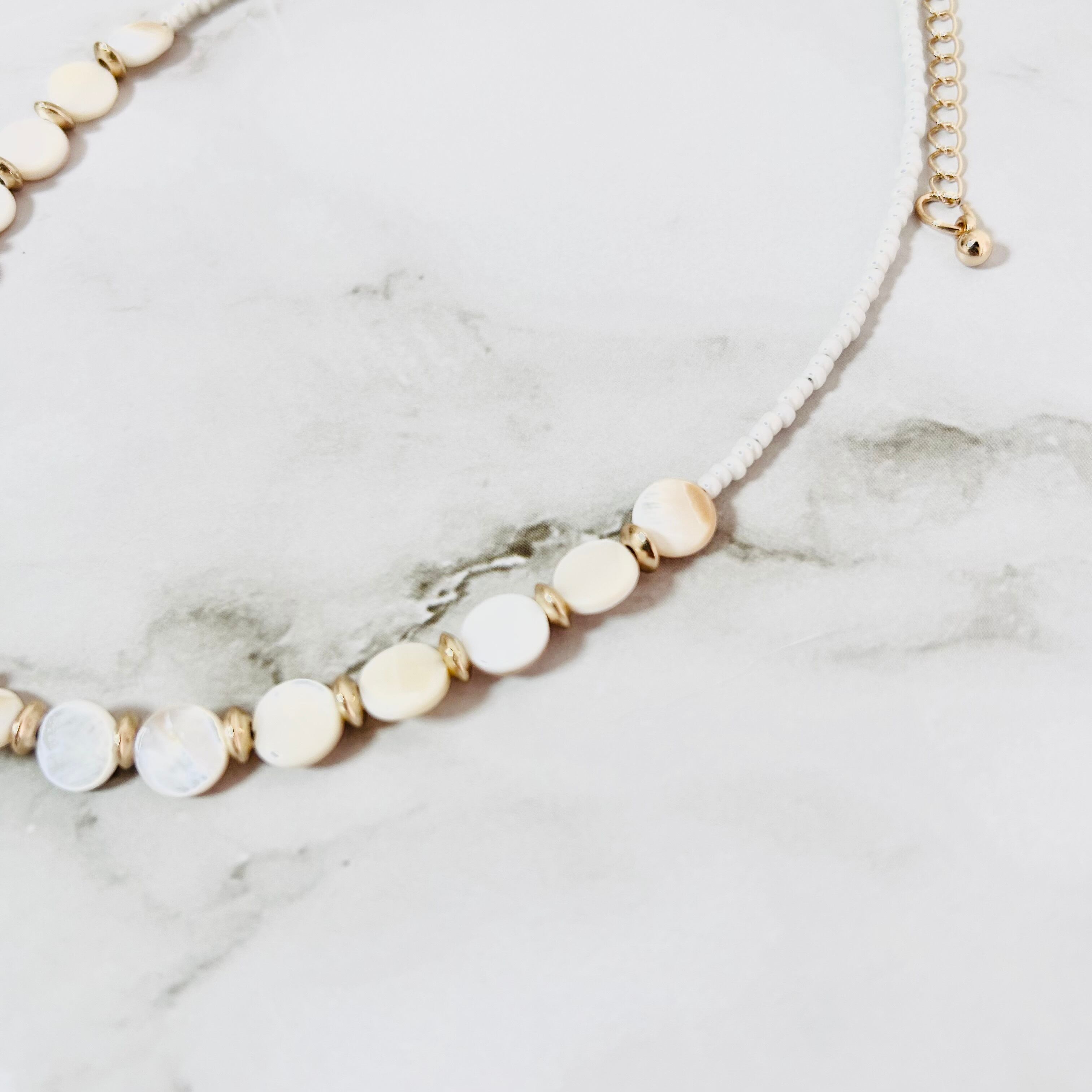 やわらかな光沢を放つホワイトシェルと、繊細なゴールドパーツを組み合わせた上品なネックレスです。