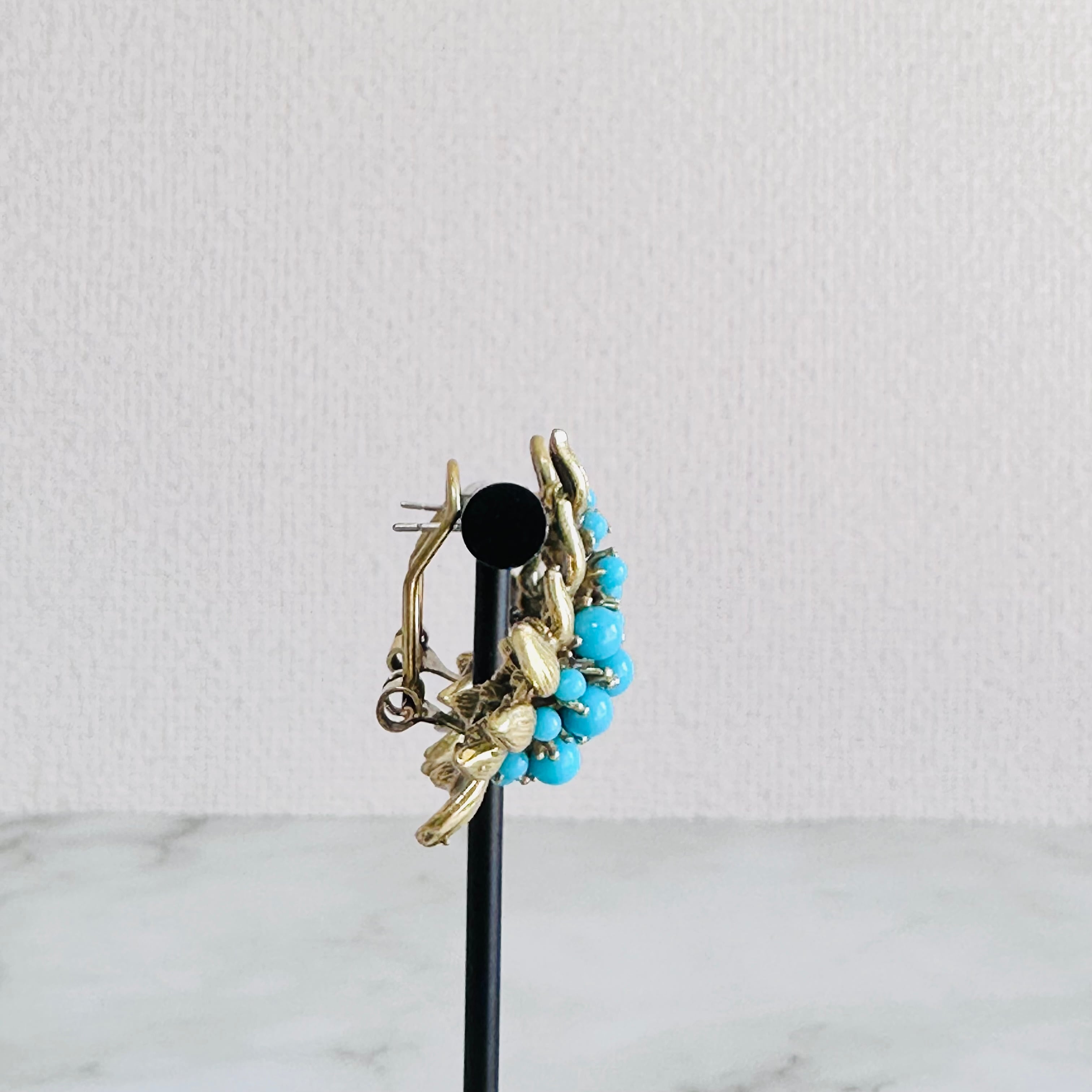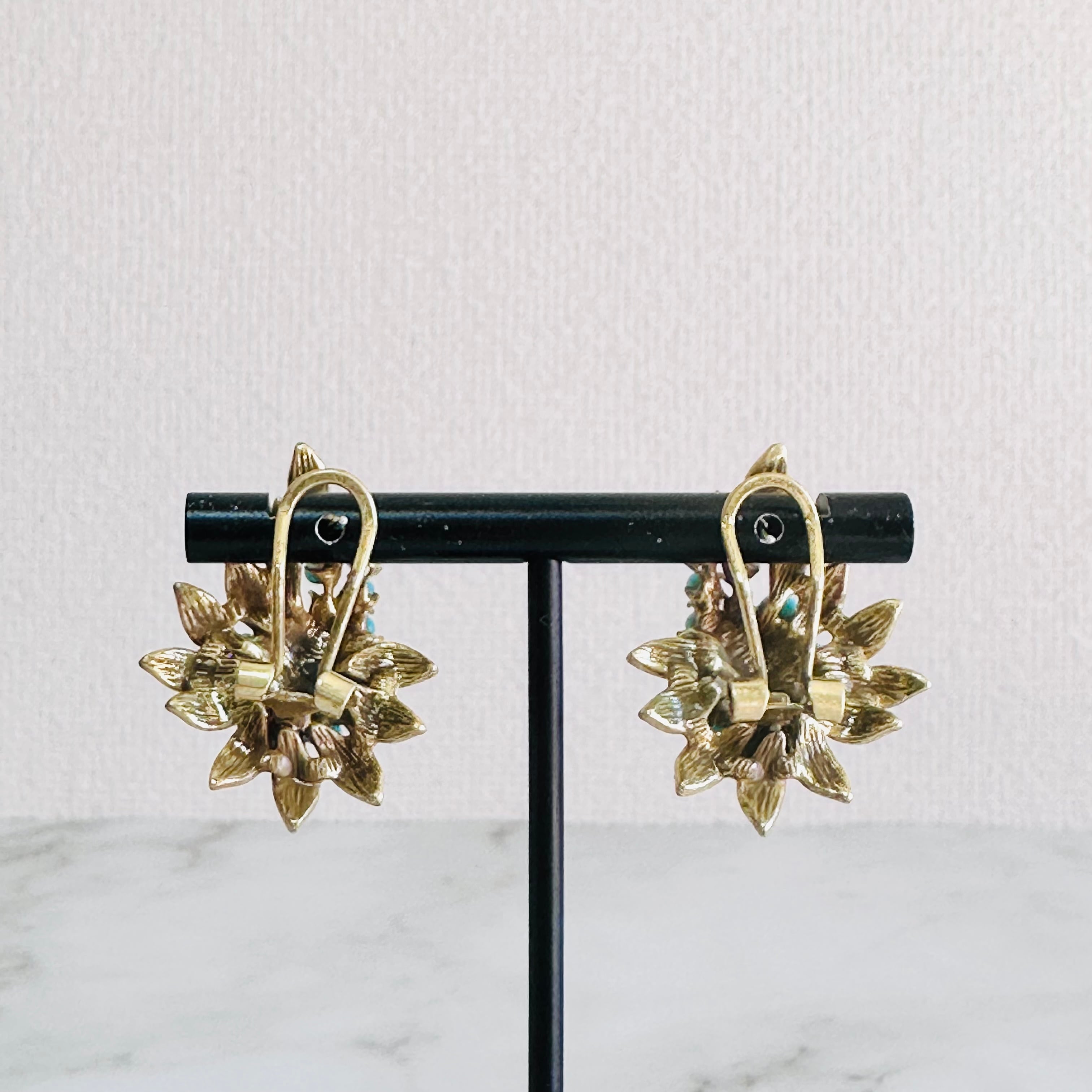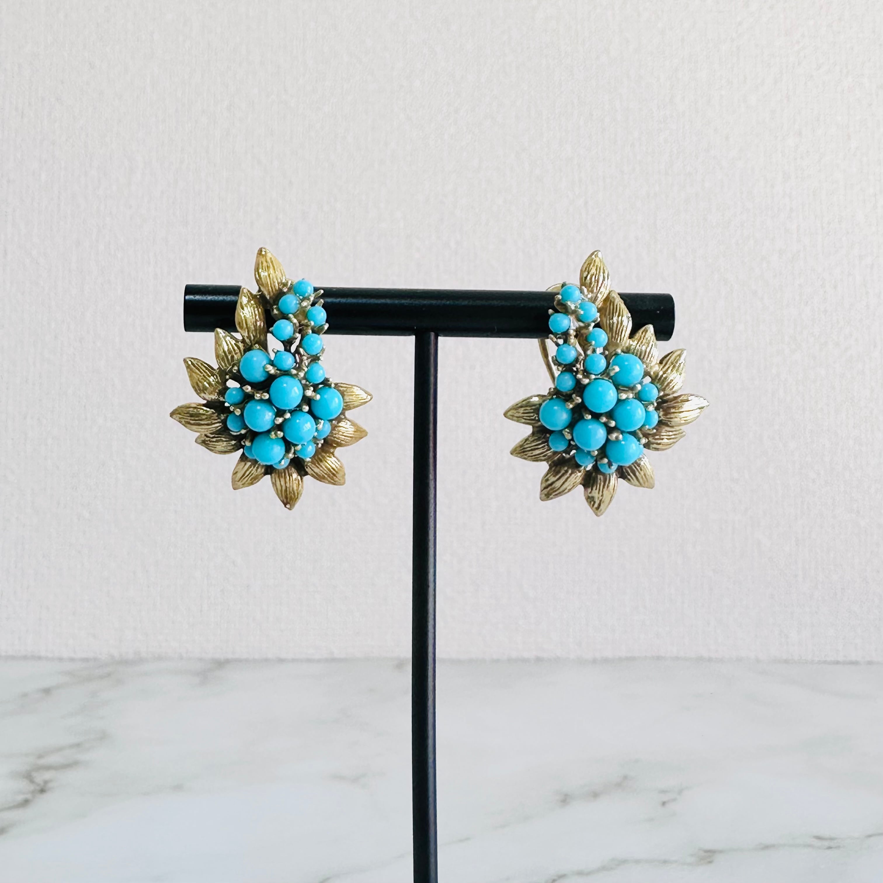 鮮やかなターコイズブルーのビーズを贅沢にあしらい、アンティーク調のゴールドリーフで囲んだクラシカルなピアスです。