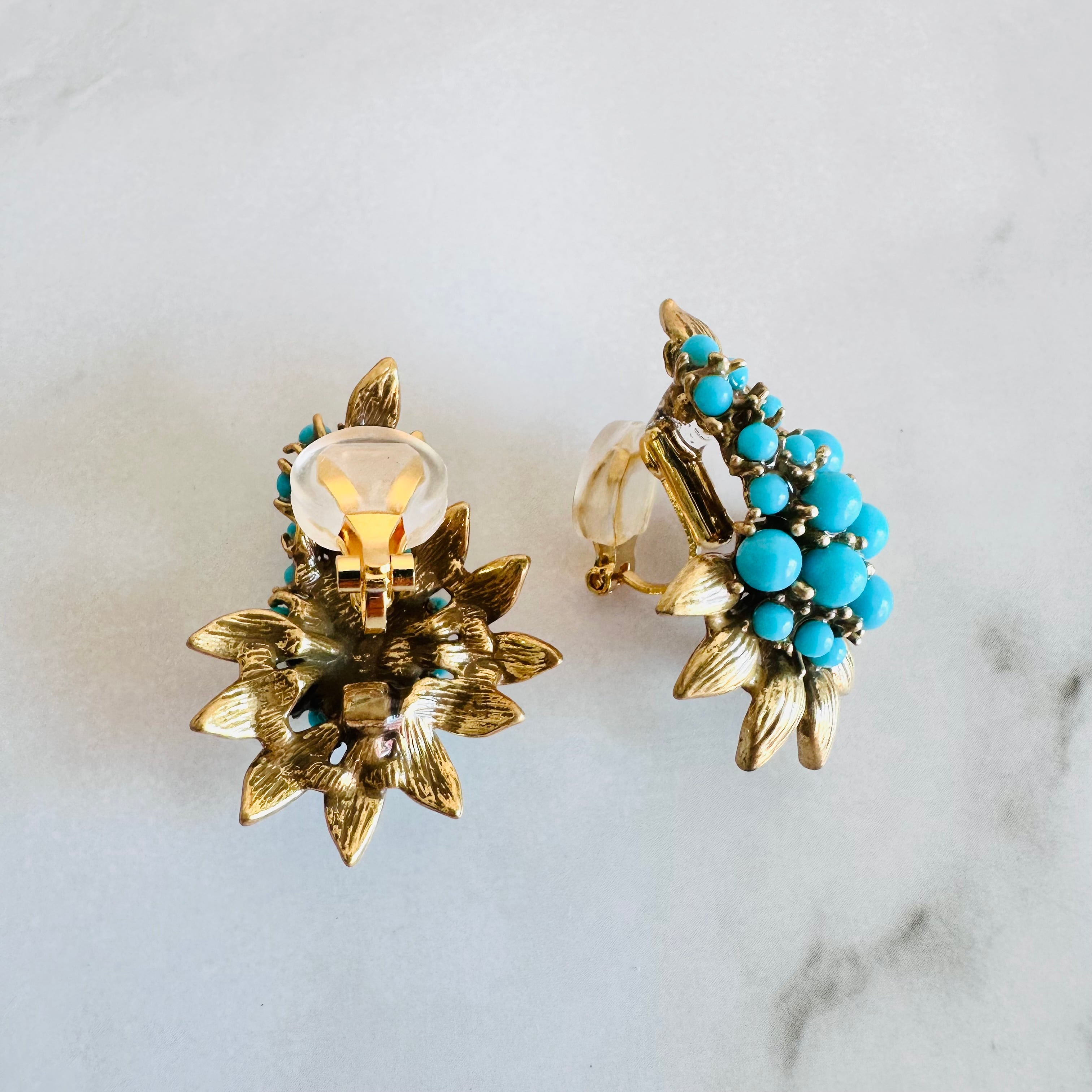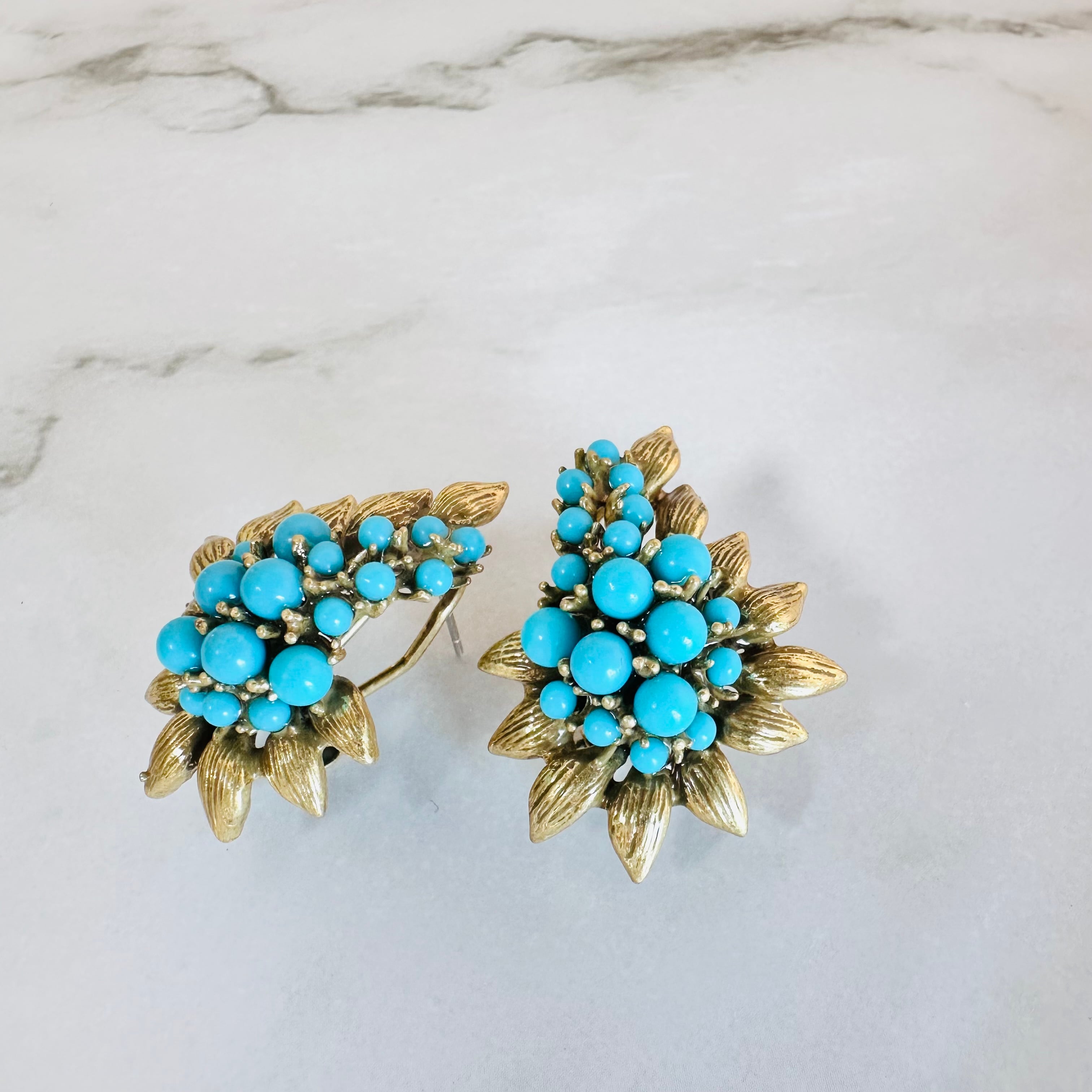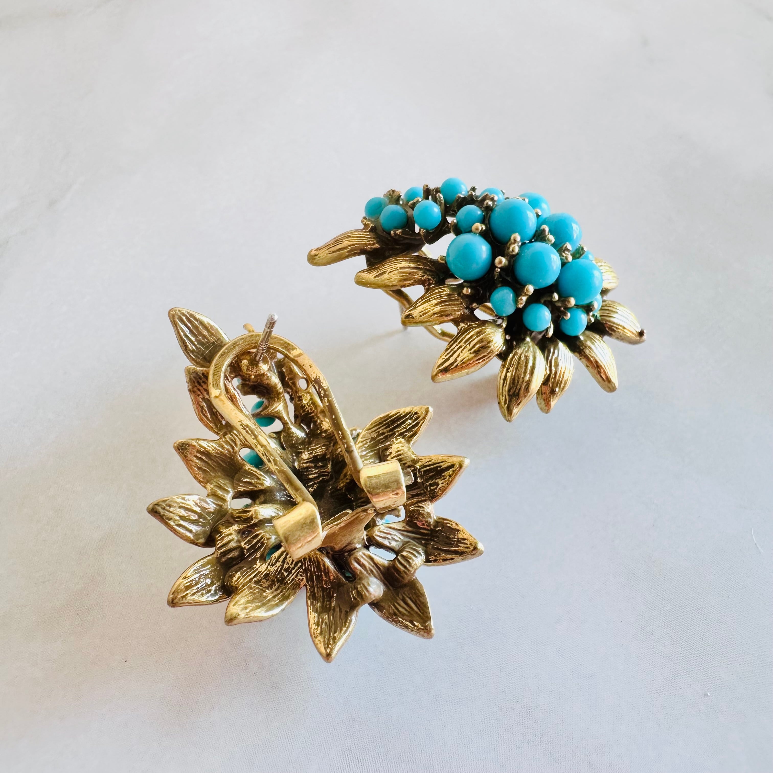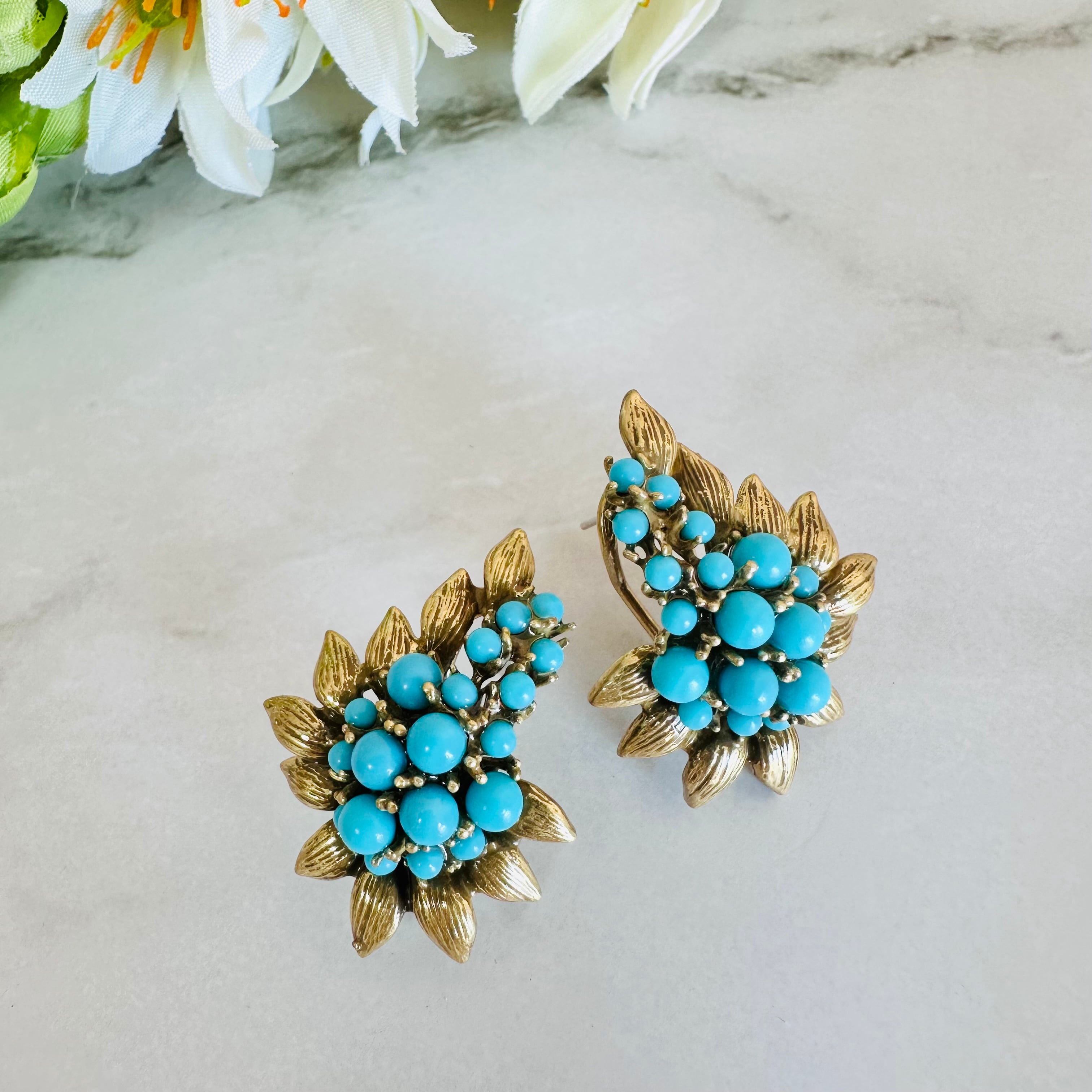 鮮やかなターコイズブルーのビーズを贅沢にあしらい、アンティーク調のゴールドリーフで囲んだクラシカルなピアスです。