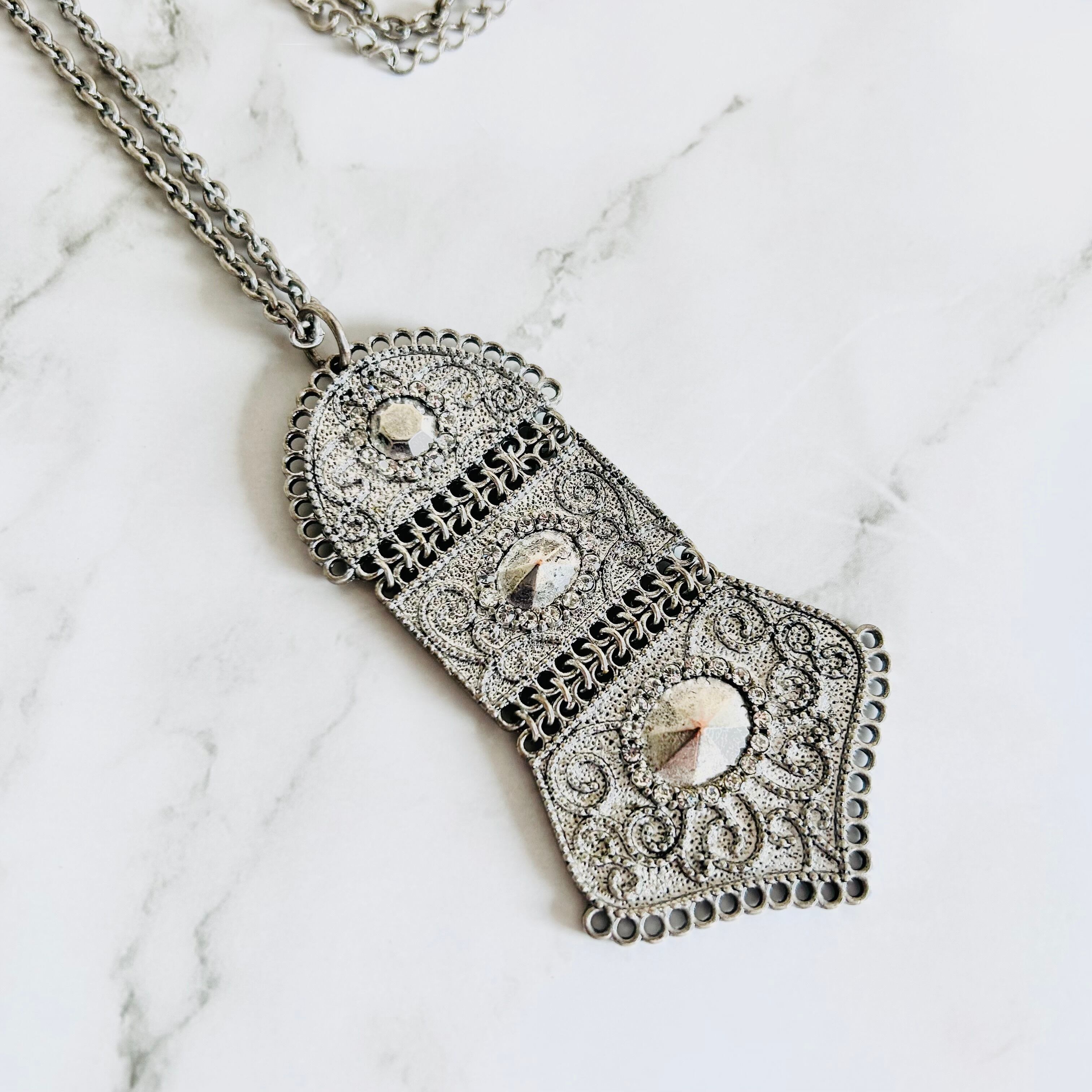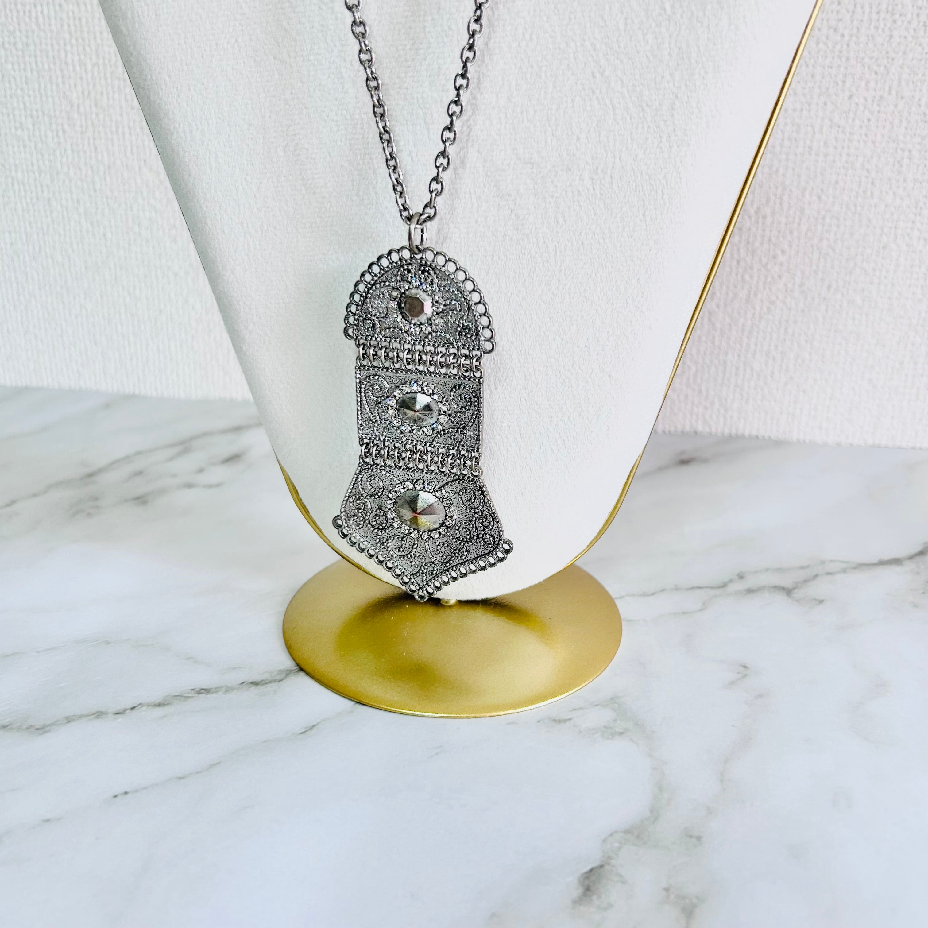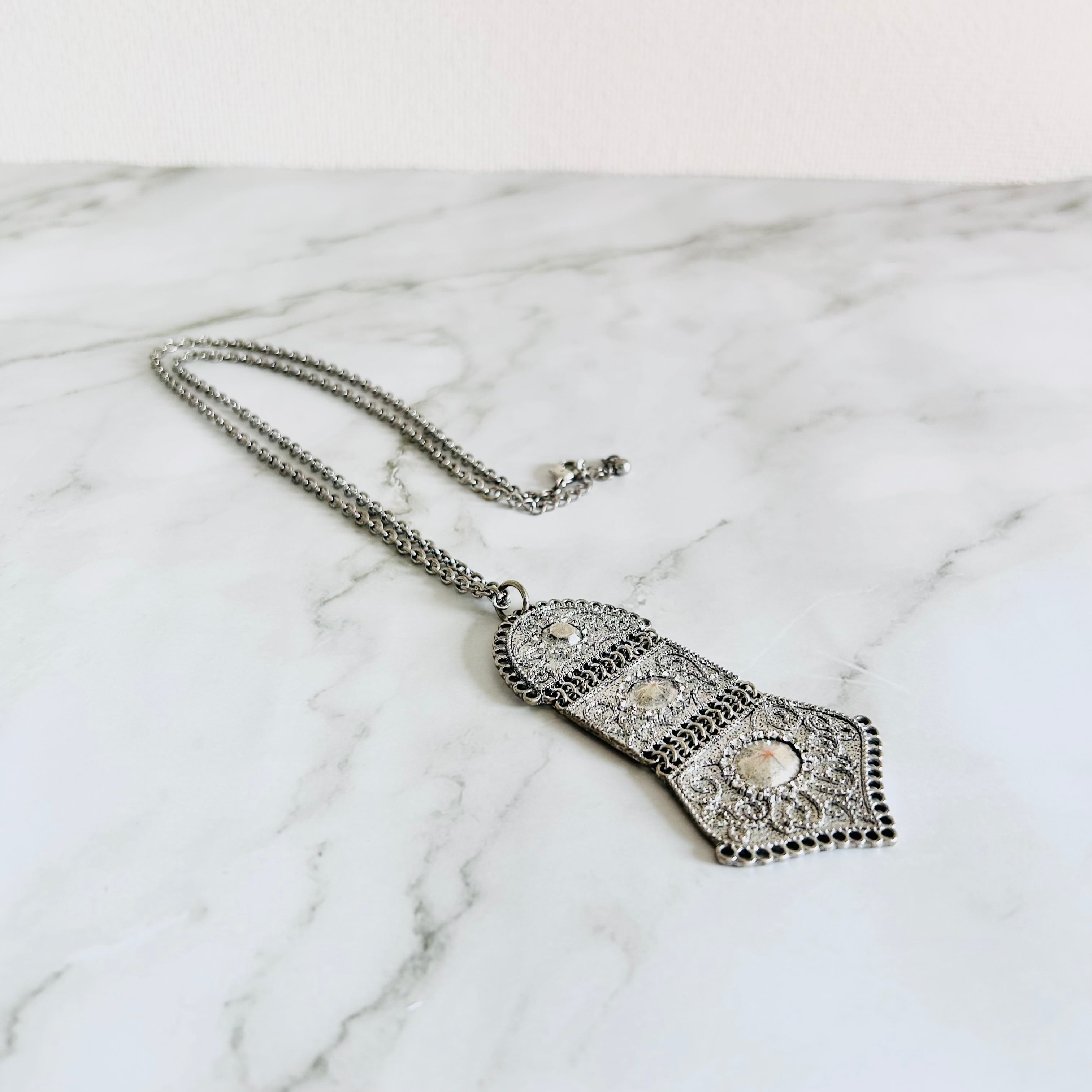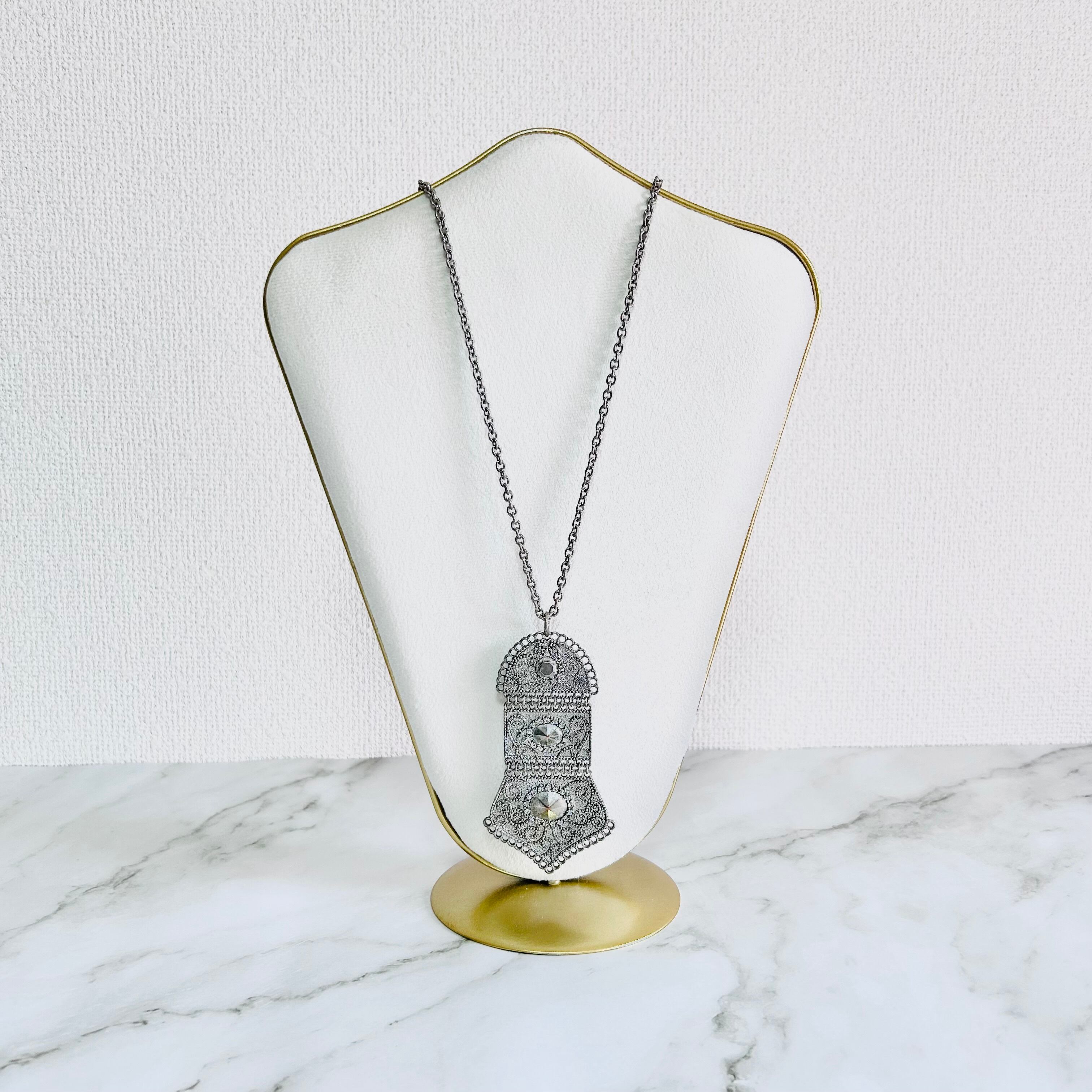 アンティークシルバーの重厚感と、繊細な模様が魅力のロングネックレスです。