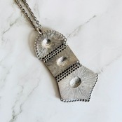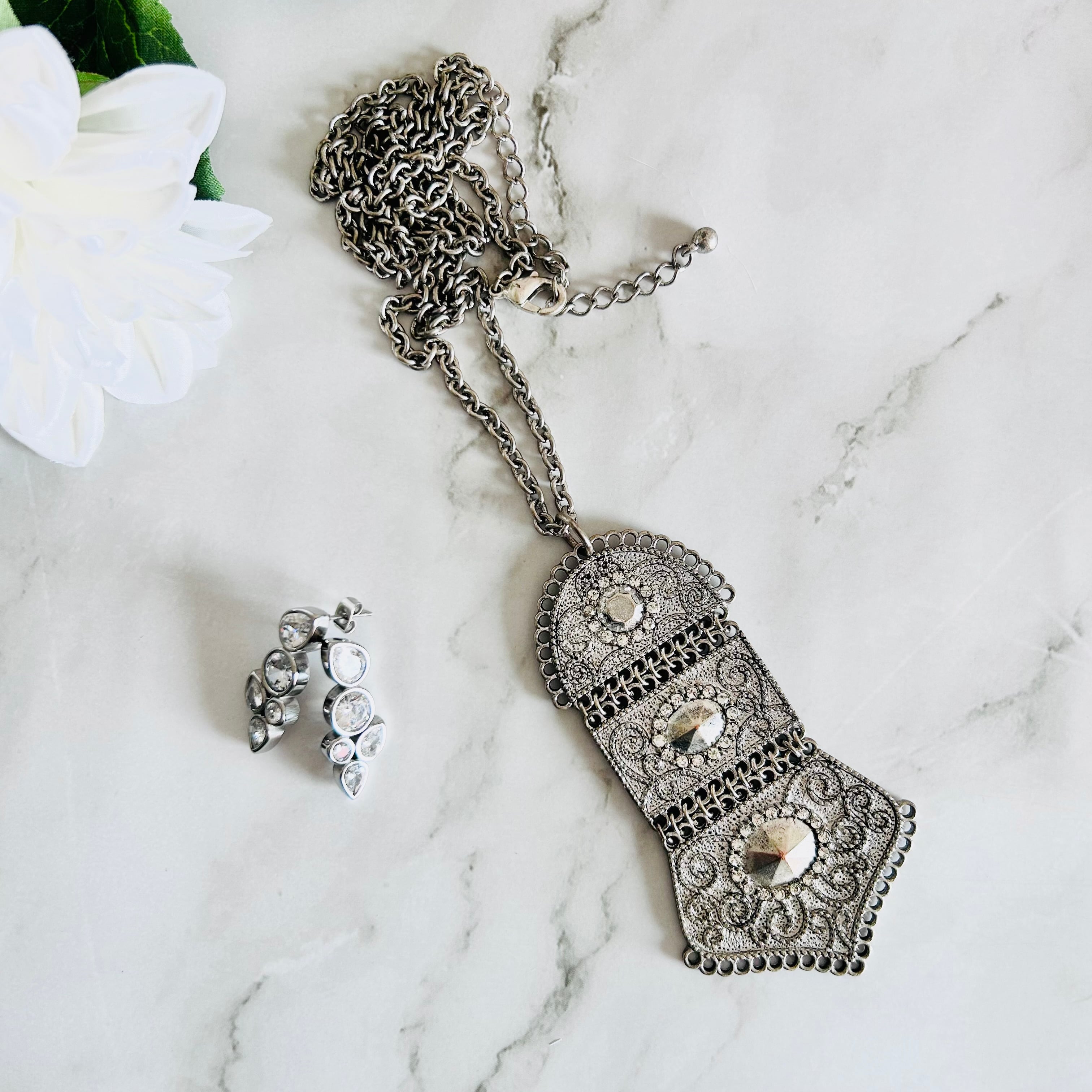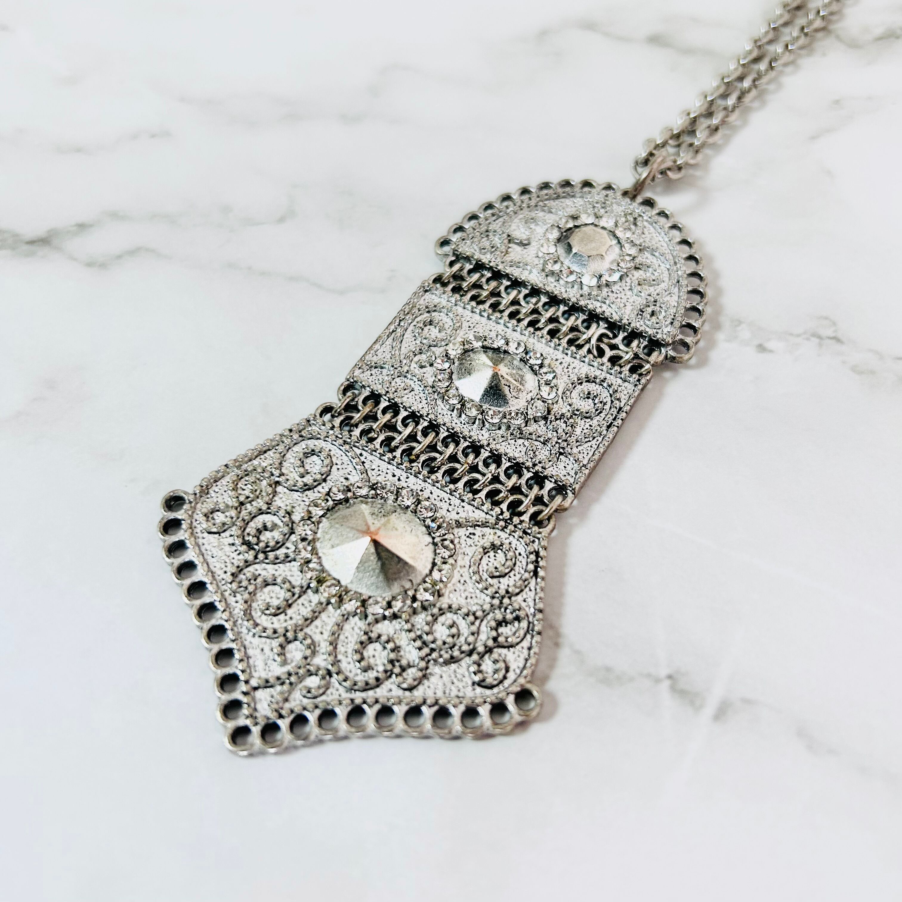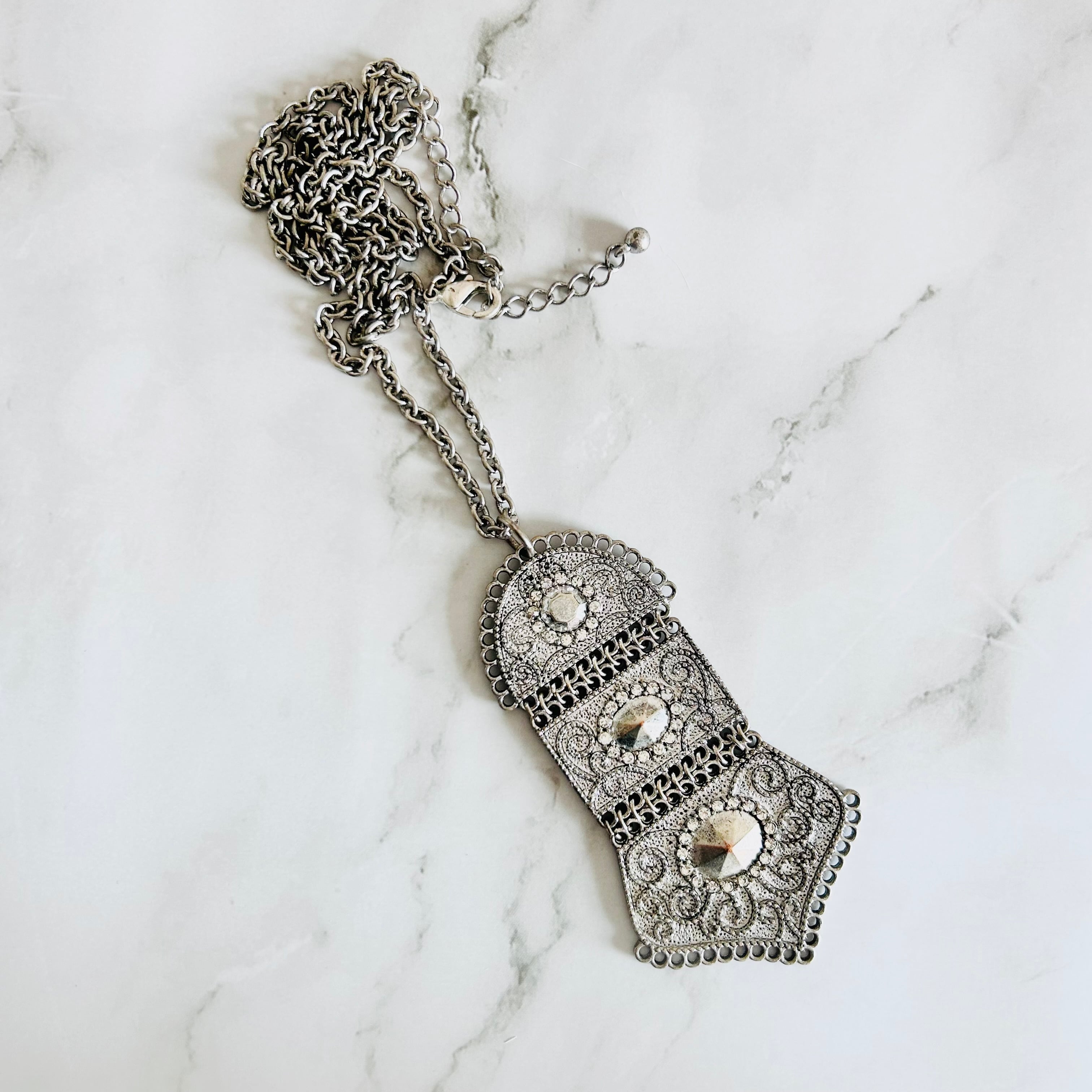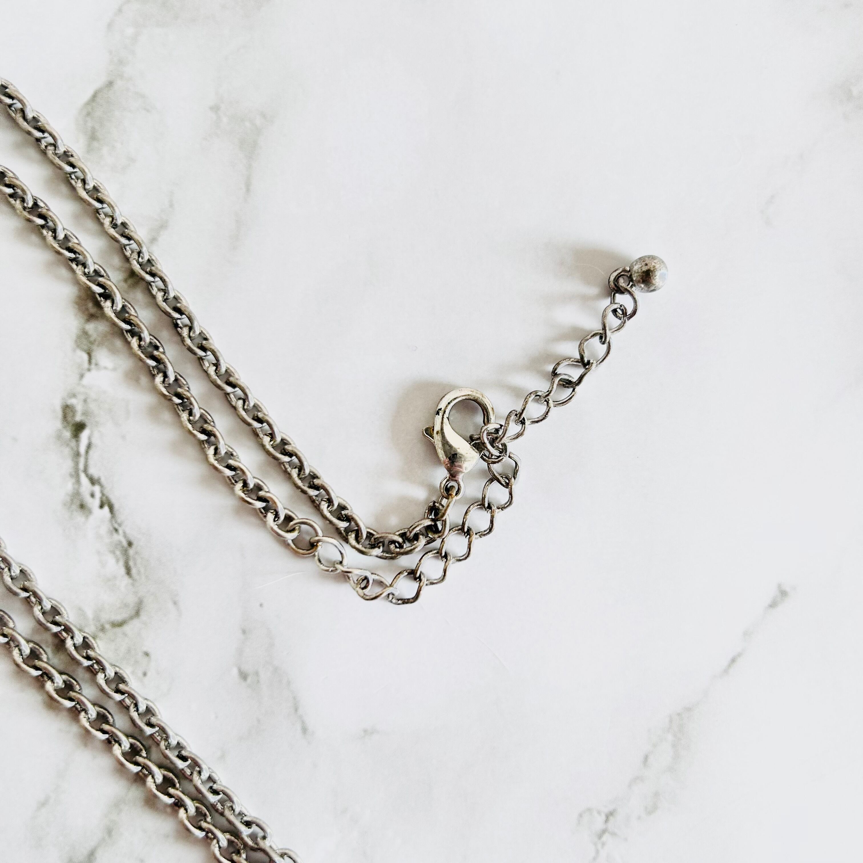アンティークシルバーの重厚感と、繊細な模様が魅力のロングネックレスです。