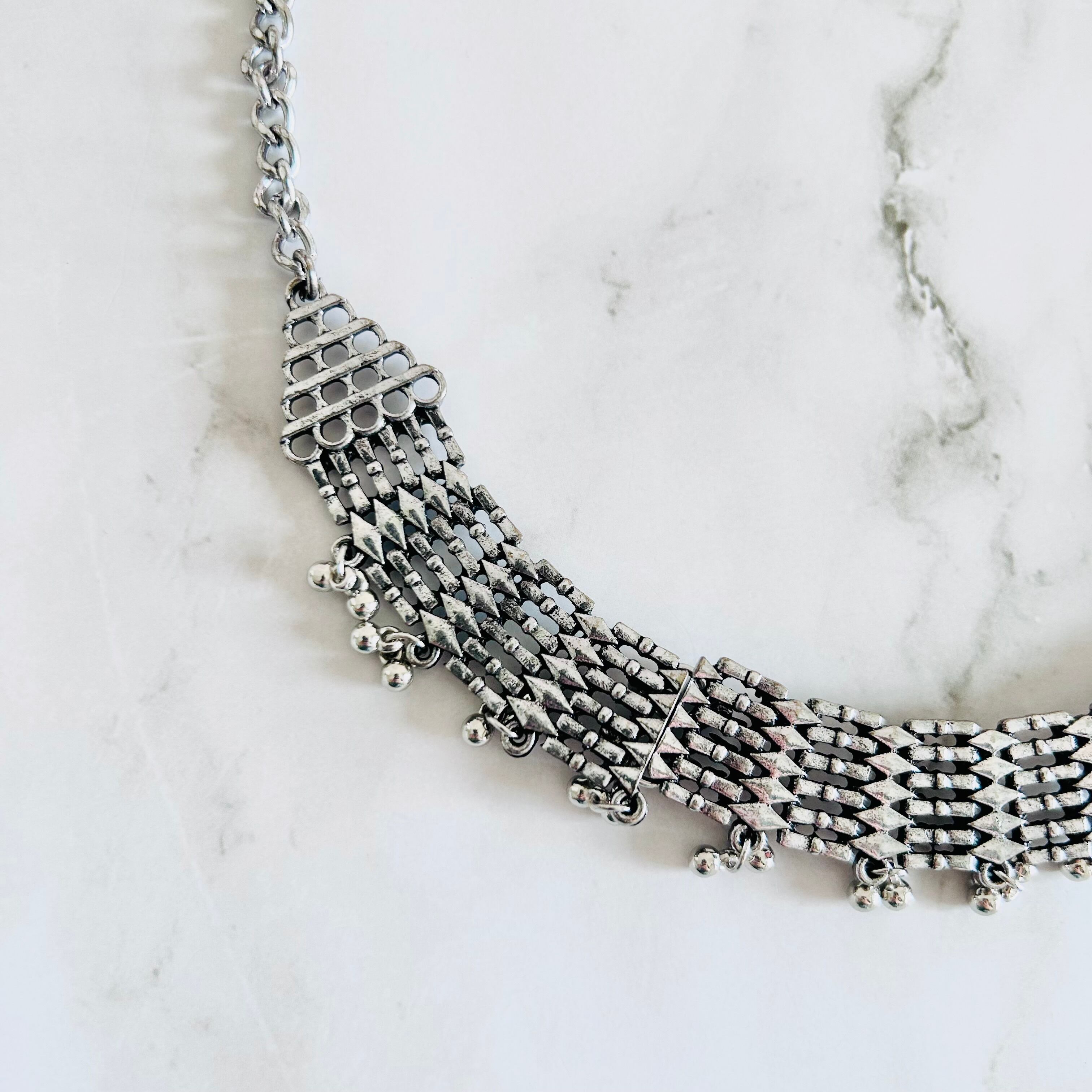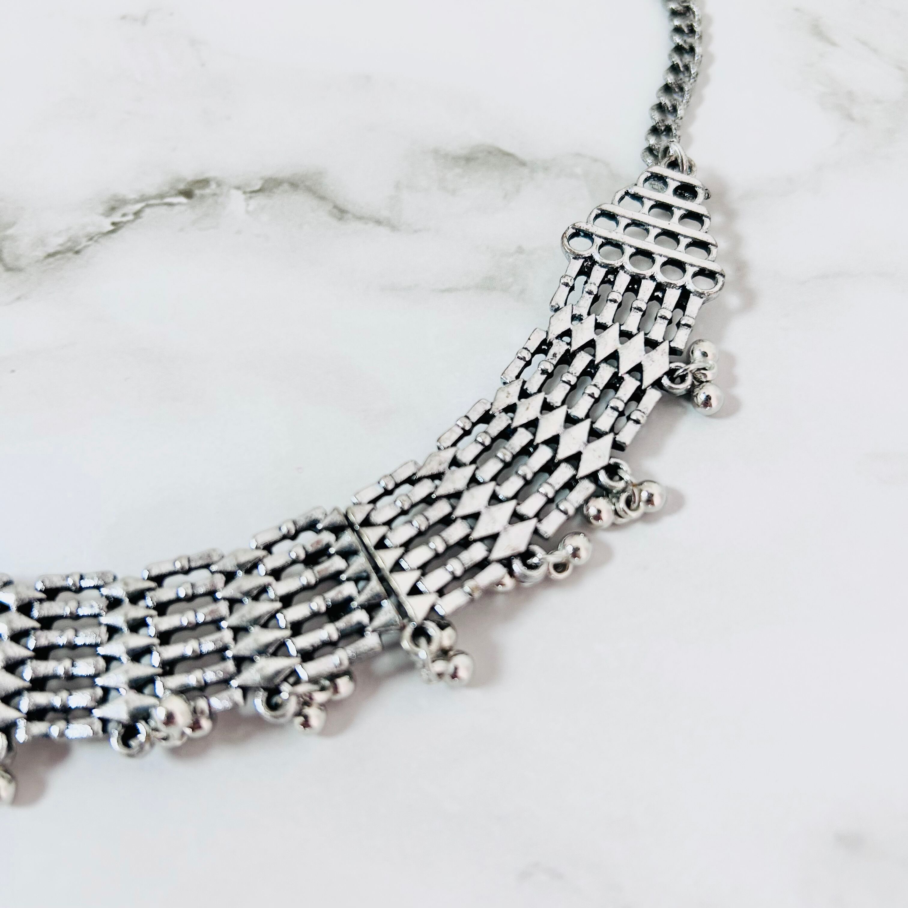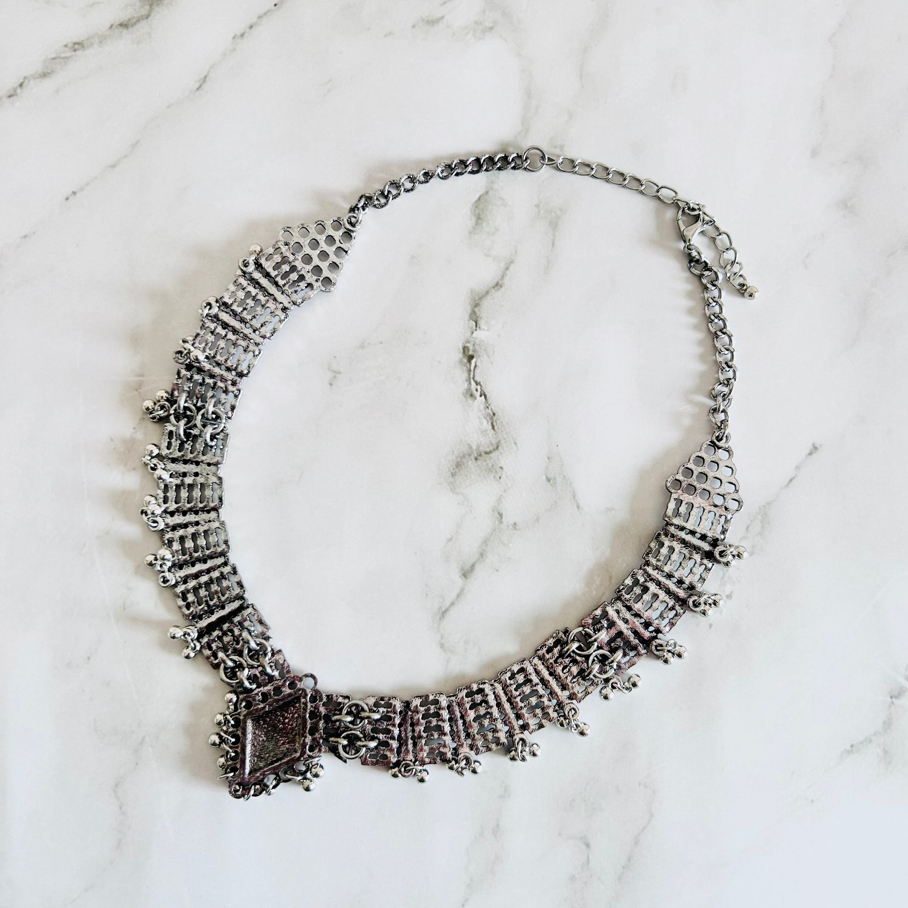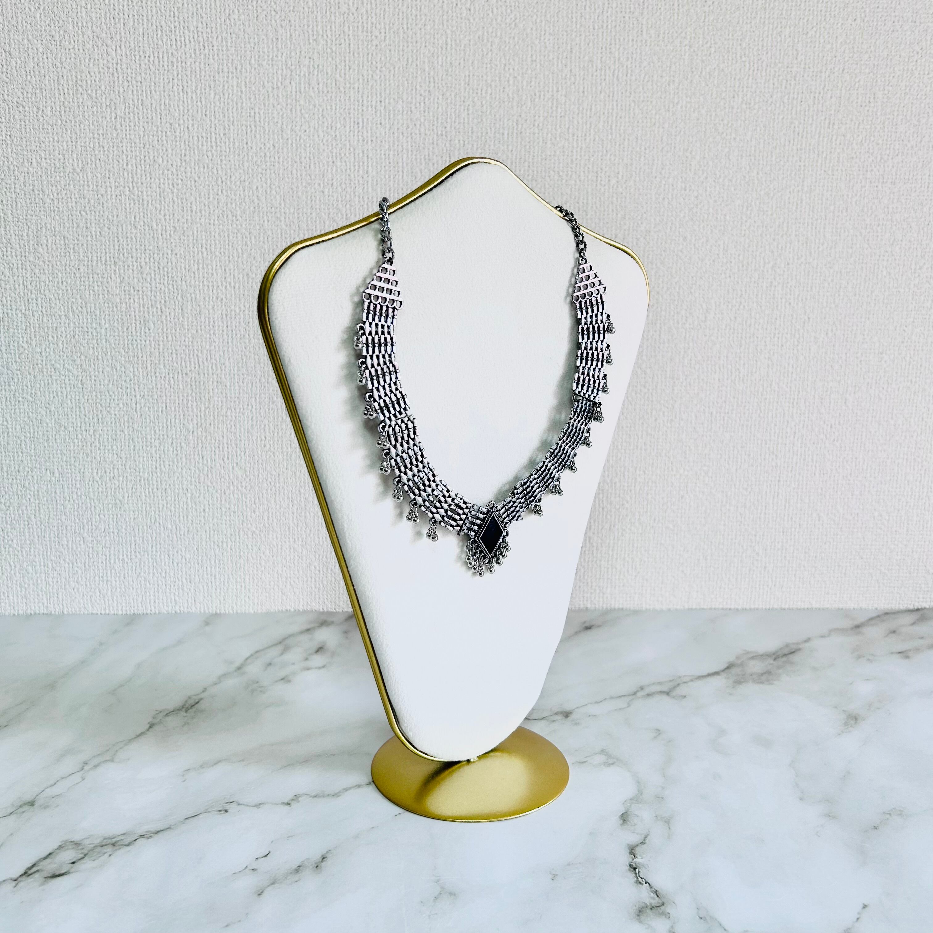 アンティークシルバーのメタルパーツを連ね、細かな粒飾りを加えたチョーカーネックレスです。