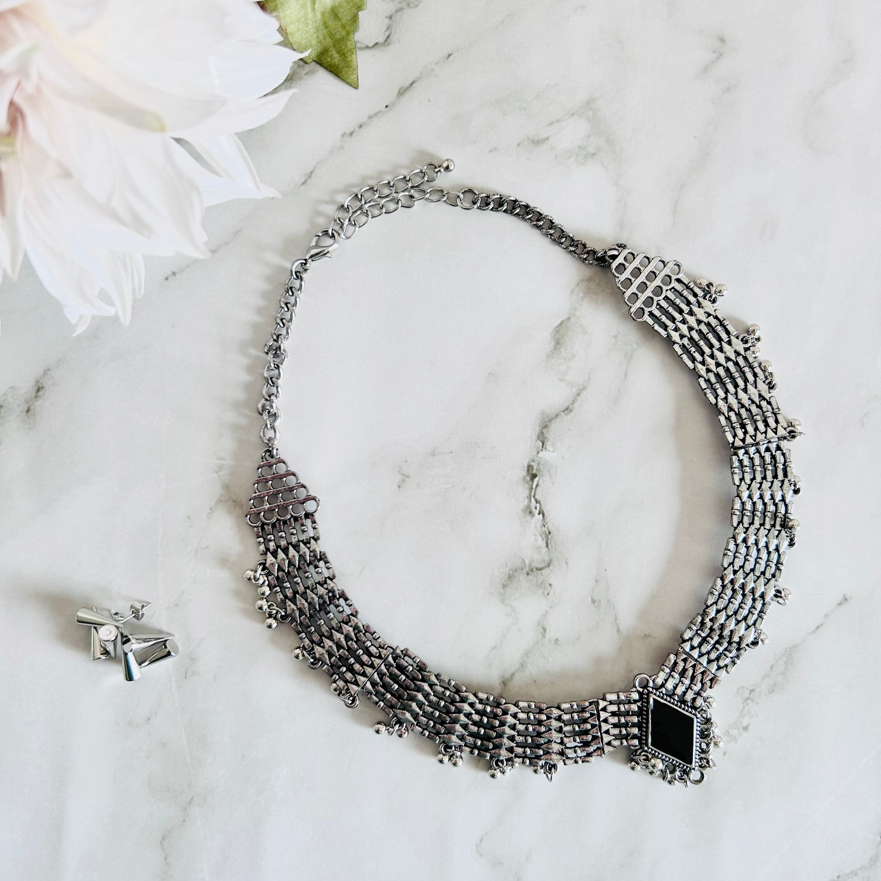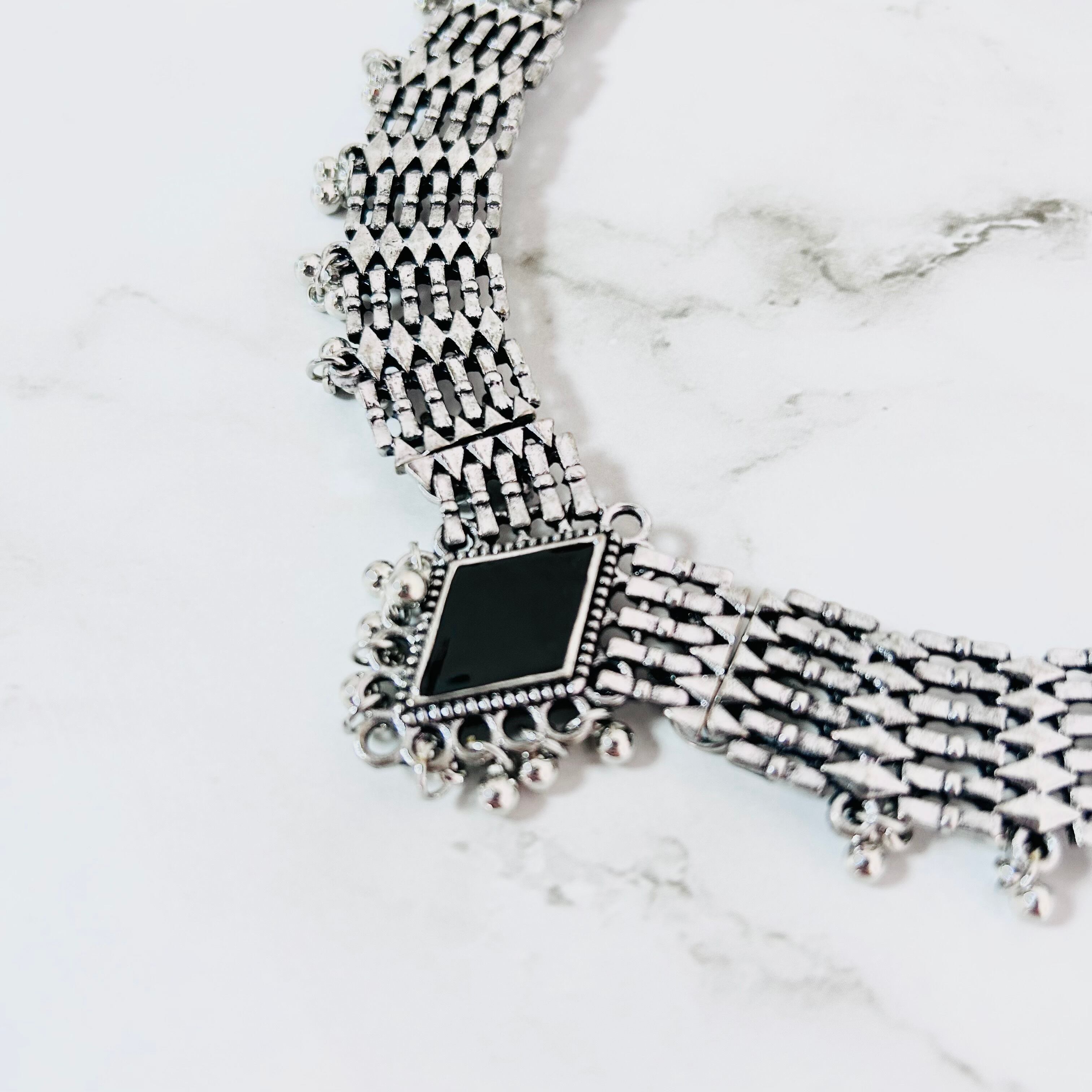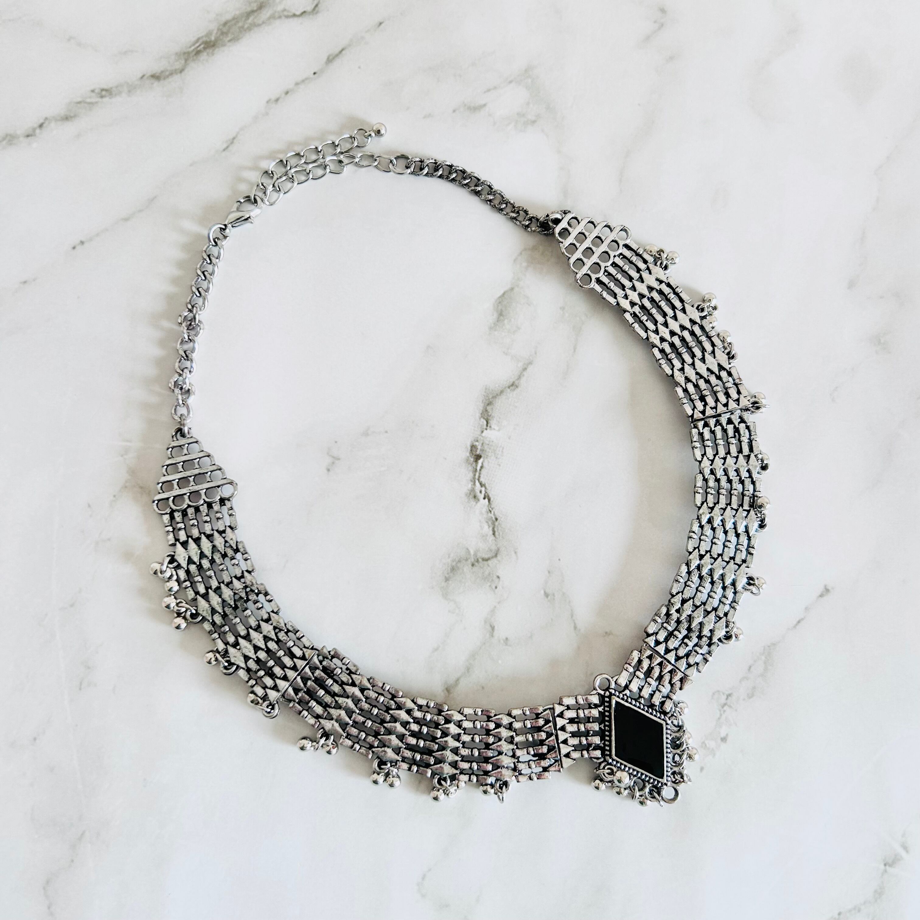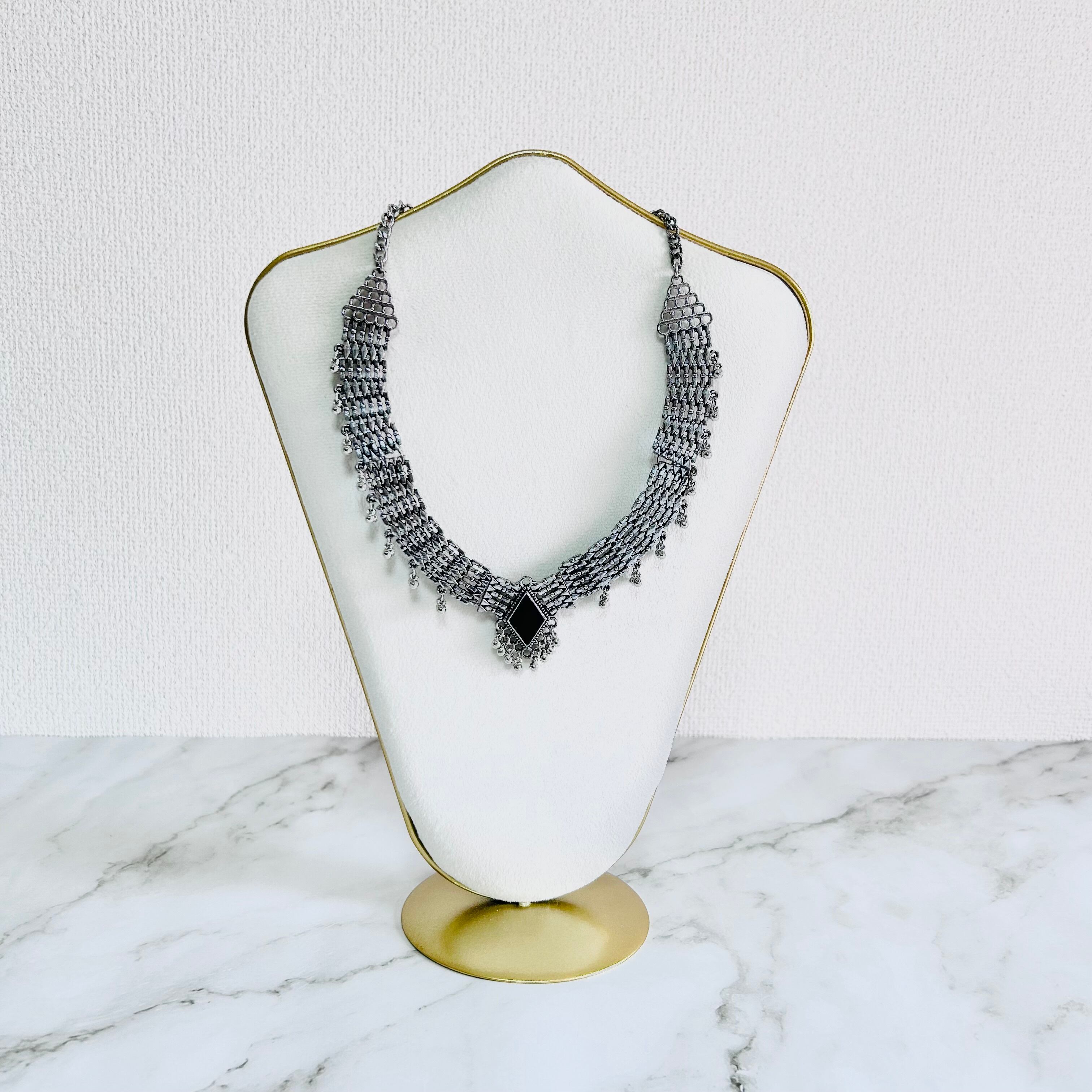 アンティークシルバーのメタルパーツを連ね、細かな粒飾りを加えたチョーカーネックレスです。