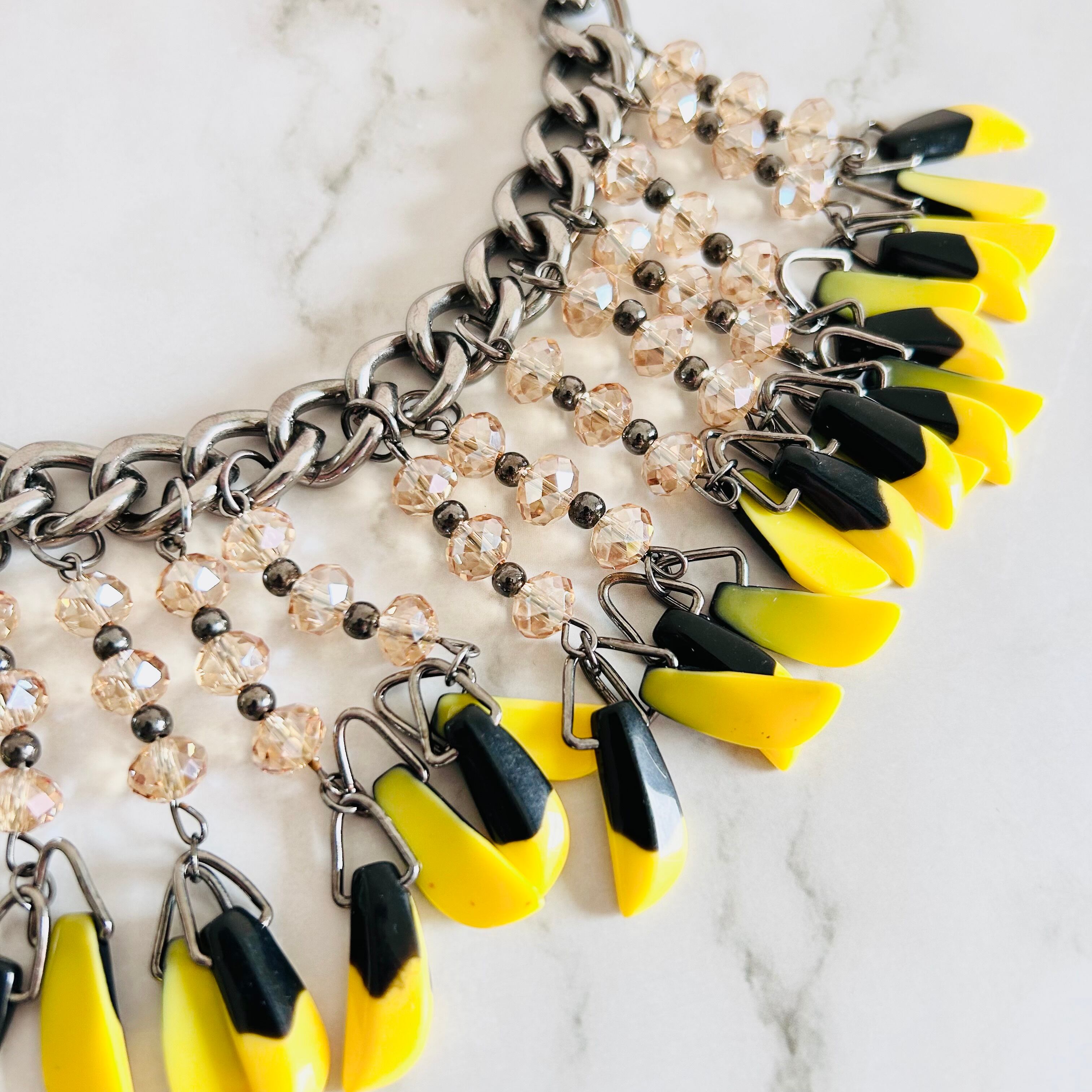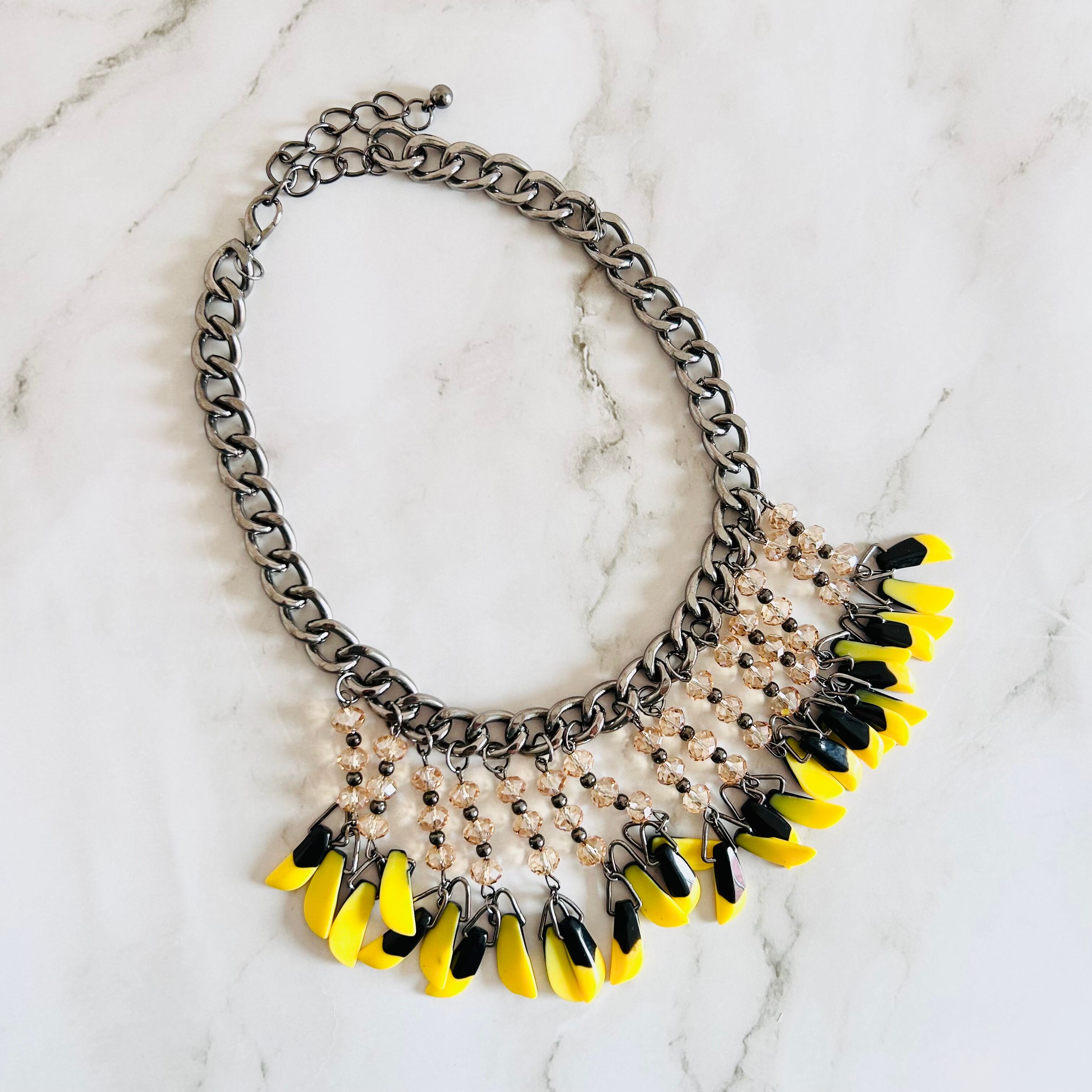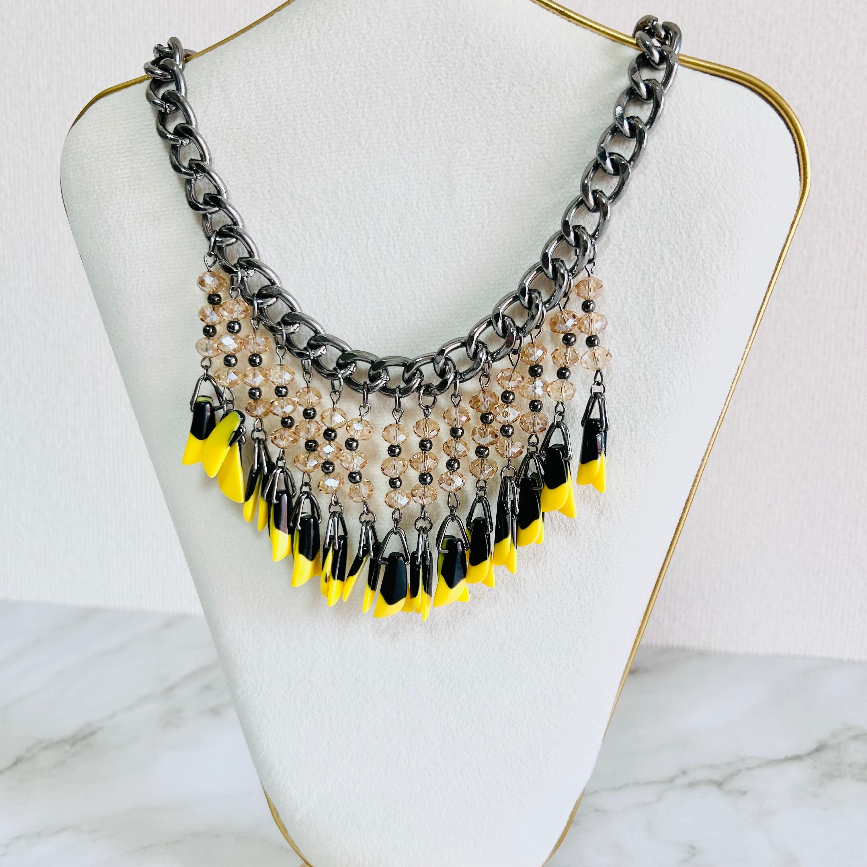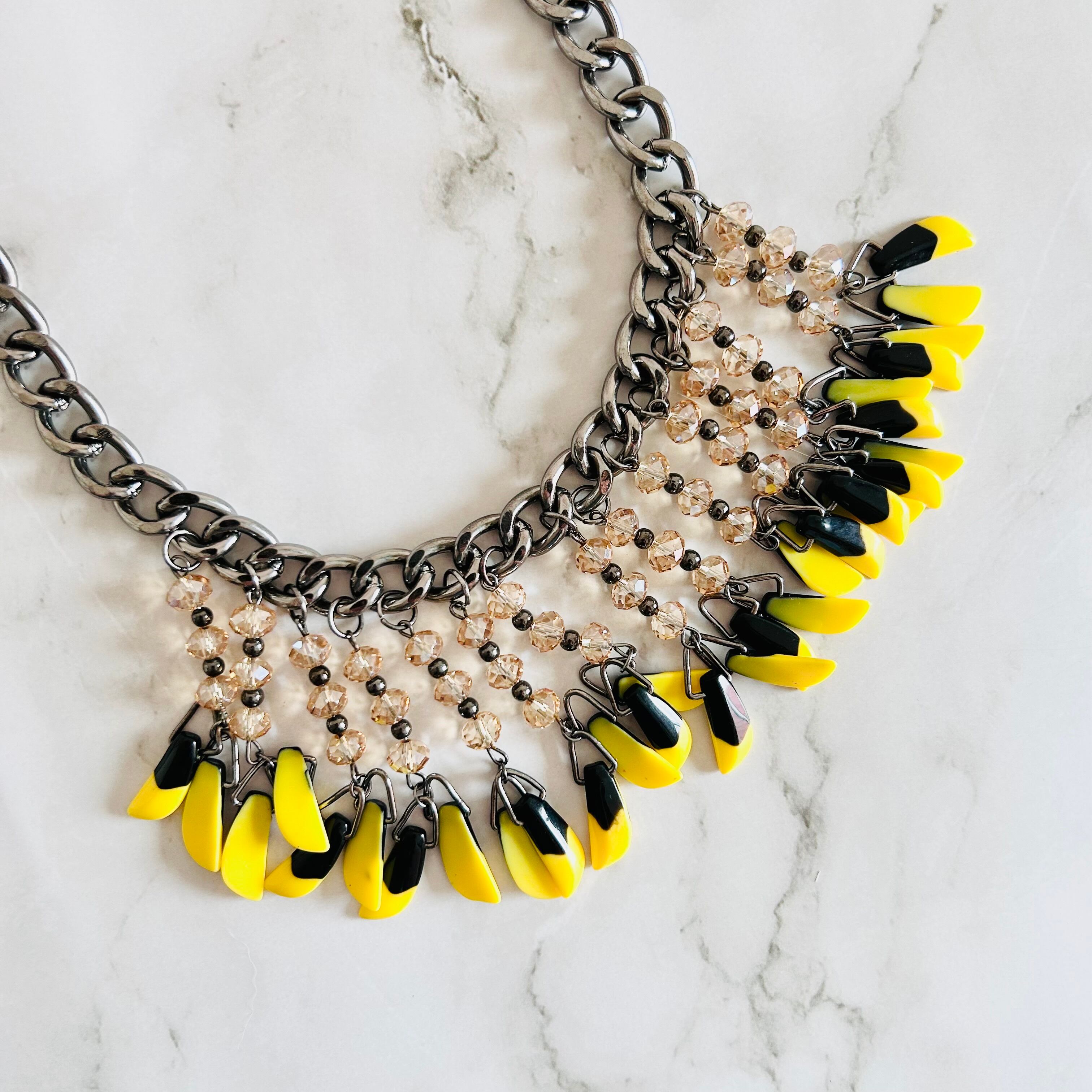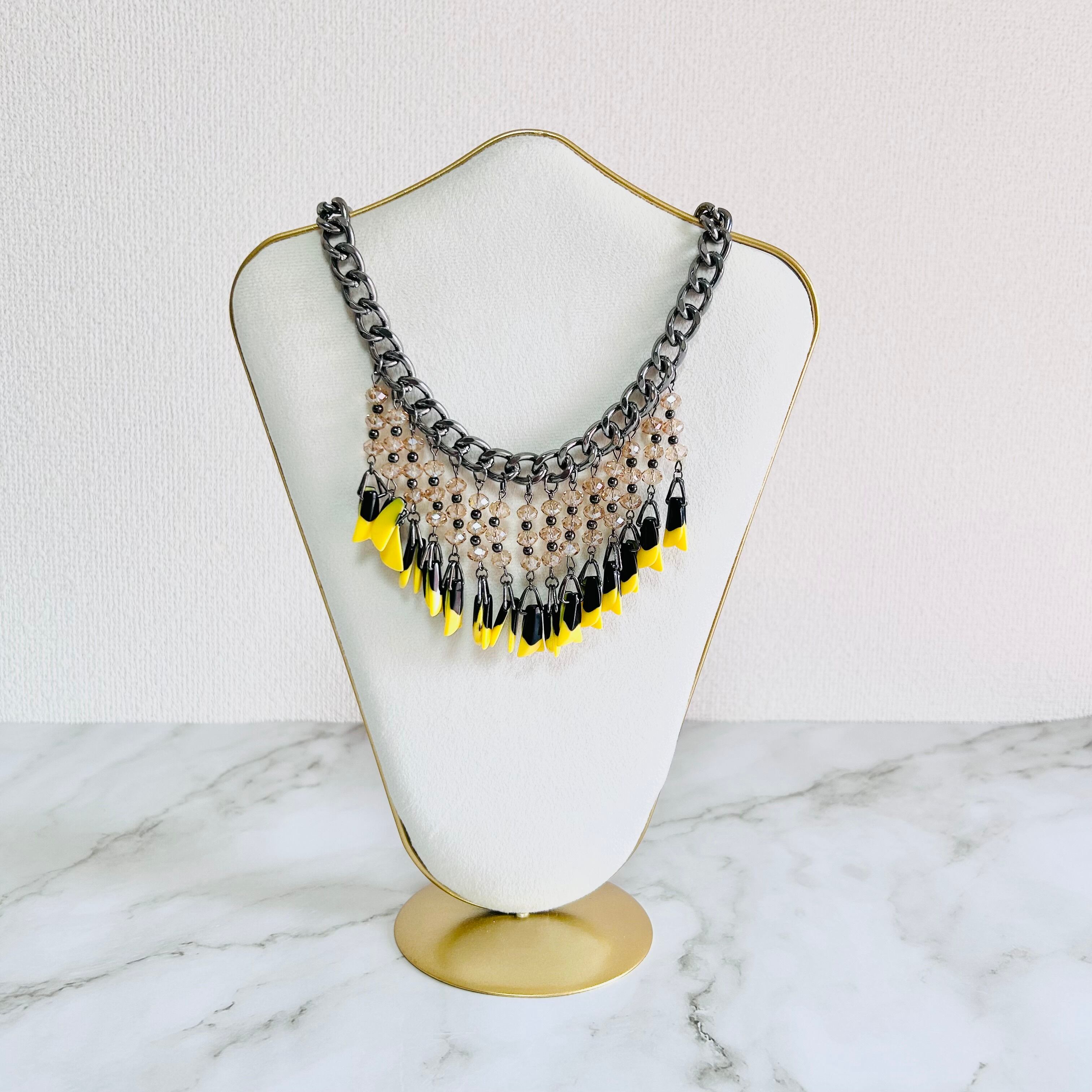 鮮やかなイエローとシックなブラックのパーツがリズミカルに揺れ動く、エネルギッシュな印象のネックレスです。