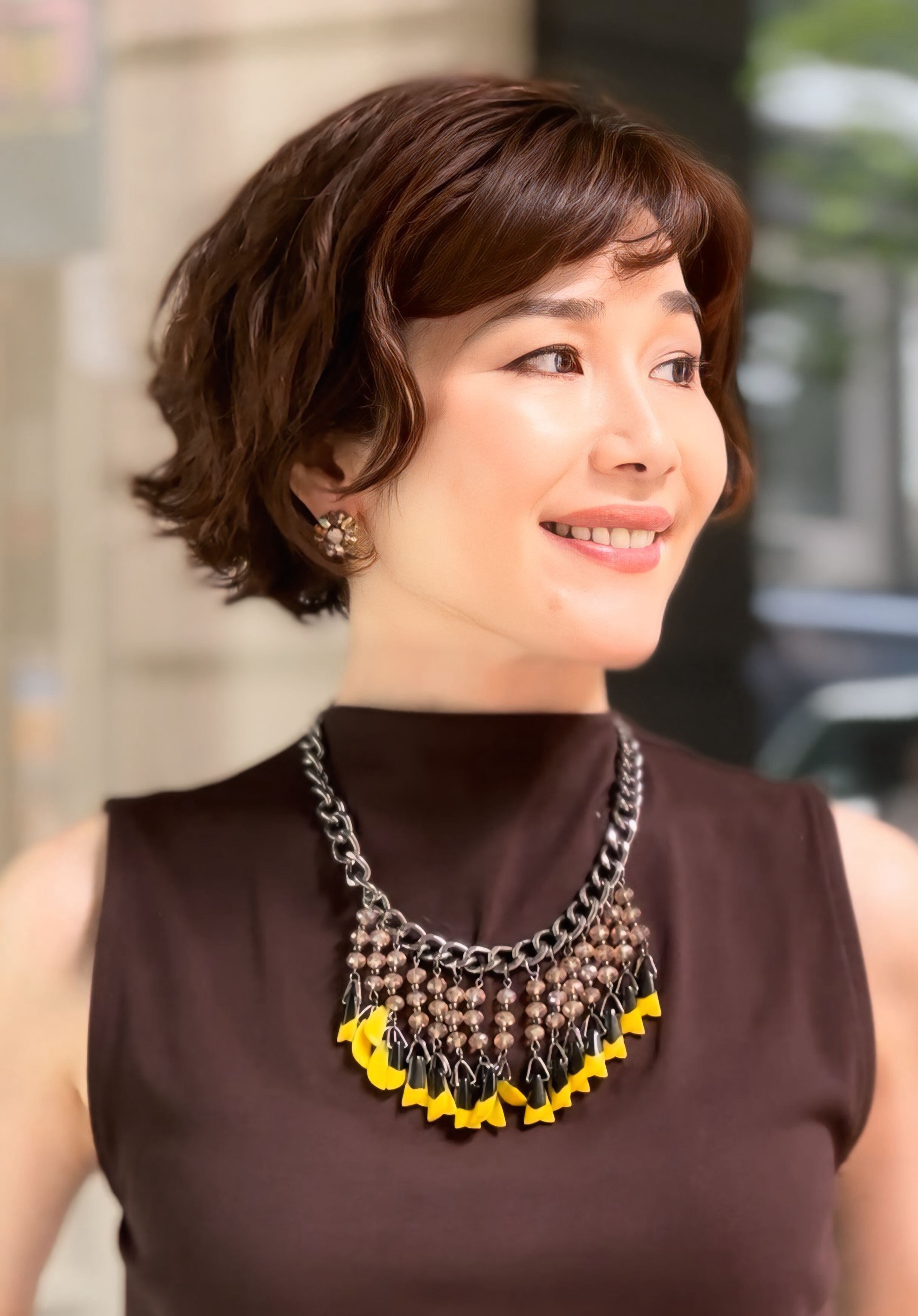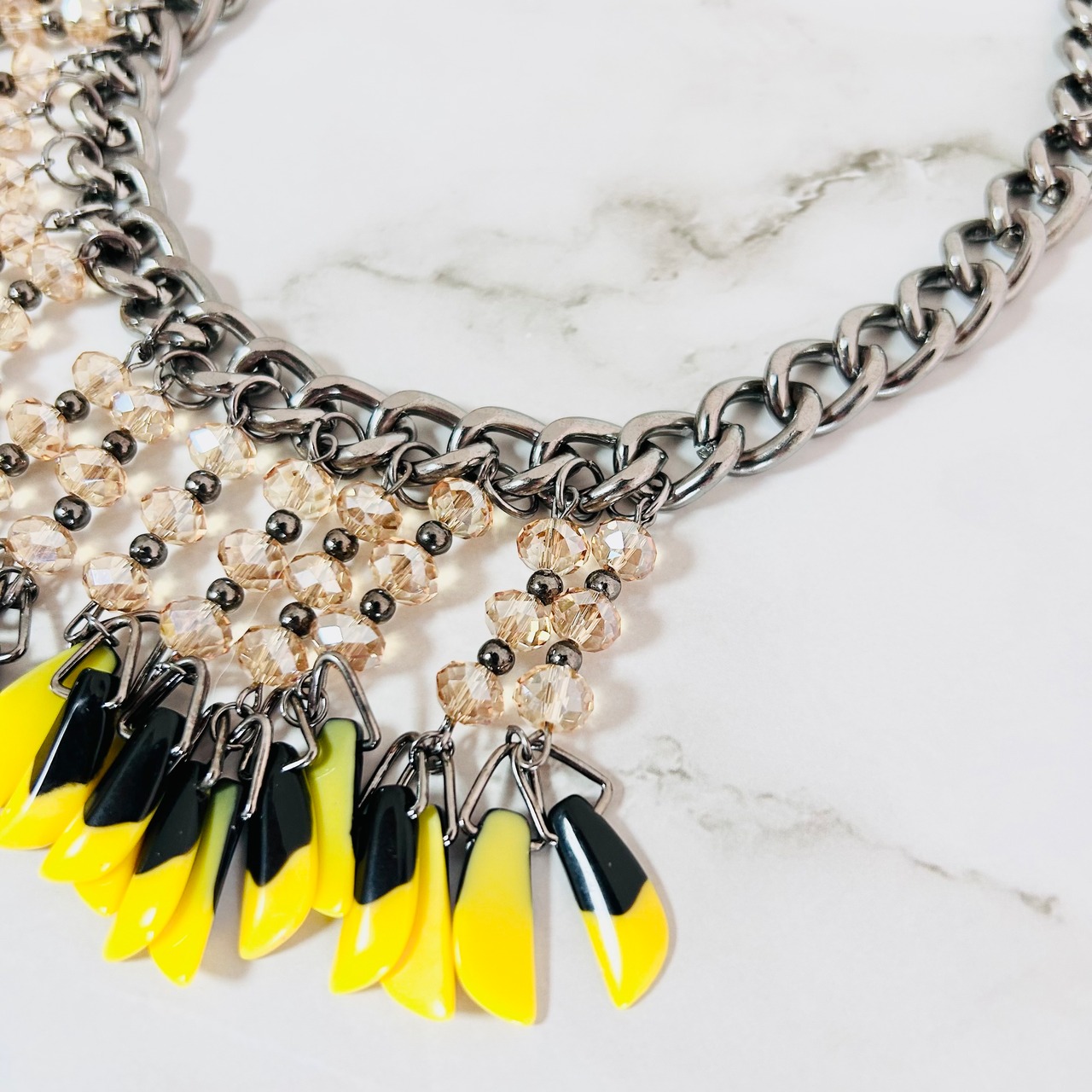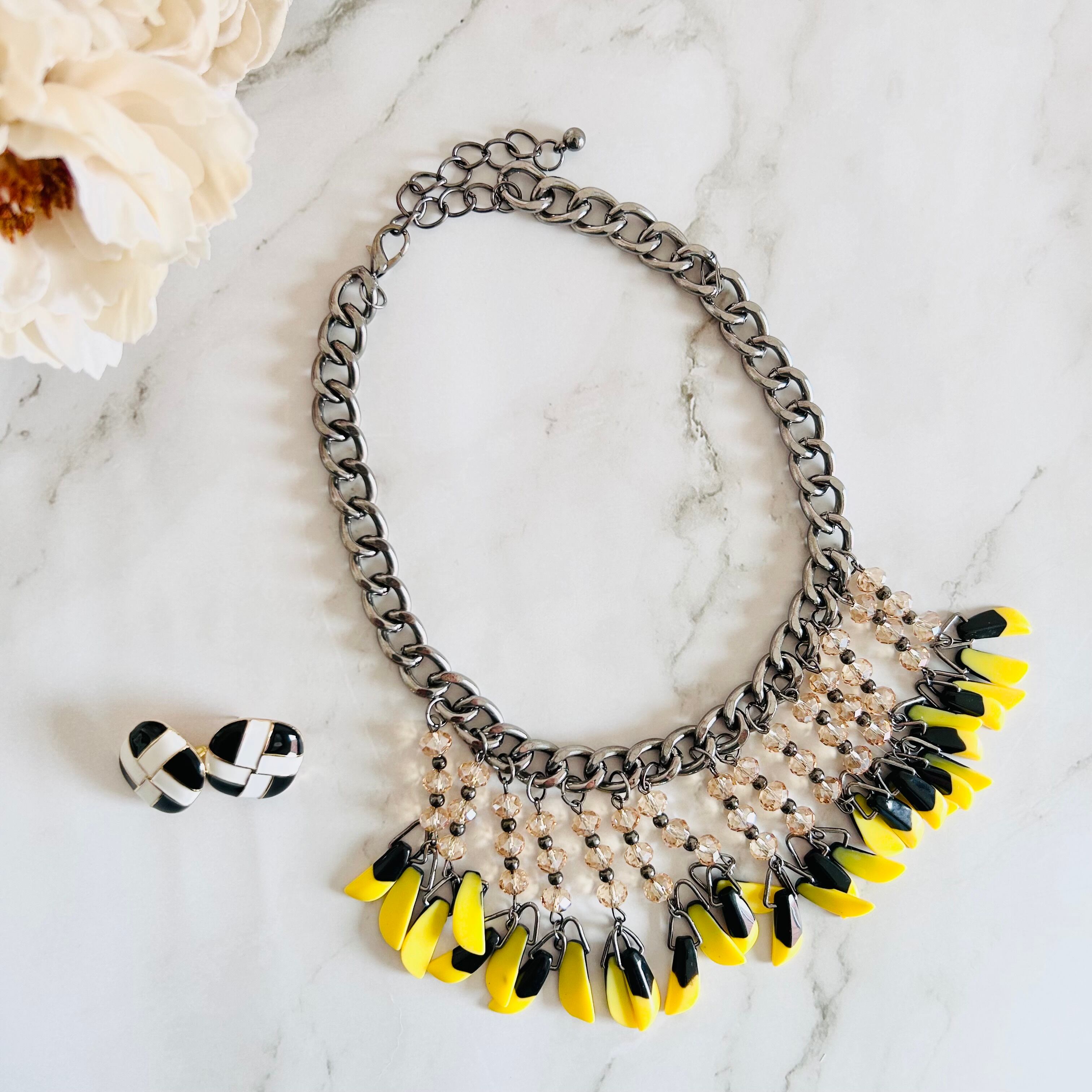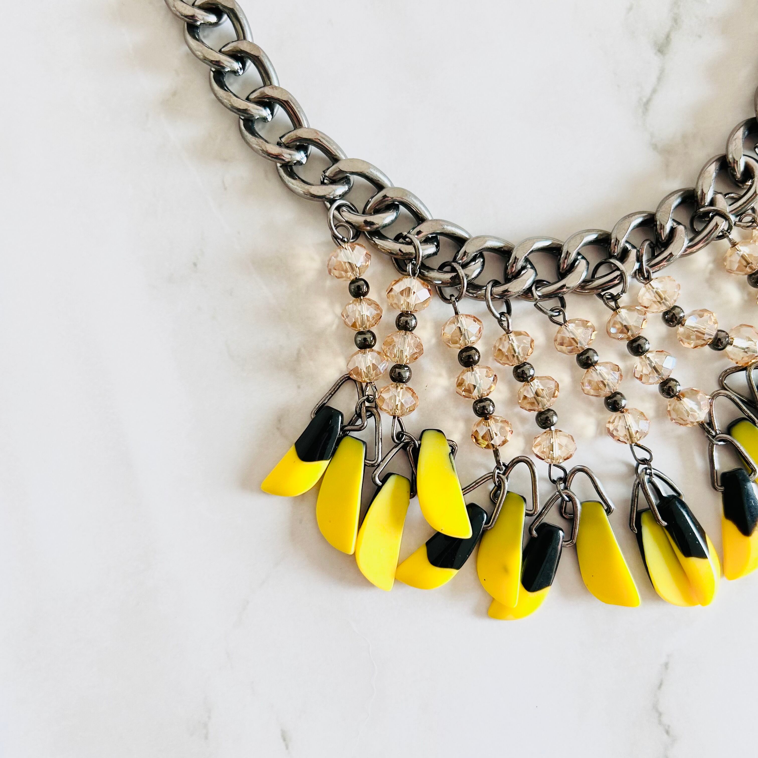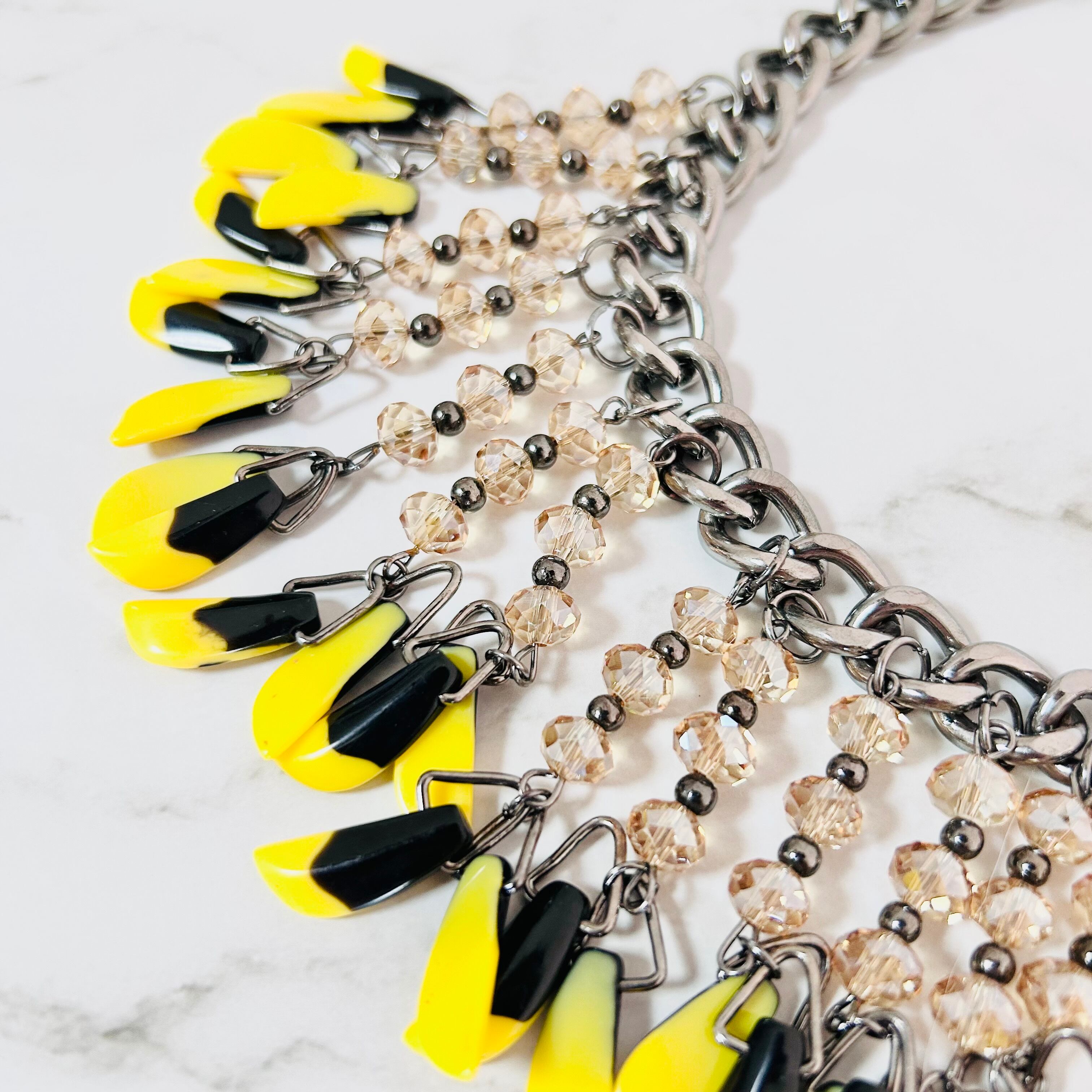 鮮やかなイエローとシックなブラックのパーツがリズミカルに揺れ動く、エネルギッシュな印象のネックレスです。