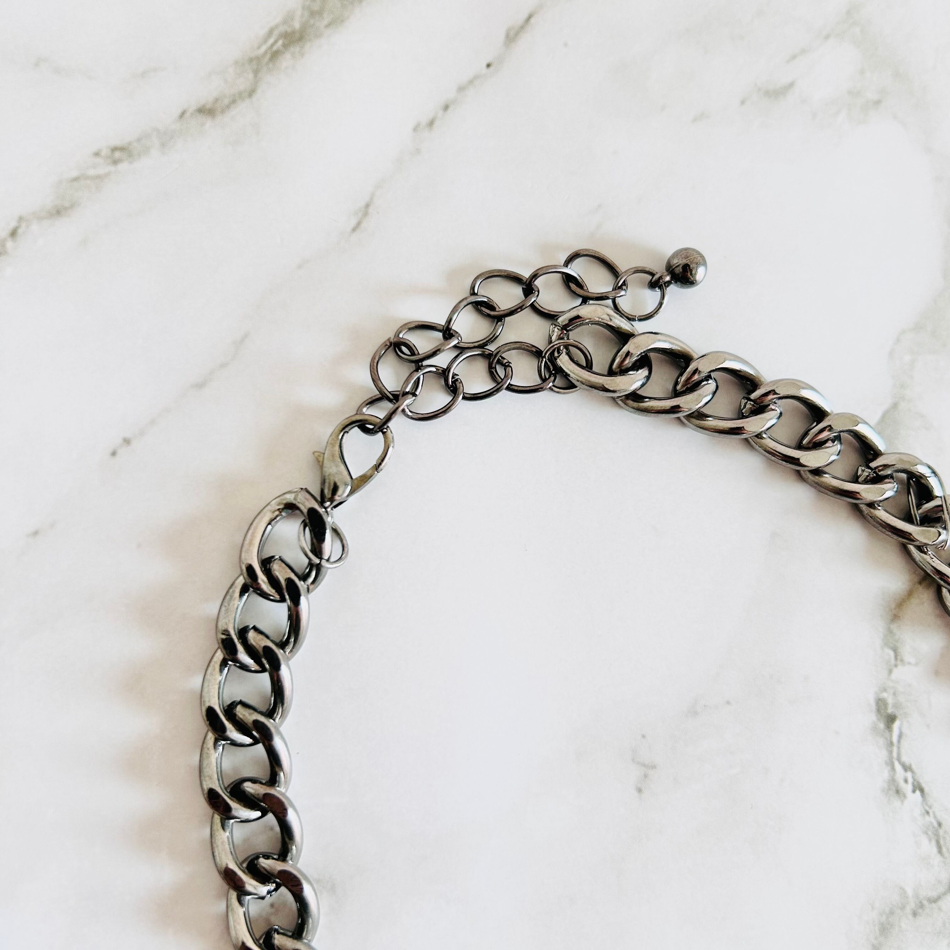 光を受けてきらめくベージュ系クリスタルビーズがアクセントとなり、存在感のある太めのチェーンとのコントラストがモダンで洗練された雰囲気を漂わせます。