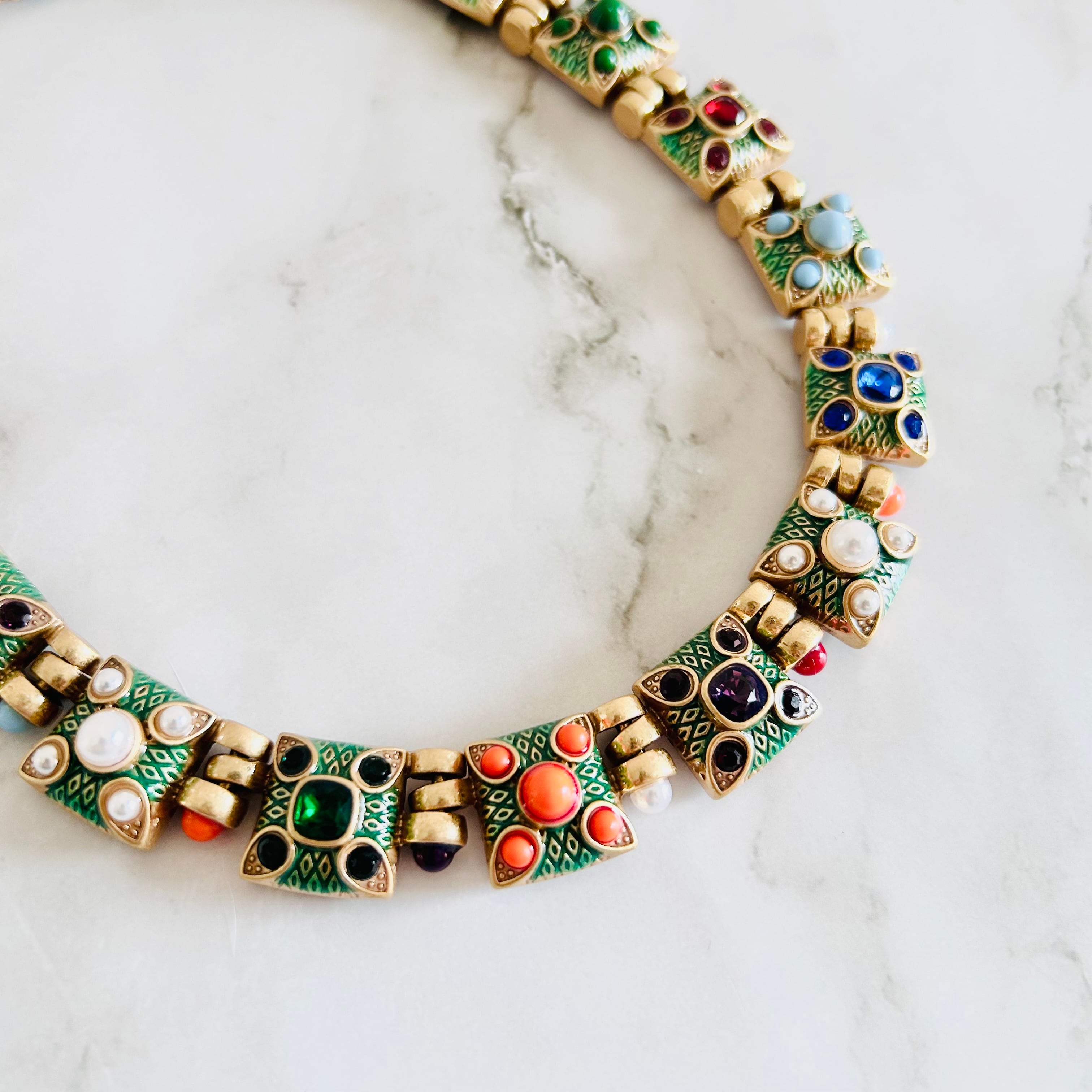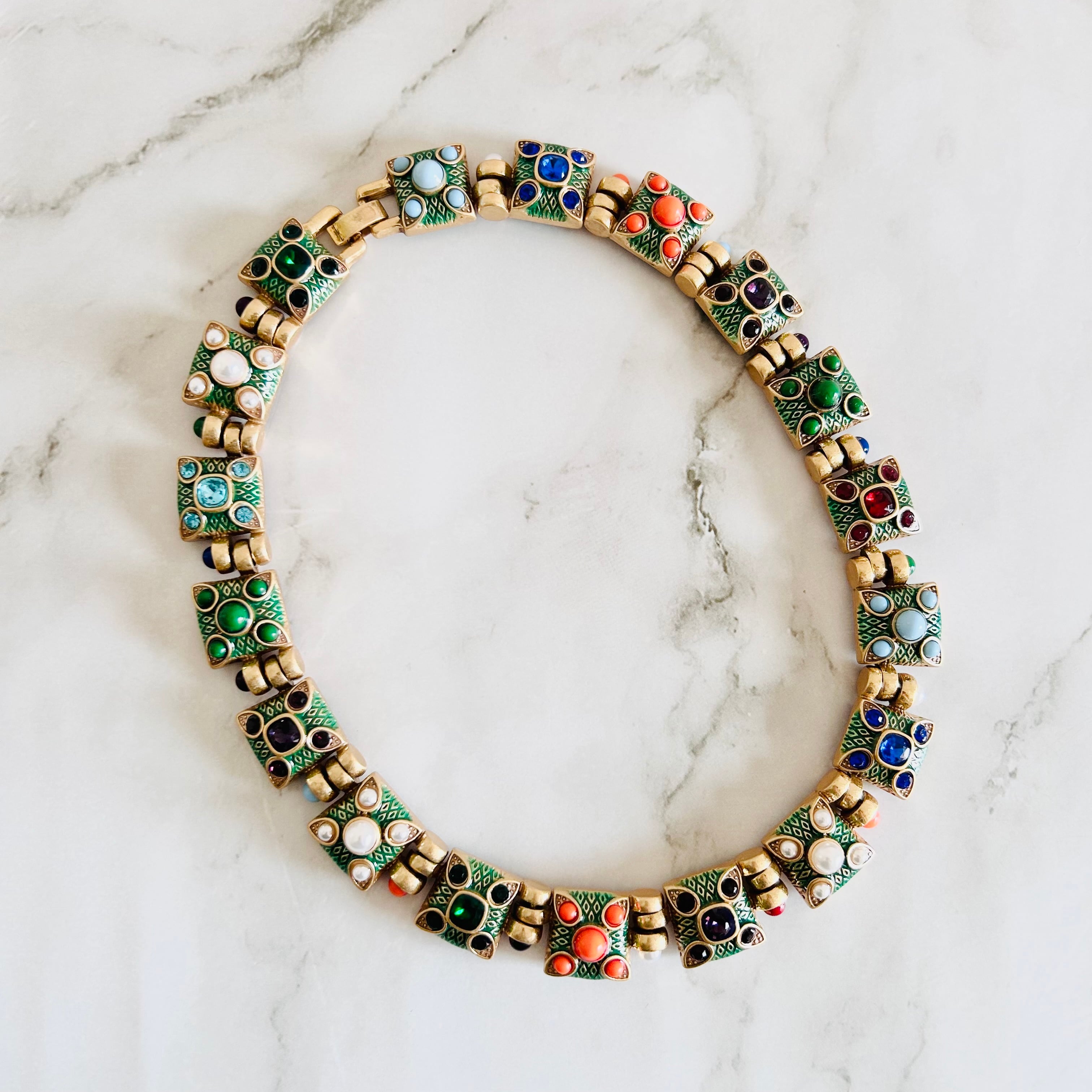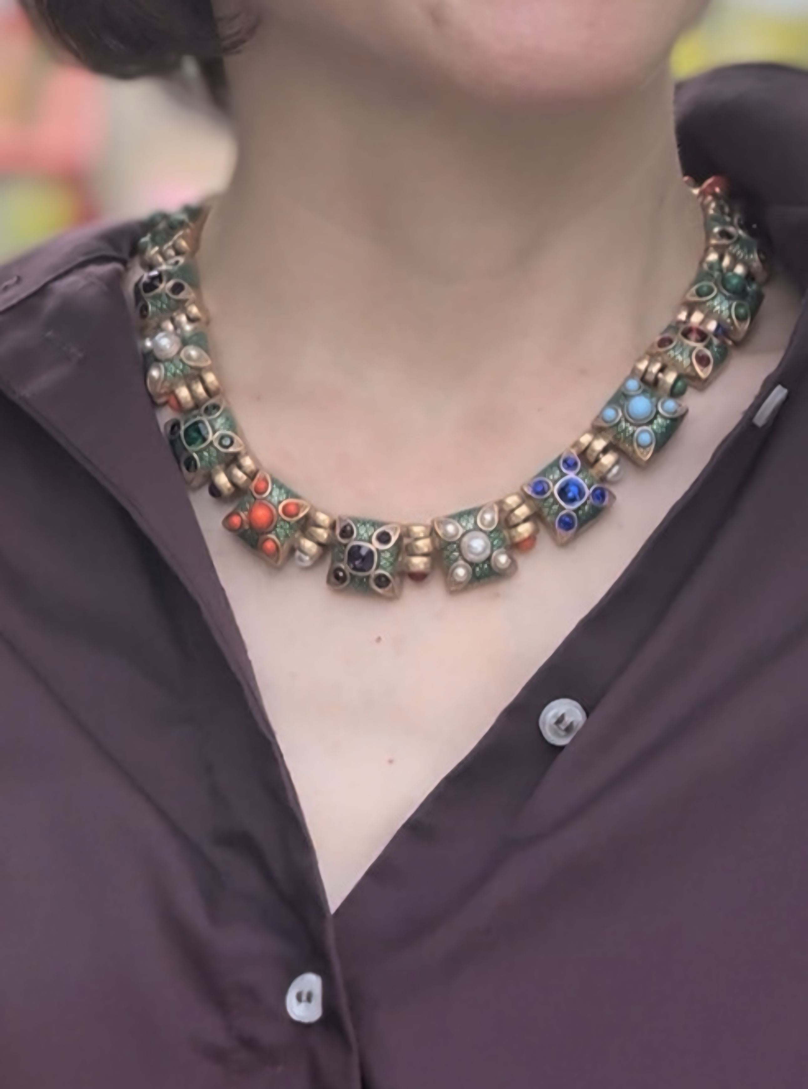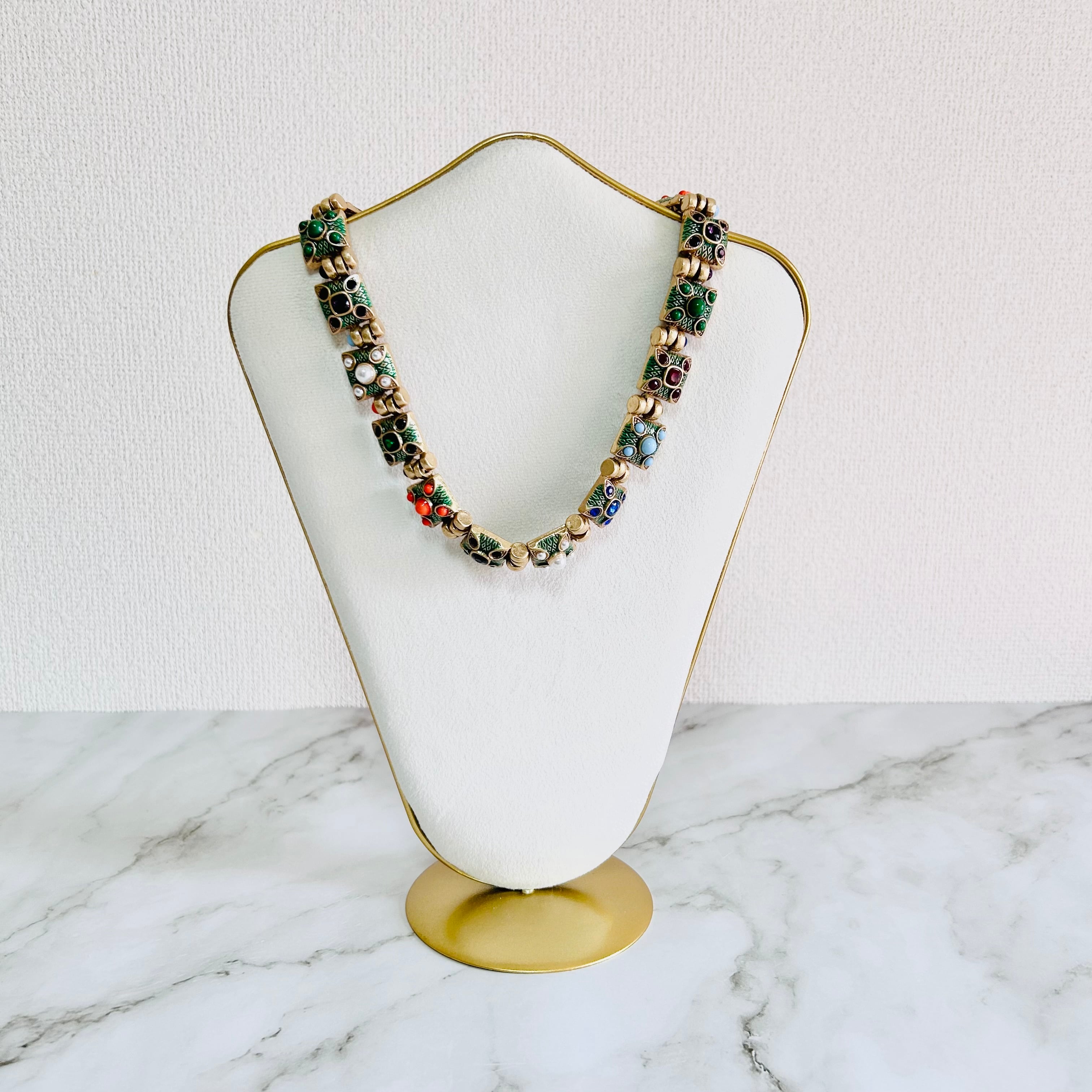 鮮やかなカラーストーンを組み込んだアンティーク調のスクエアパーツが連なるネックレスです。