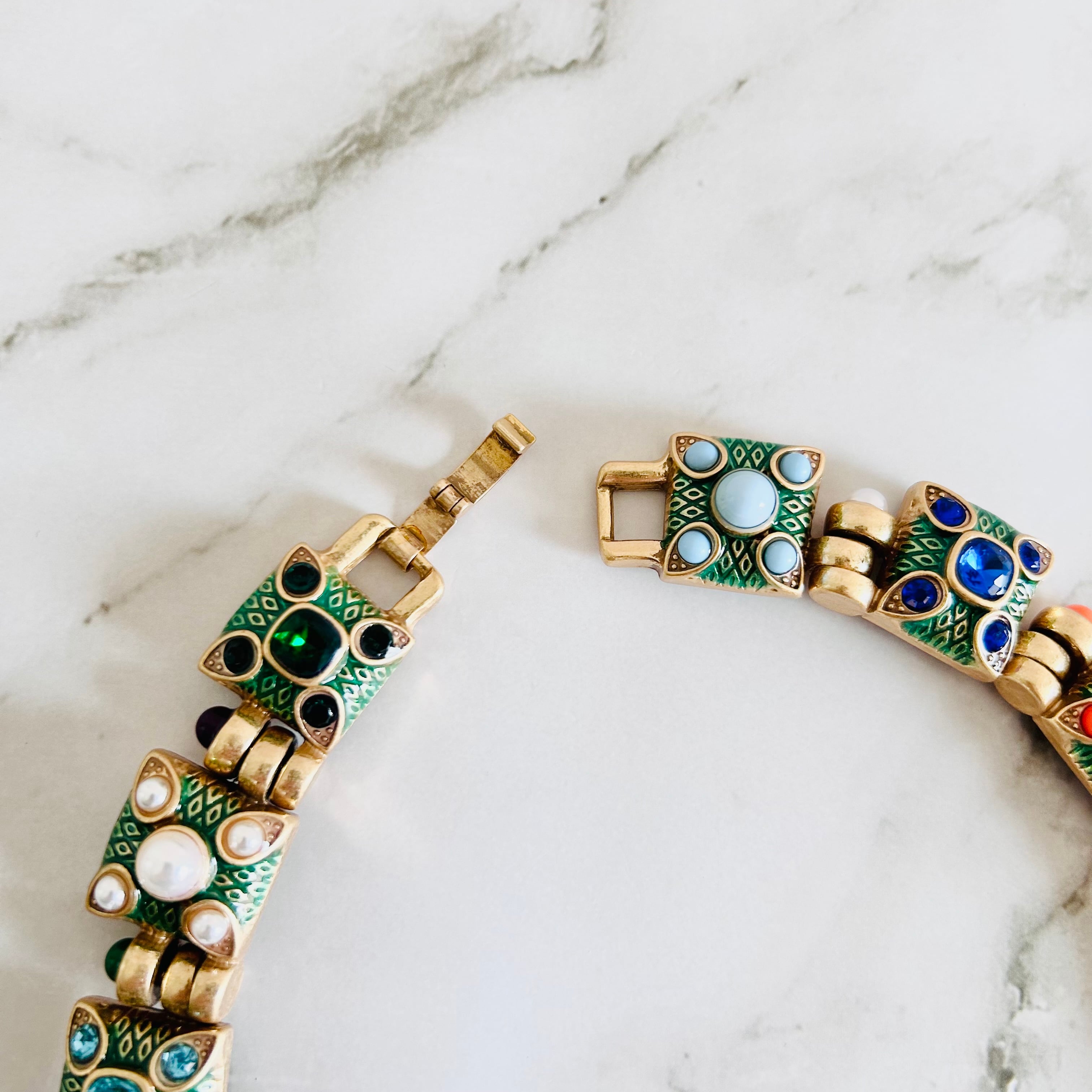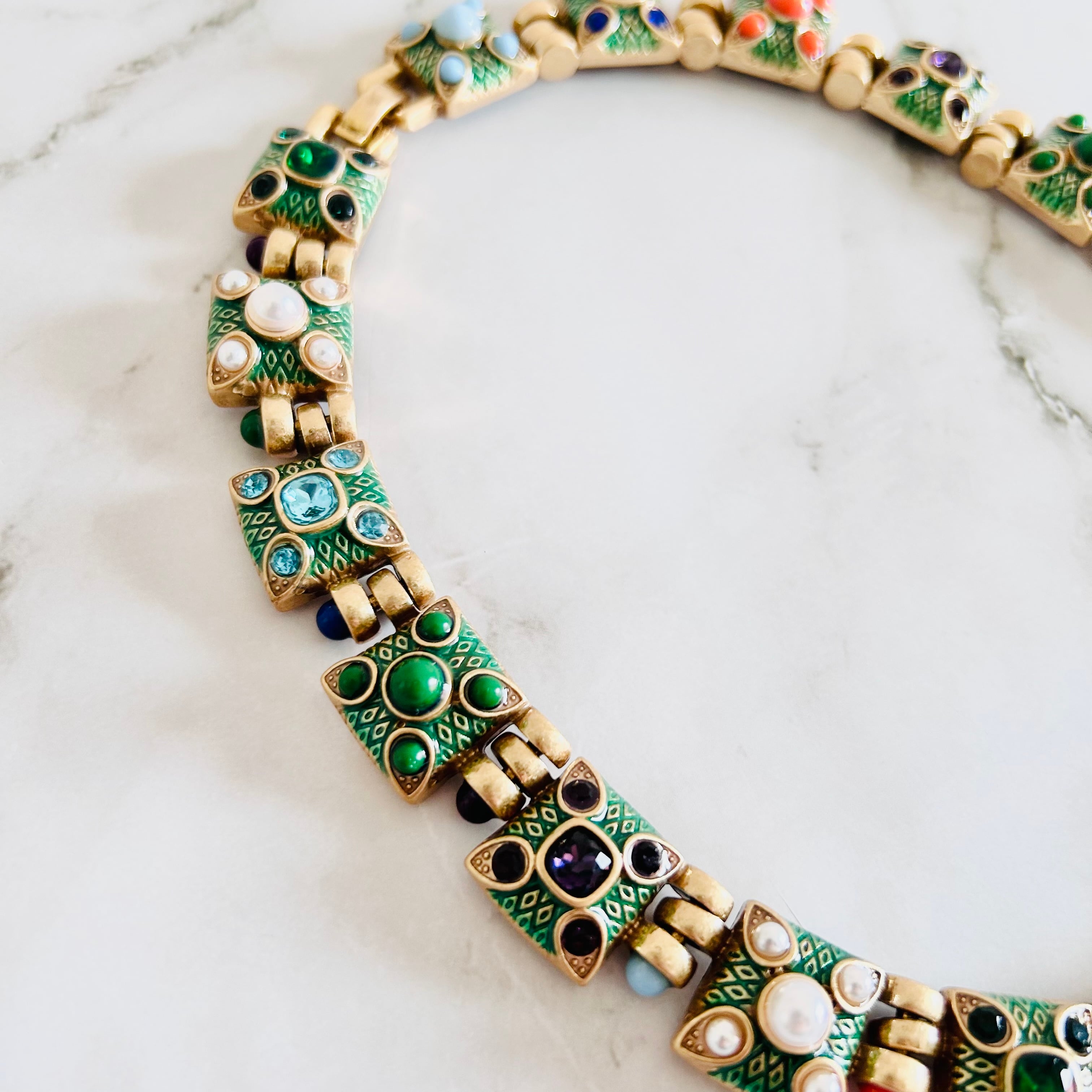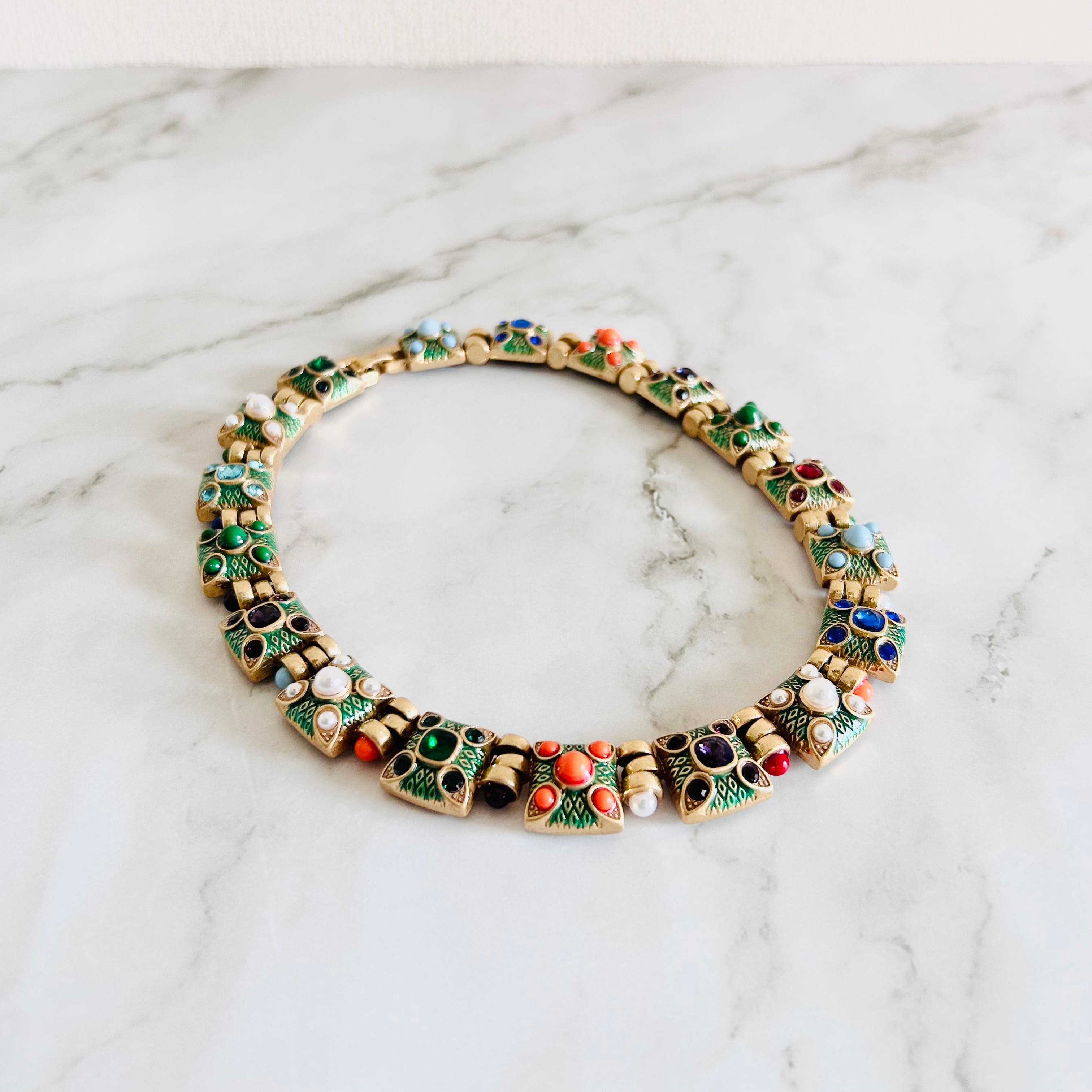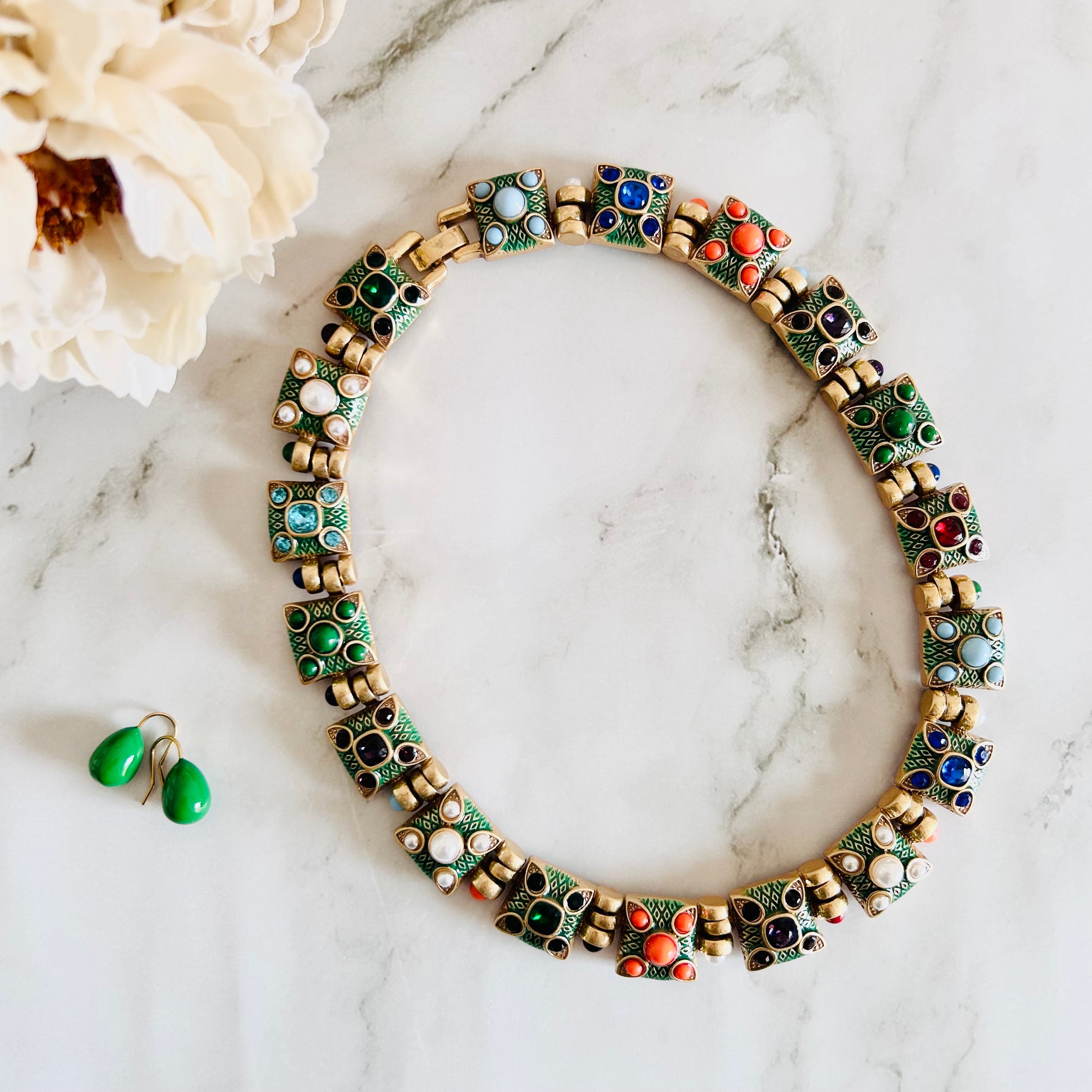 鮮やかなカラーストーンを組み込んだアンティーク調のスクエアパーツが連なるネックレスです。