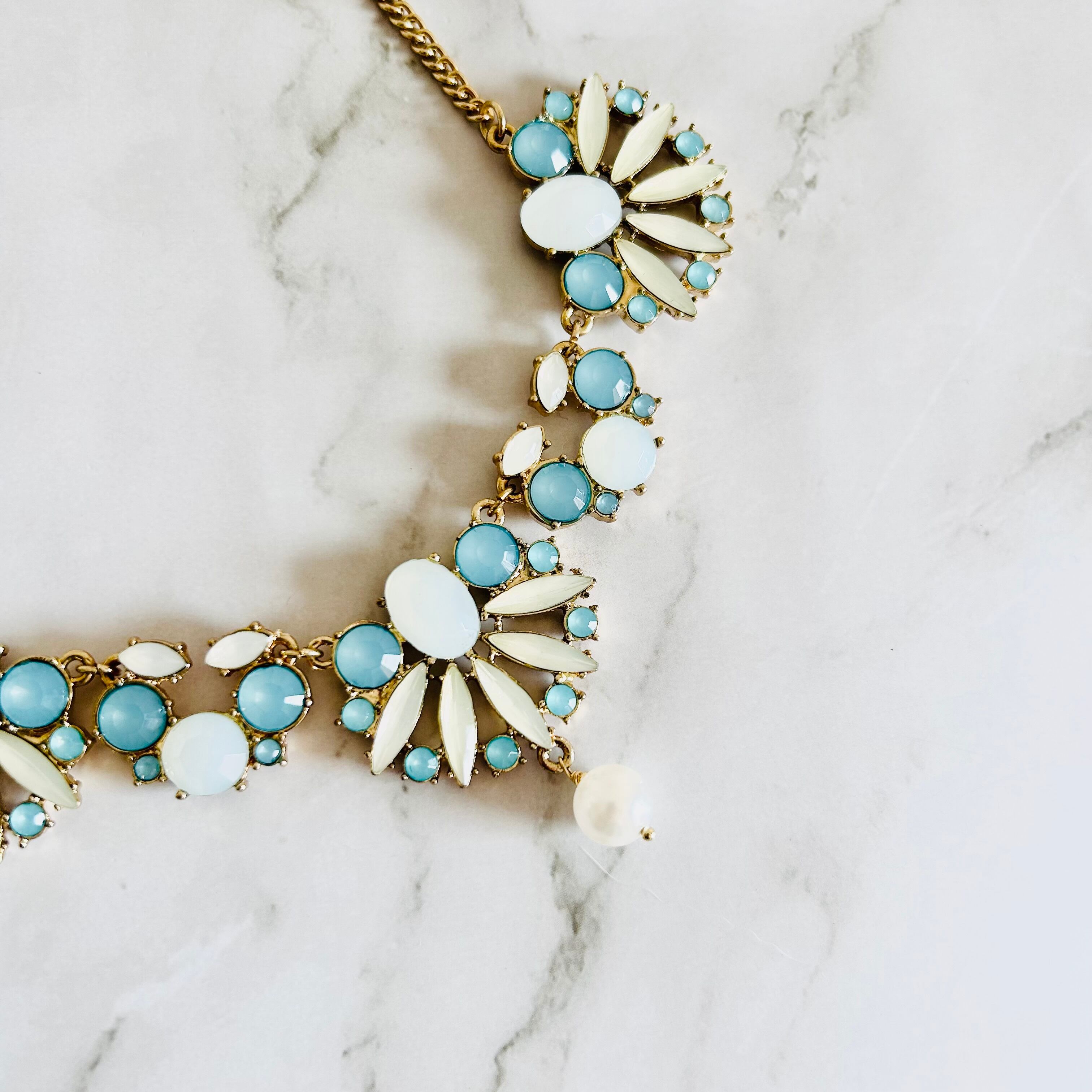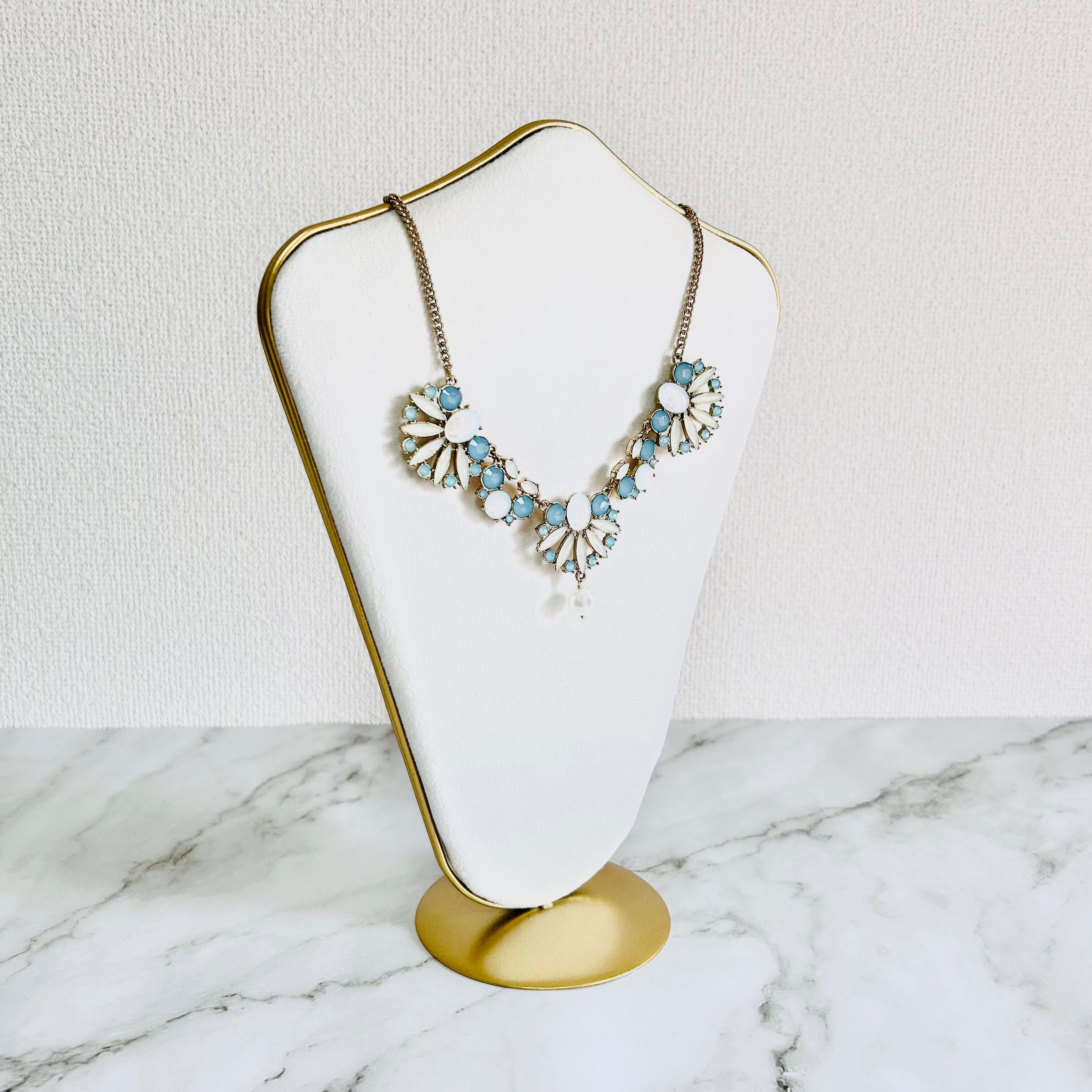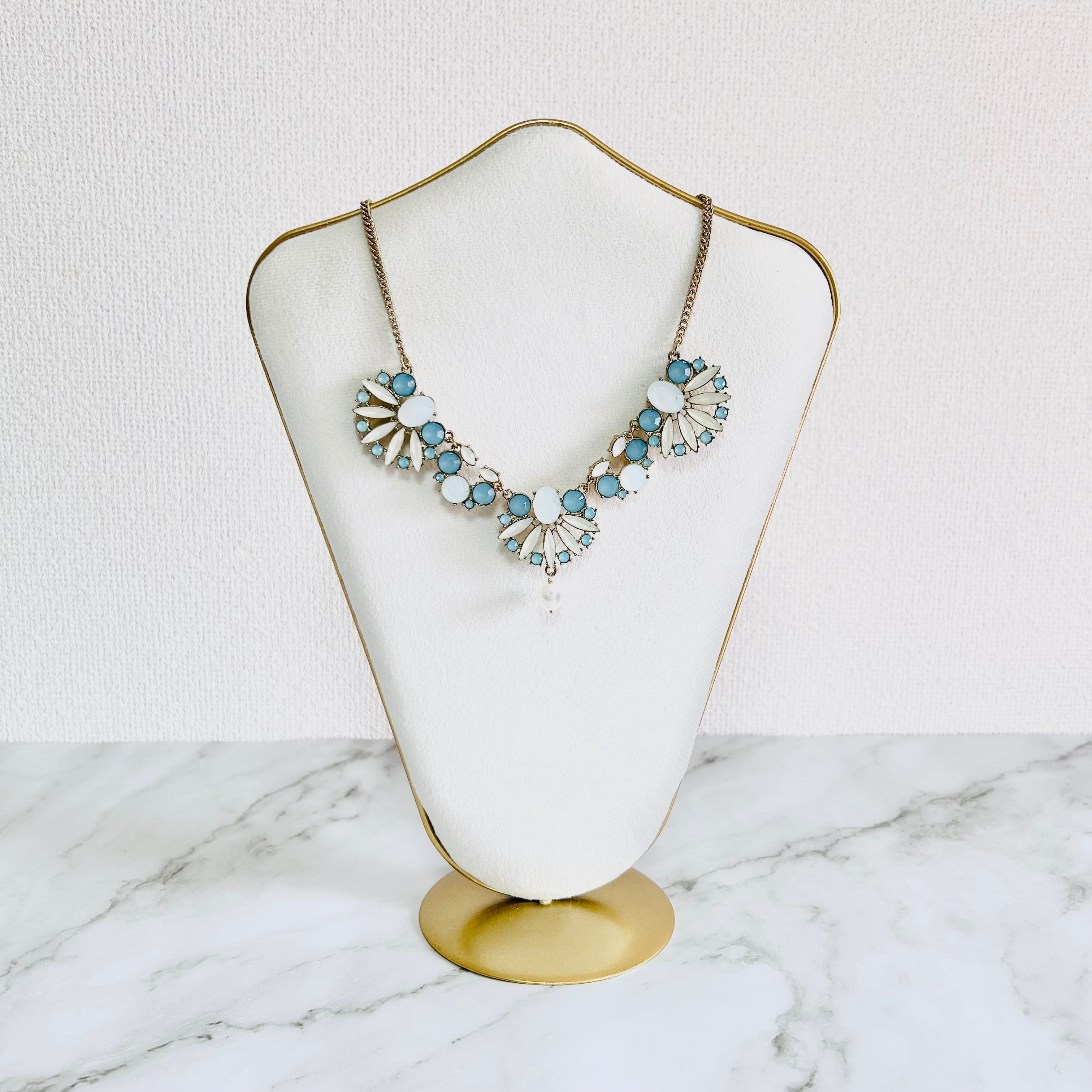 ミルキートーンの淡いブルーのビジューを組み合わせ、花びらが開いたようなデザインが胸元を彩るネックレスです。