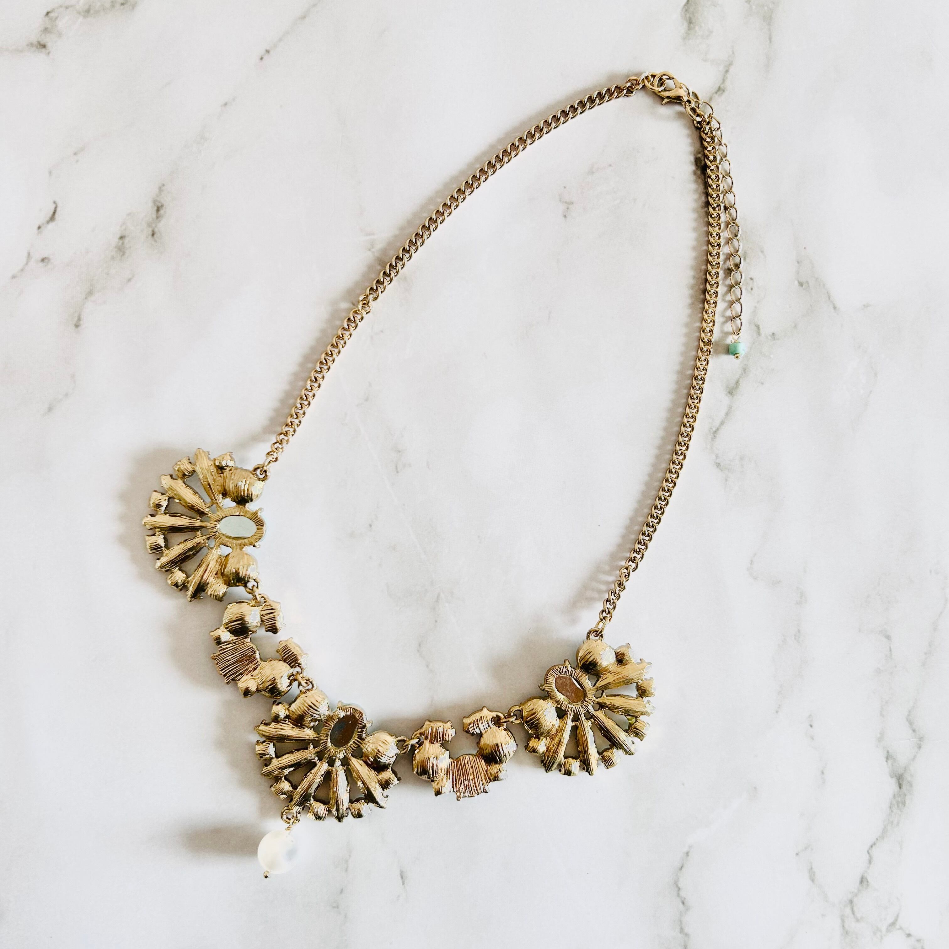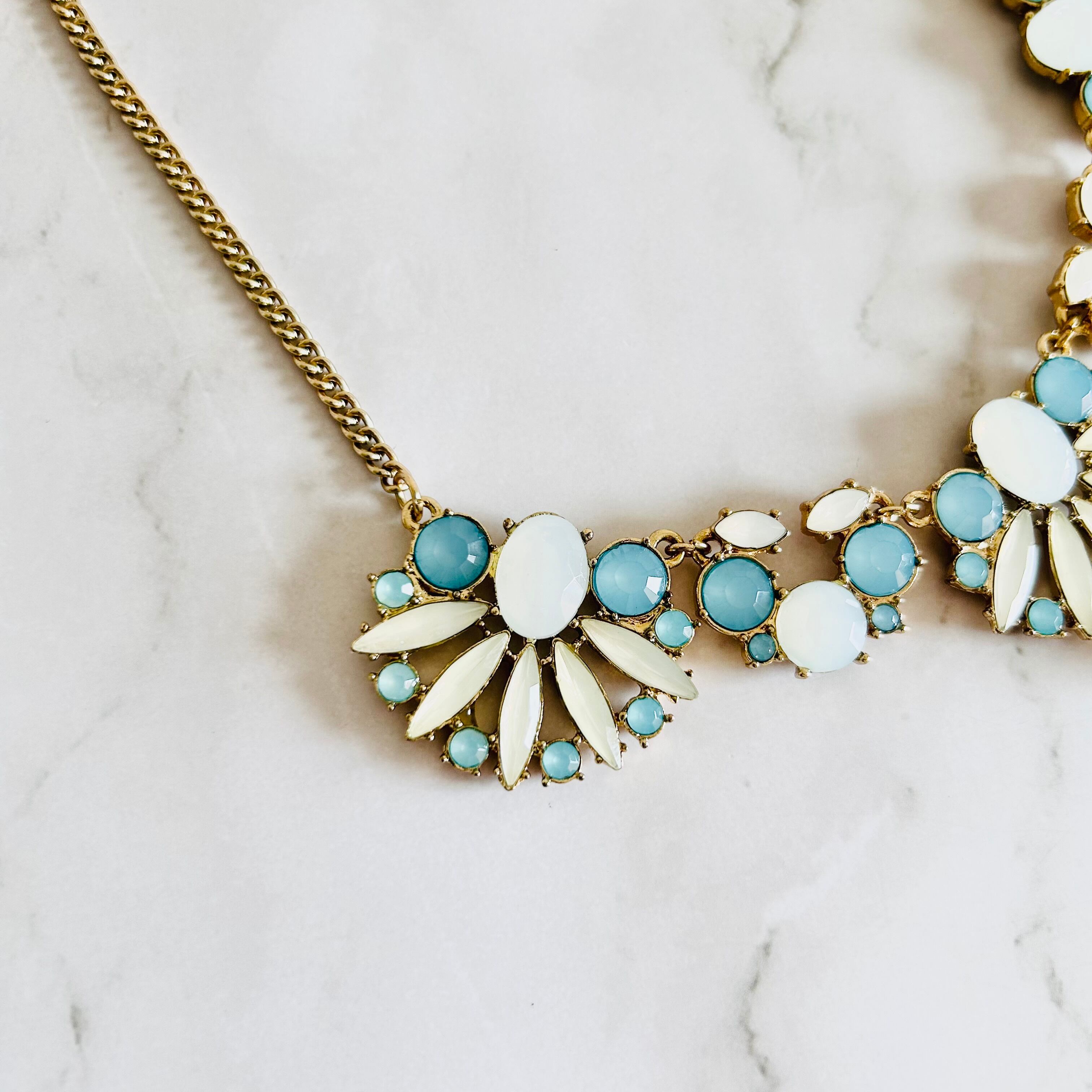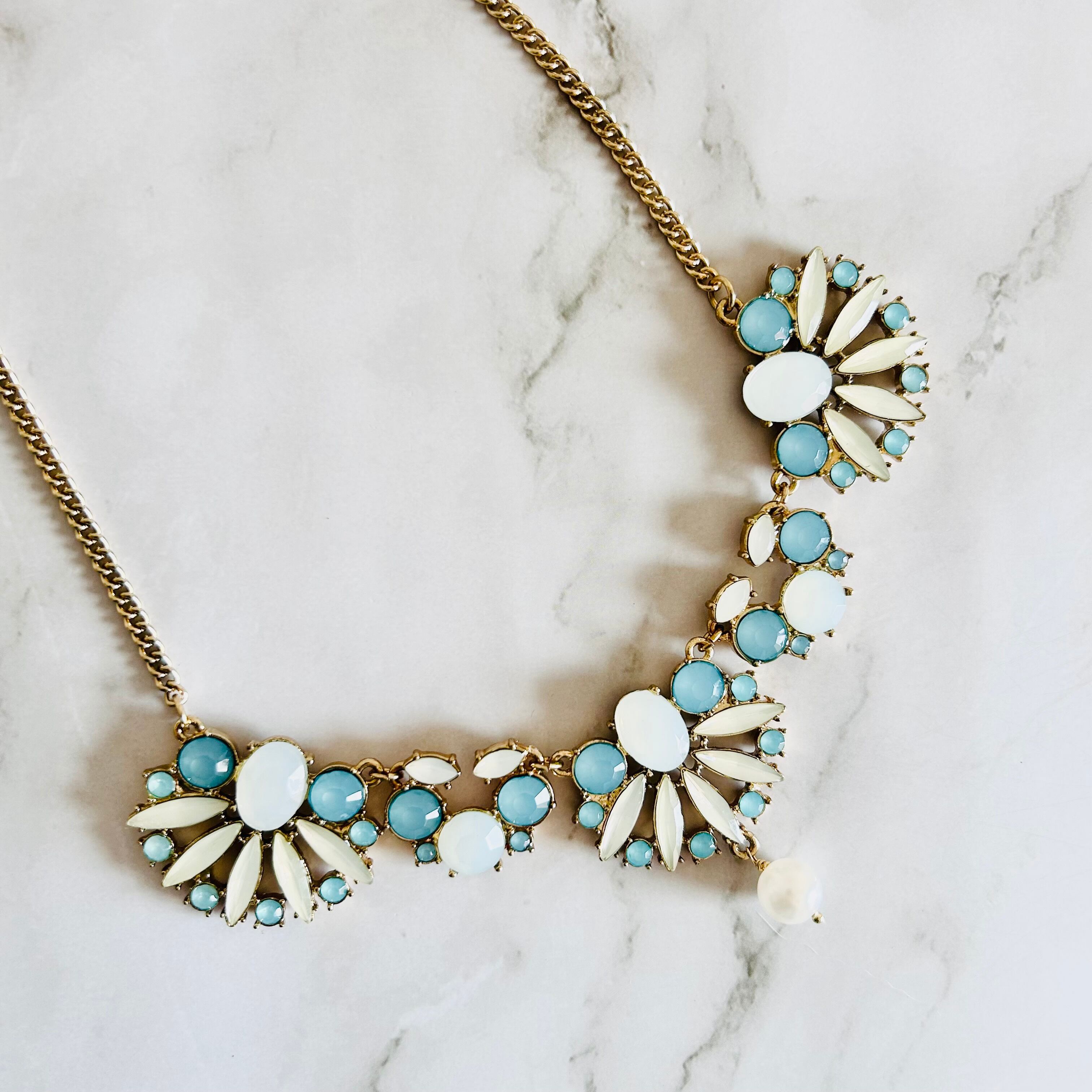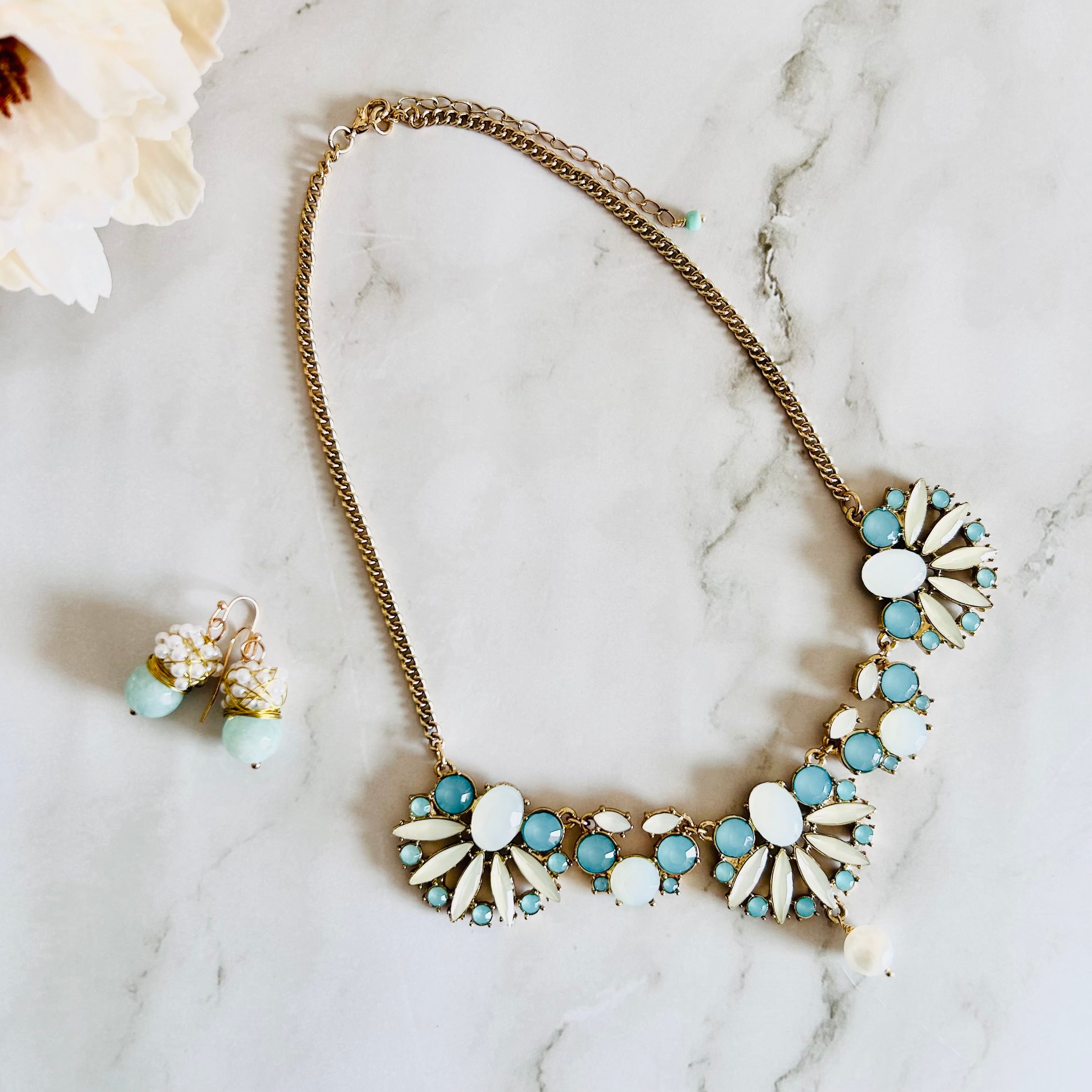 ミルキートーンの淡いブルーのビジューを組み合わせ、花びらが開いたようなデザインが胸元を彩るネックレスです。