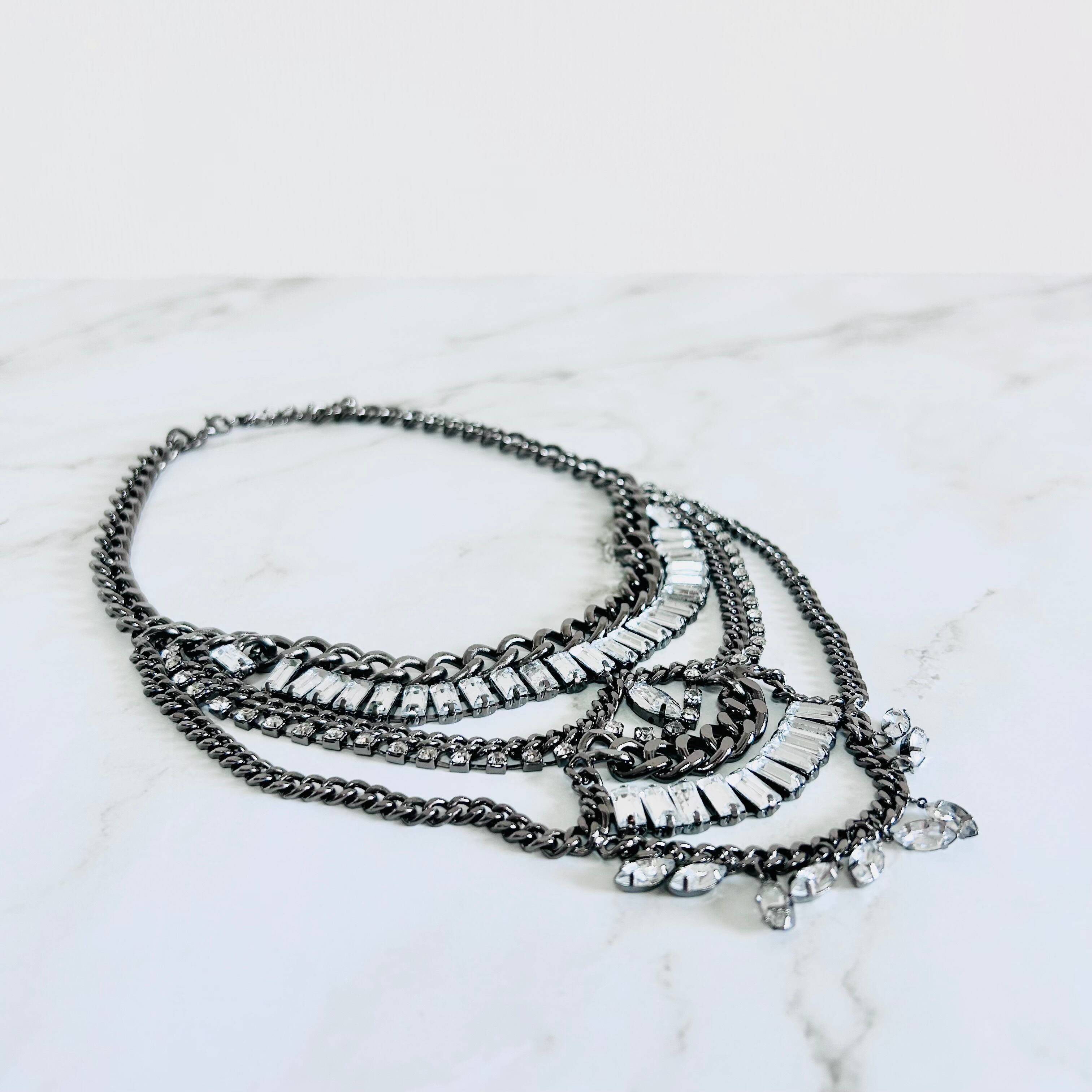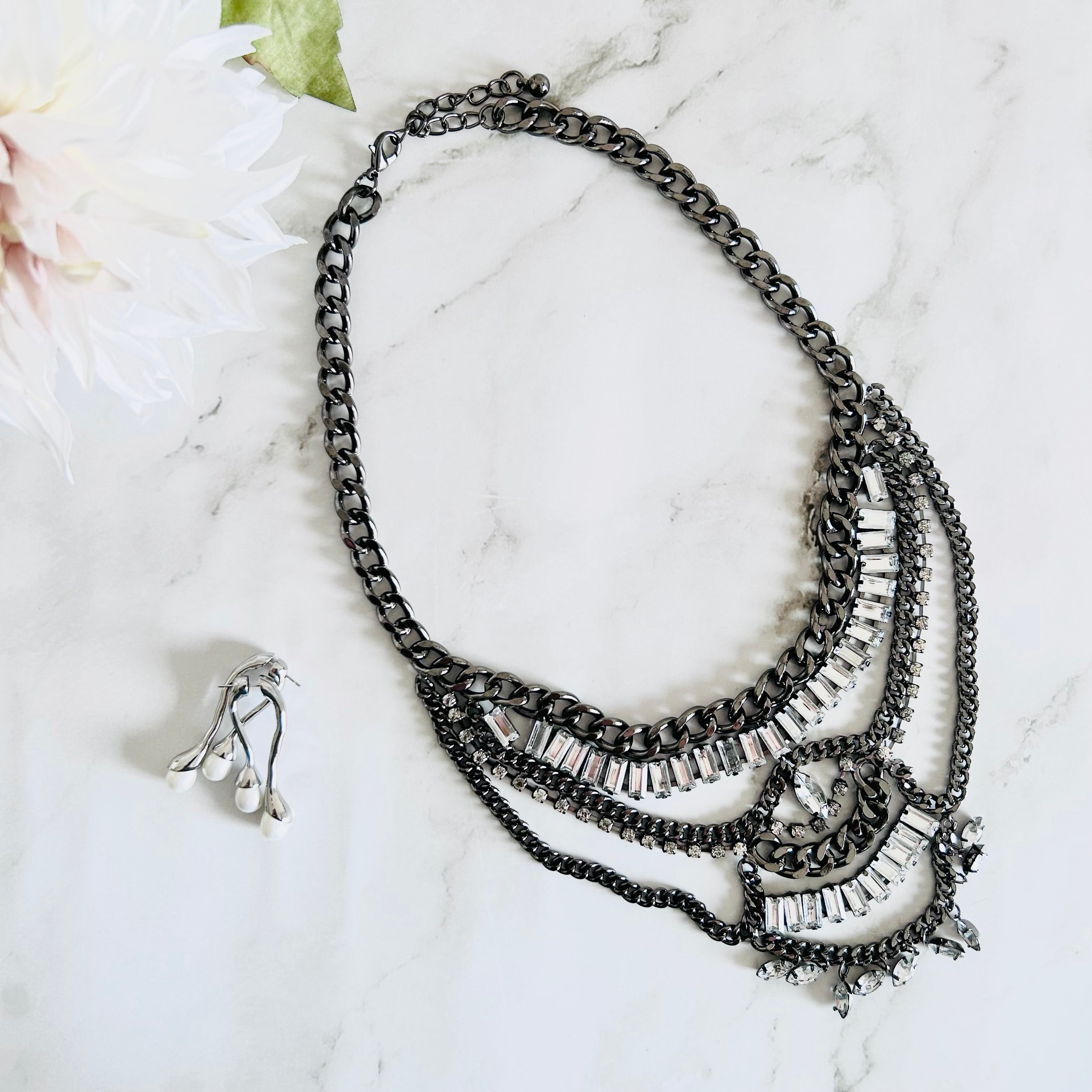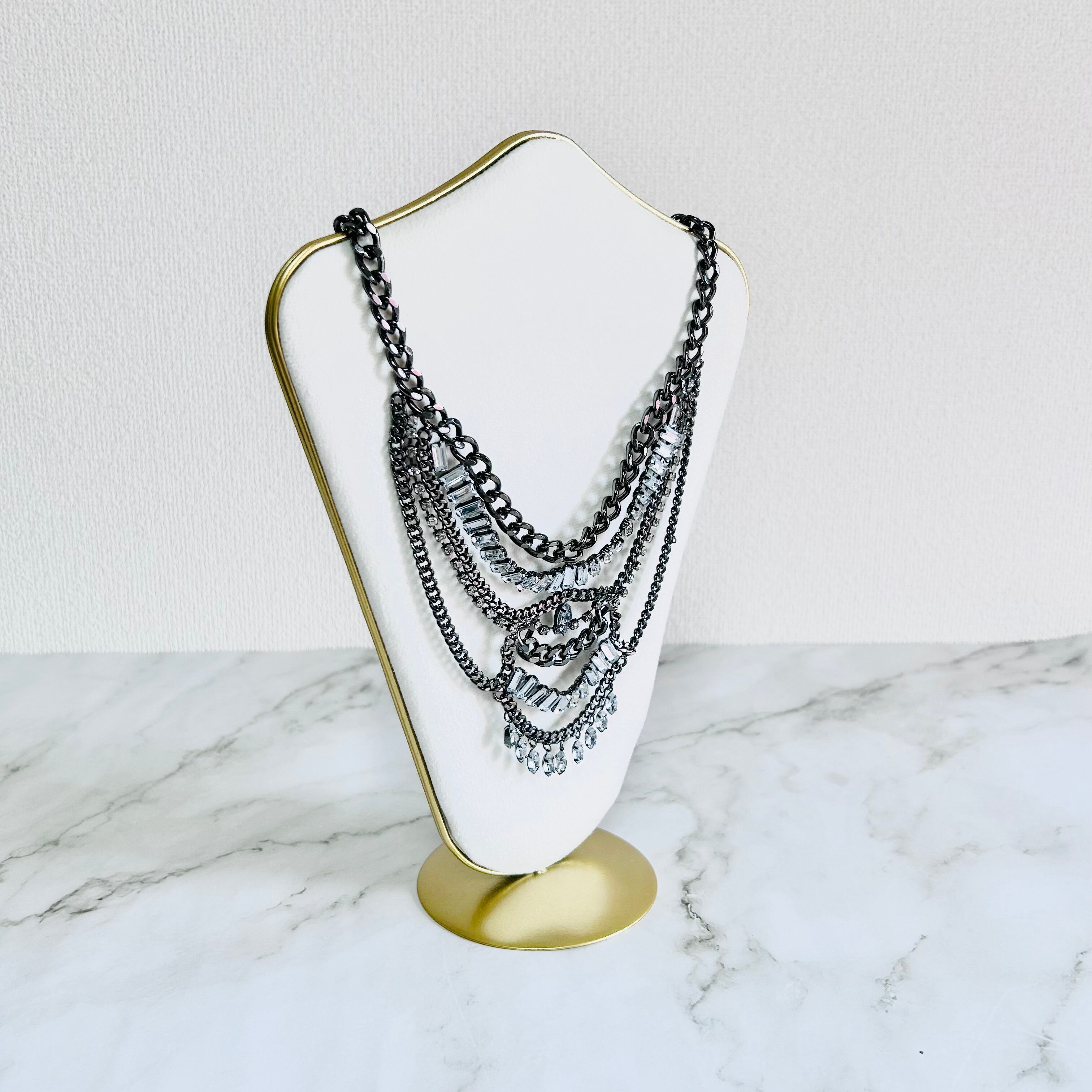 重厚感のあるブラックチェーンに、美しいカットのクリアビジューパーツを贅沢にあしらったネックレスです。