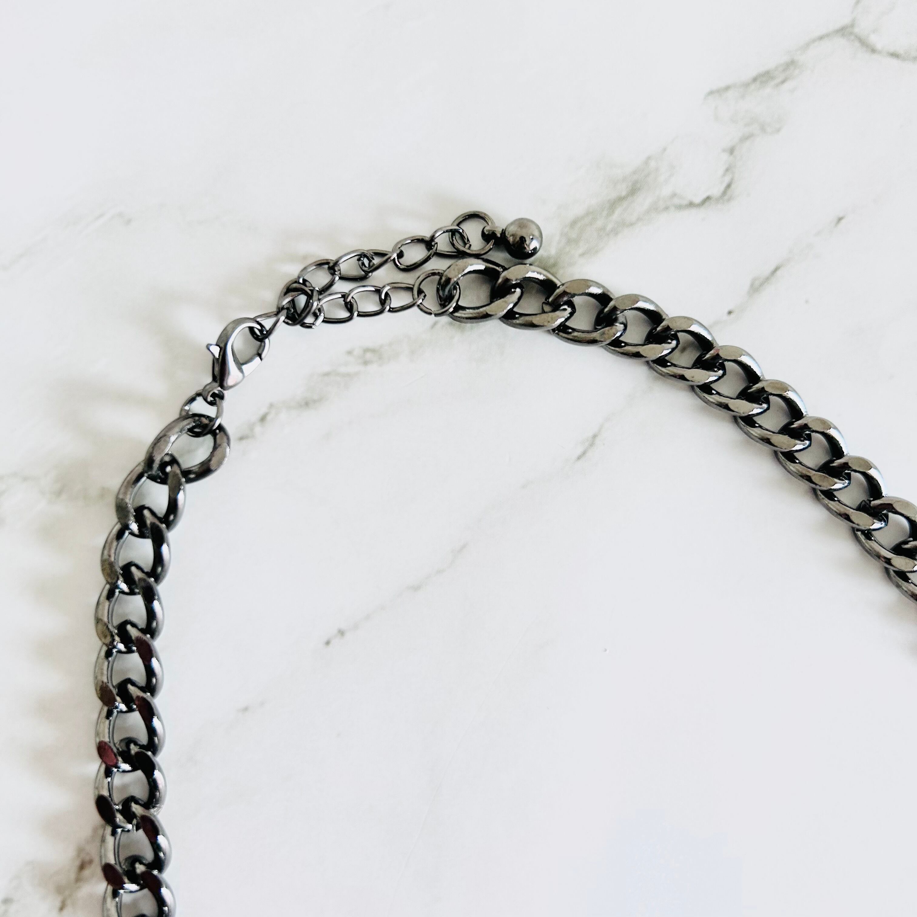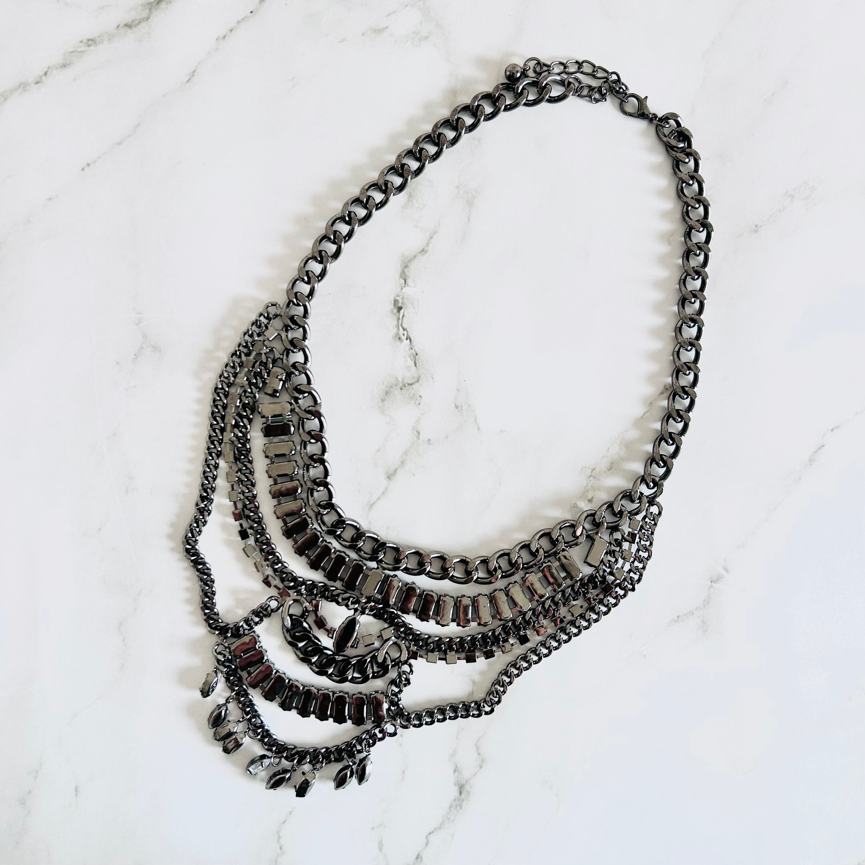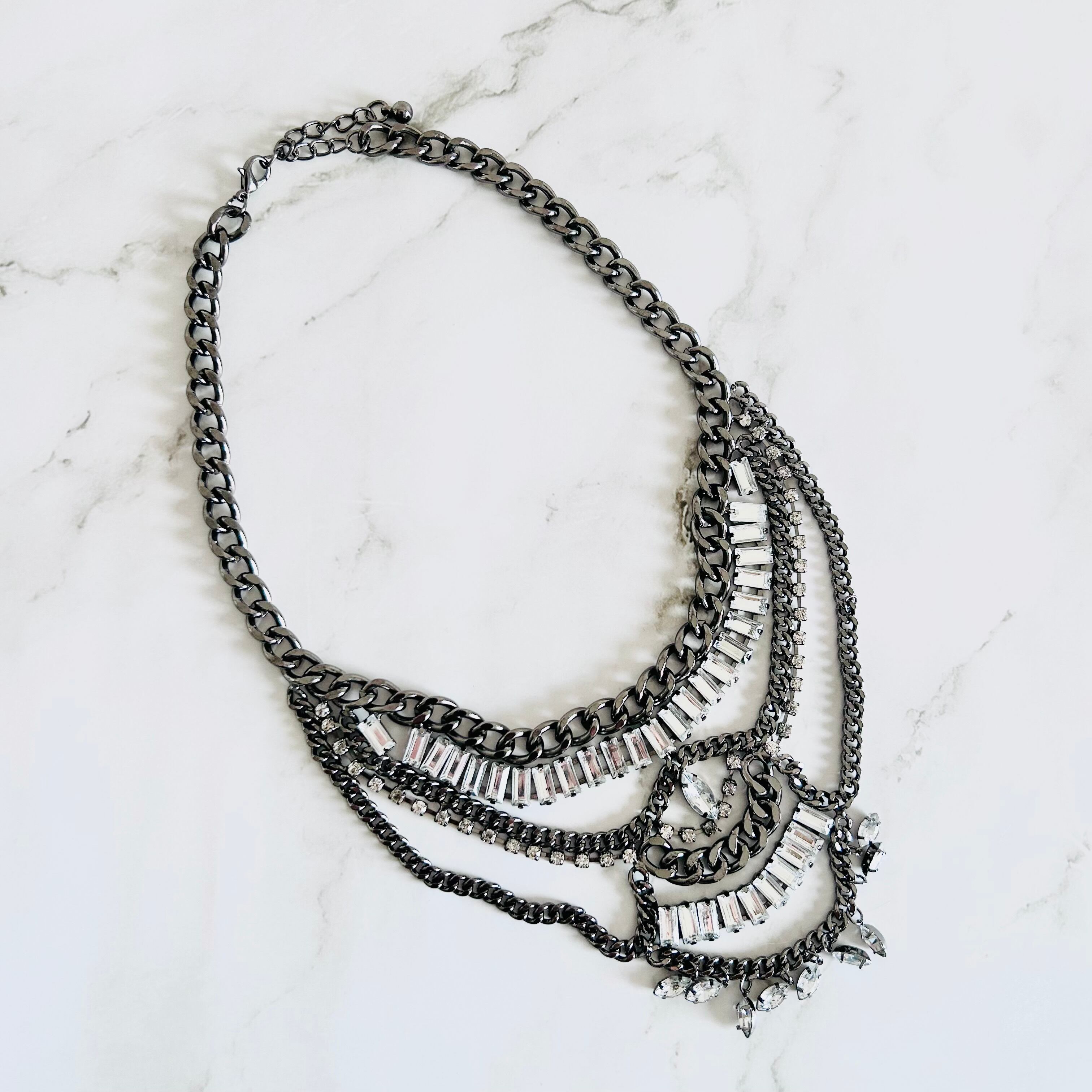 重厚感のあるブラックチェーンに、美しいカットのクリアビジューパーツを贅沢にあしらったネックレスです。