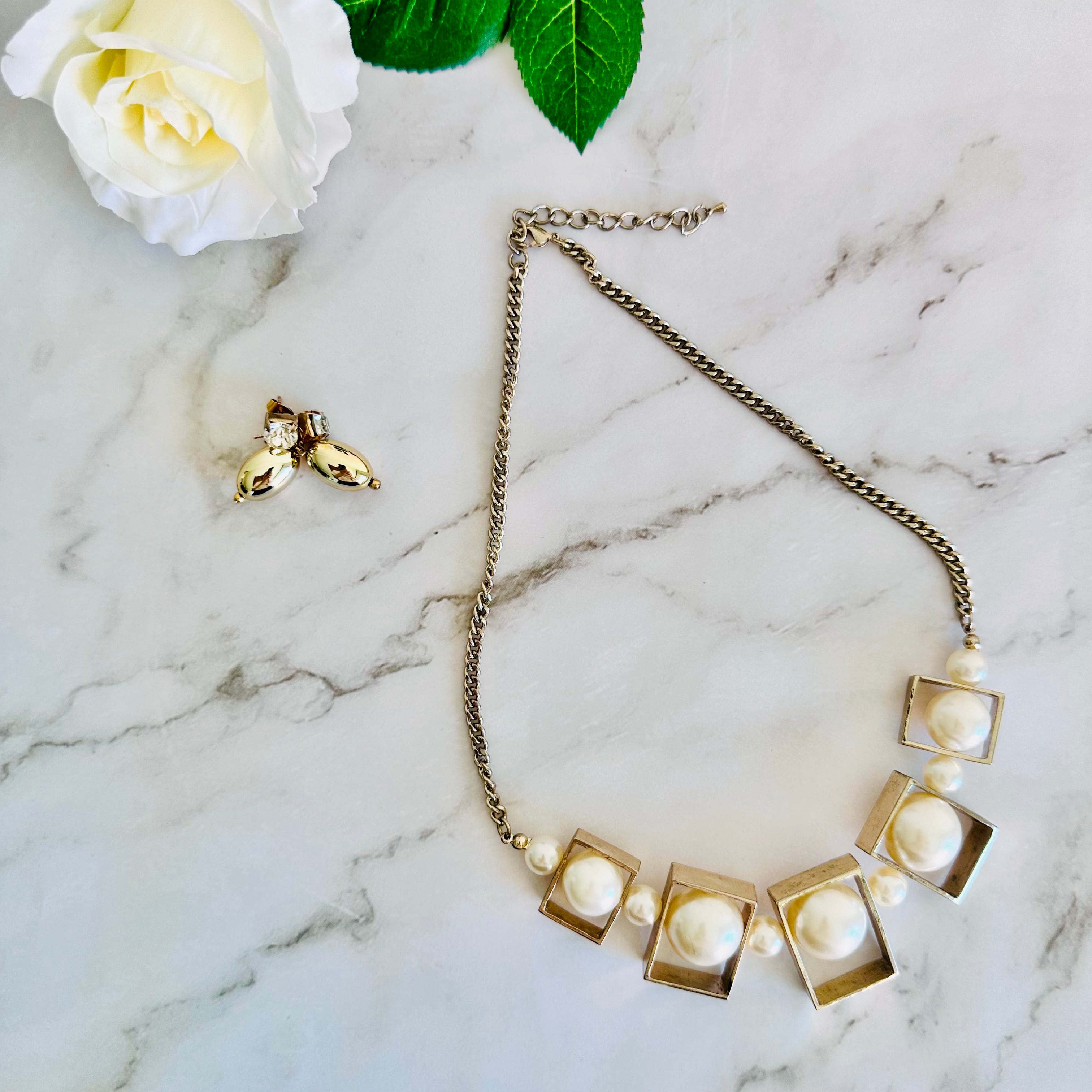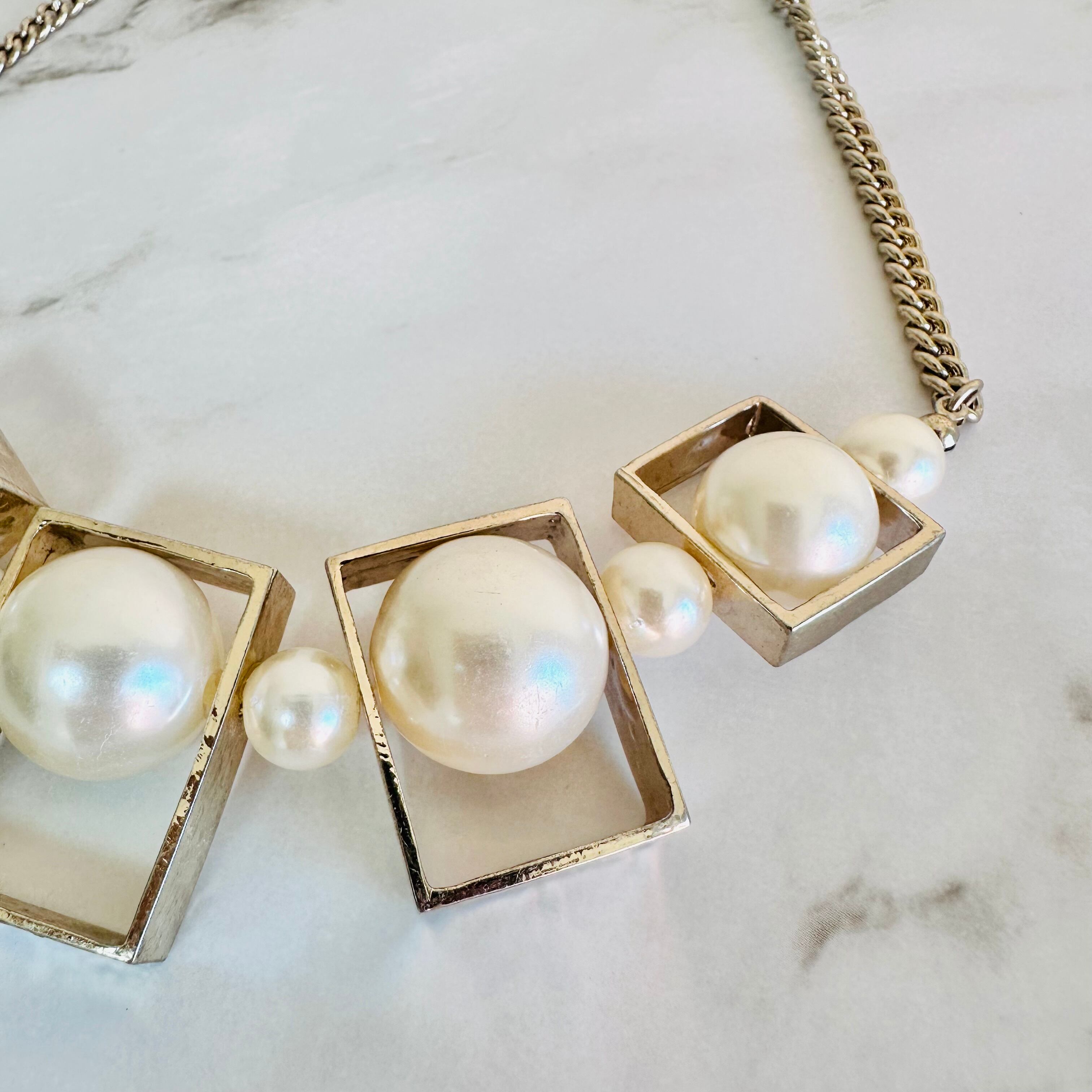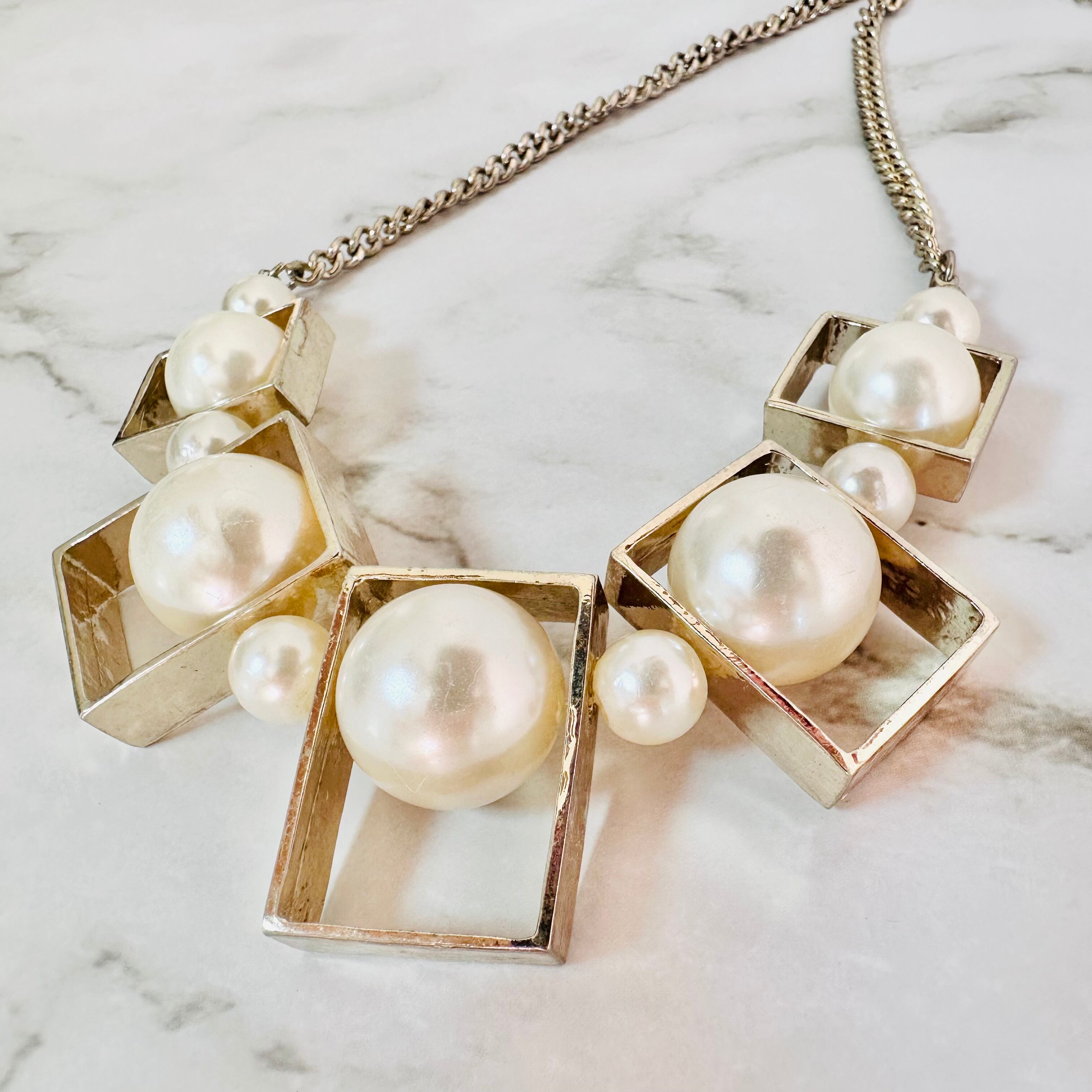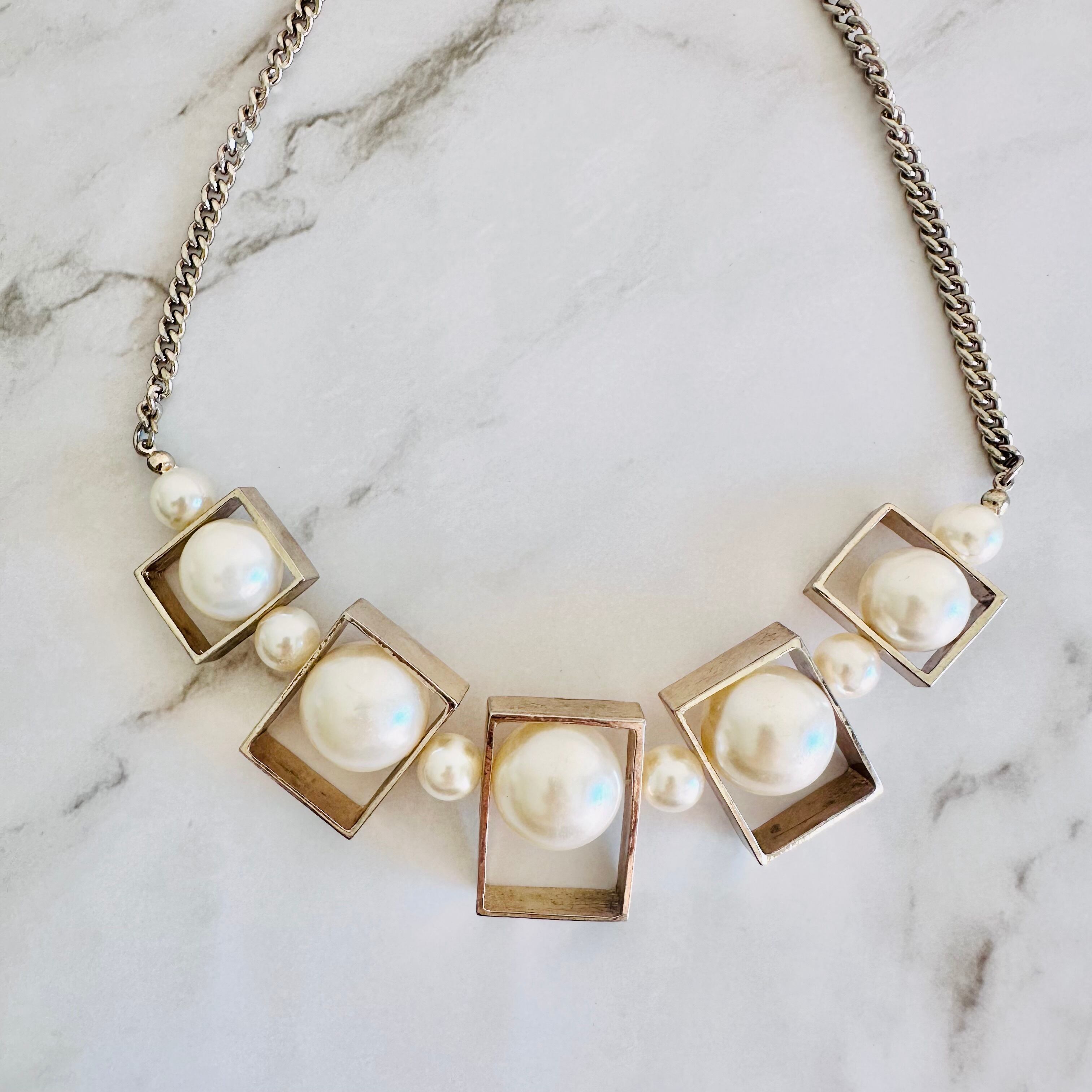 メタリックなフレームに大小のパールをあしらった、モダンなデザインのネックレスです。