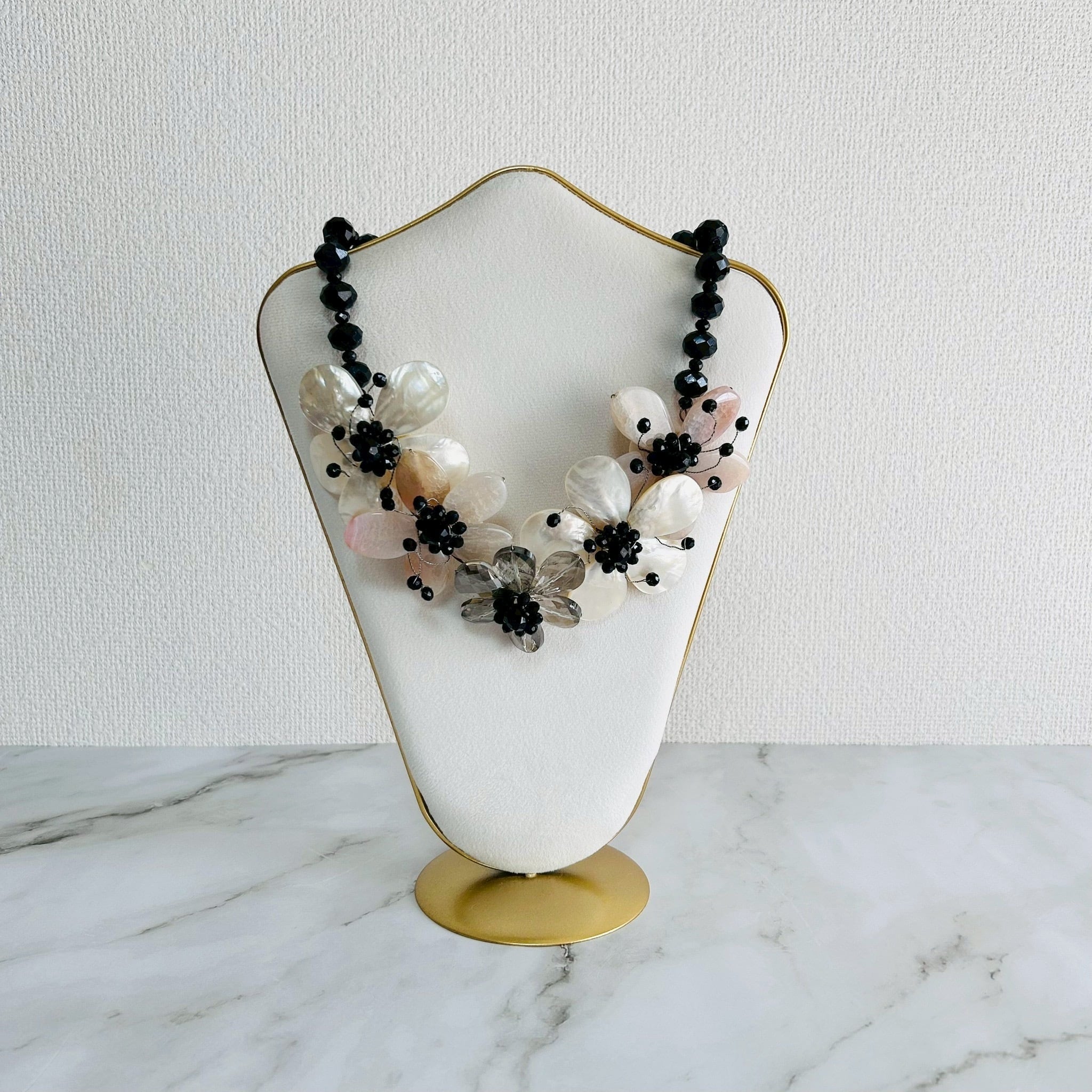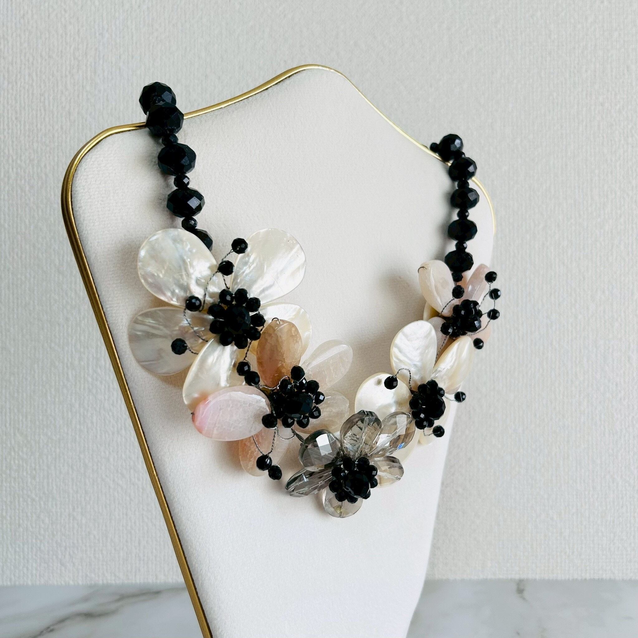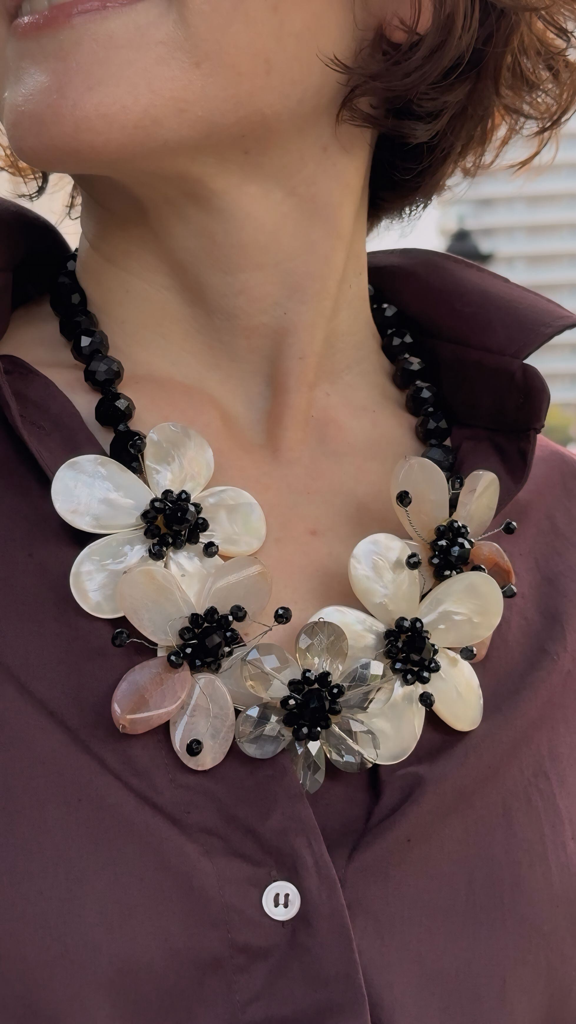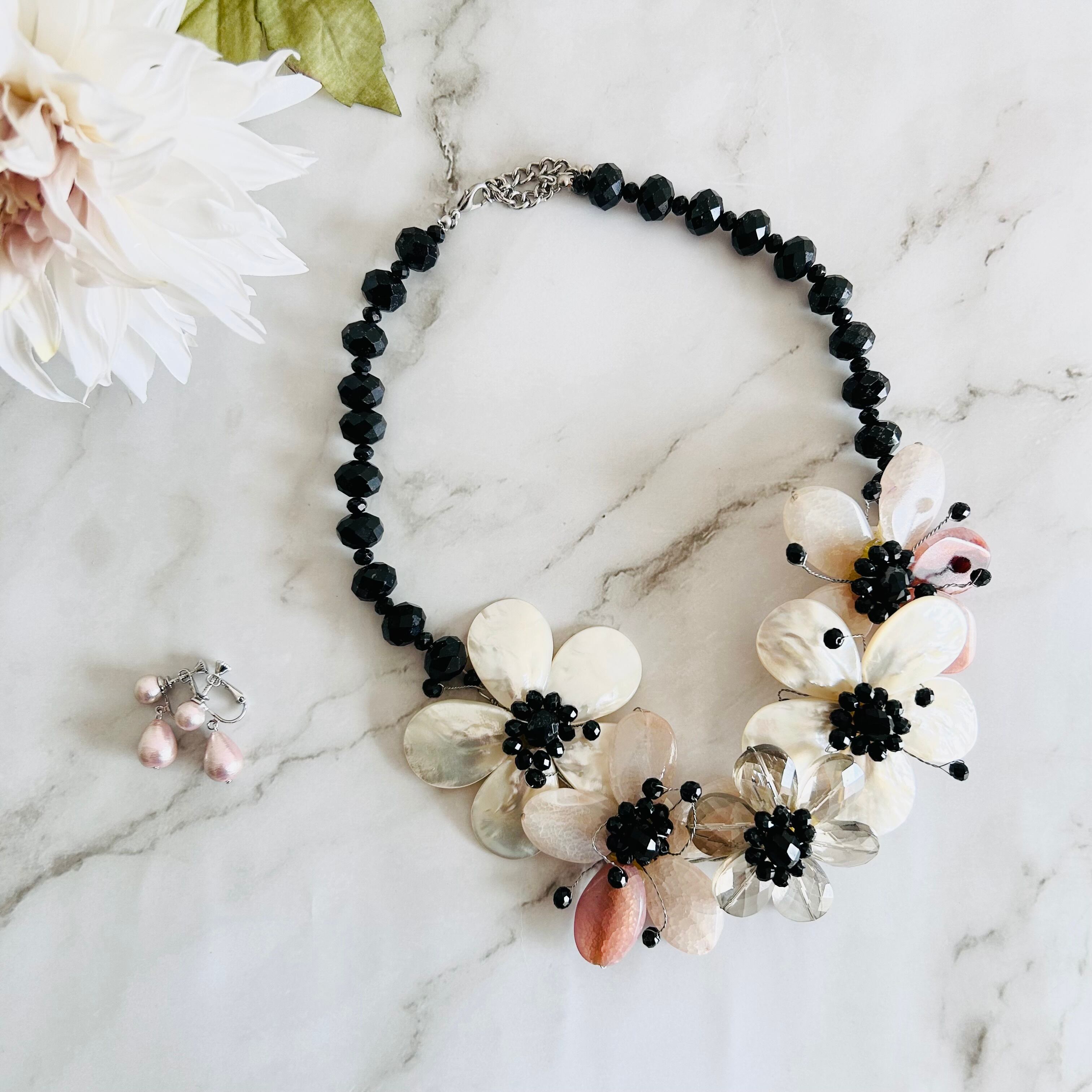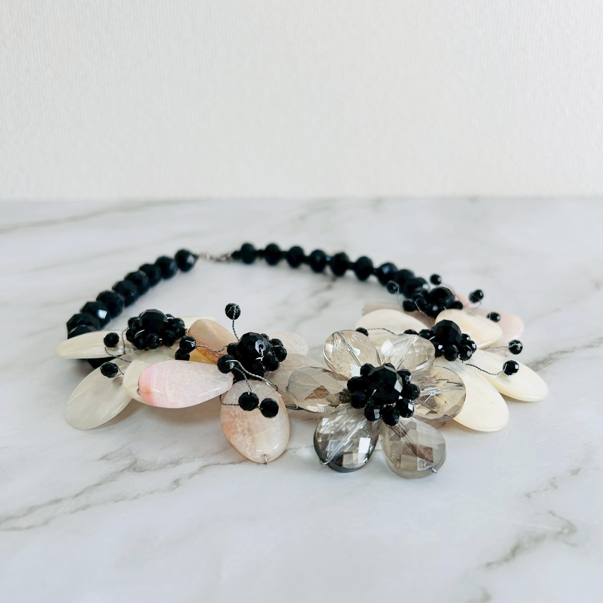 艶やかなシェルと天然石を花びらに仕立て、中心にはクリスタルのブラックビーズを組み合わせた華やかなネックレスです。