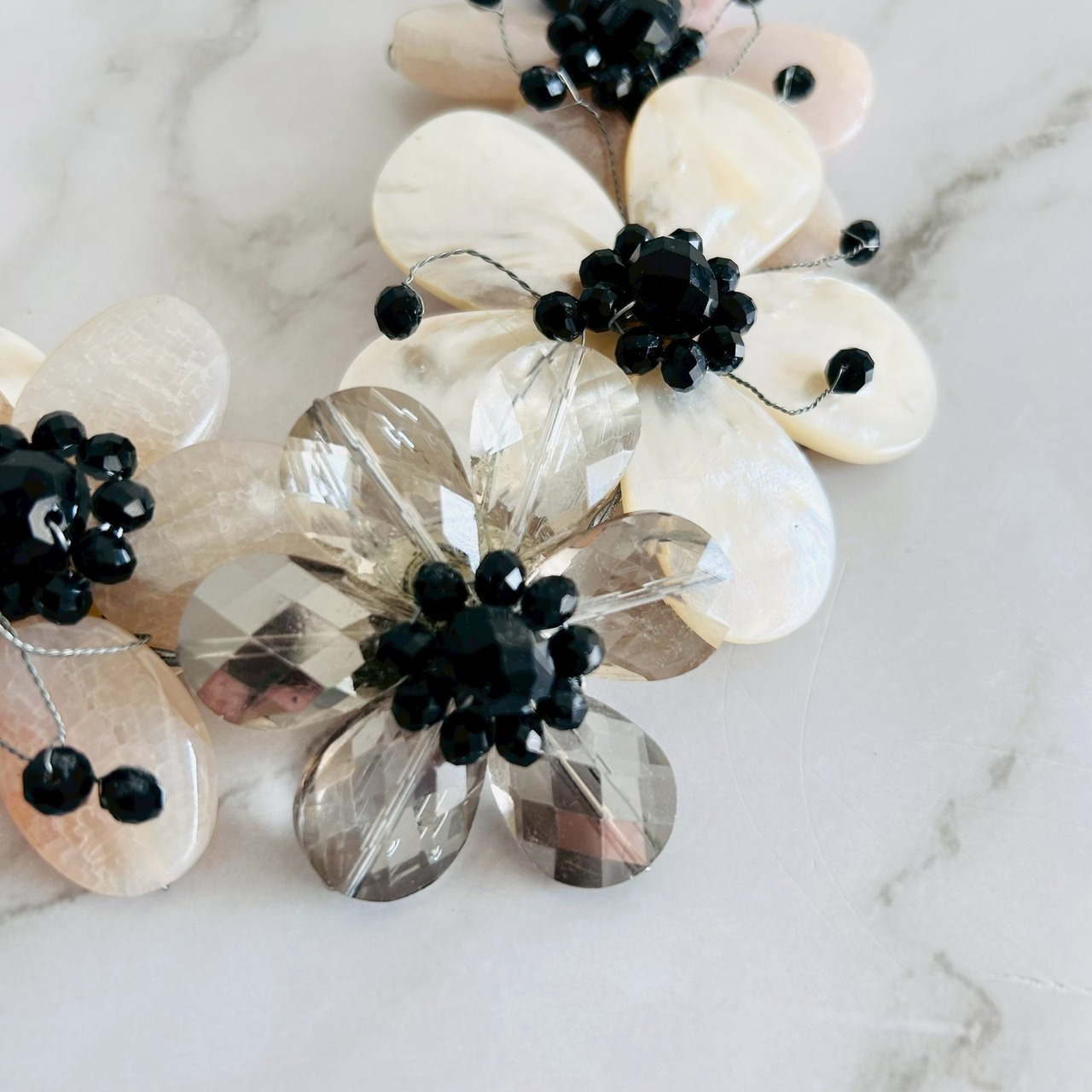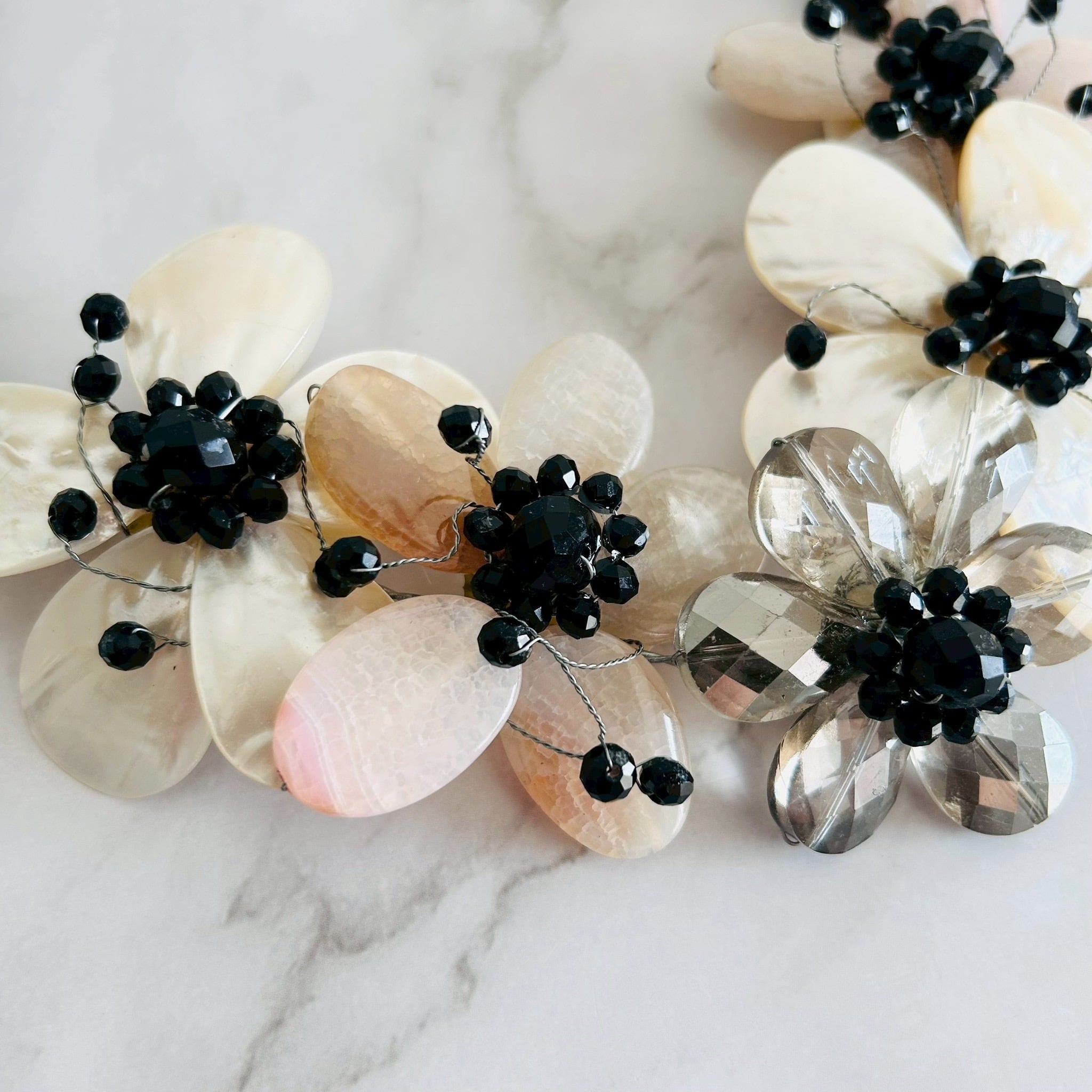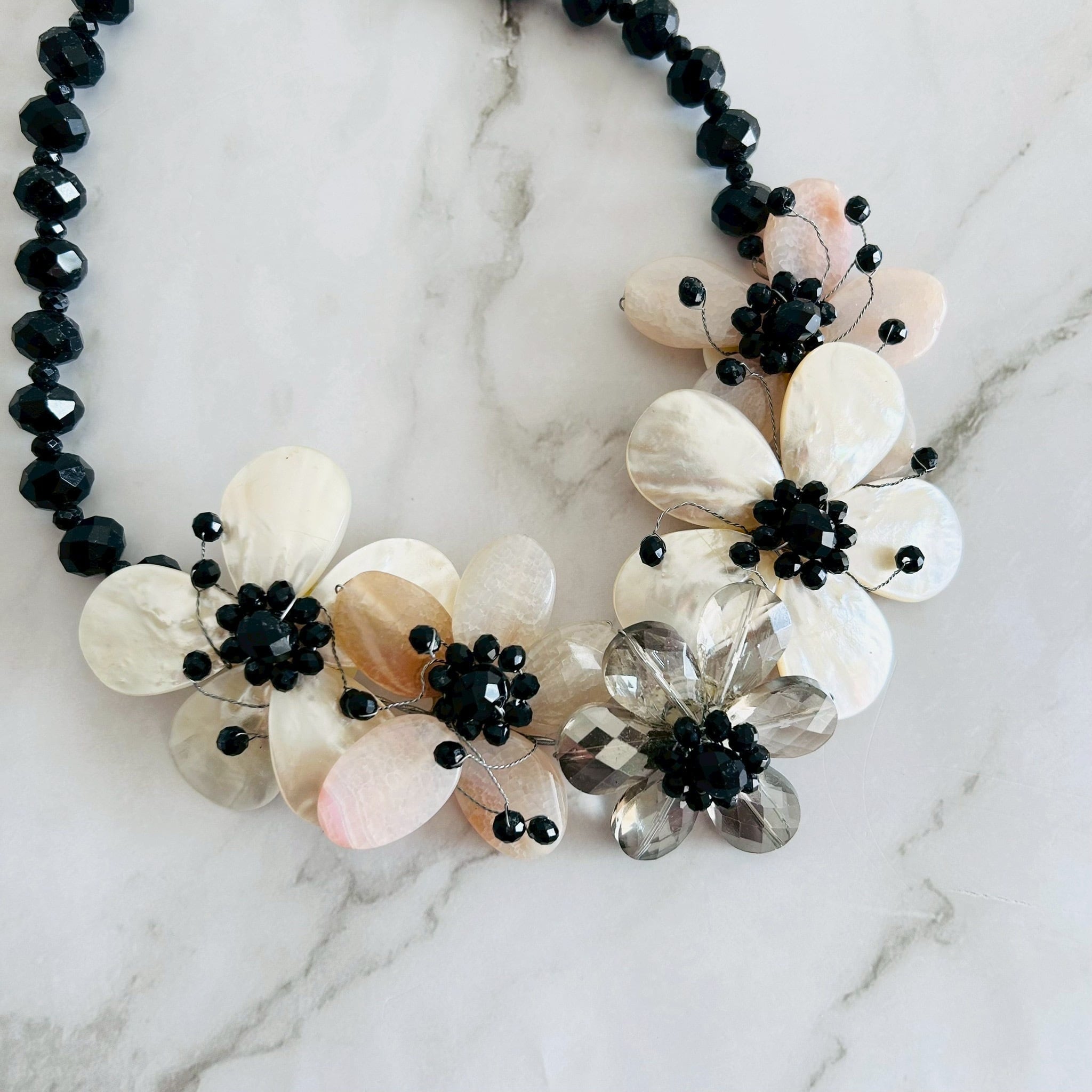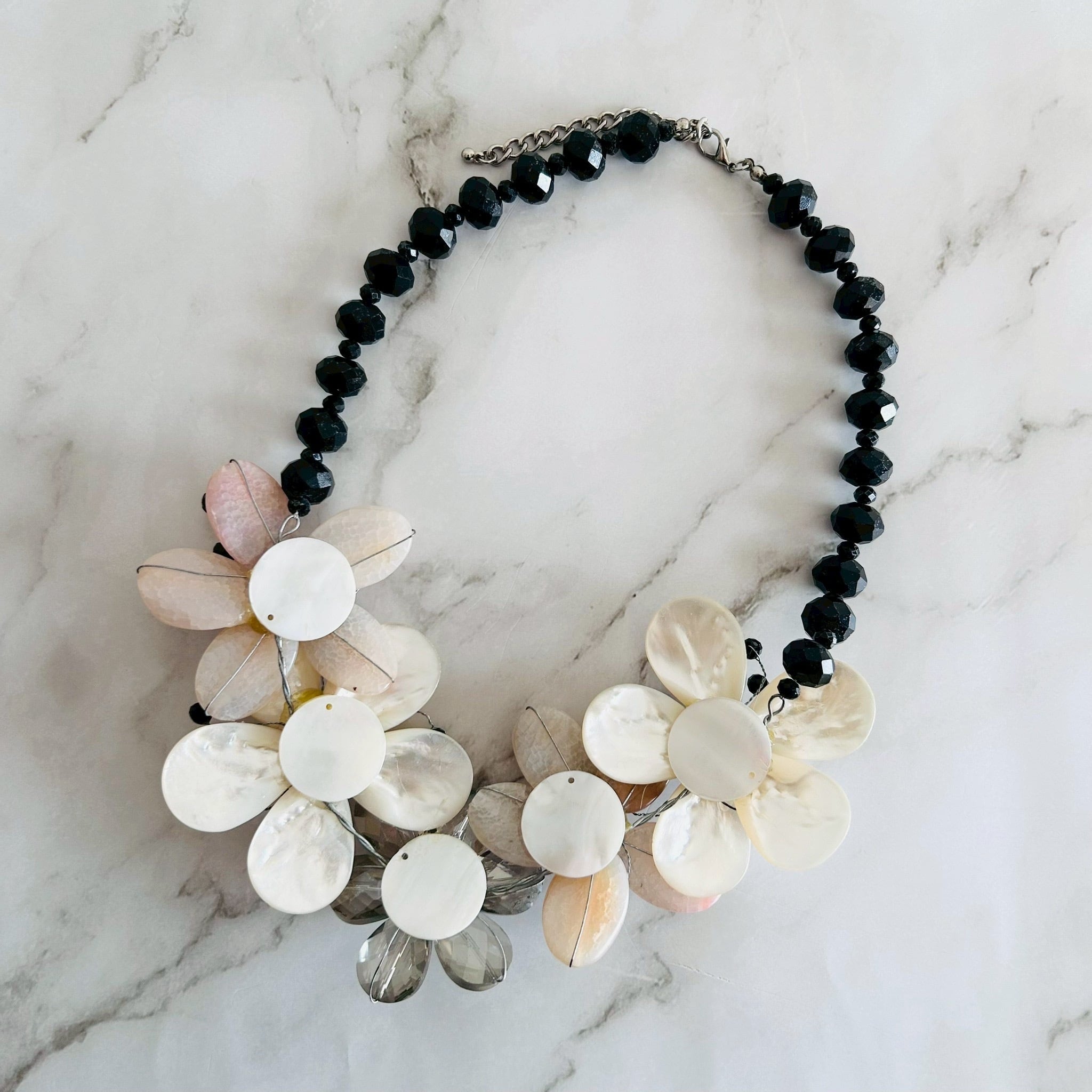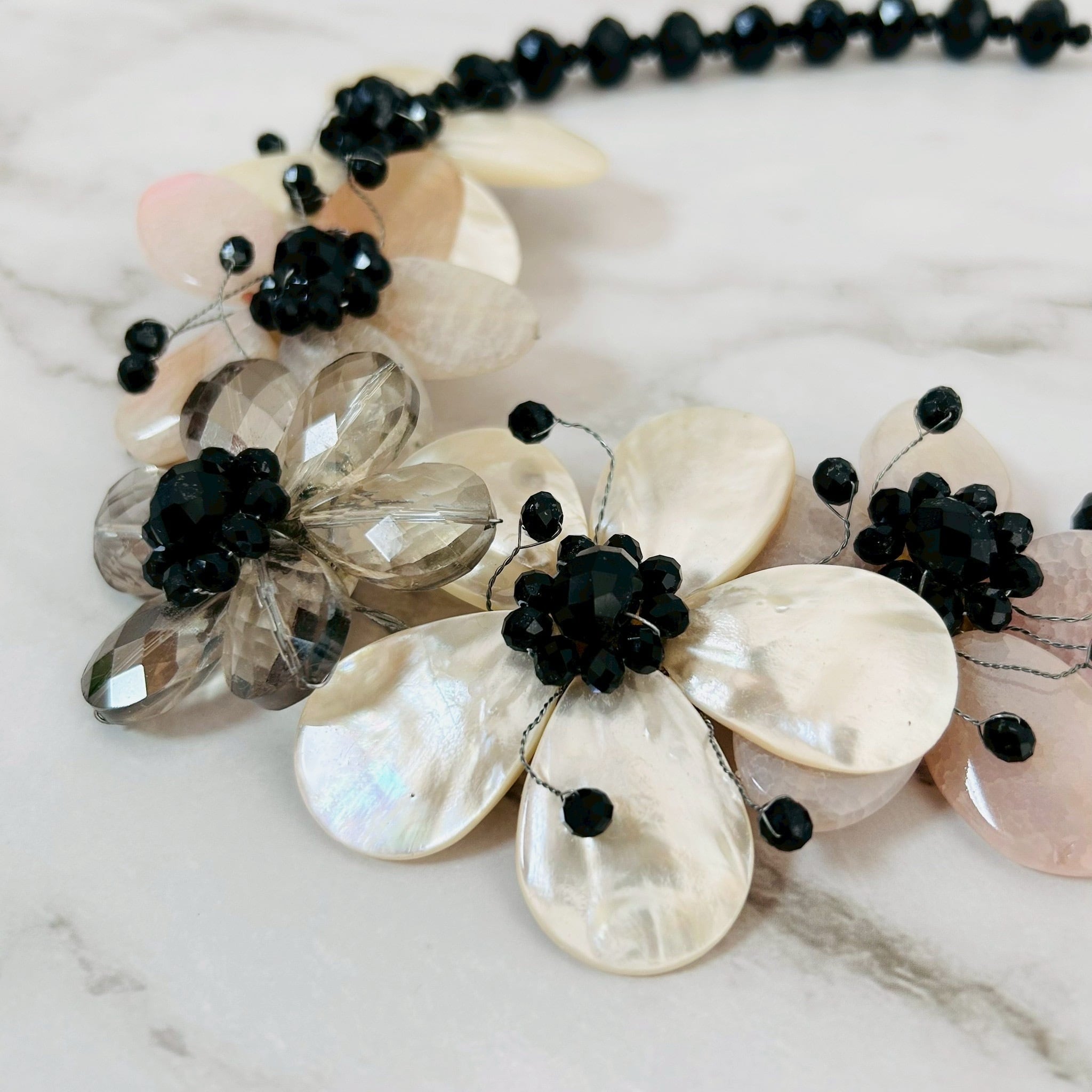 艶やかなシェルと天然石を花びらに仕立て、中心にはクリスタルのブラックビーズを組み合わせた華やかなネックレスです。
