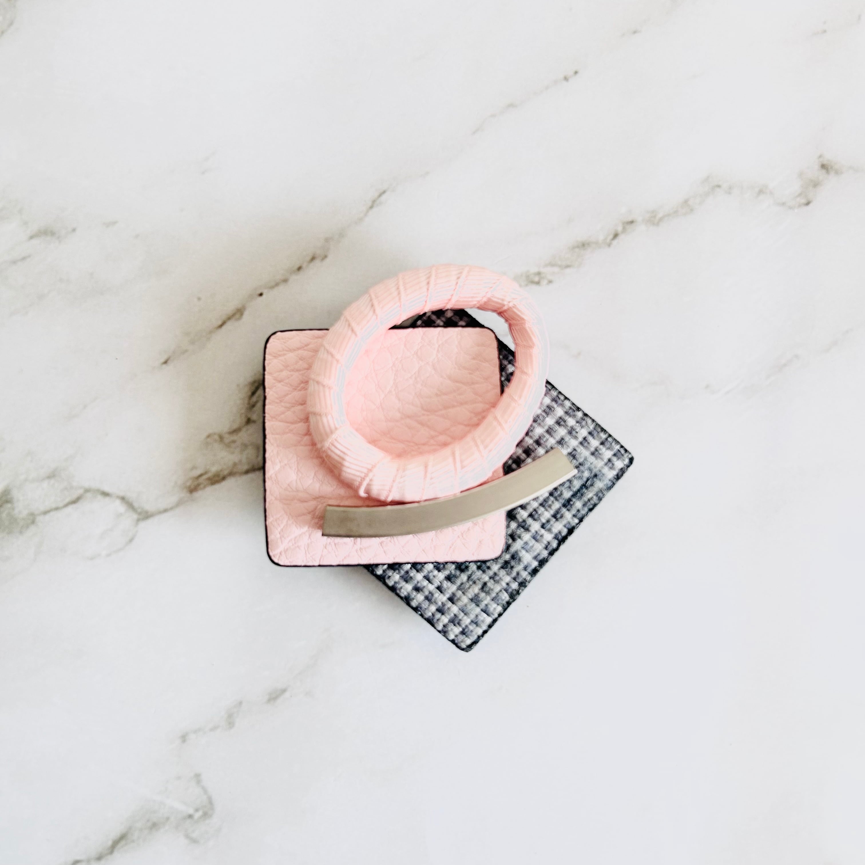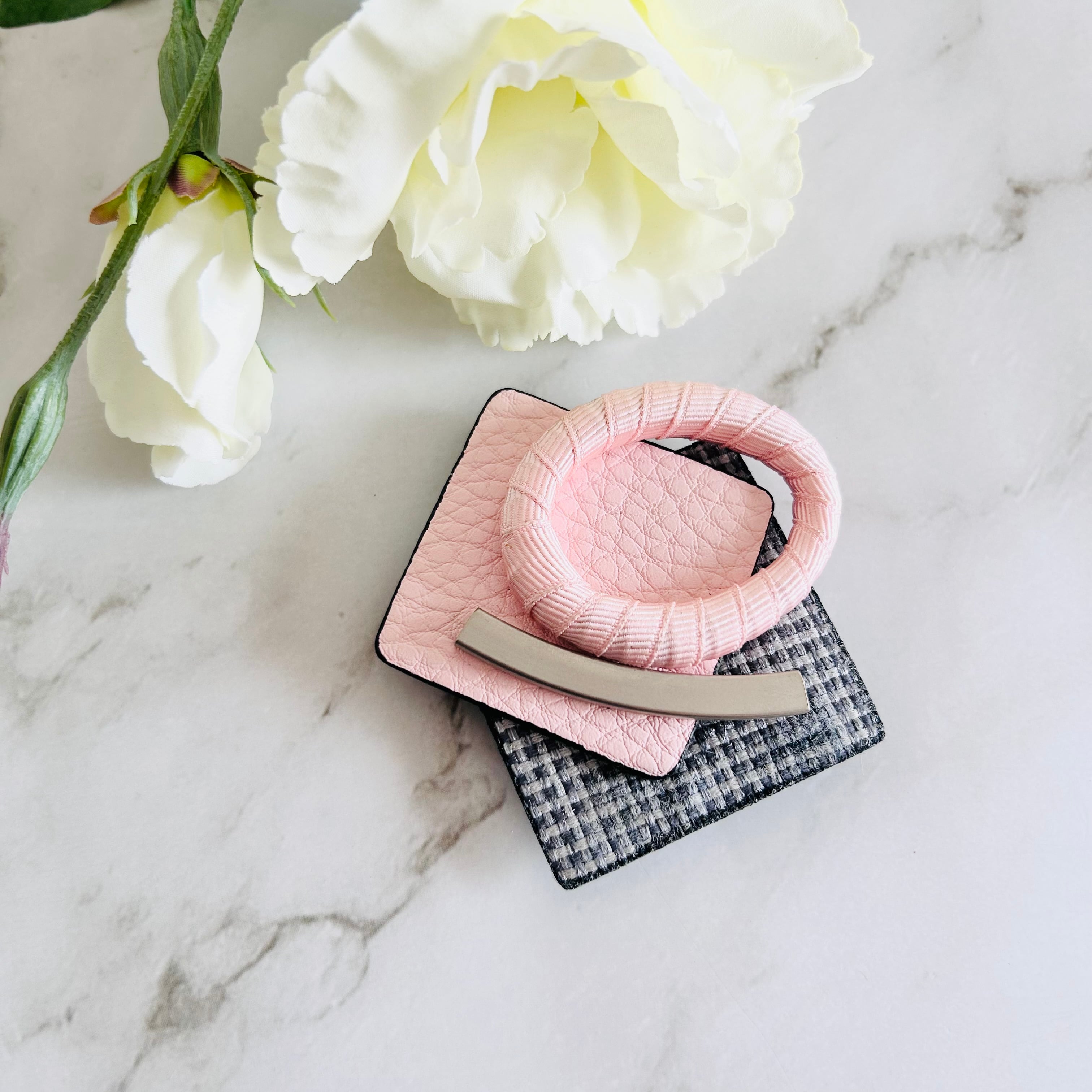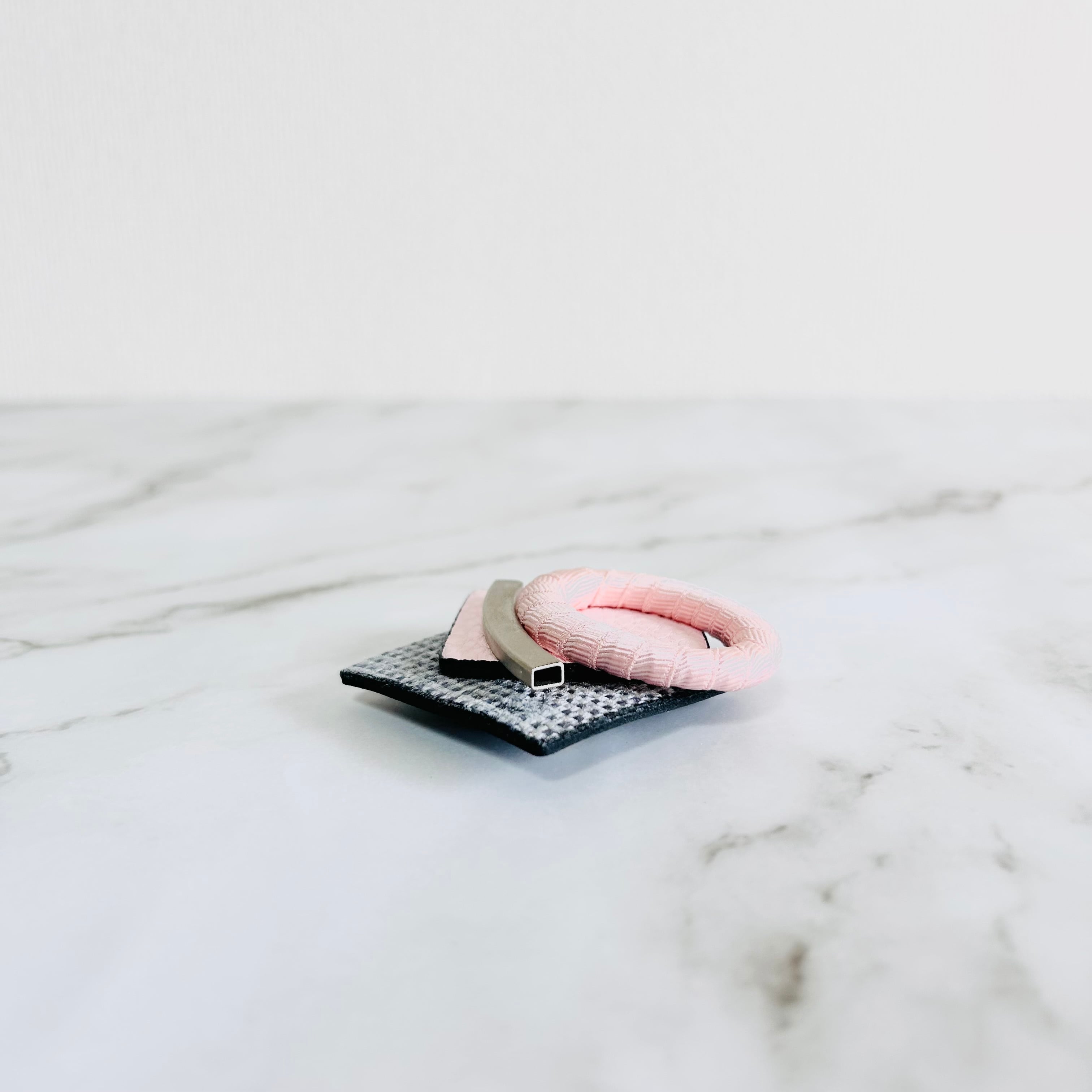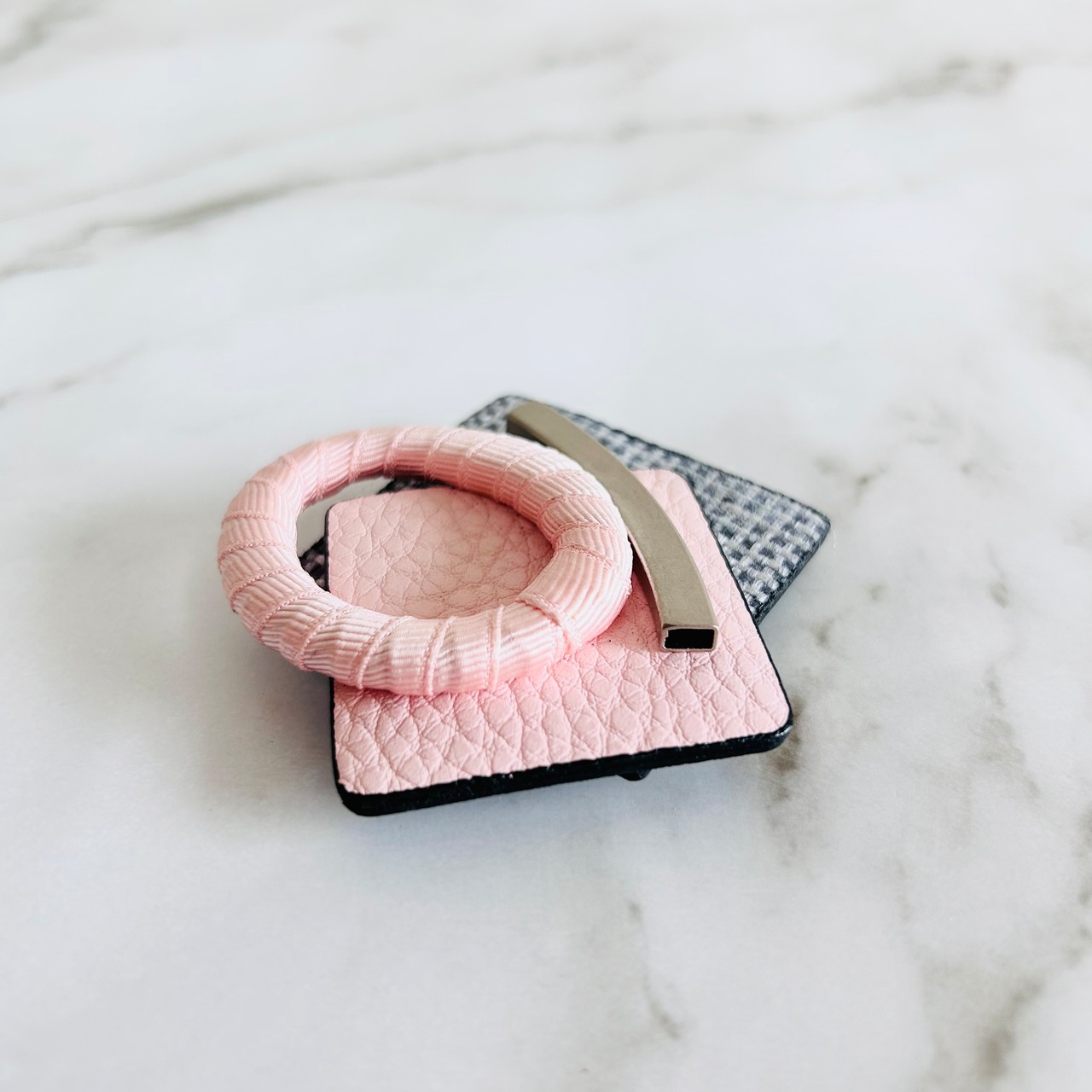 ピンクのサークルモチーフとレザー調のスクエア、そしてチェック柄の布を組み合わせた、ユニークで遊び心のあるブローチです。