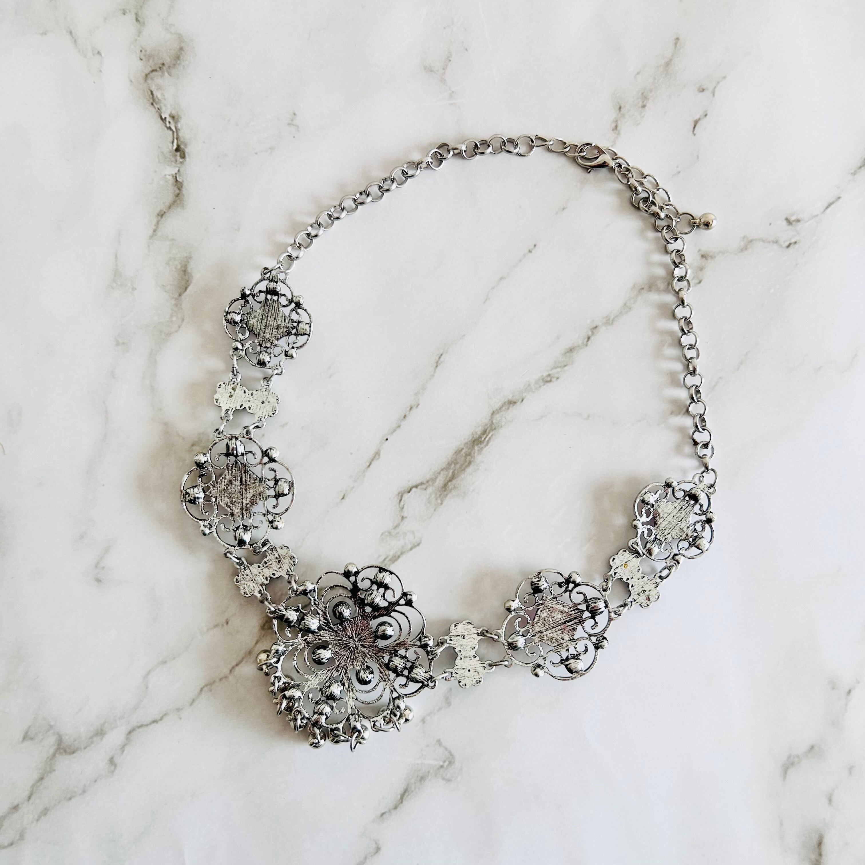 アンティーク調のデザインが女性らしさを引き立て、胸元に華やかな輝きを添えてくれます。