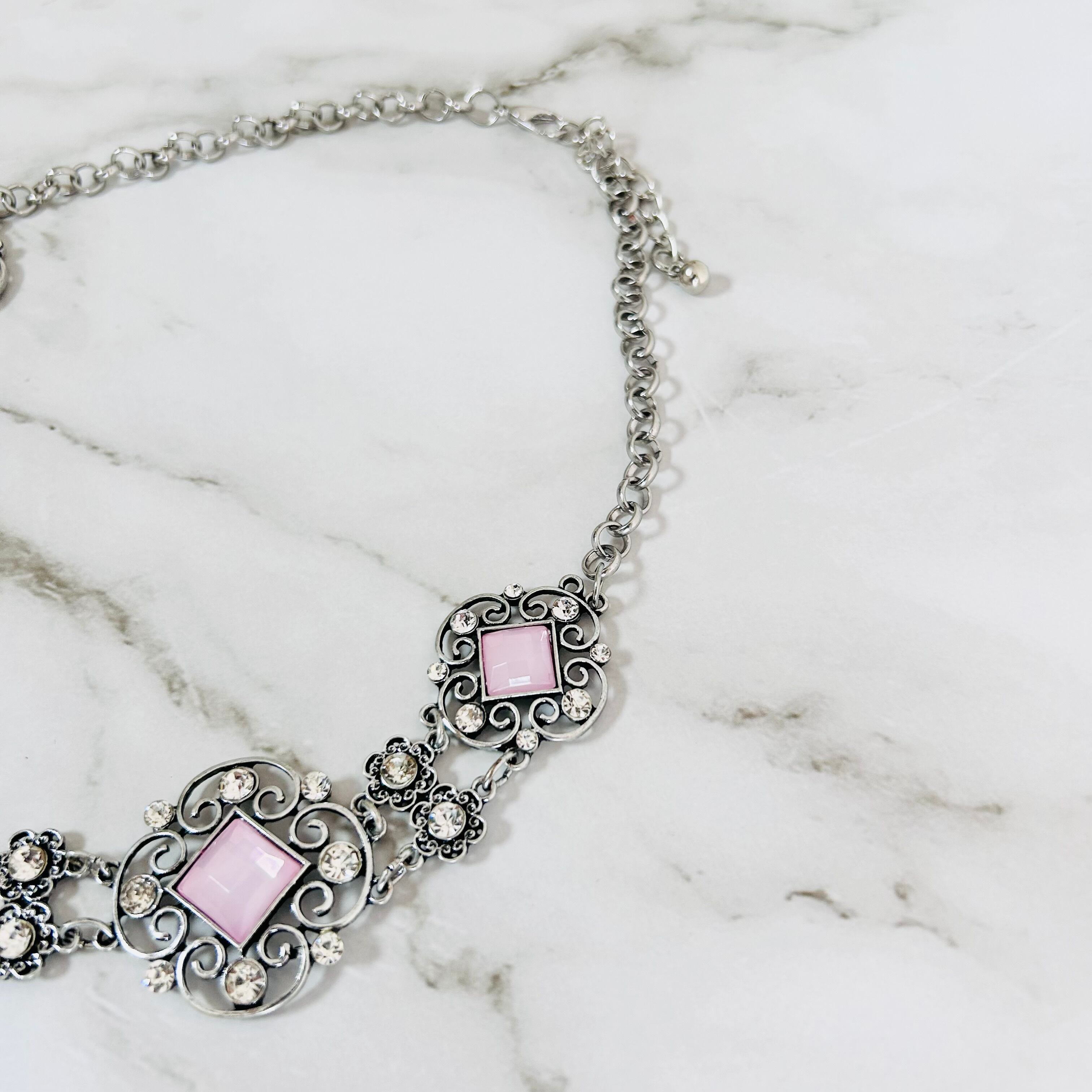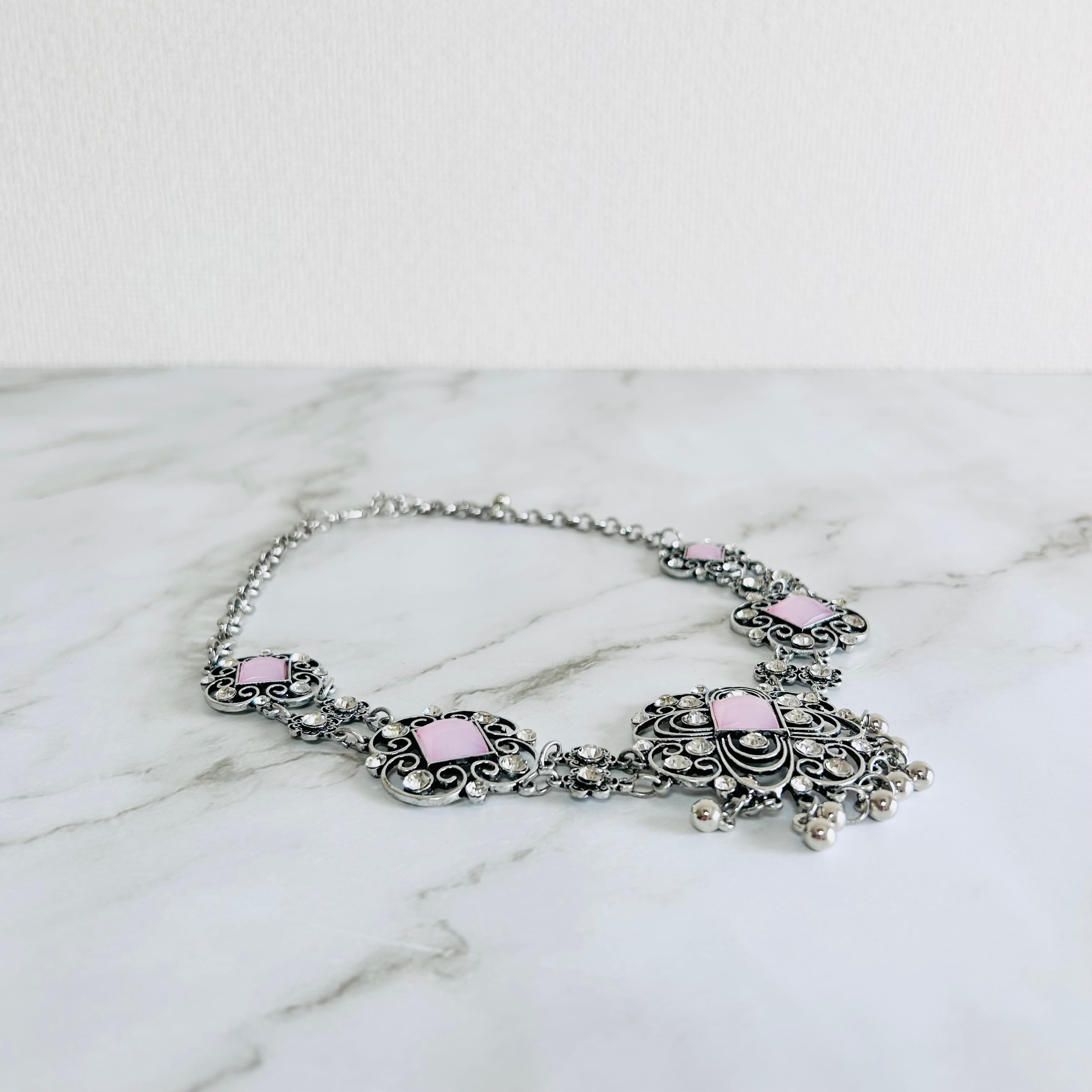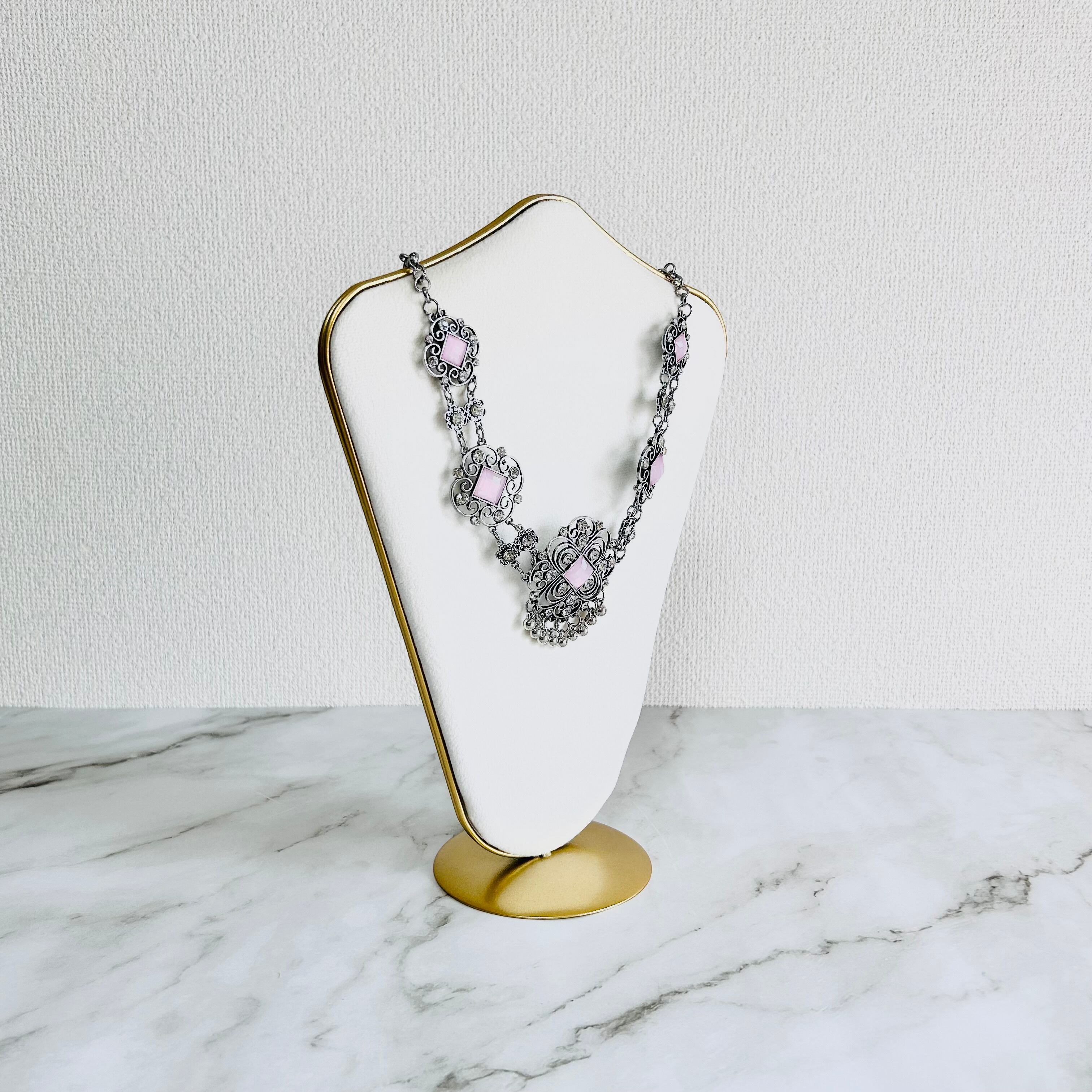ベビーピンクのスクエアのビジューを中心に、繊細な透かし模様とラインストーンを組み合わせた、クラシカルな雰囲気のネックレスです。