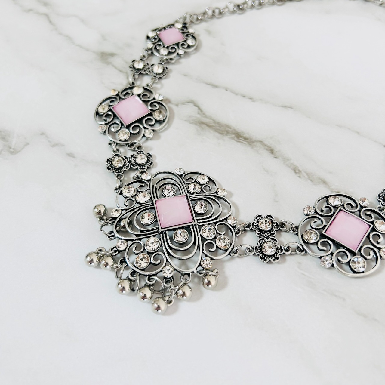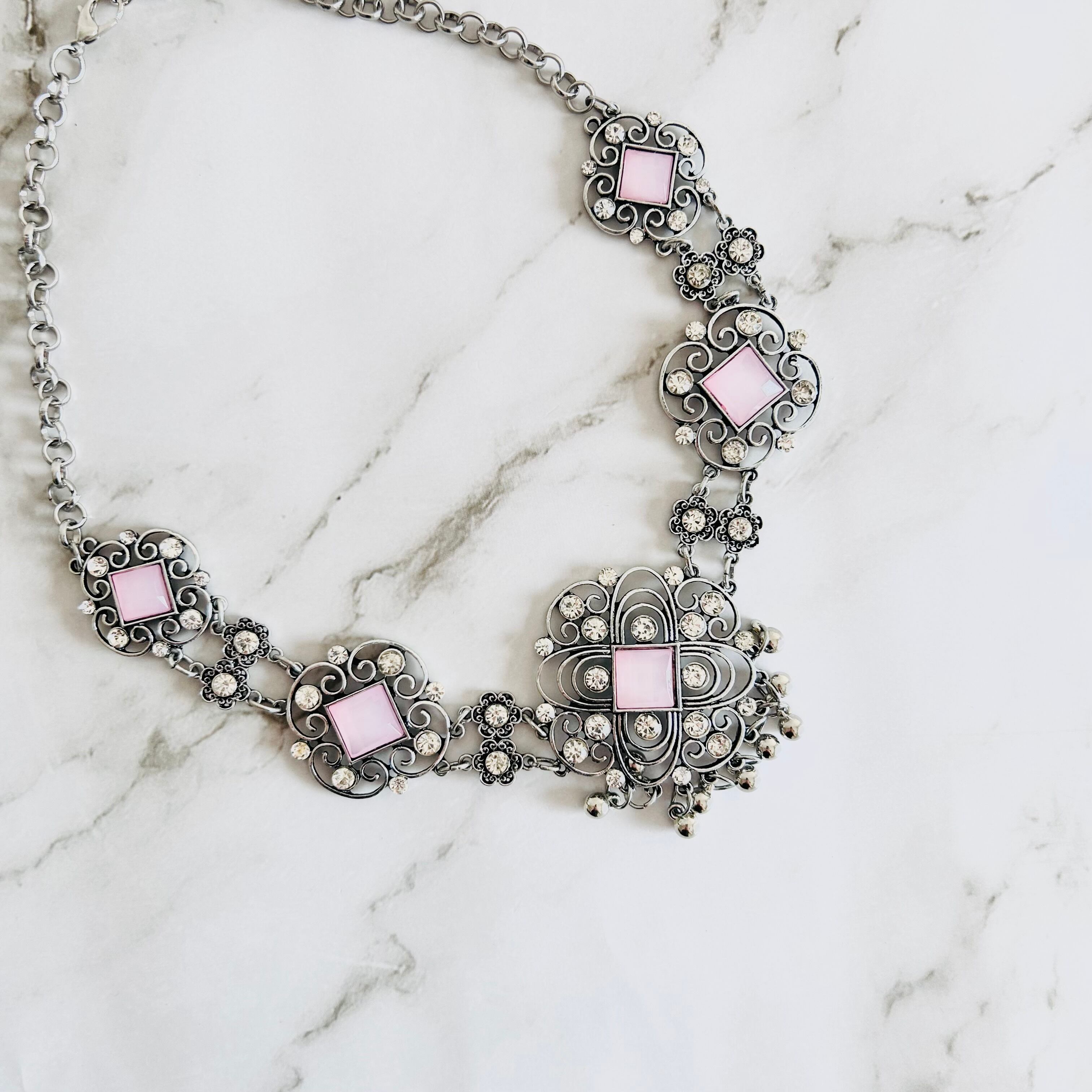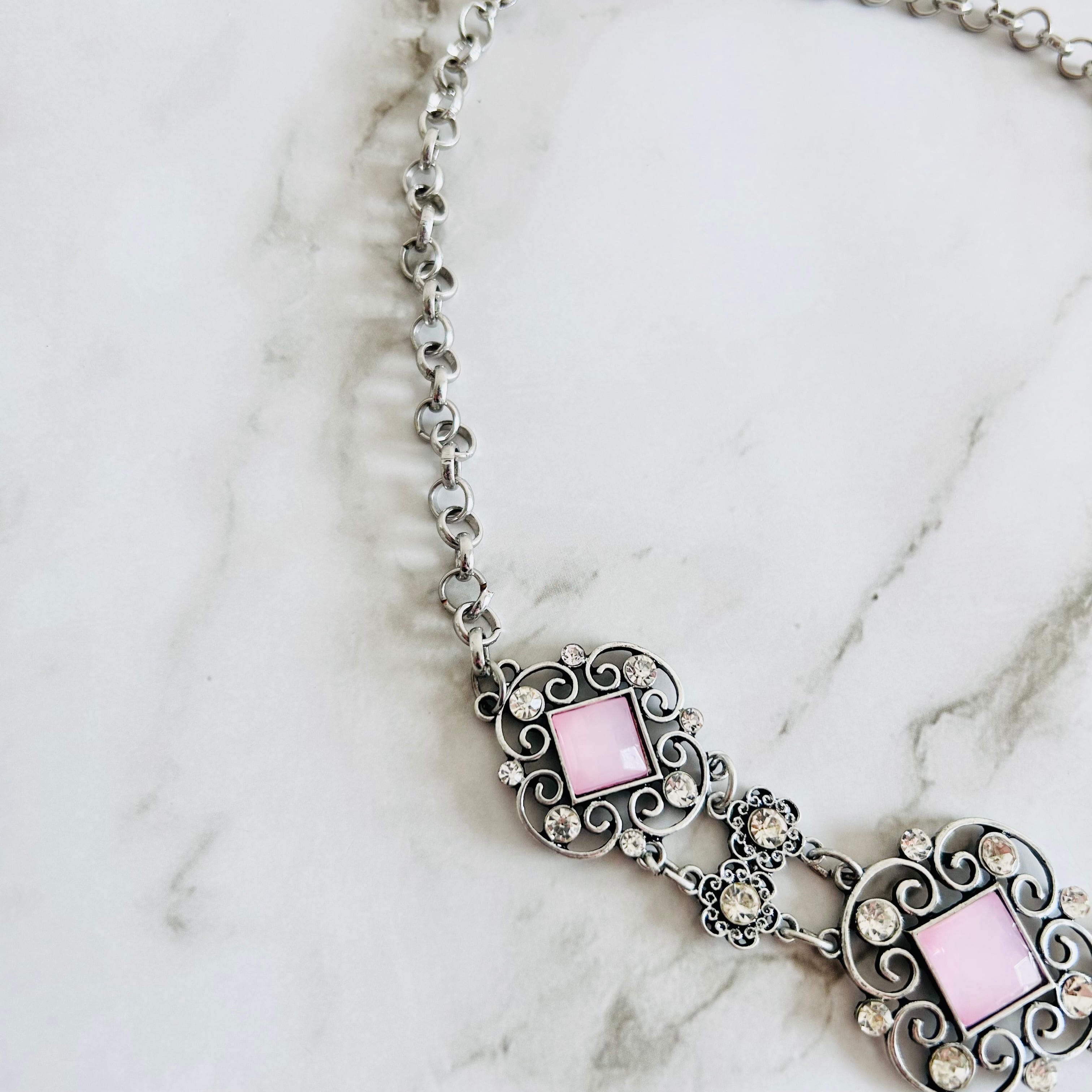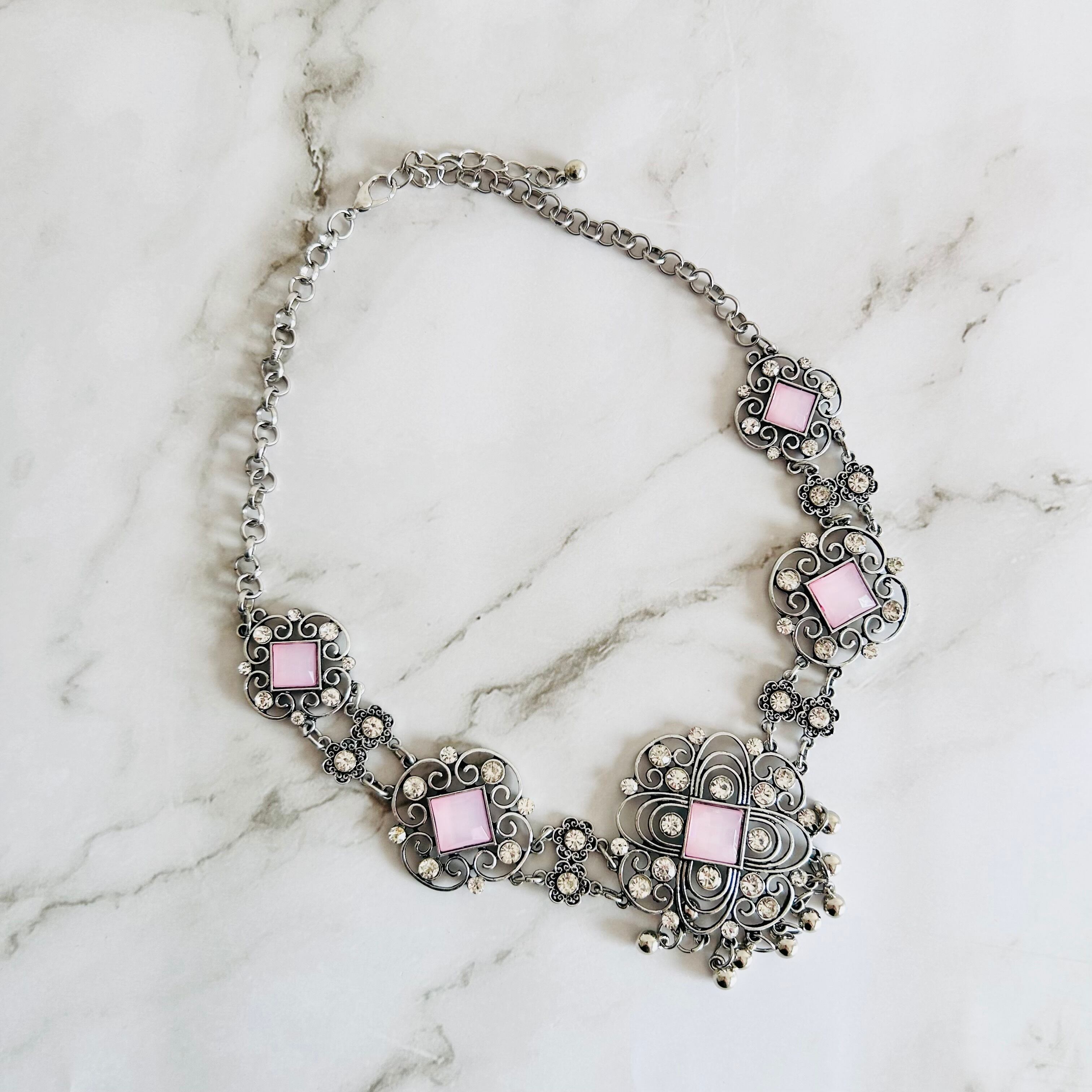 ベビーピンクのスクエアのビジューを中心に、繊細な透かし模様とラインストーンを組み合わせた、クラシカルな雰囲気のネックレスです。