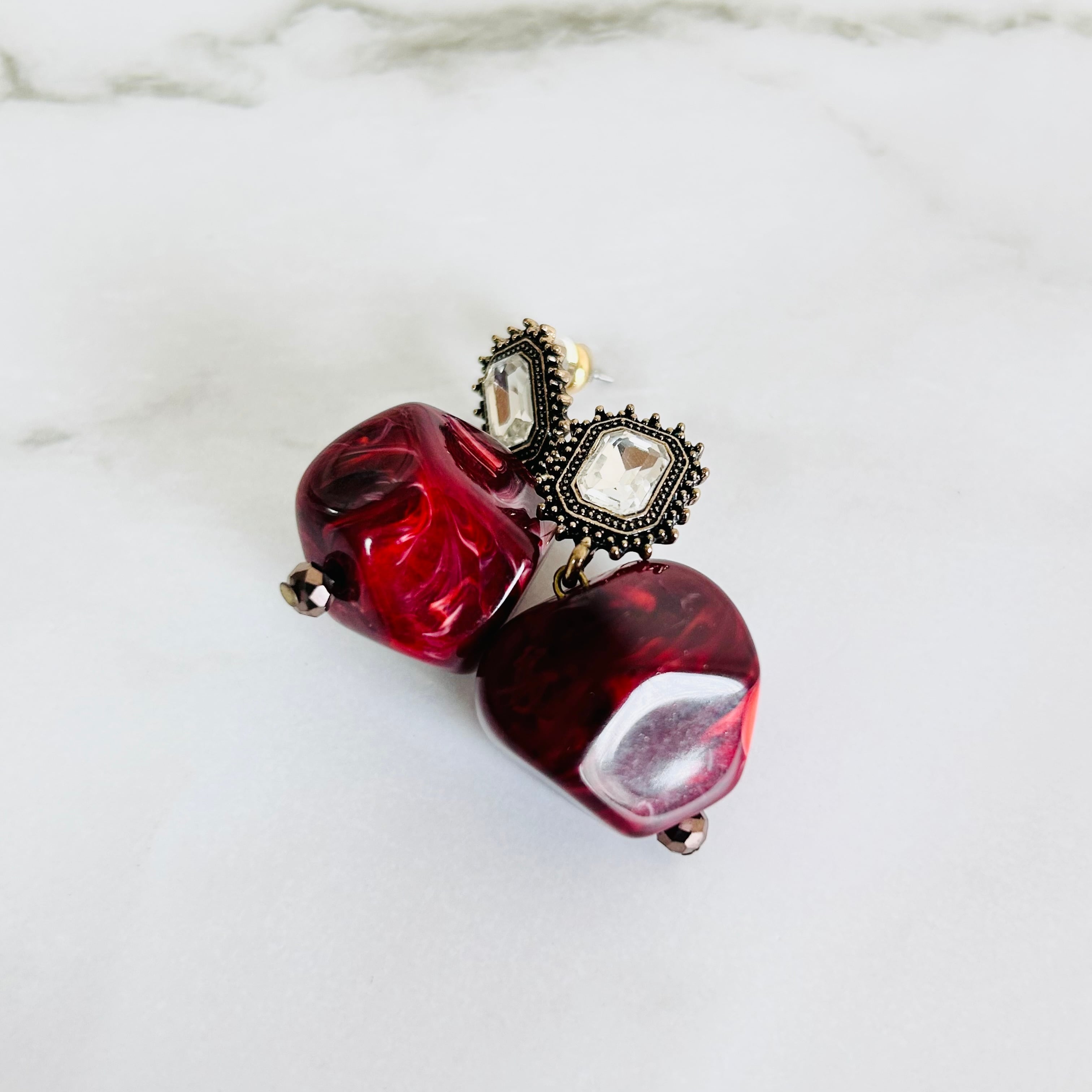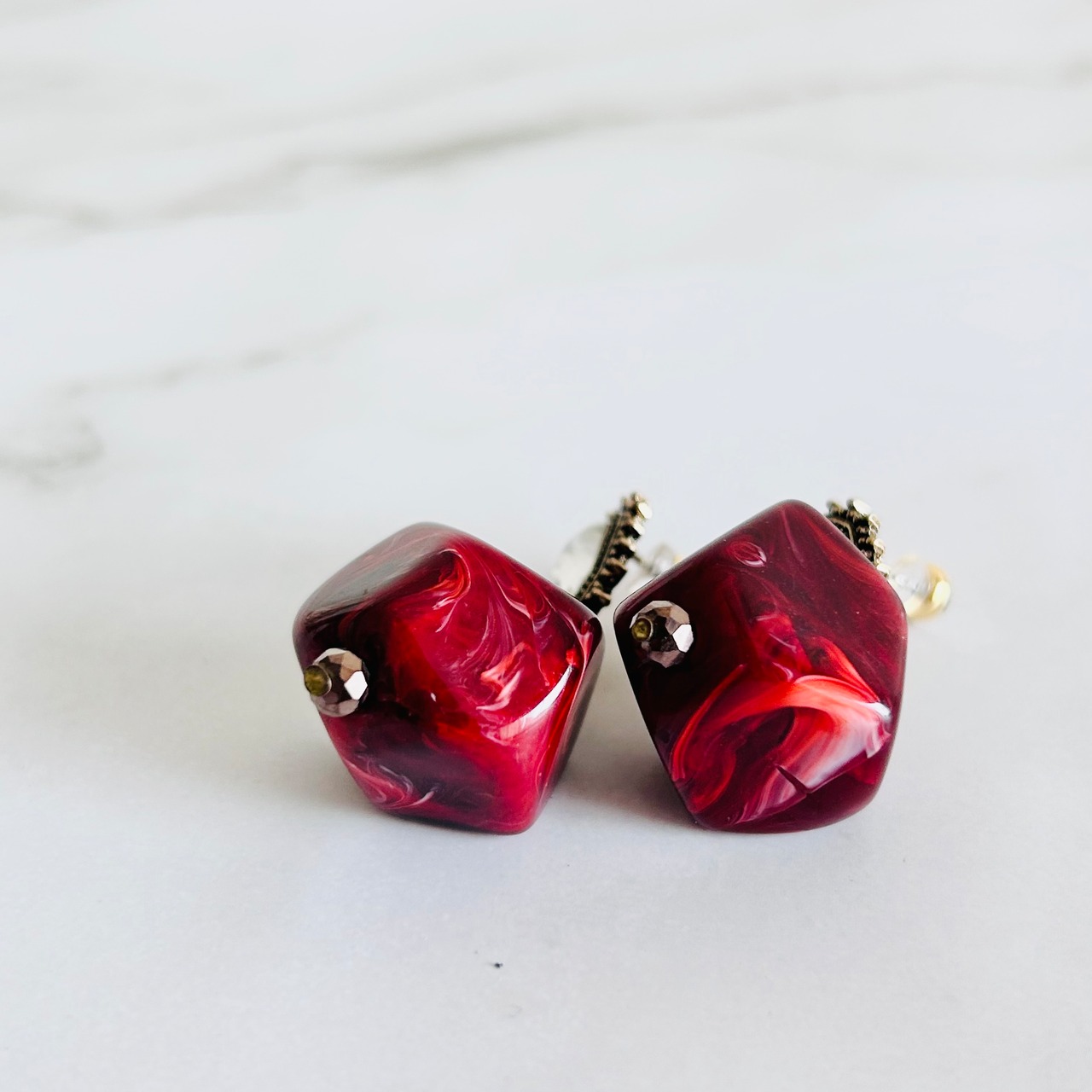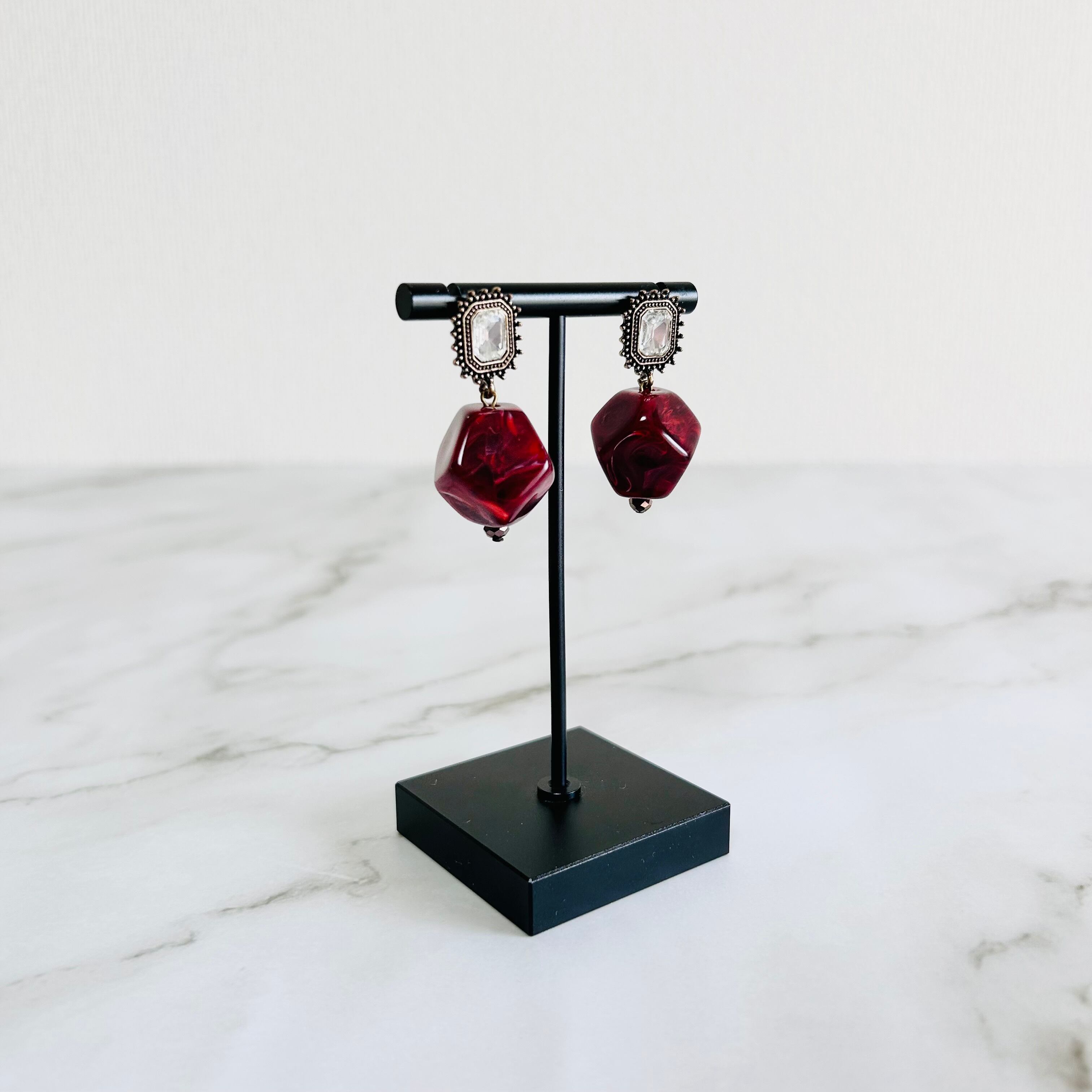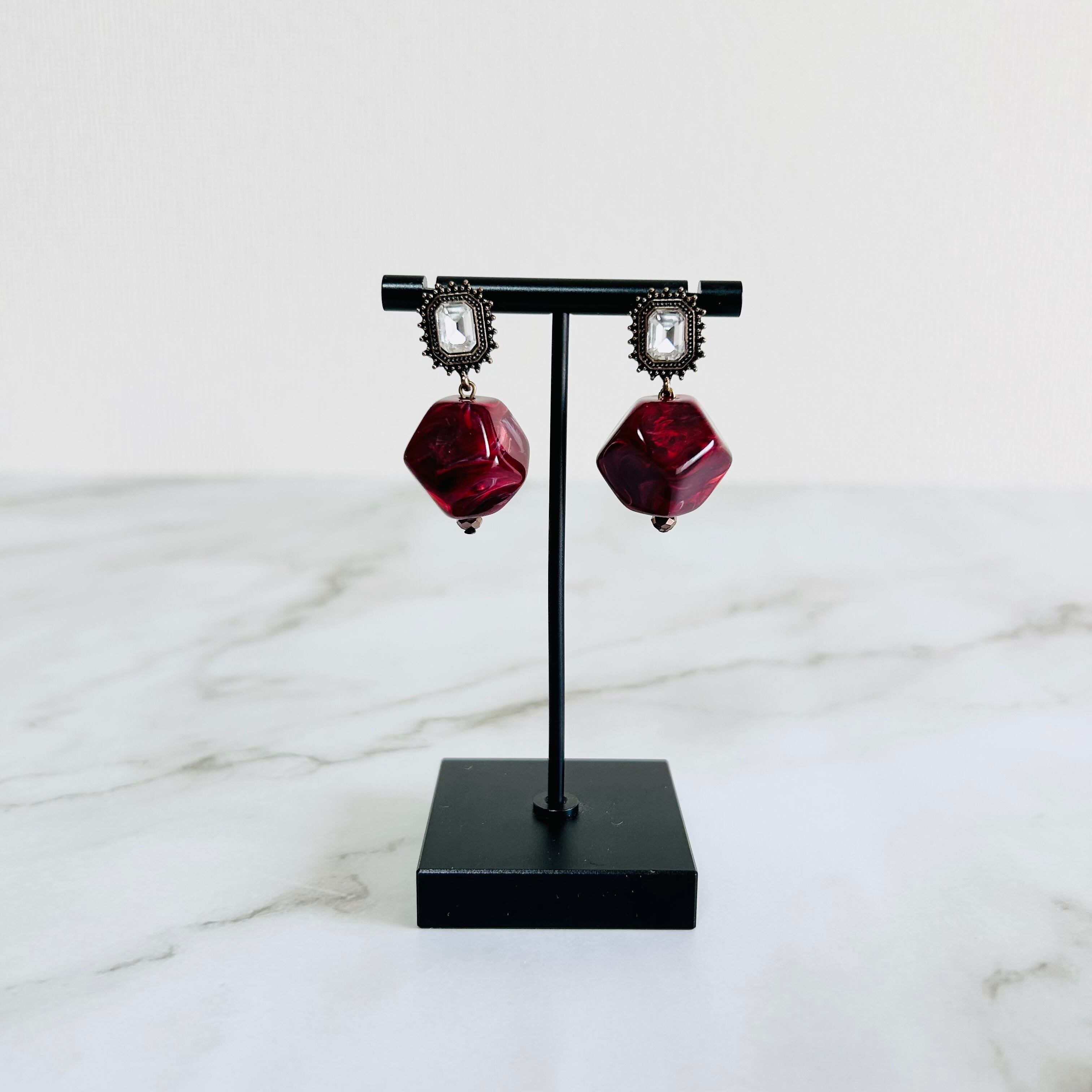 深みのあるレッドのマーブル調パーツに、クラシカルなカットビジューを組み合わせたピアスです。