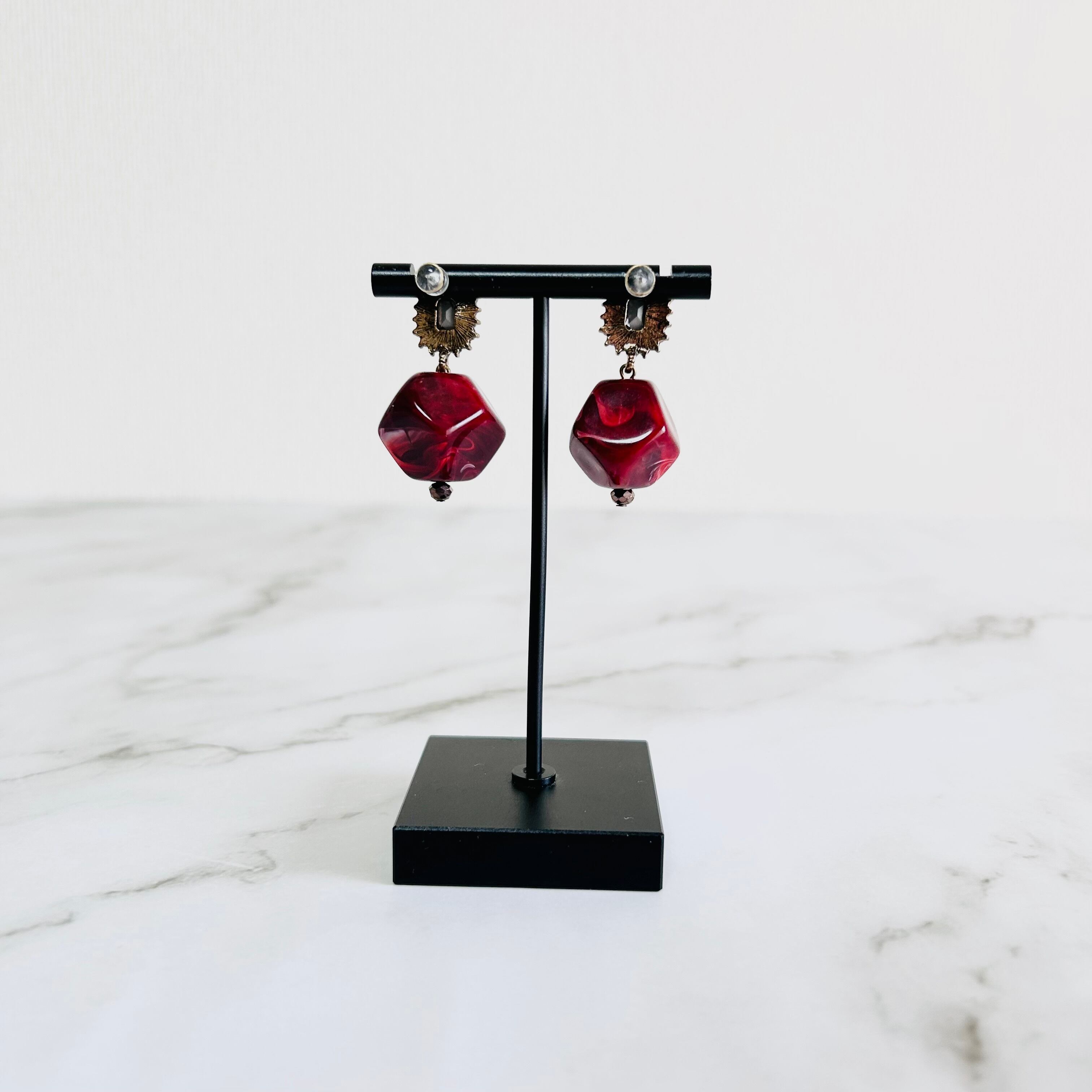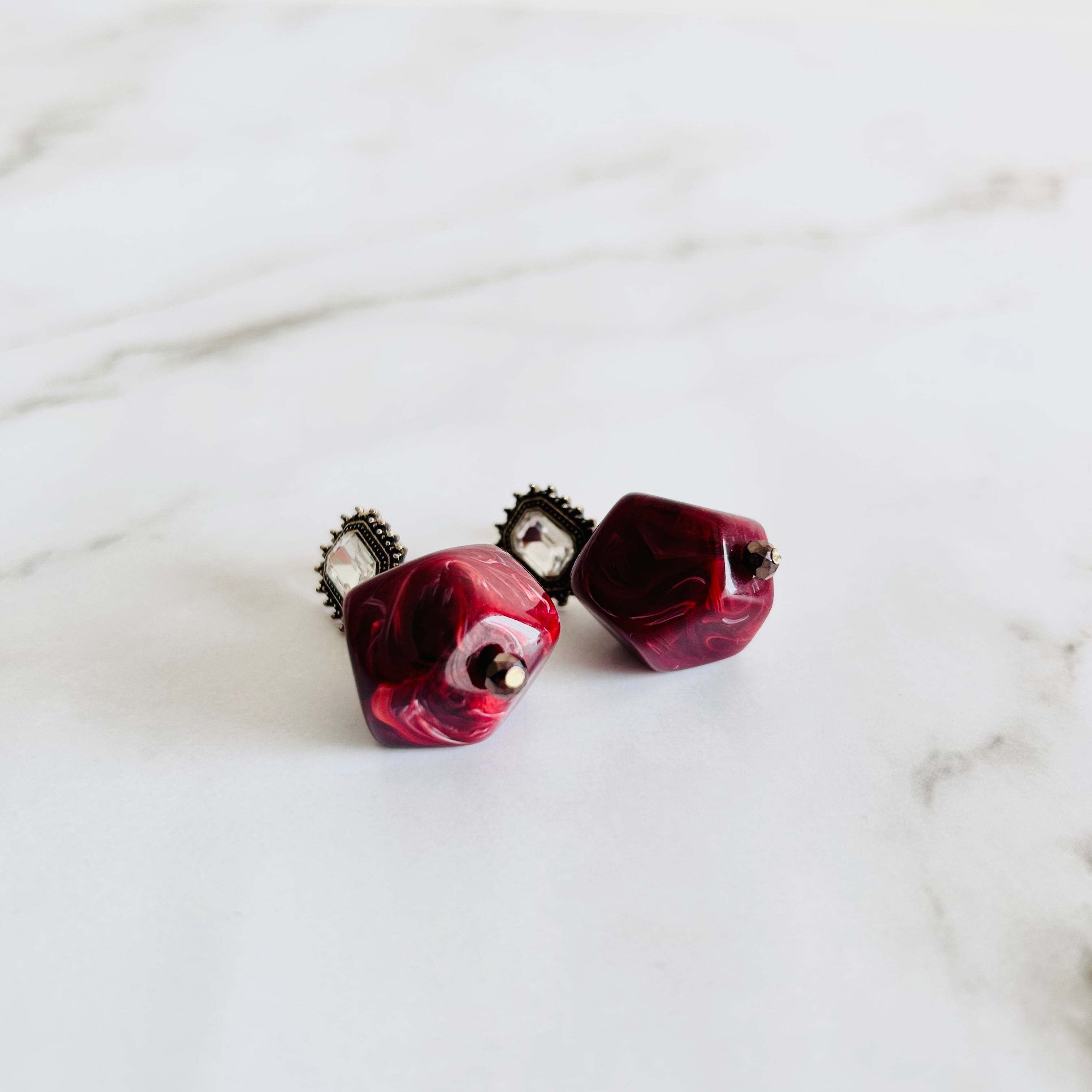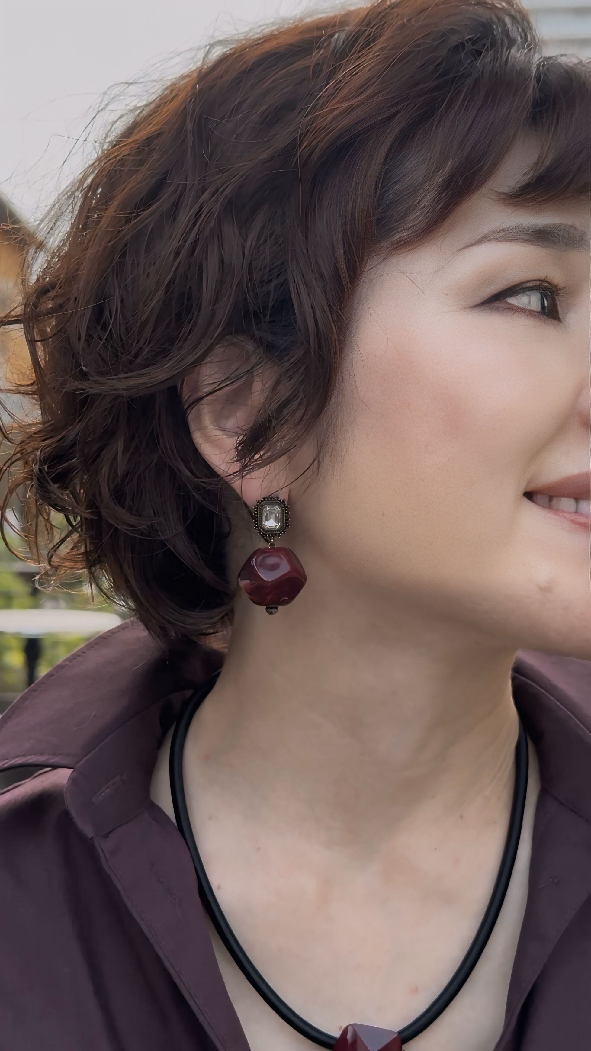 深みのあるレッドのマーブル調パーツに、クラシカルなカットビジューを組み合わせたピアスです。
