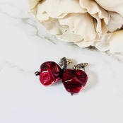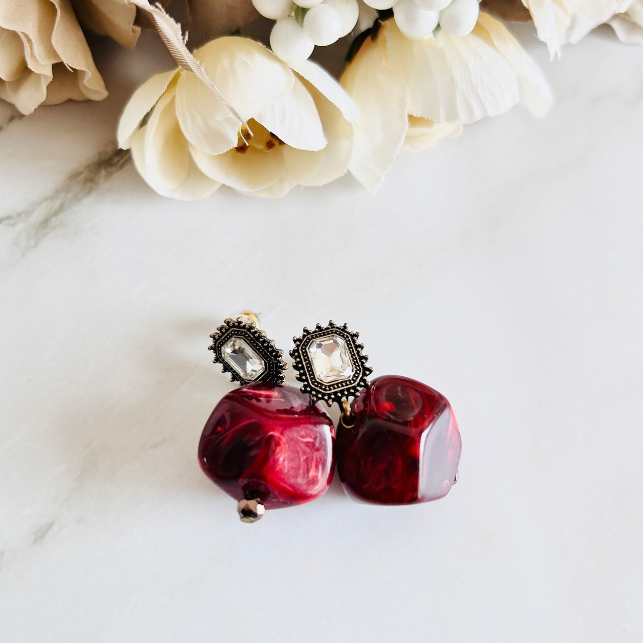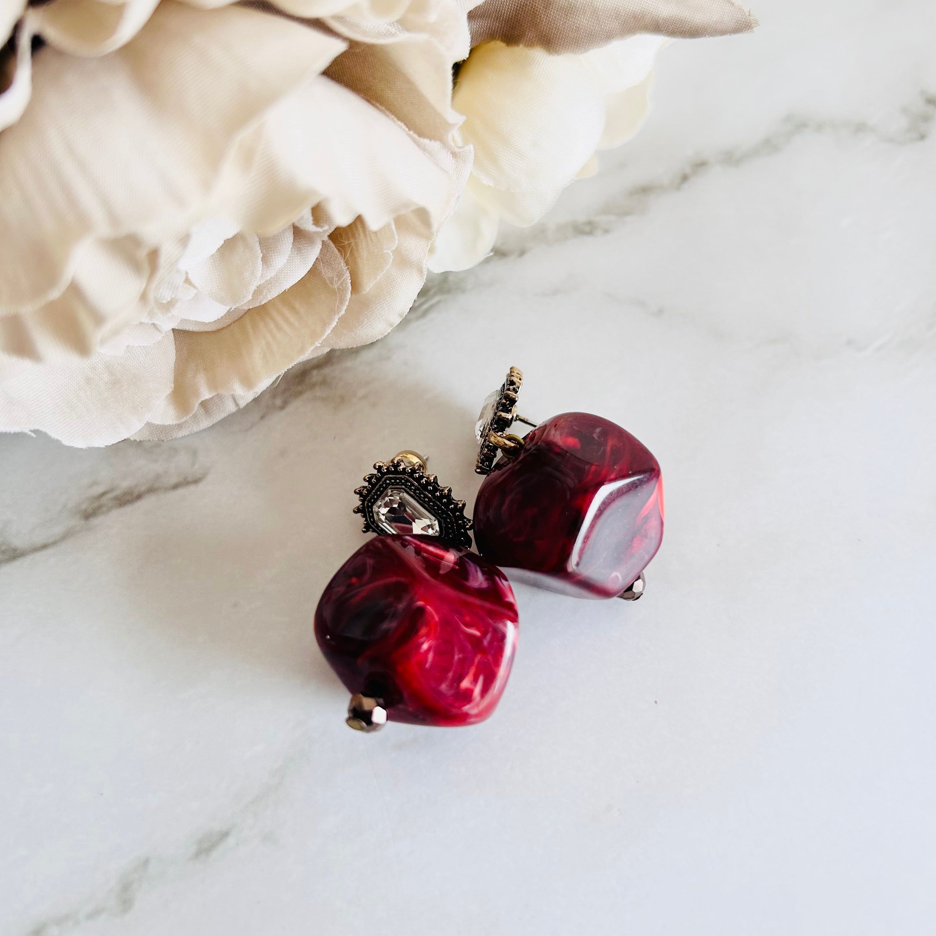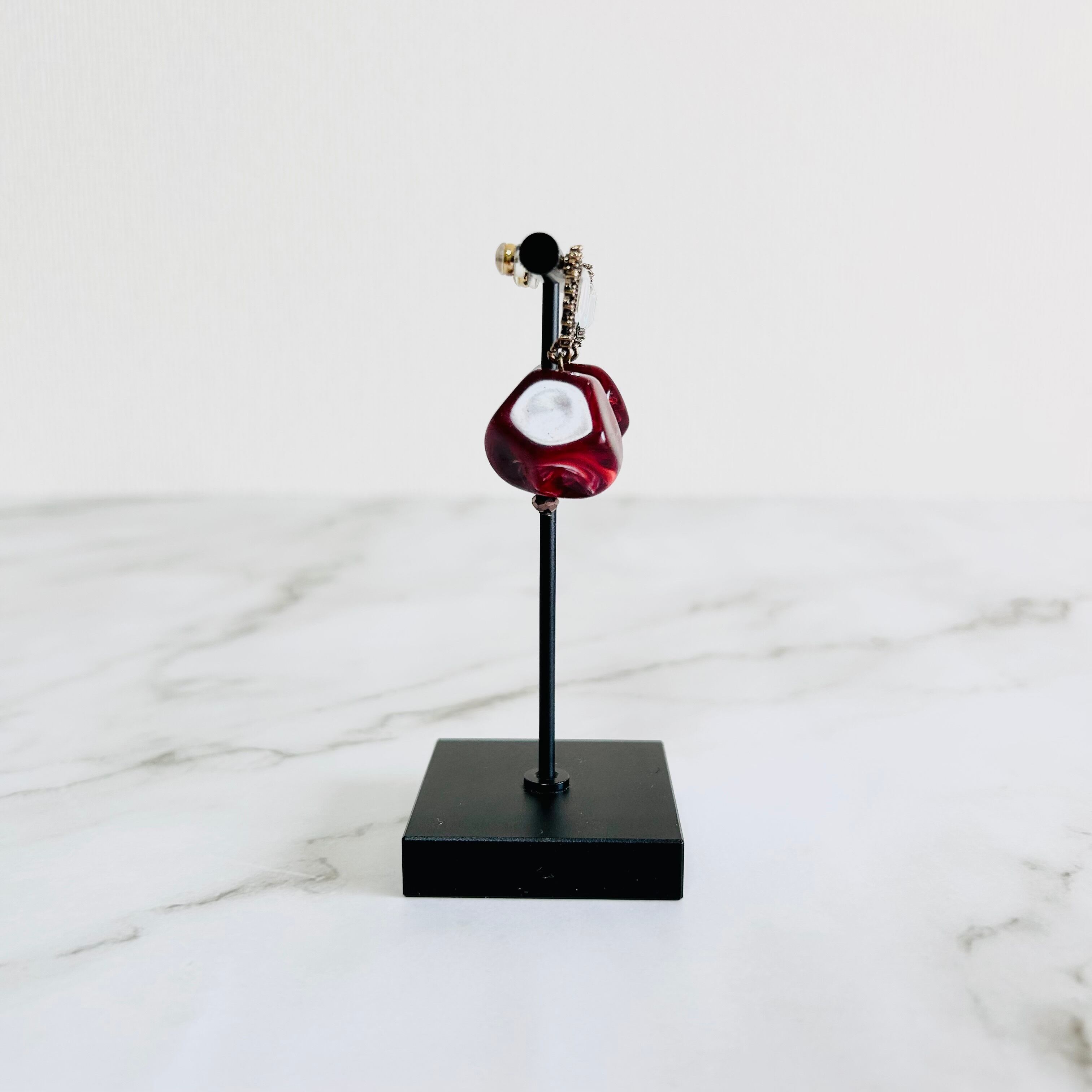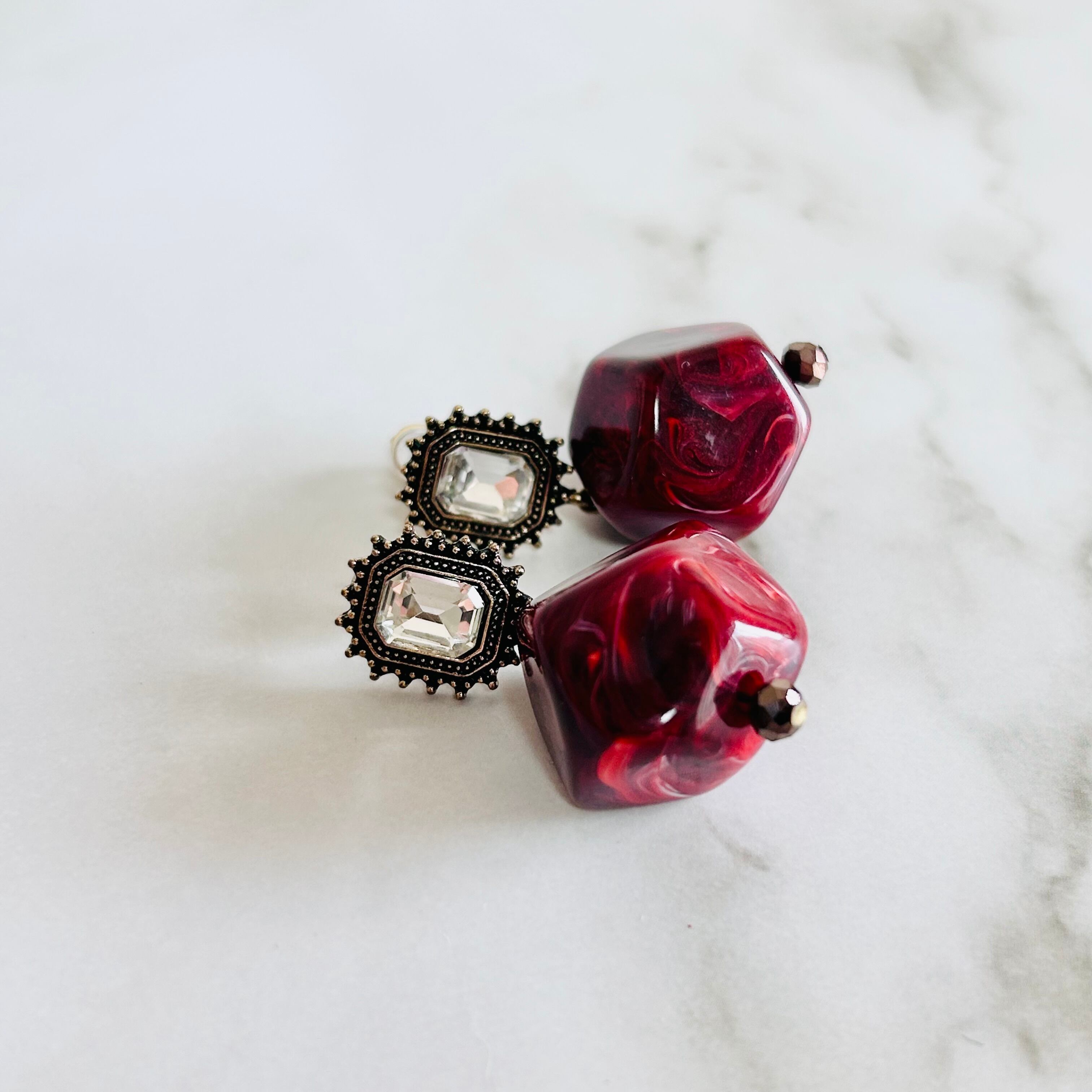 深みのあるレッドのマーブル調パーツに、クラシカルなカットビジューを組み合わせたピアスです。