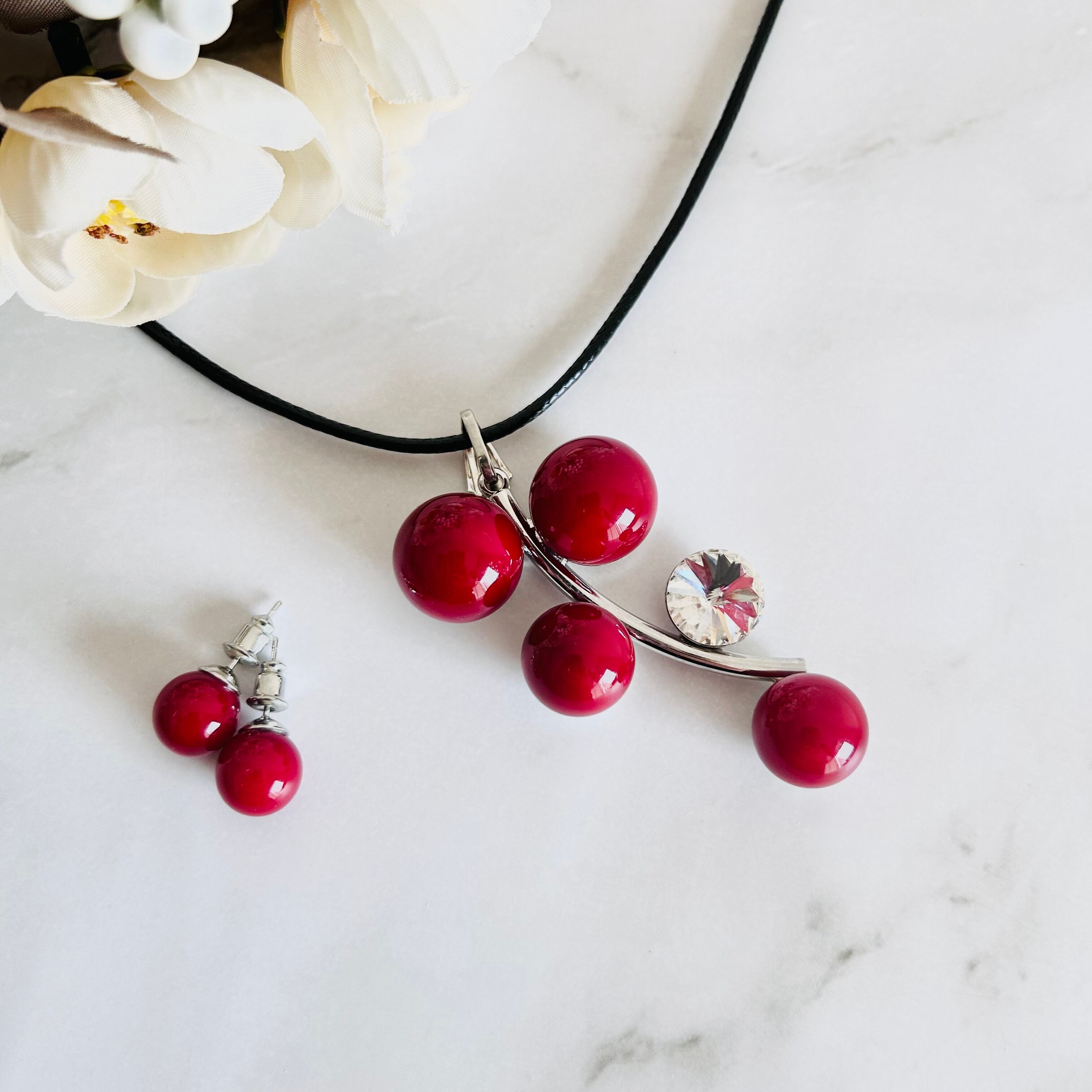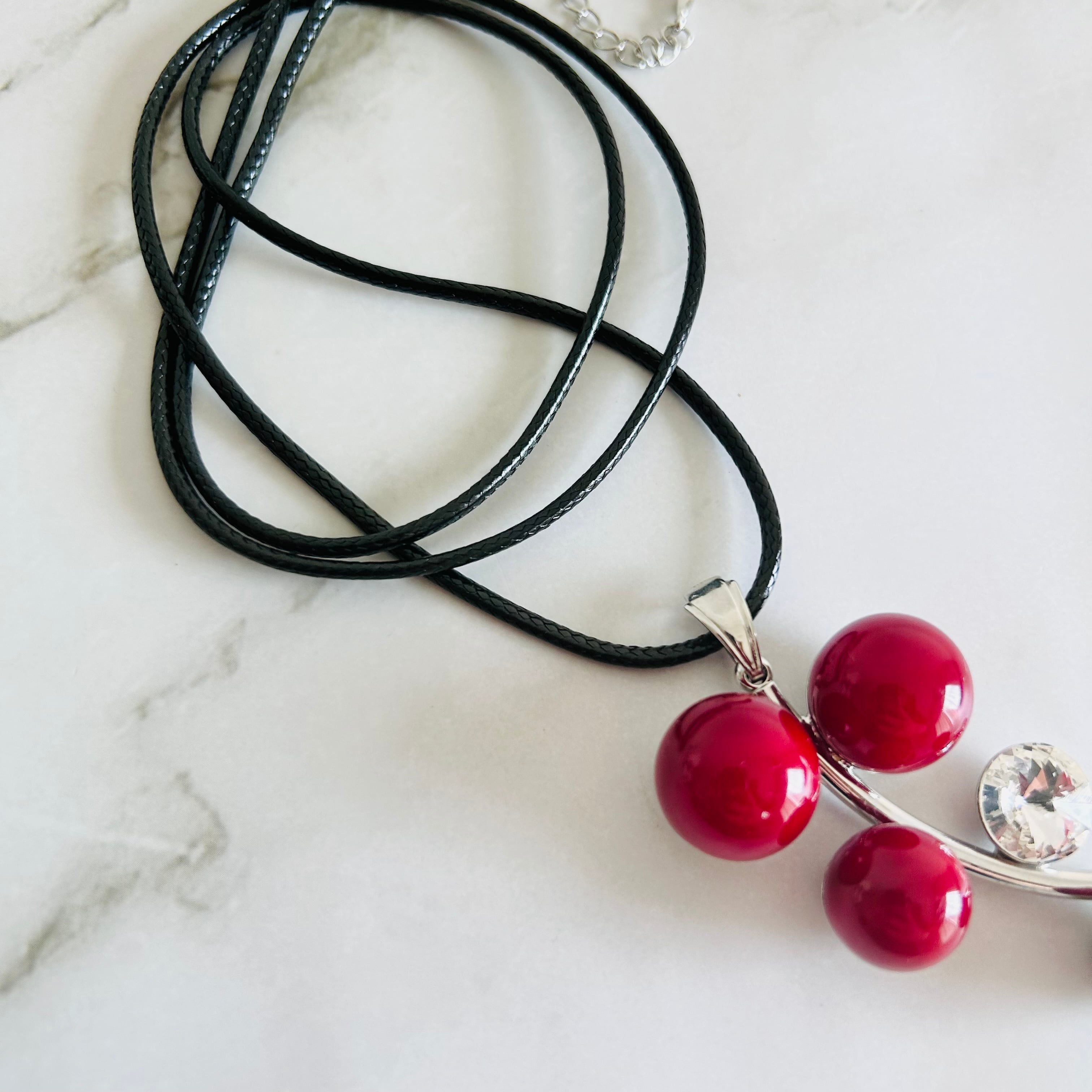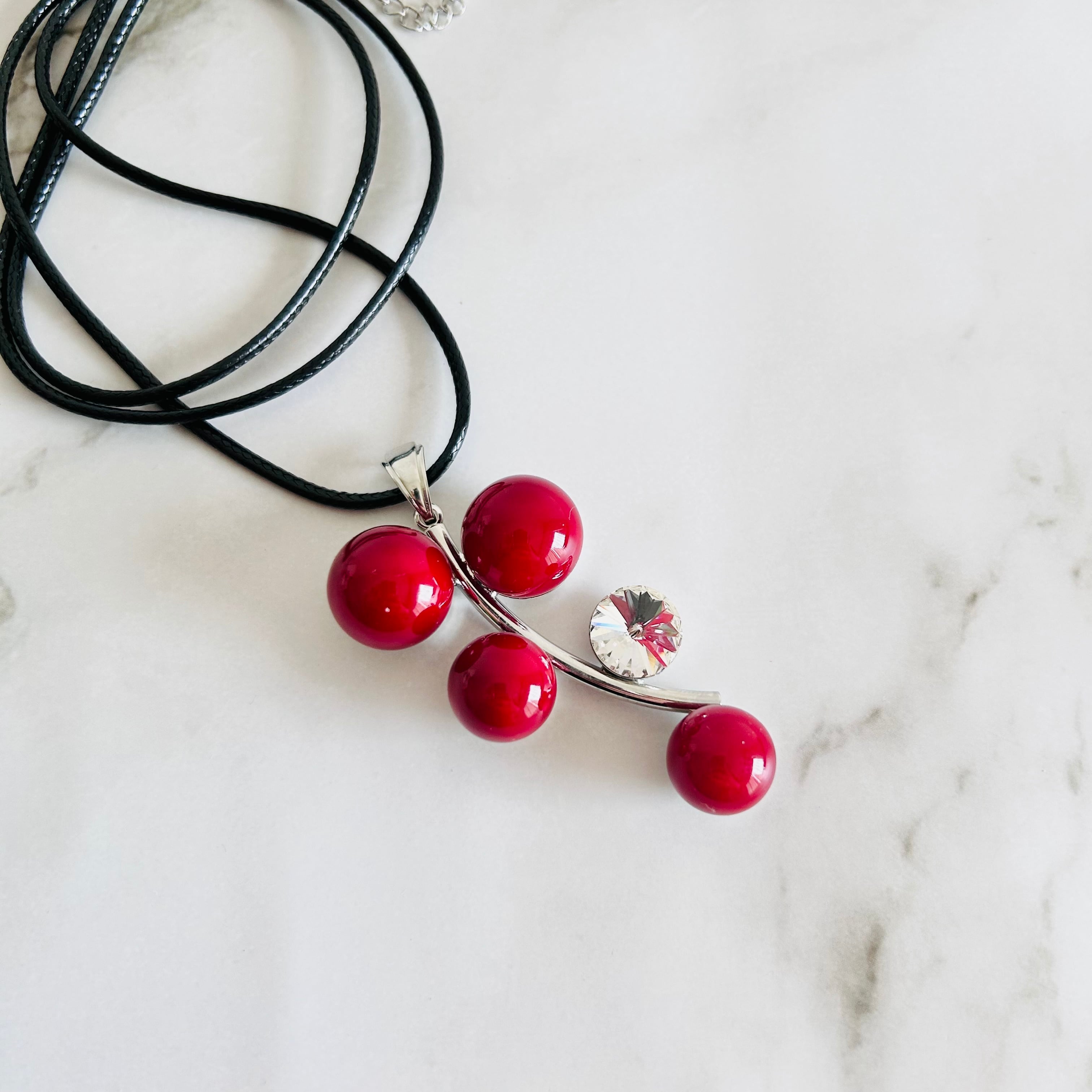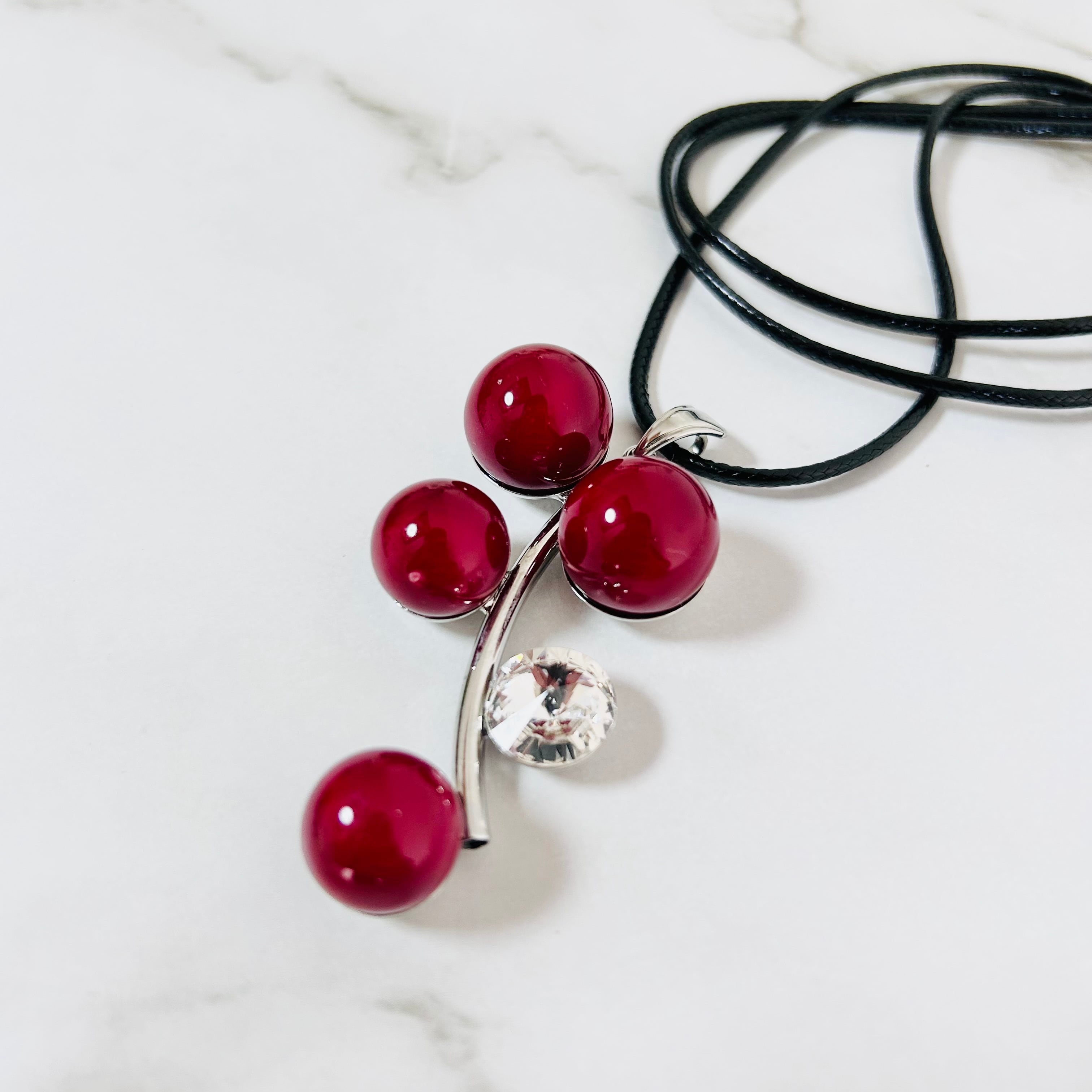 艶やかなレッドボールの美しく輝くラインストーンが枝に実った果実のように連なる、ナチュラルな魅力あふれるネックレスです。