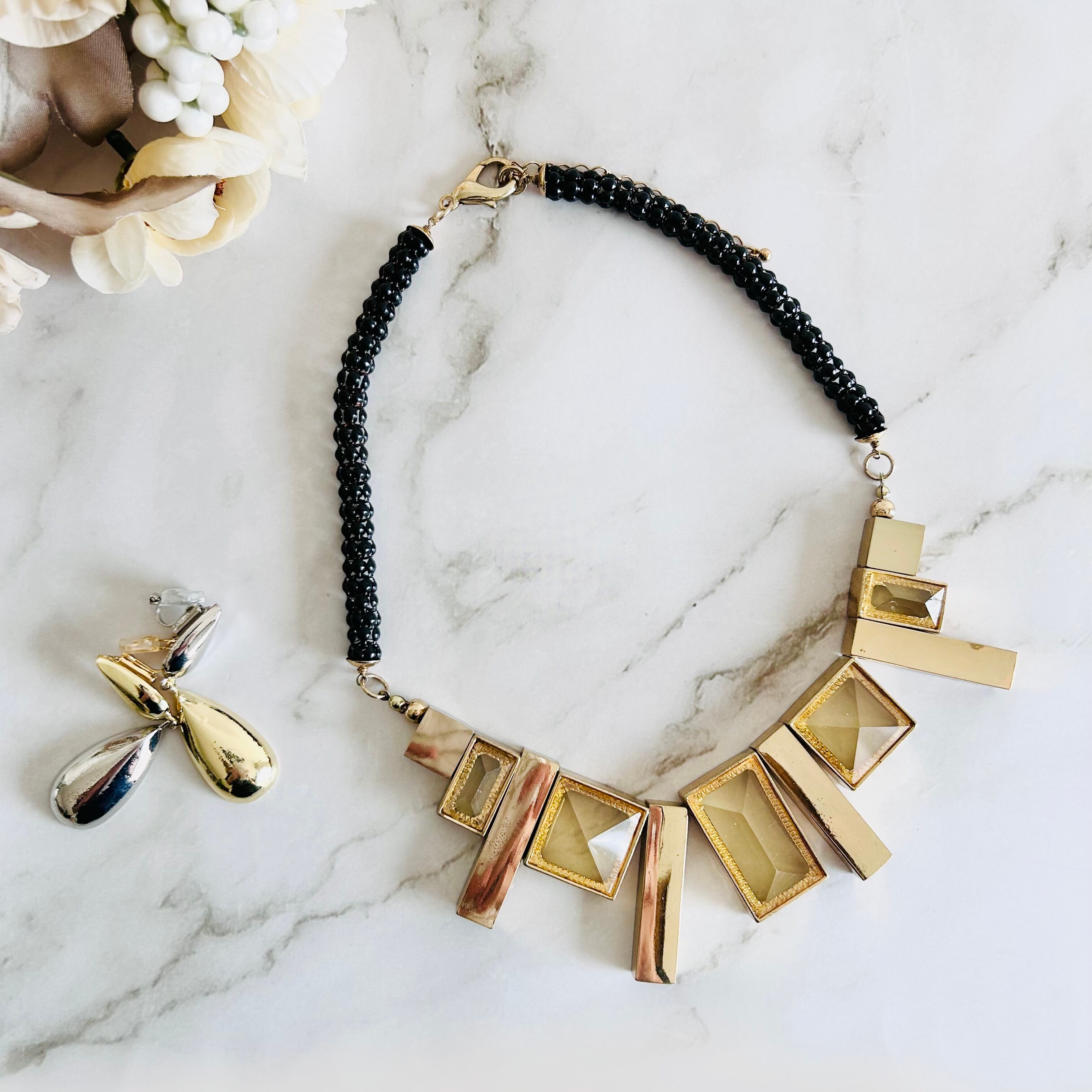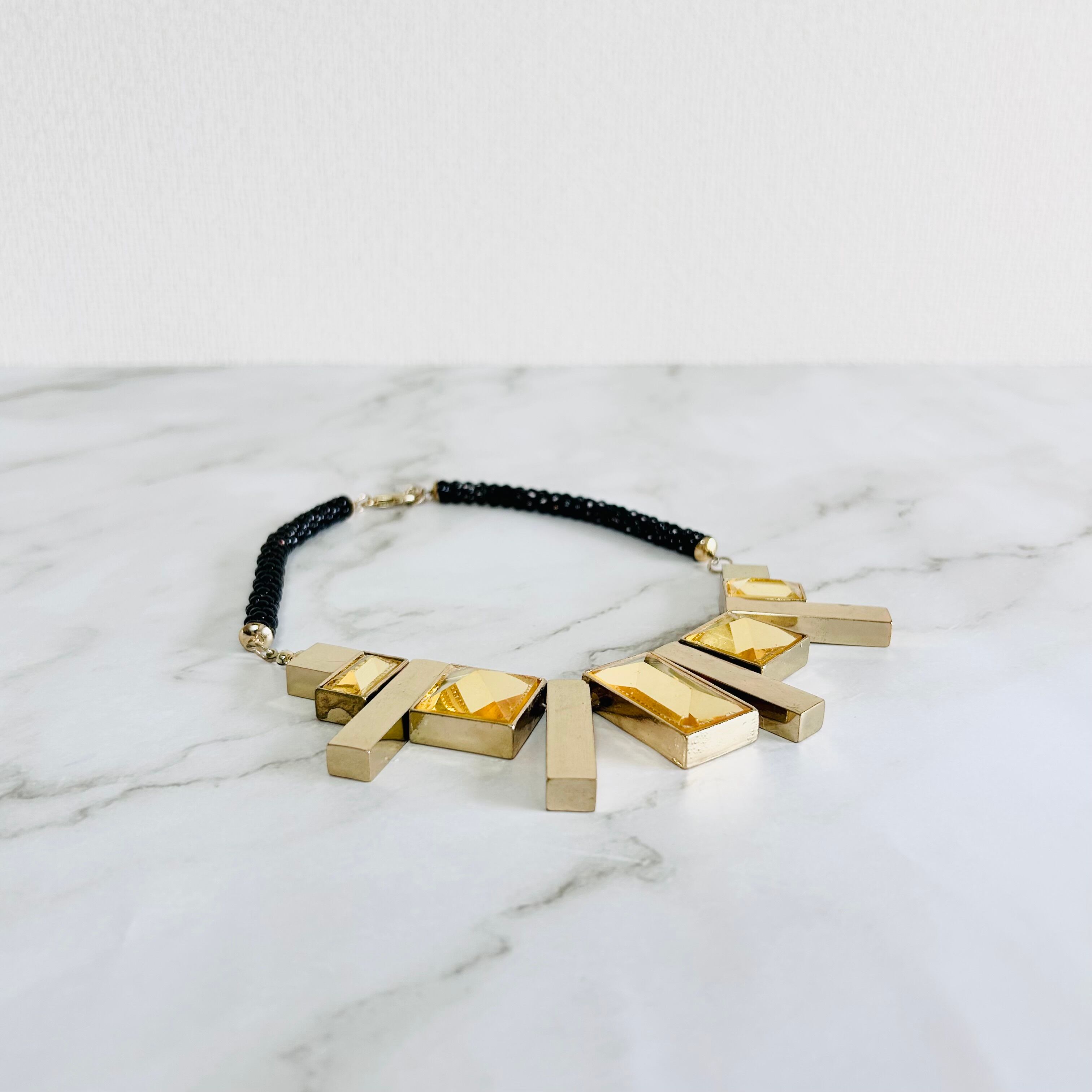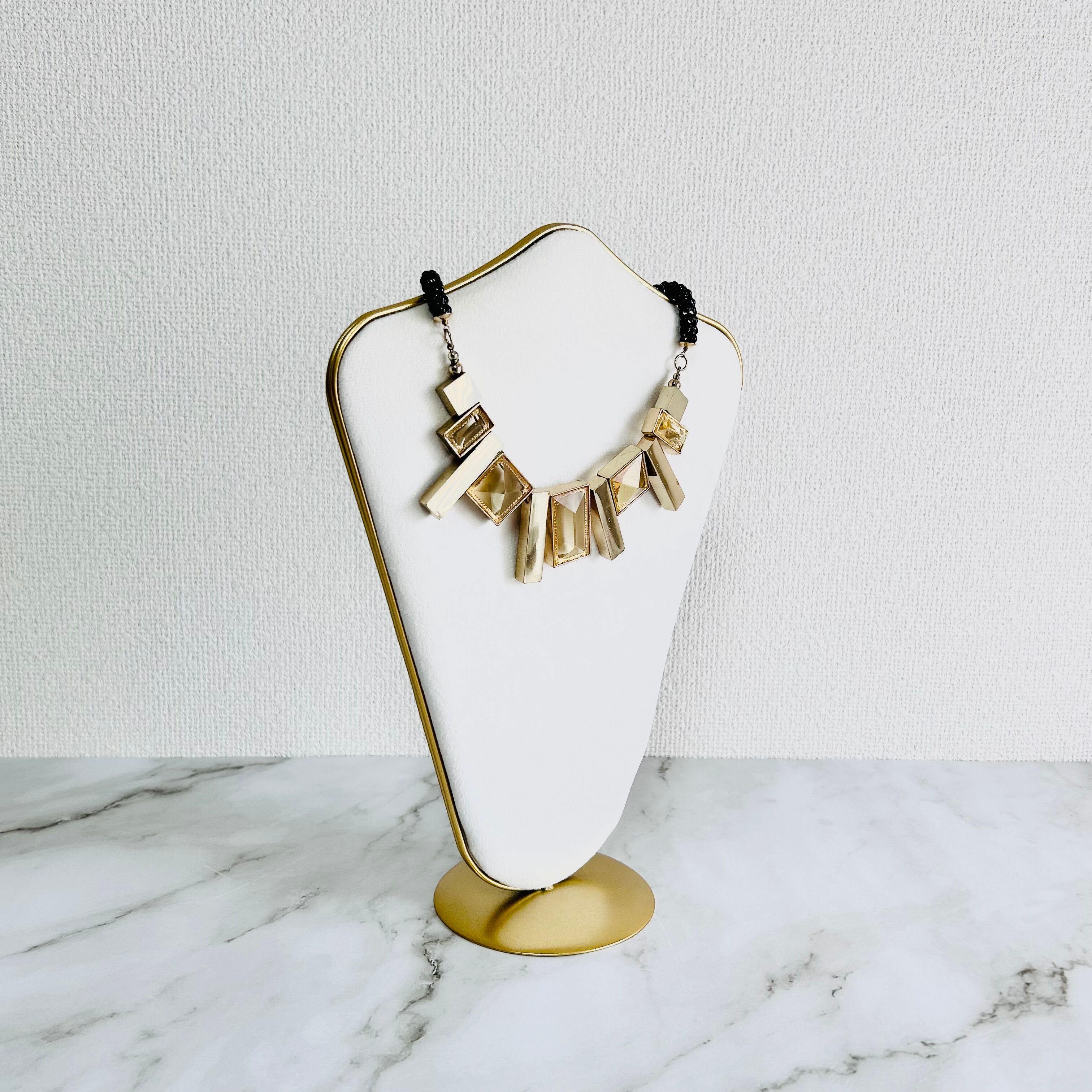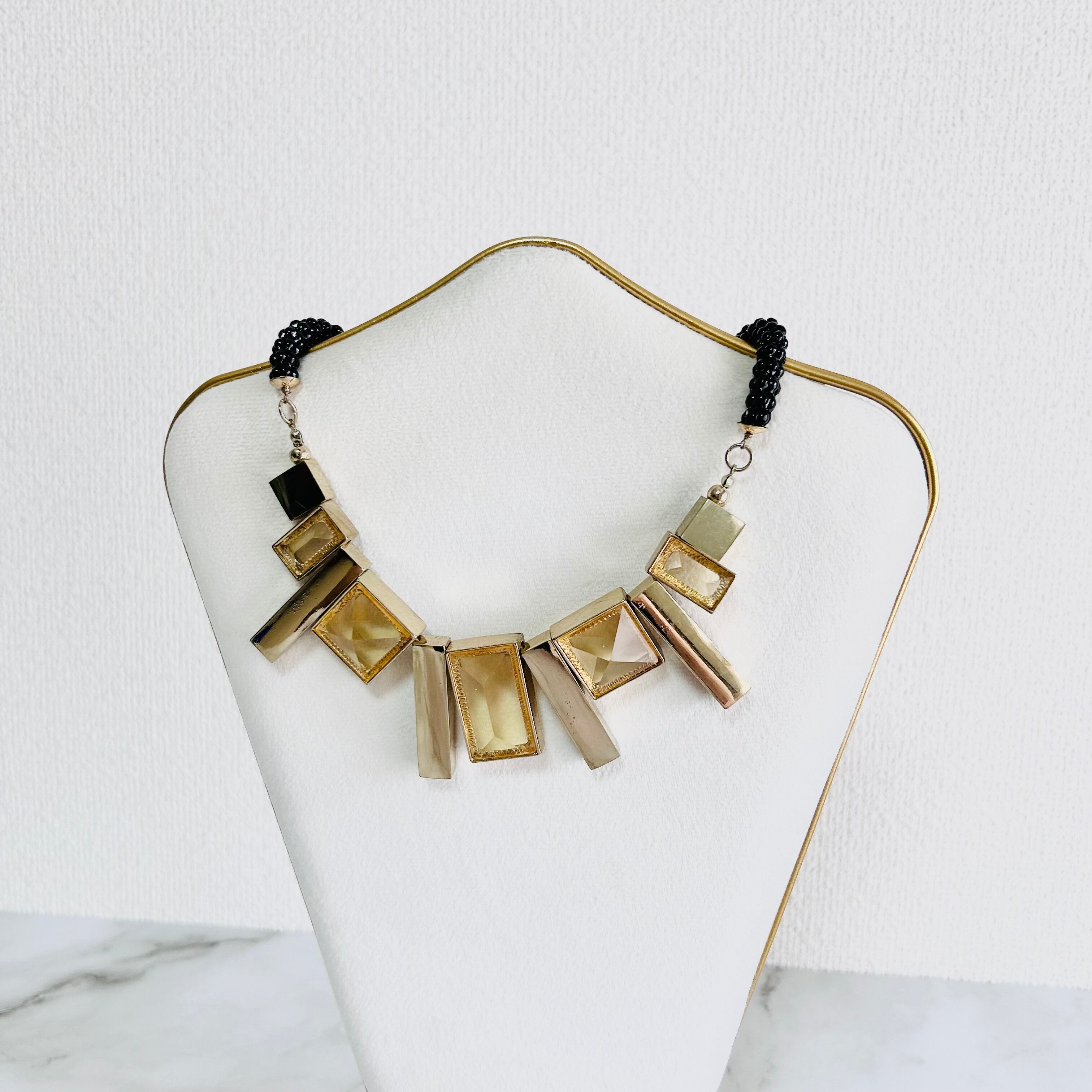 幾何学的な長方形とスクエアを組み合わせた、クールなデザインが目を惹くモダンなネックレスです。